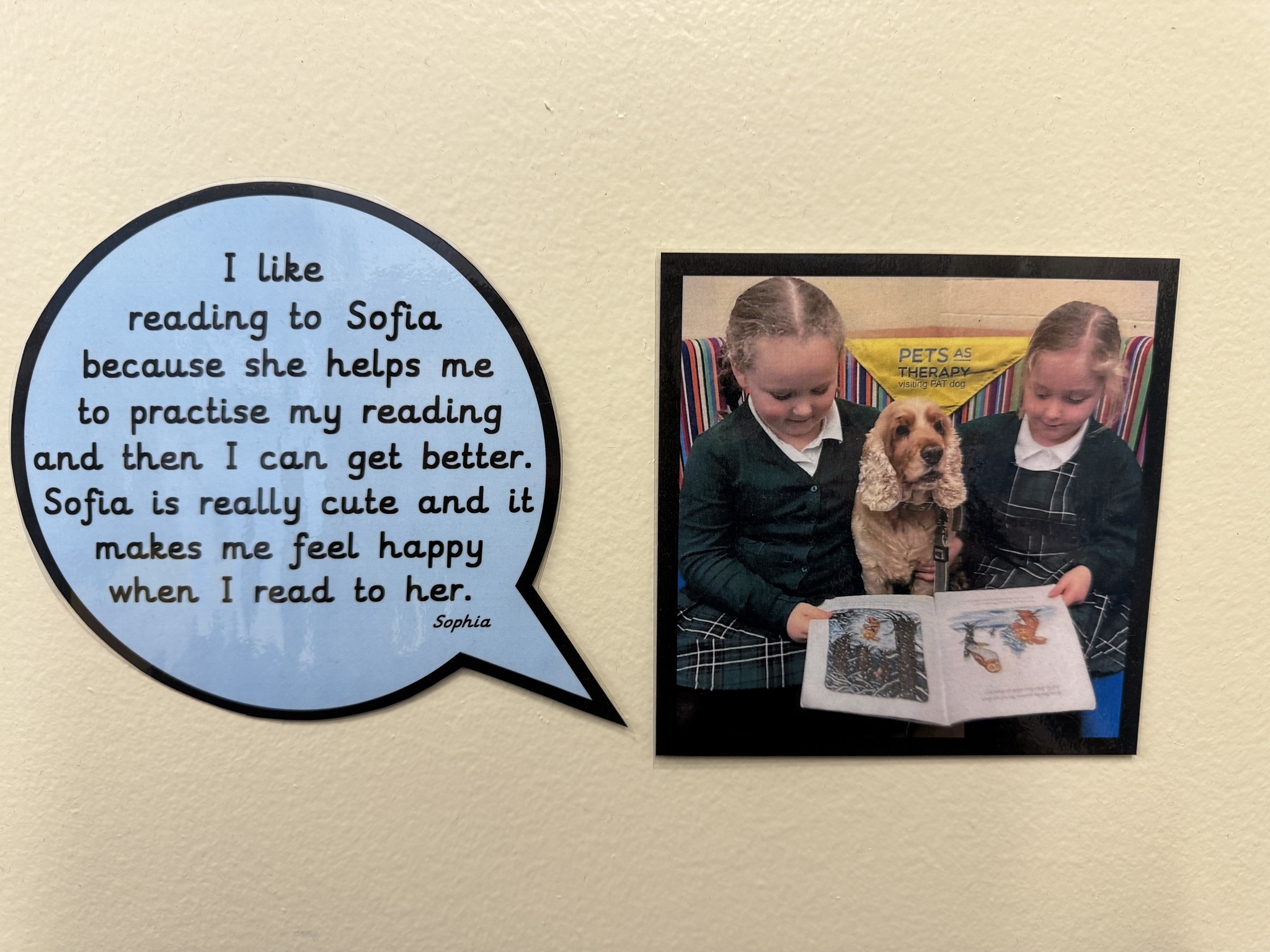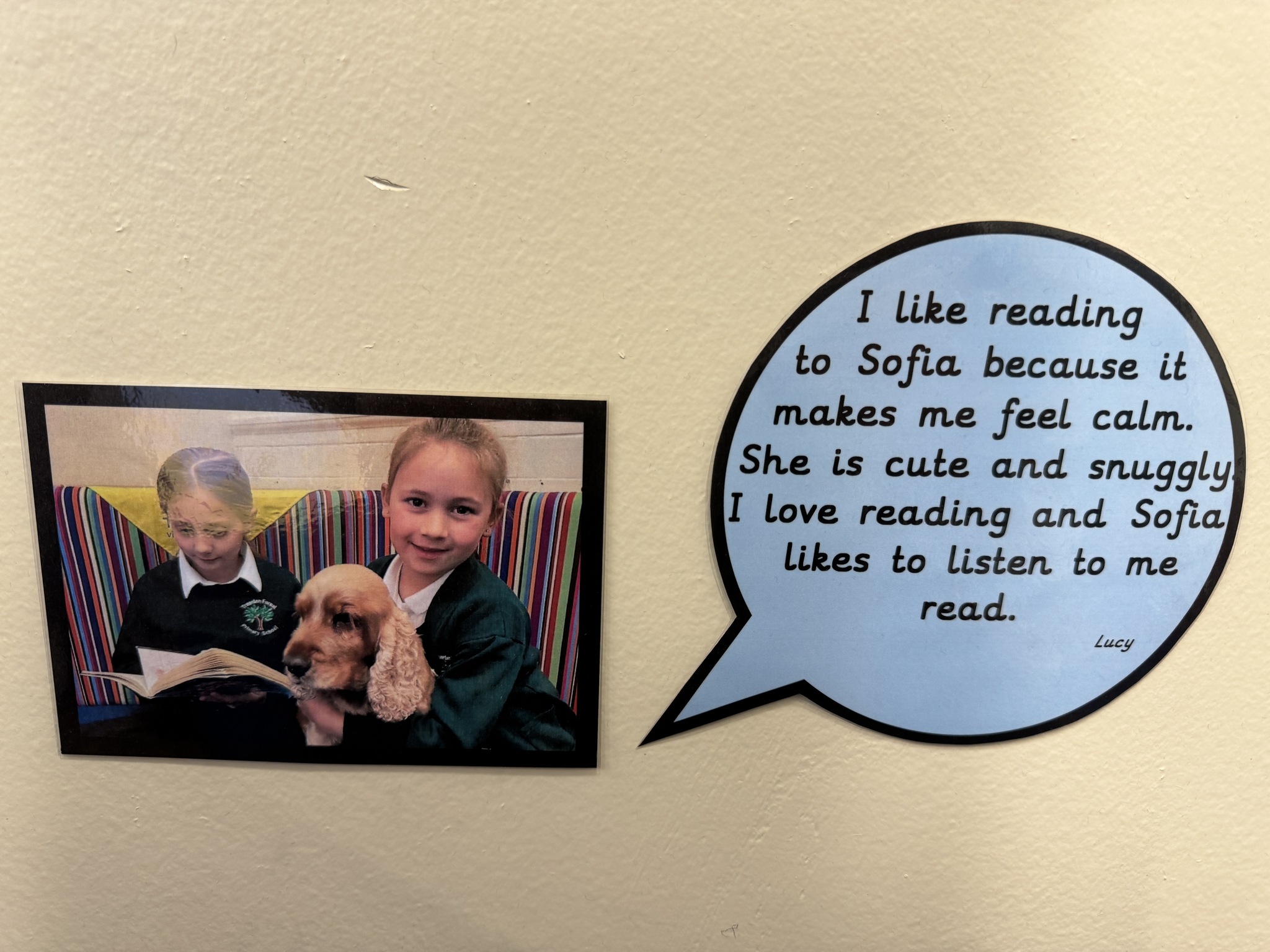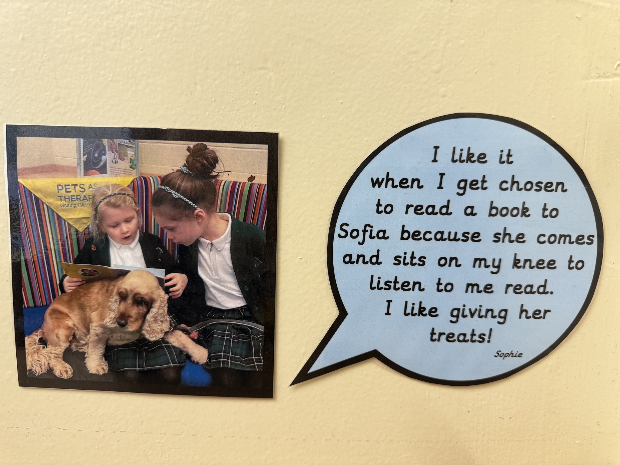 Each week, our school is visited by Sofia, our wonderful therapy dog, and her owner, Catherine. Sofia is part of Pets as Therapy and plays a special role in helping our children develop a love for reading. She listens patiently as children read to her, making the experience fun, relaxed, and confidence-boosting. Sofia even has her own cozy spot in our library called Sofia’s Corner, where children can enjoy a calm and supportive reading environment with their furry friend.