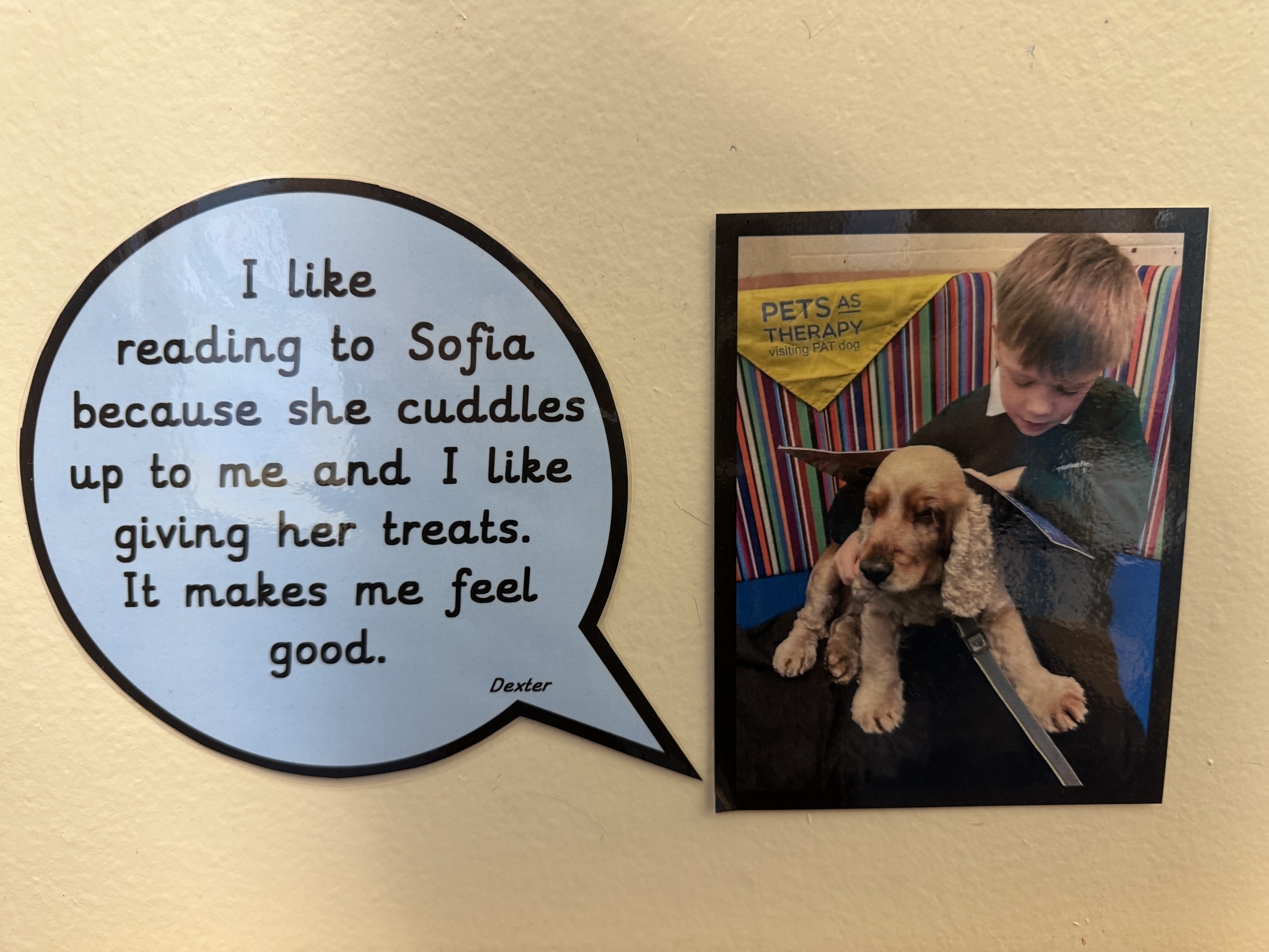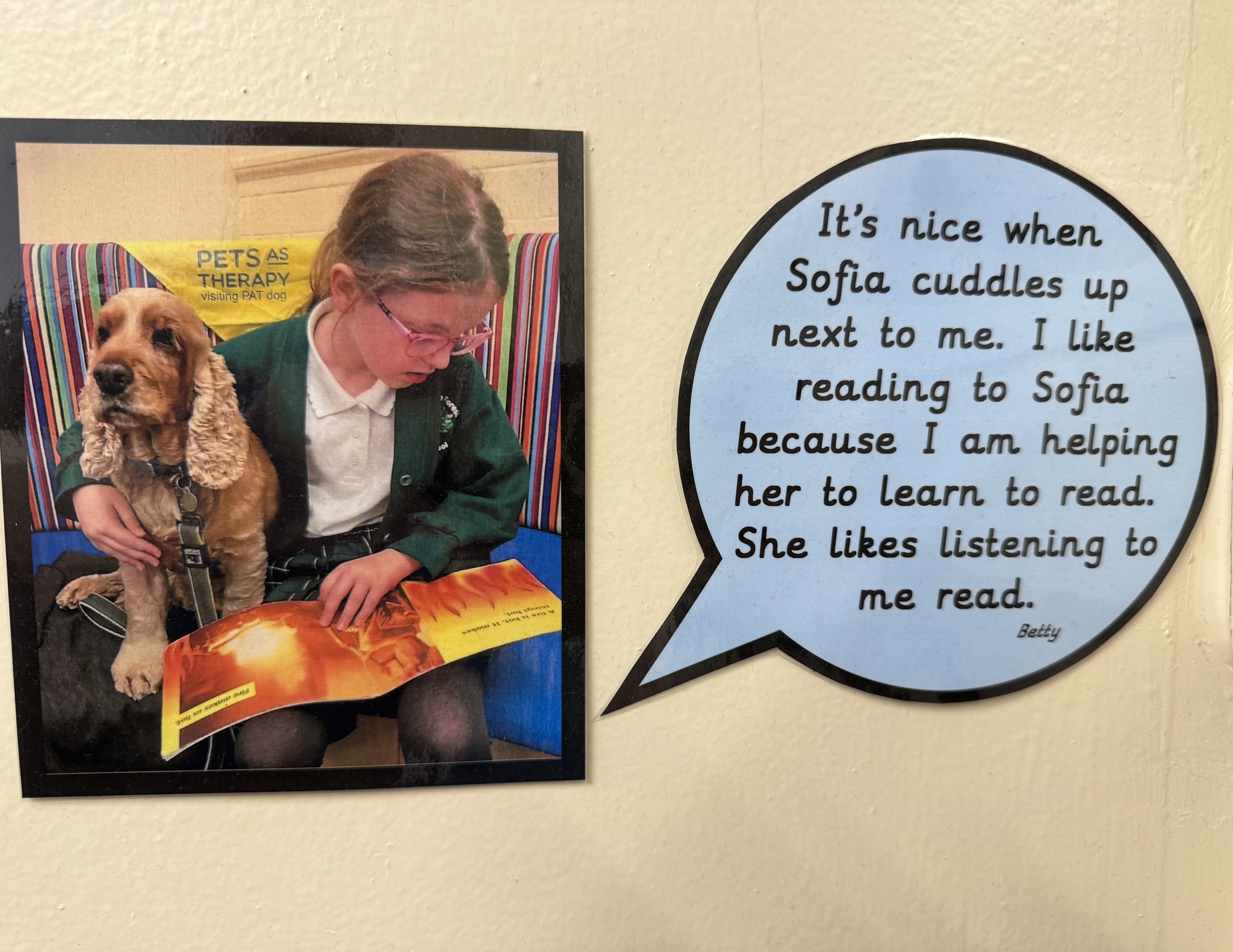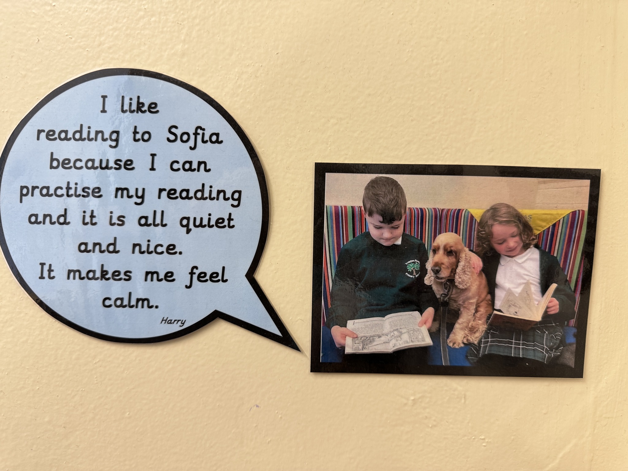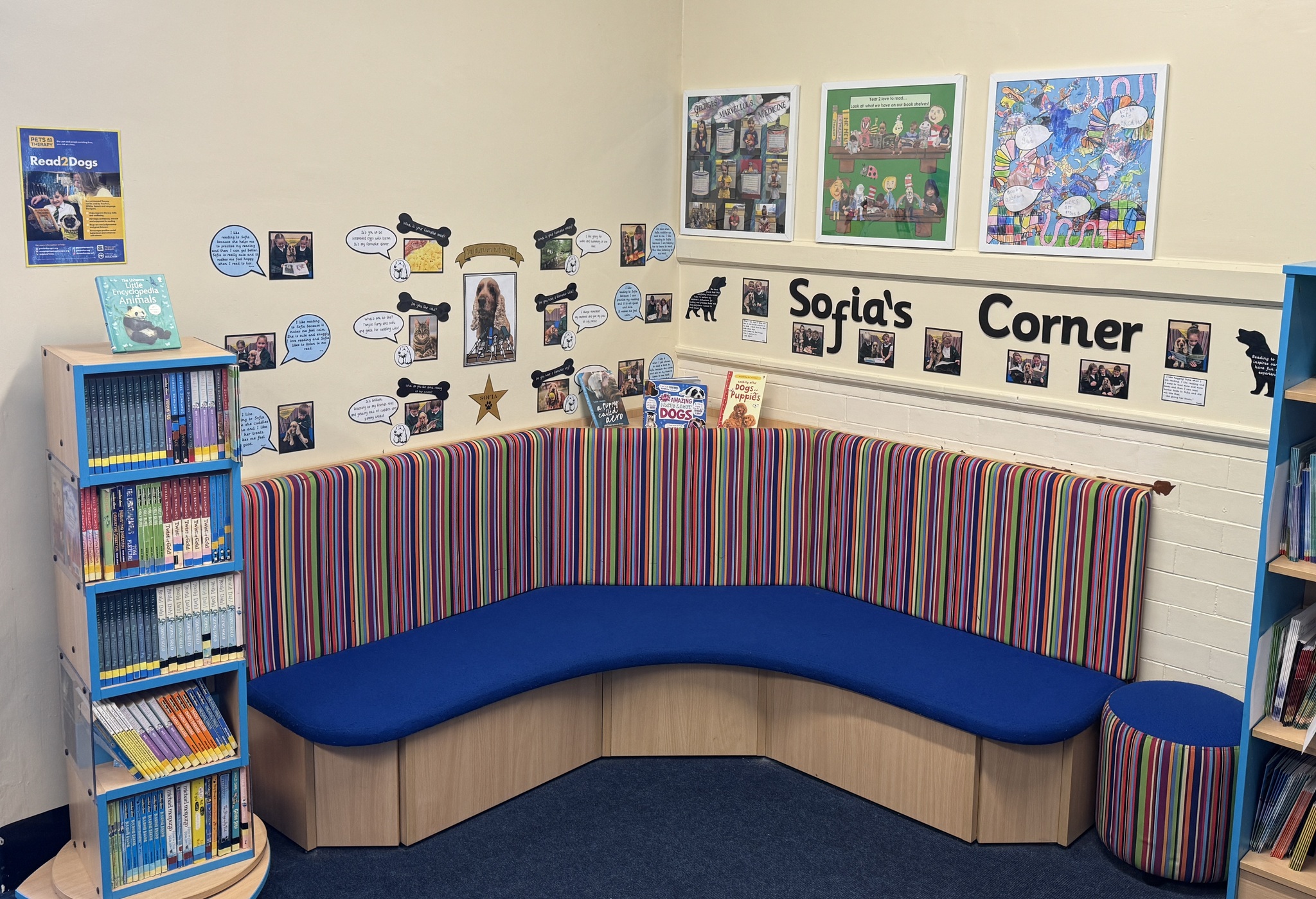 Each week, our school is visited by Sofia, our wonderful therapy dog, and her owner, Catherine. Sofia is part of Pets as Therapy and plays a special role in helping our children develop a love for reading. She listens patiently as children read to her, making the experience fun, relaxed, and confidence-boosting. Sofia even has her own cozy spot in our library called Sofia’s Corner, where children can enjoy a calm and supportive reading environment with their furry friend.