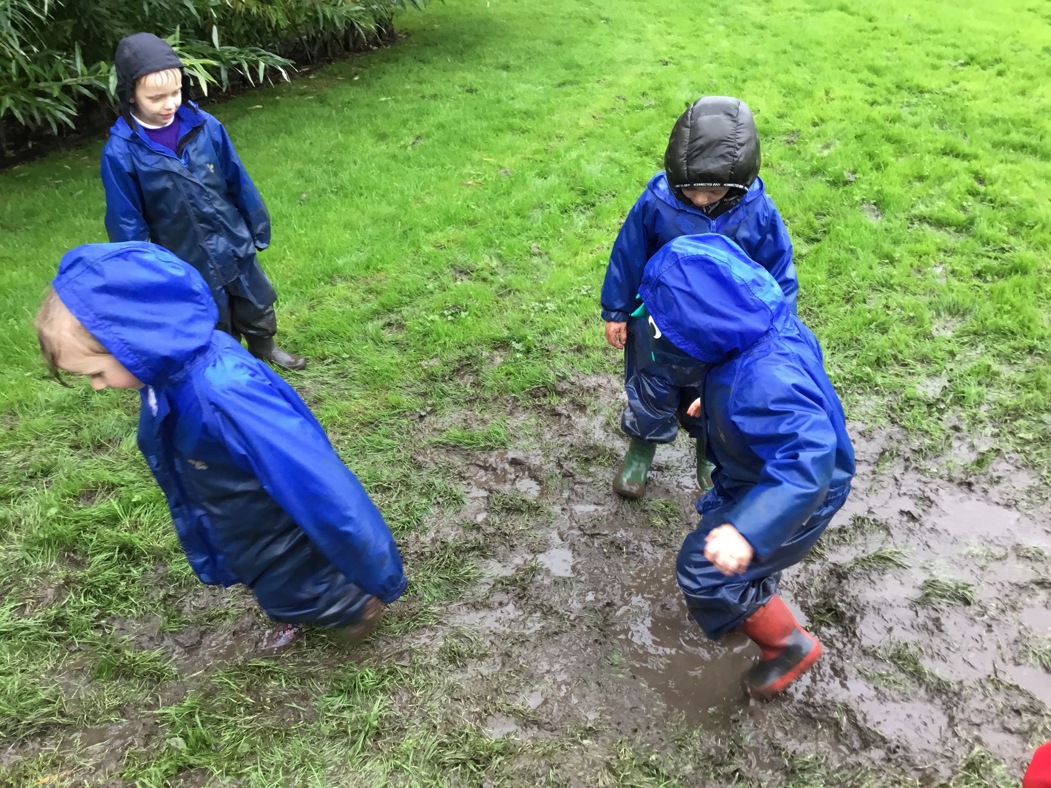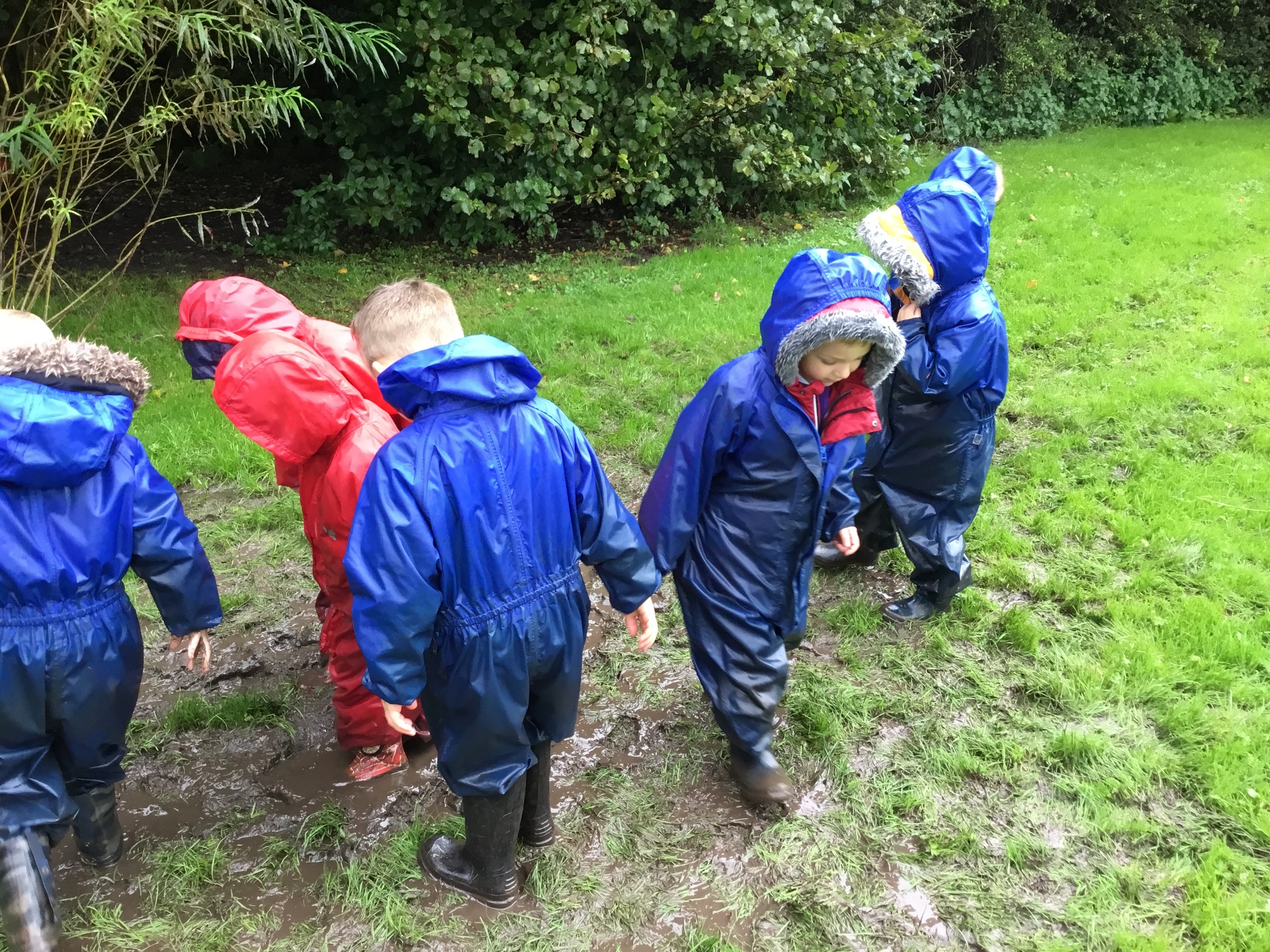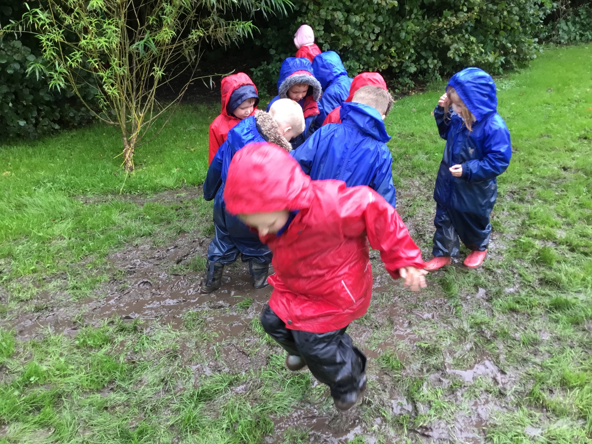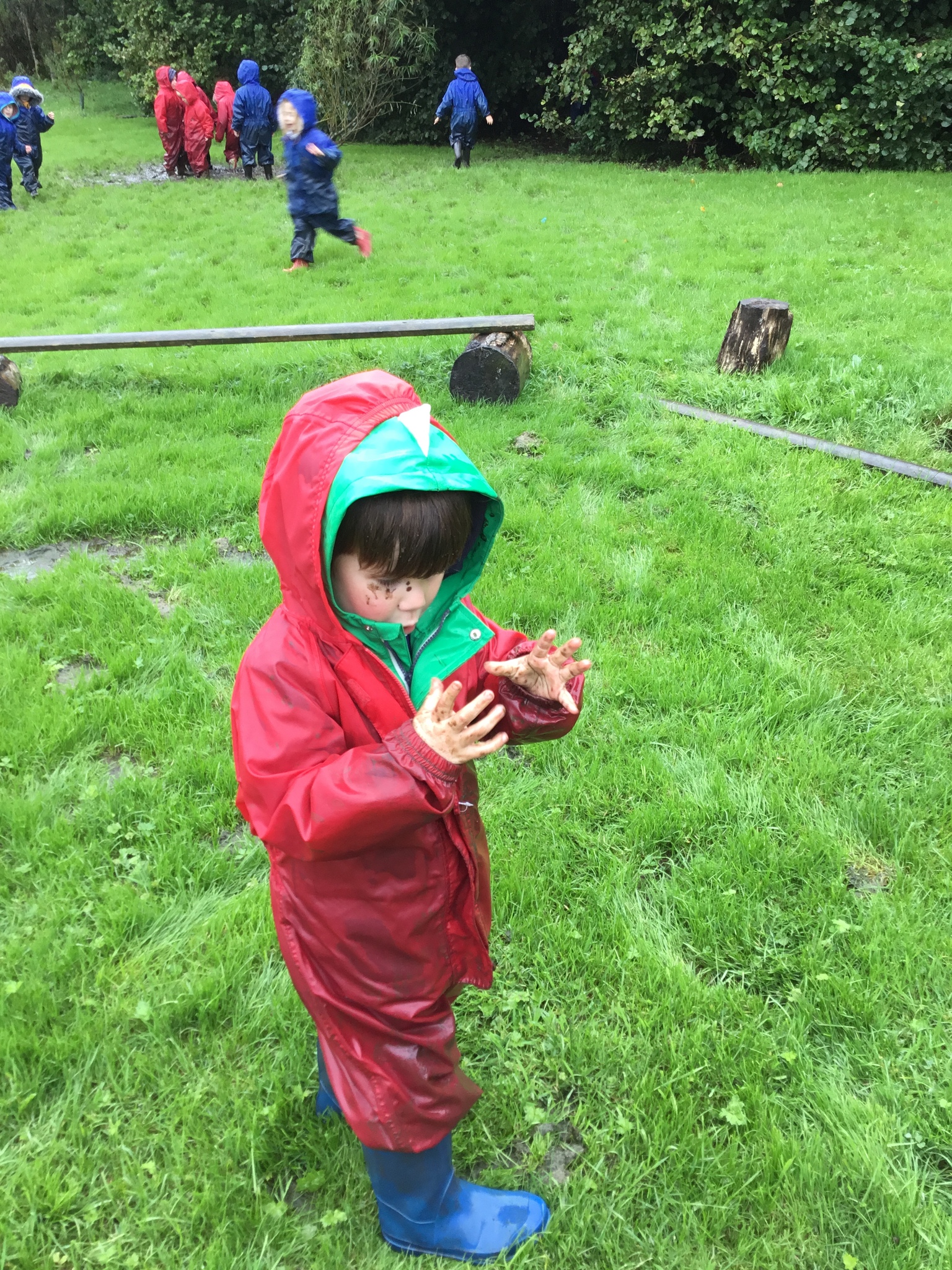 It takes more than a spot of torrential rain to dampen the enthusiasm of Reception when it comes to Forest School. This afternoon's rain only made the experience more exciting by creating lots and lots of lovely mud! We found slippy mud, squelchy mud, sticky mud and a nice deep puddle of splashy mud. Mudtastic!