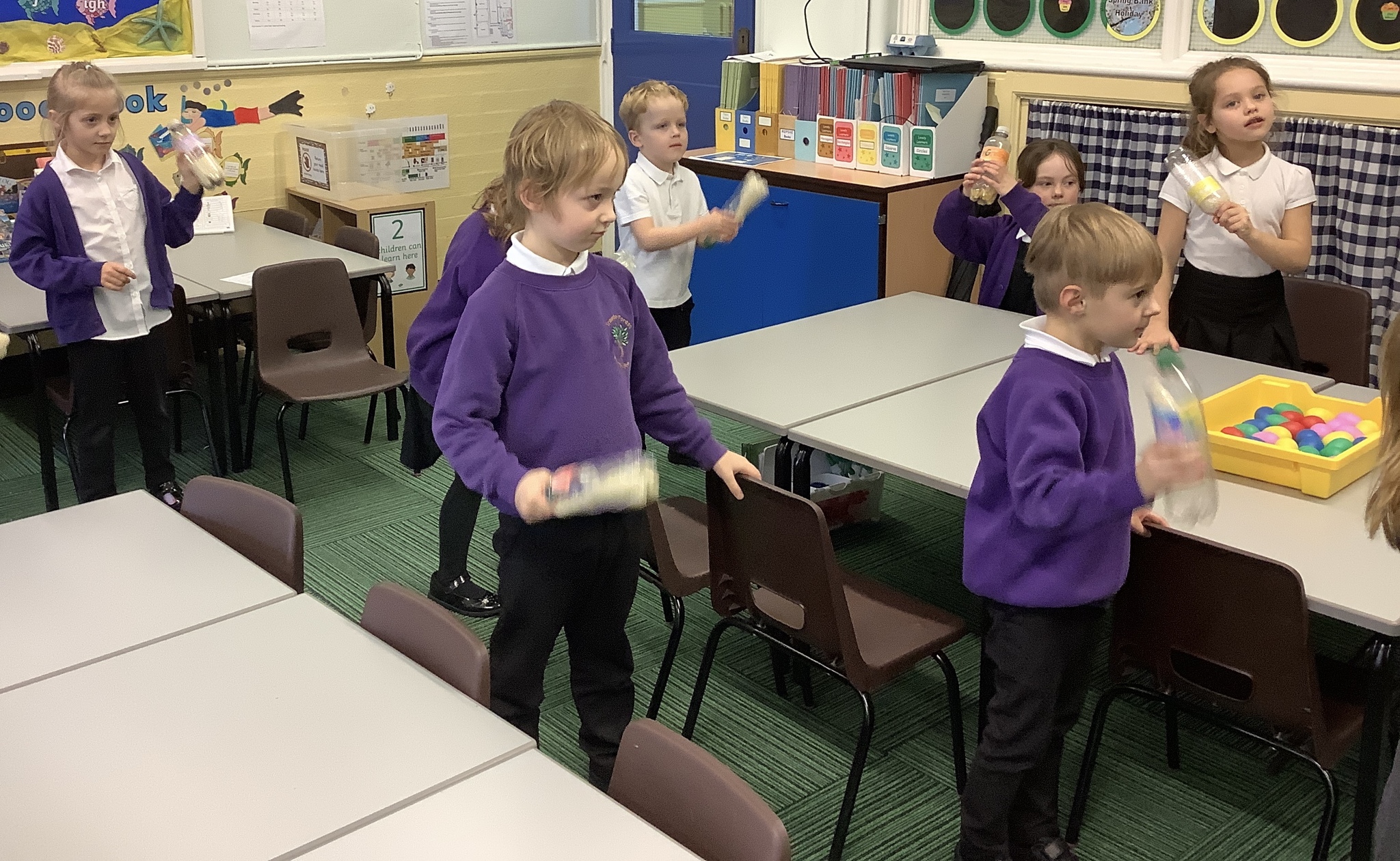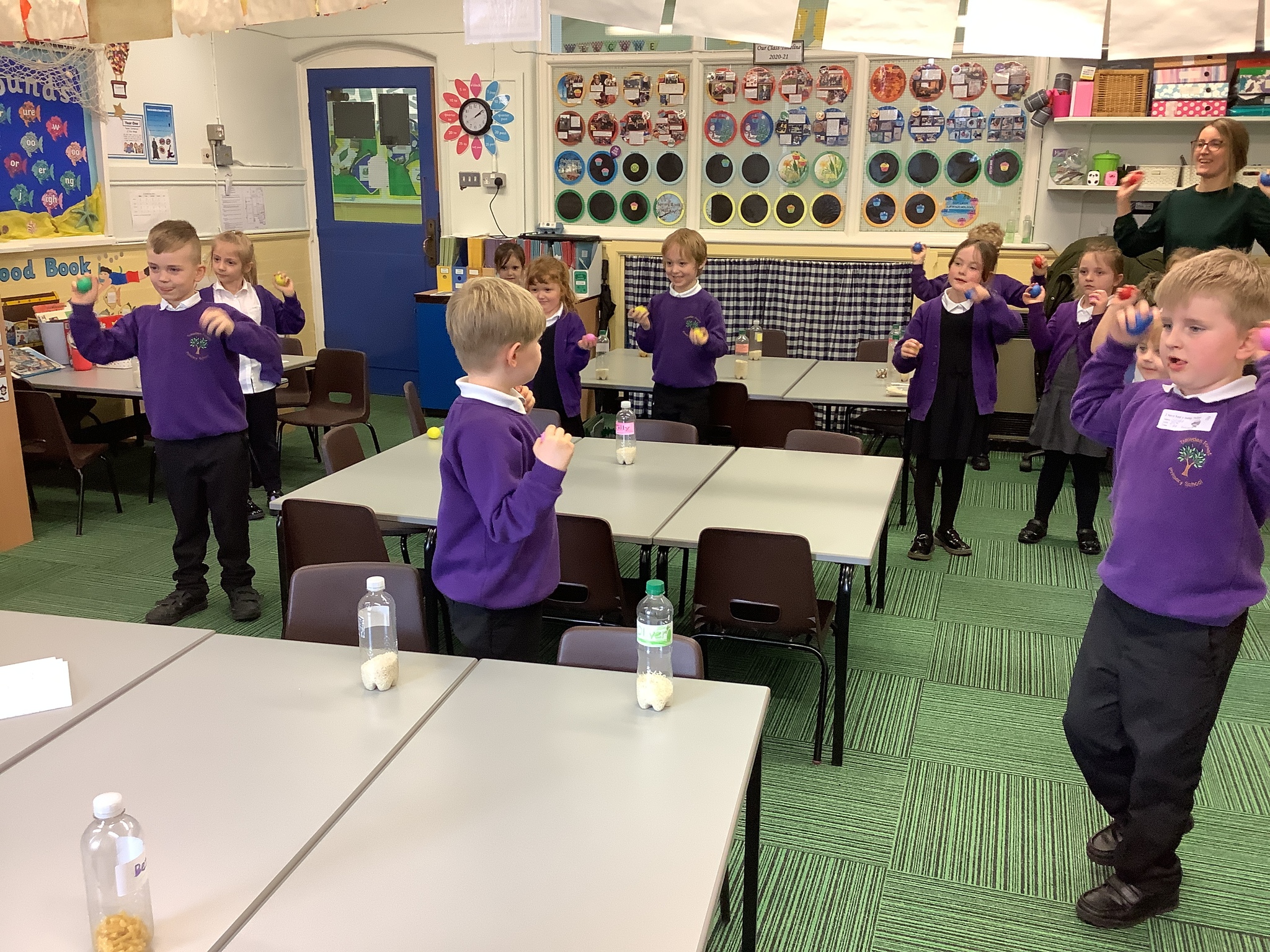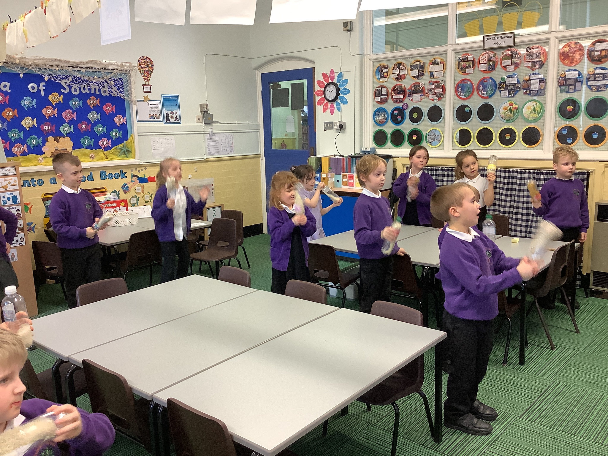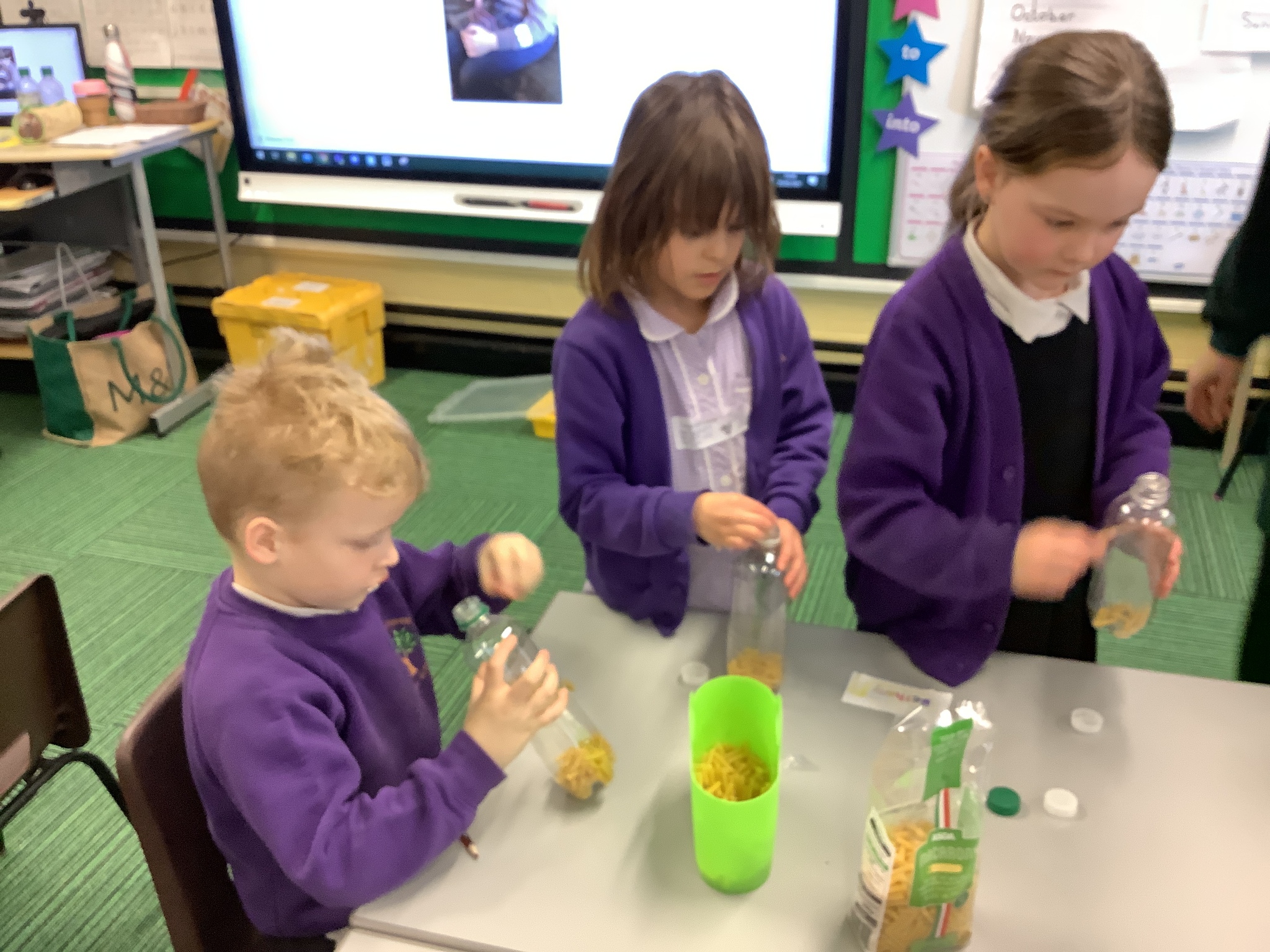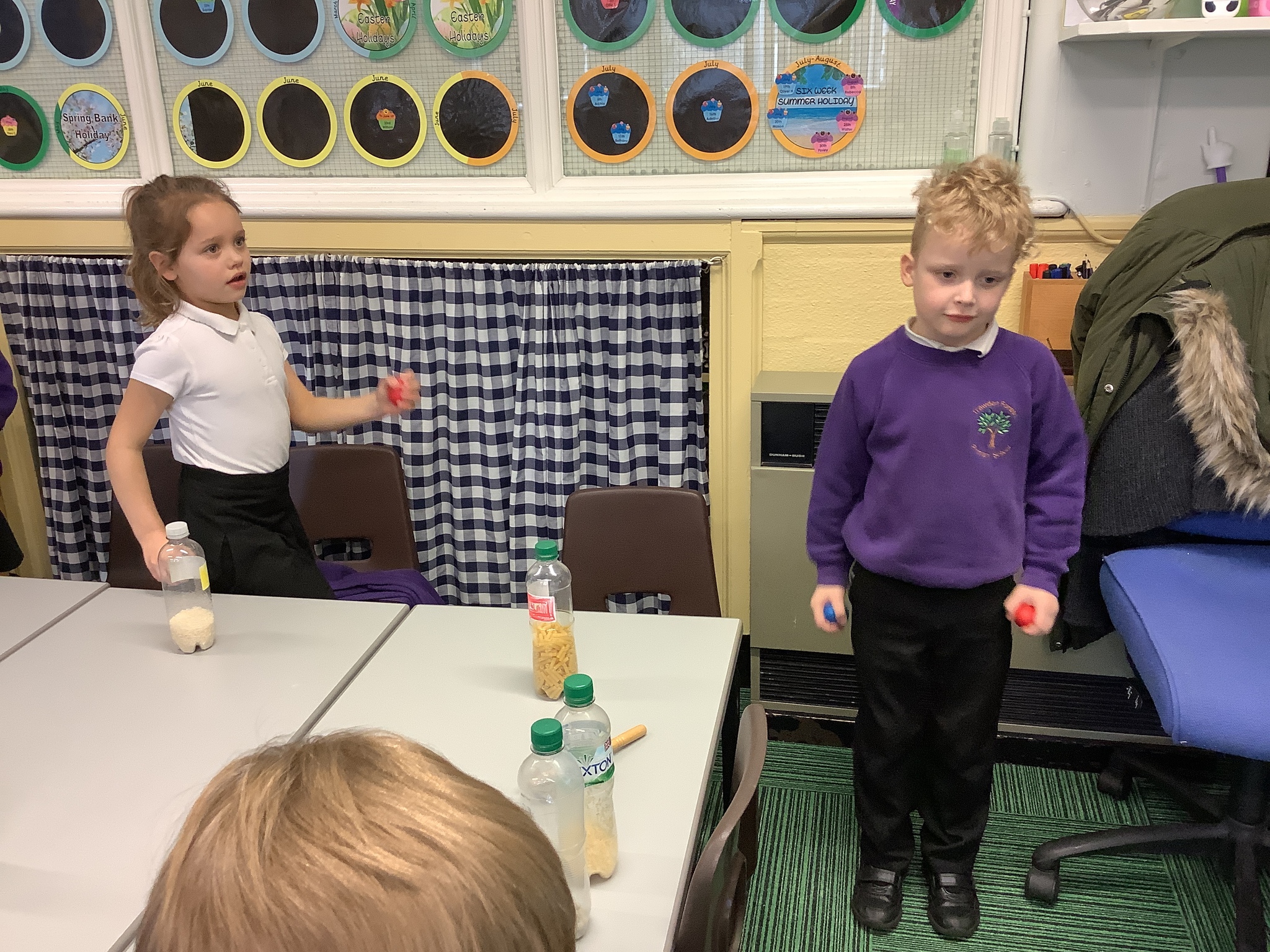 We followed Starry Eyed Stan’s instructions to make our own maracas. We used empty bottles and then chose either pasta or rice to fill them. We then tested out the different sounds they made depending on how much was in them and how we shook them. We enjoyed using our maracas to join in with lots of different songs including the songs in our Rock Kidz assembly.