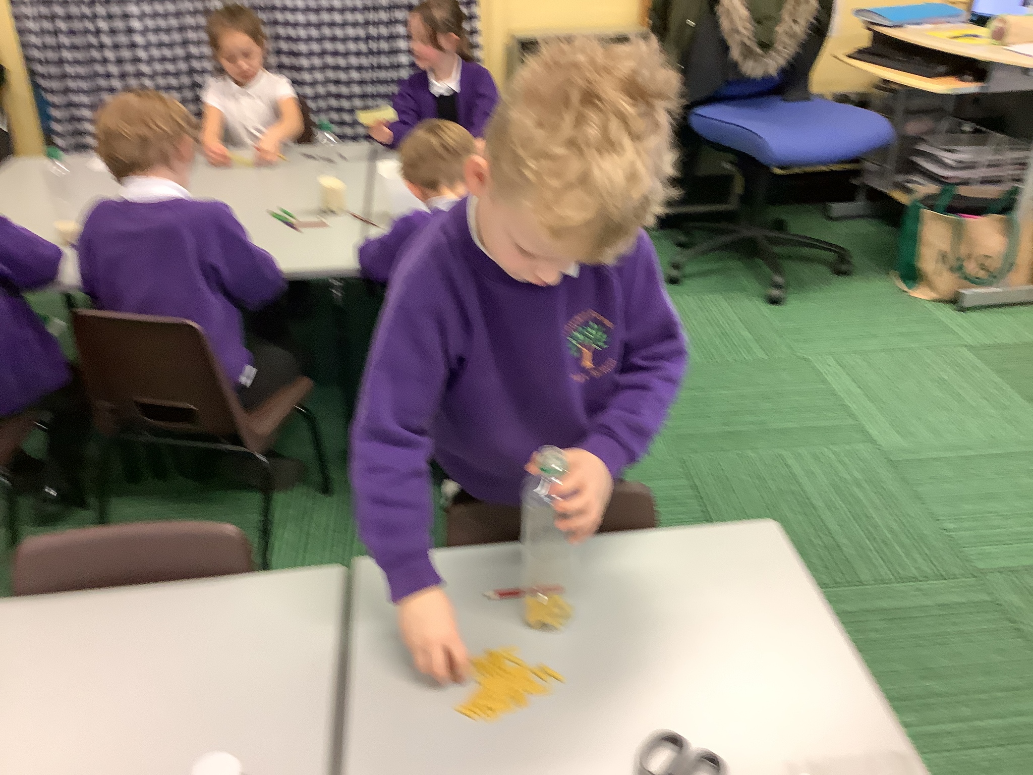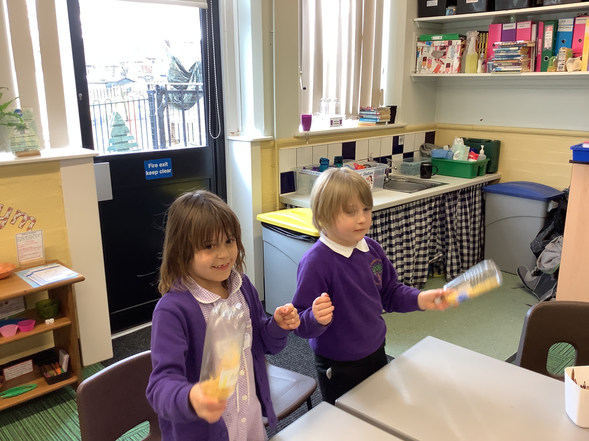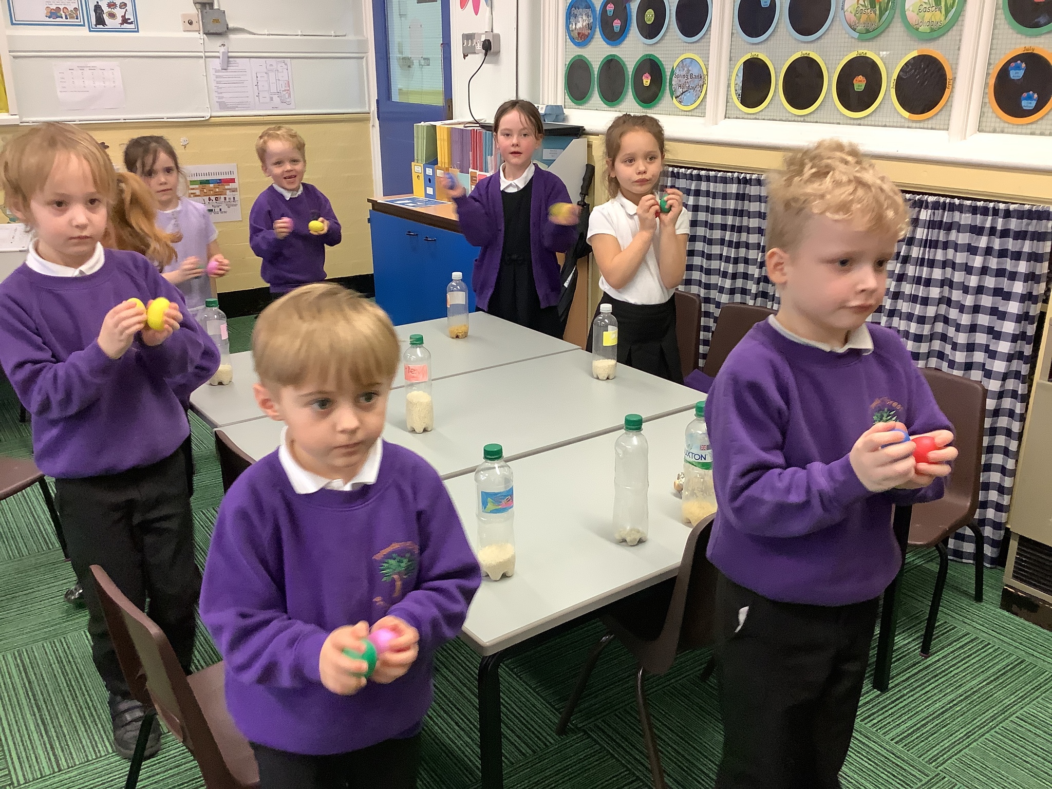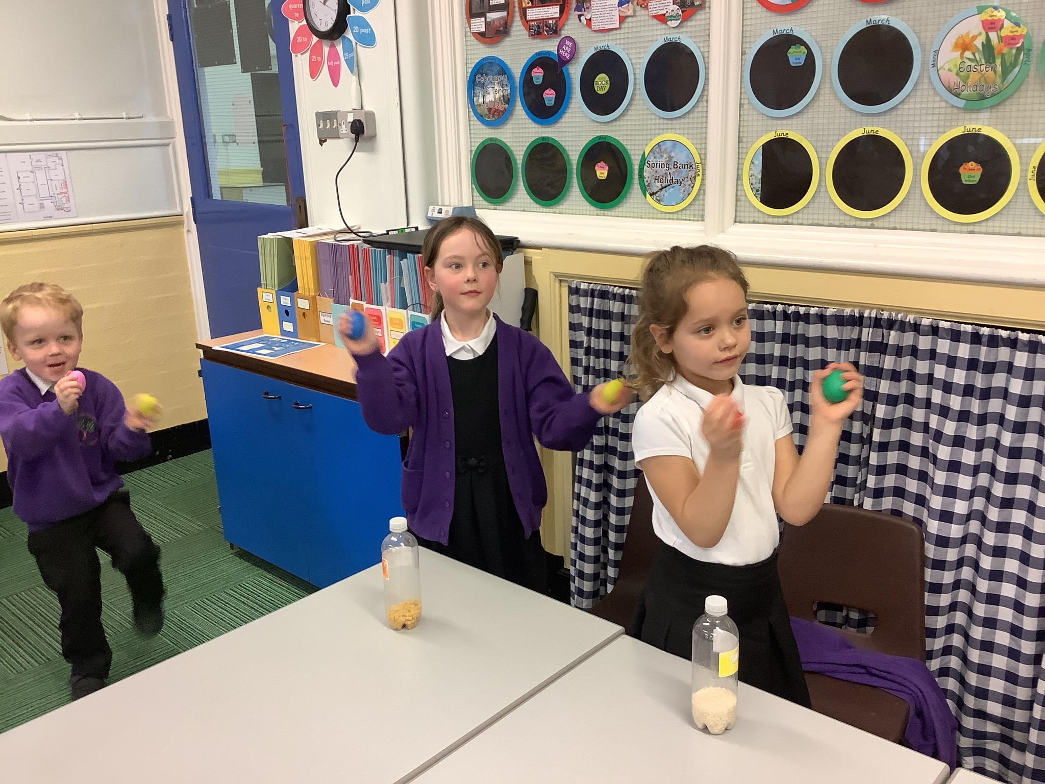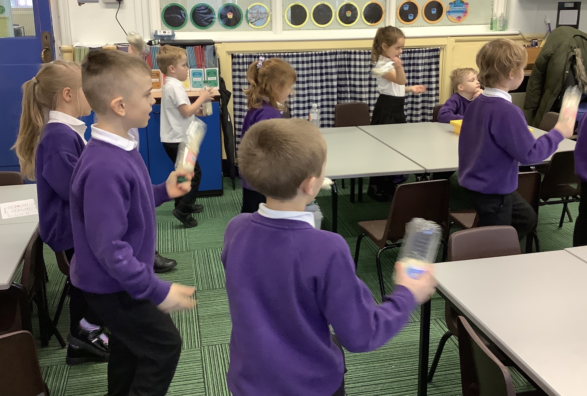 We followed Starry Eyed Stan’s instructions to make our own maracas. We used empty bottles and then chose either pasta or rice to fill them. We then tested out the different sounds they made depending on how much was in them and how we shook them. We enjoyed using our maracas to join in with lots of different songs including the songs in our Rock Kidz assembly.