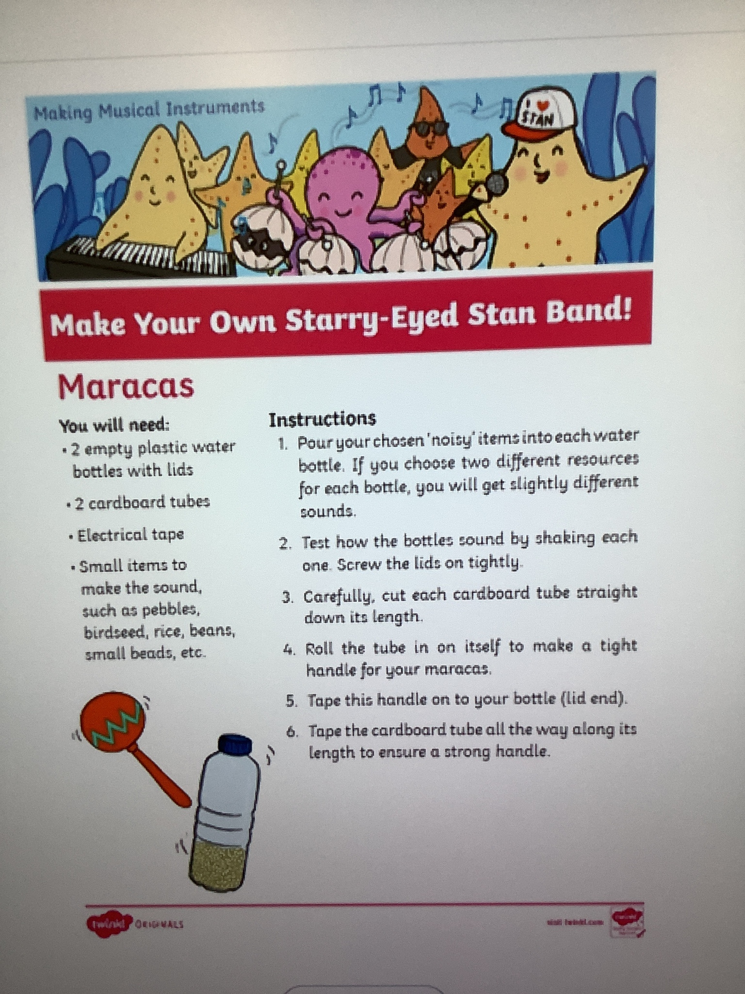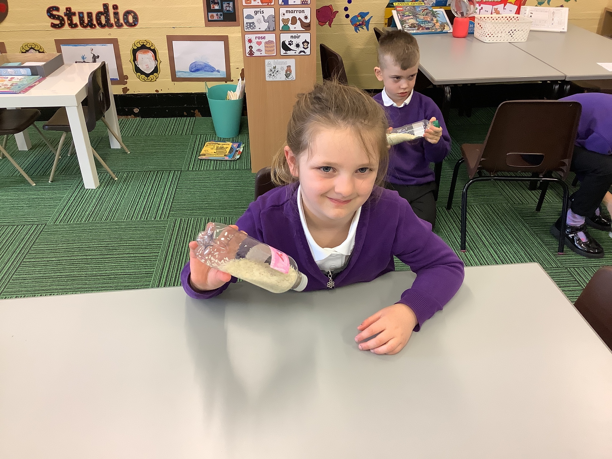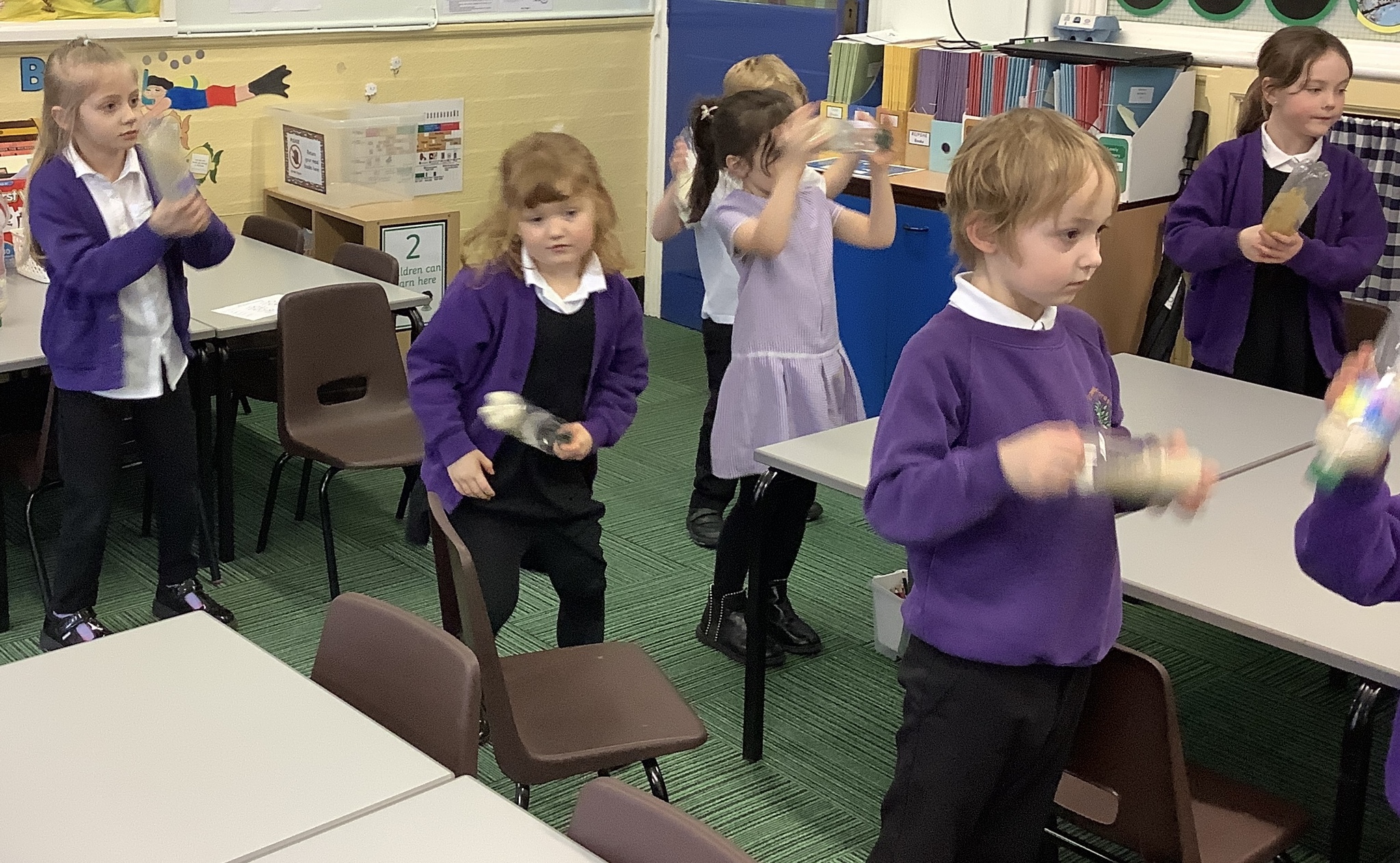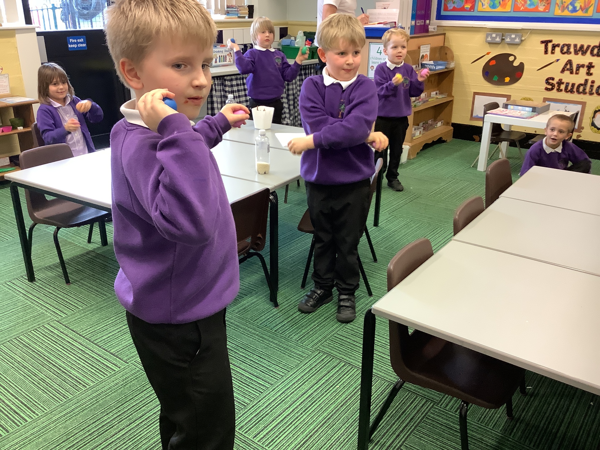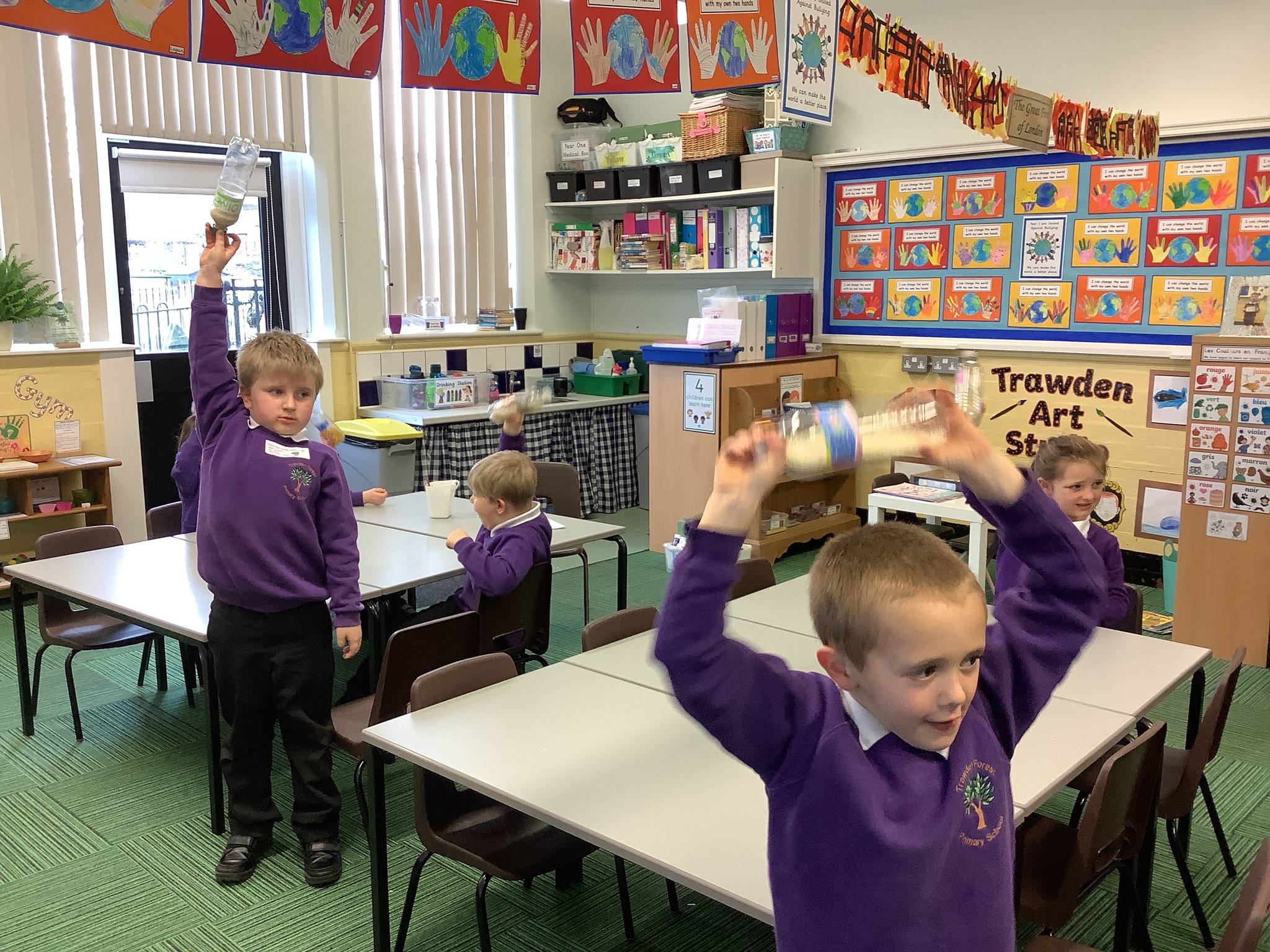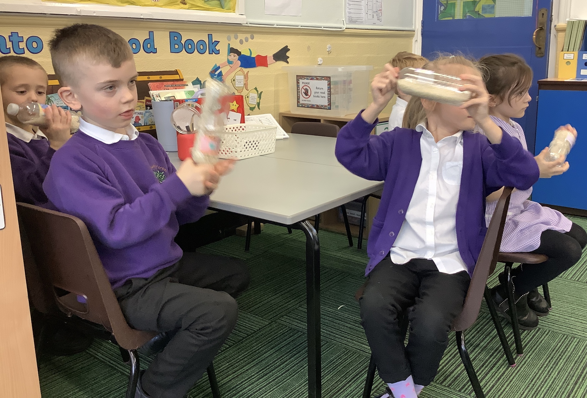 We followed Starry Eyed Stan’s instructions to make our own maracas. We used empty bottles and then chose either pasta or rice to fill them. We then tested out the different sounds they made depending on how much was in them and how we shook them. We enjoyed using our maracas to join in with lots of different songs including the songs in our Rock Kidz assembly.