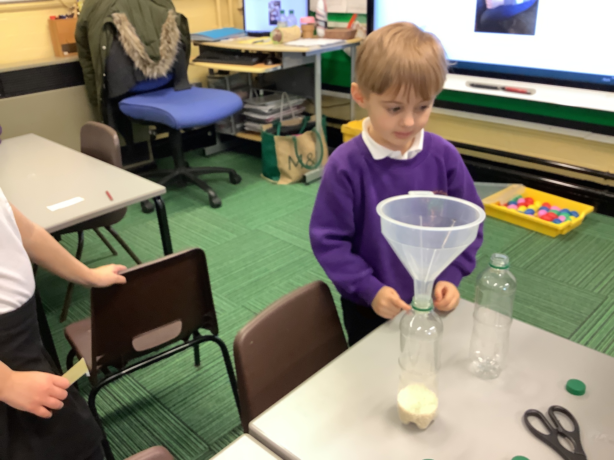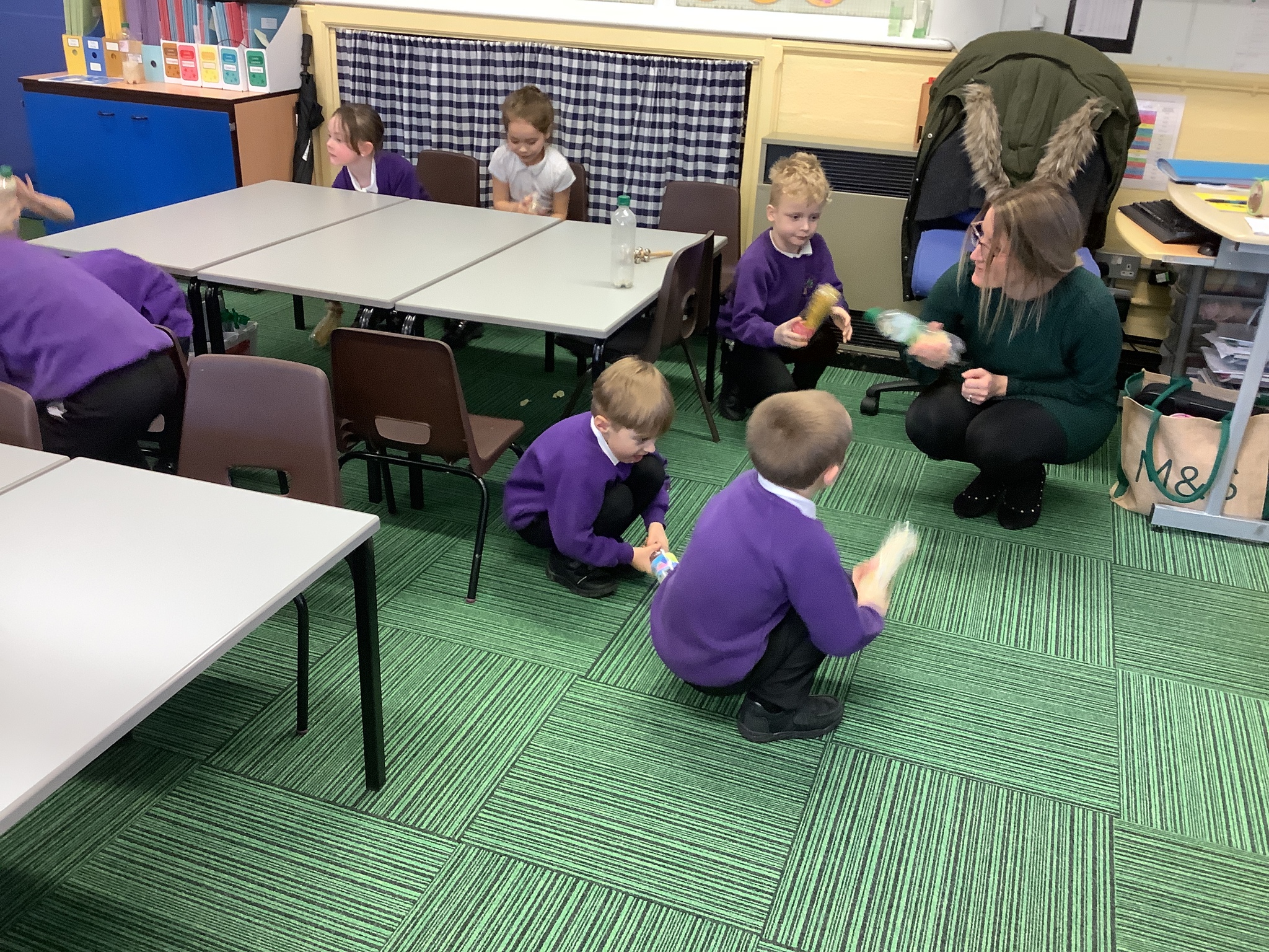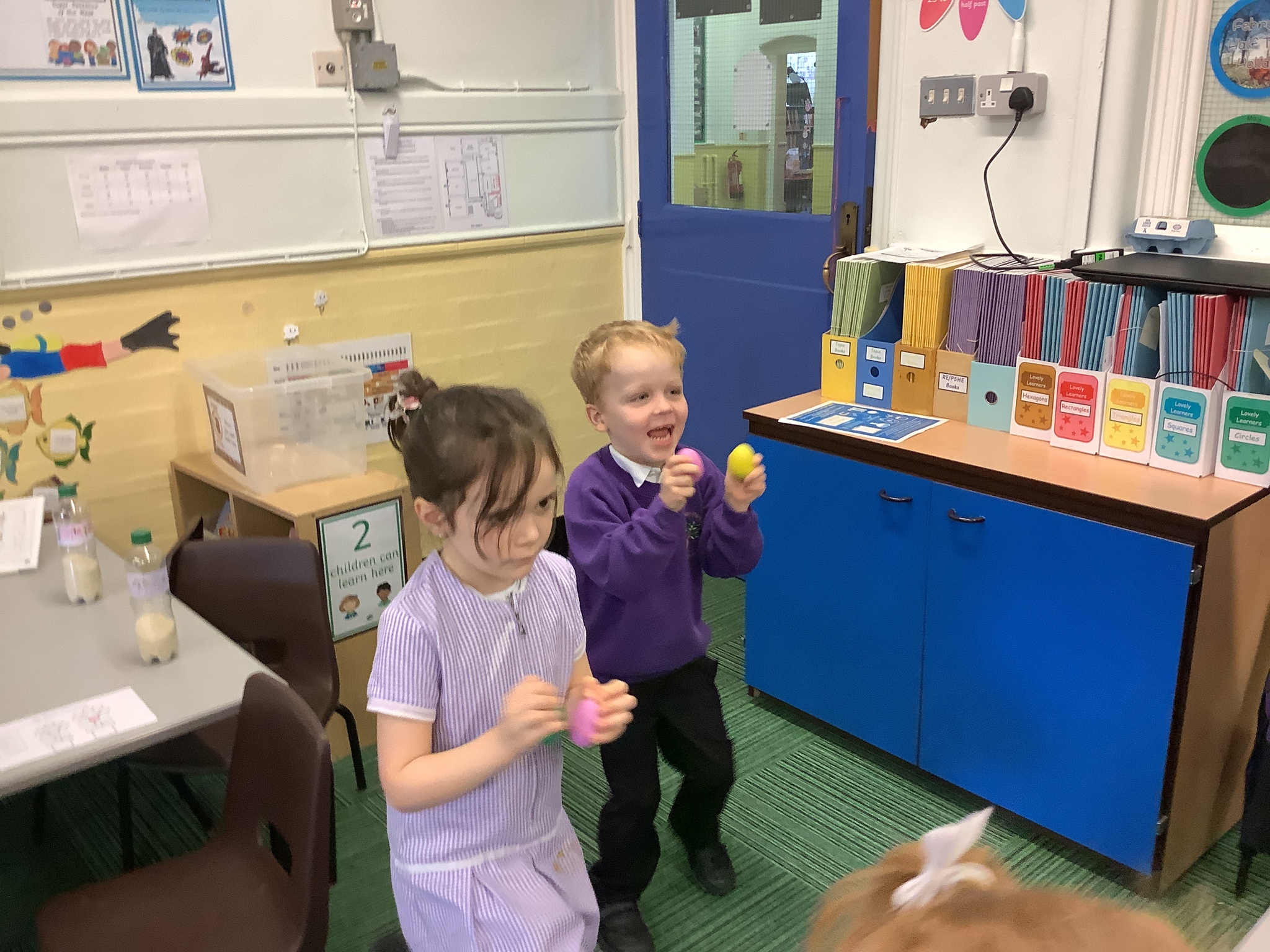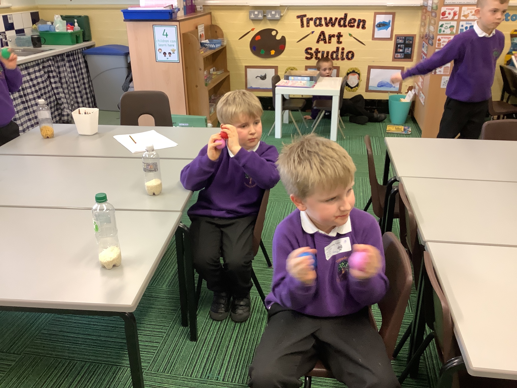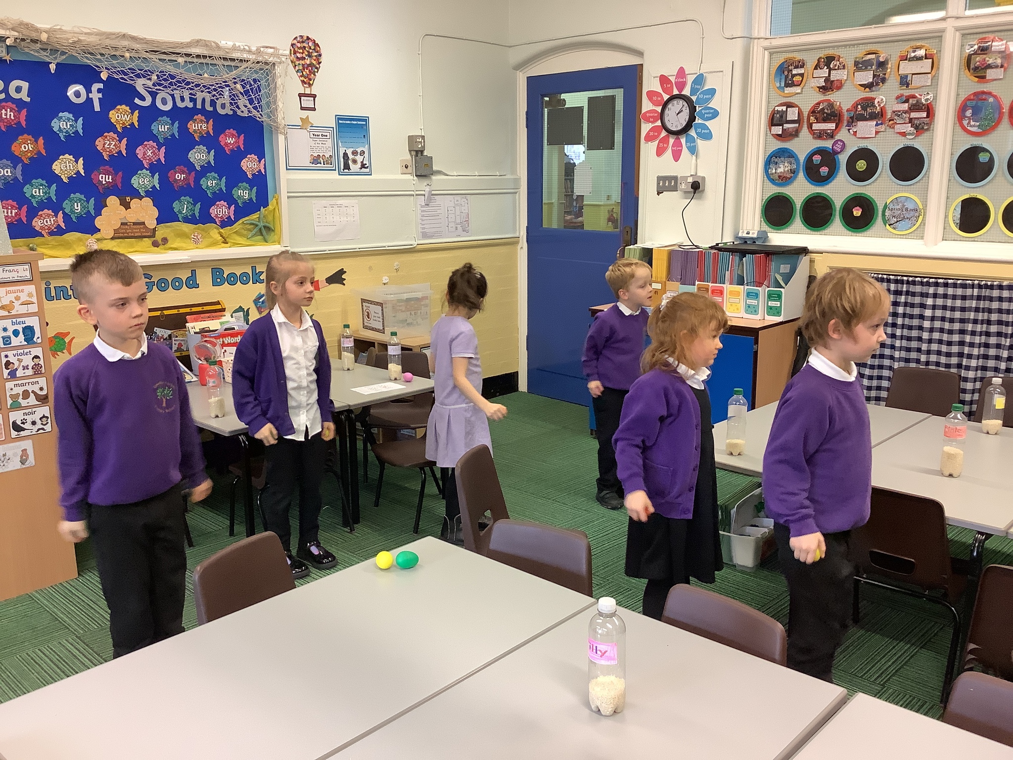 We followed Starry Eyed Stan’s instructions to make our own maracas. We used empty bottles and then chose either pasta or rice to fill them. We then tested out the different sounds they made depending on how much was in them and how we shook them. We enjoyed using our maracas to join in with lots of different songs including the songs in our Rock Kidz assembly.