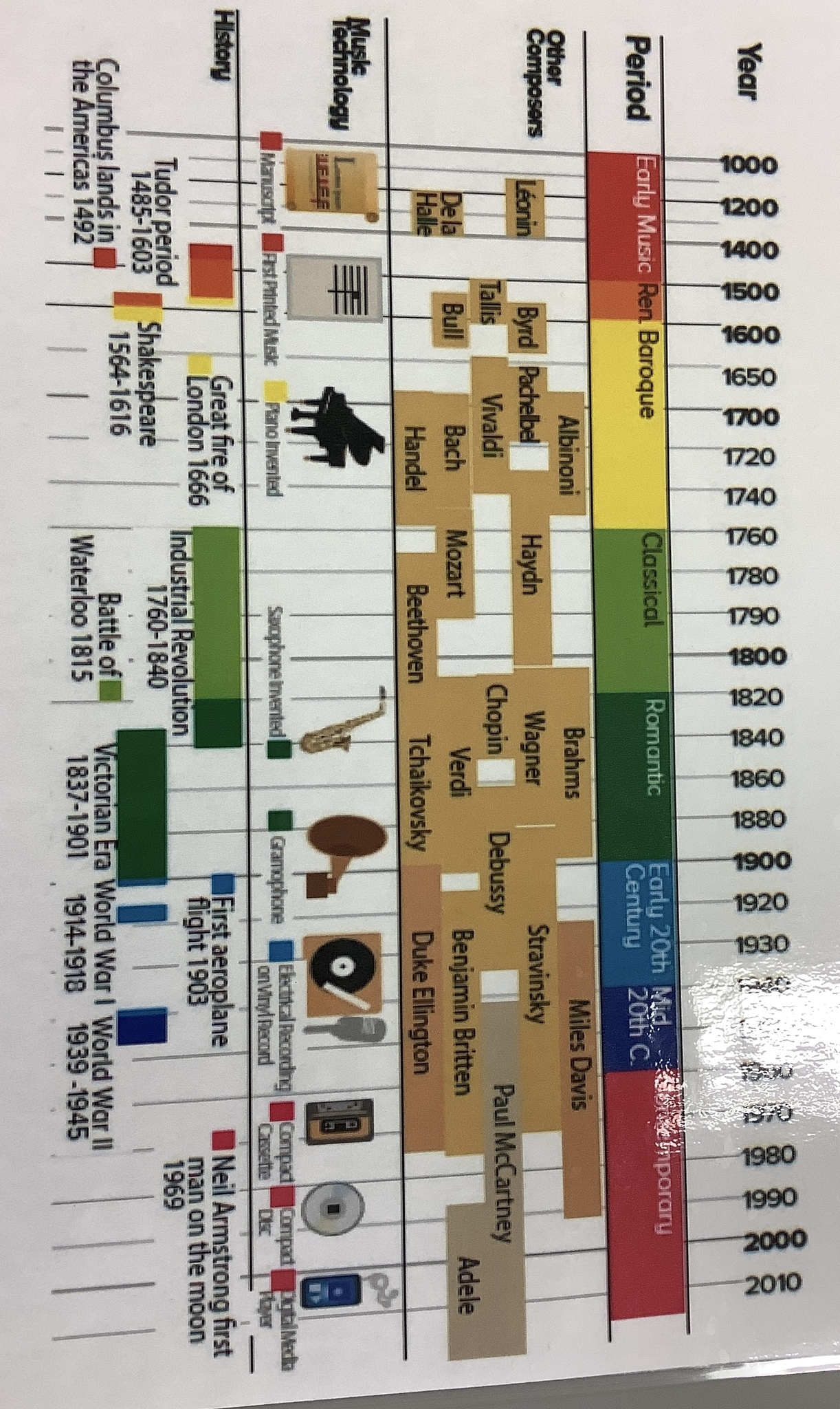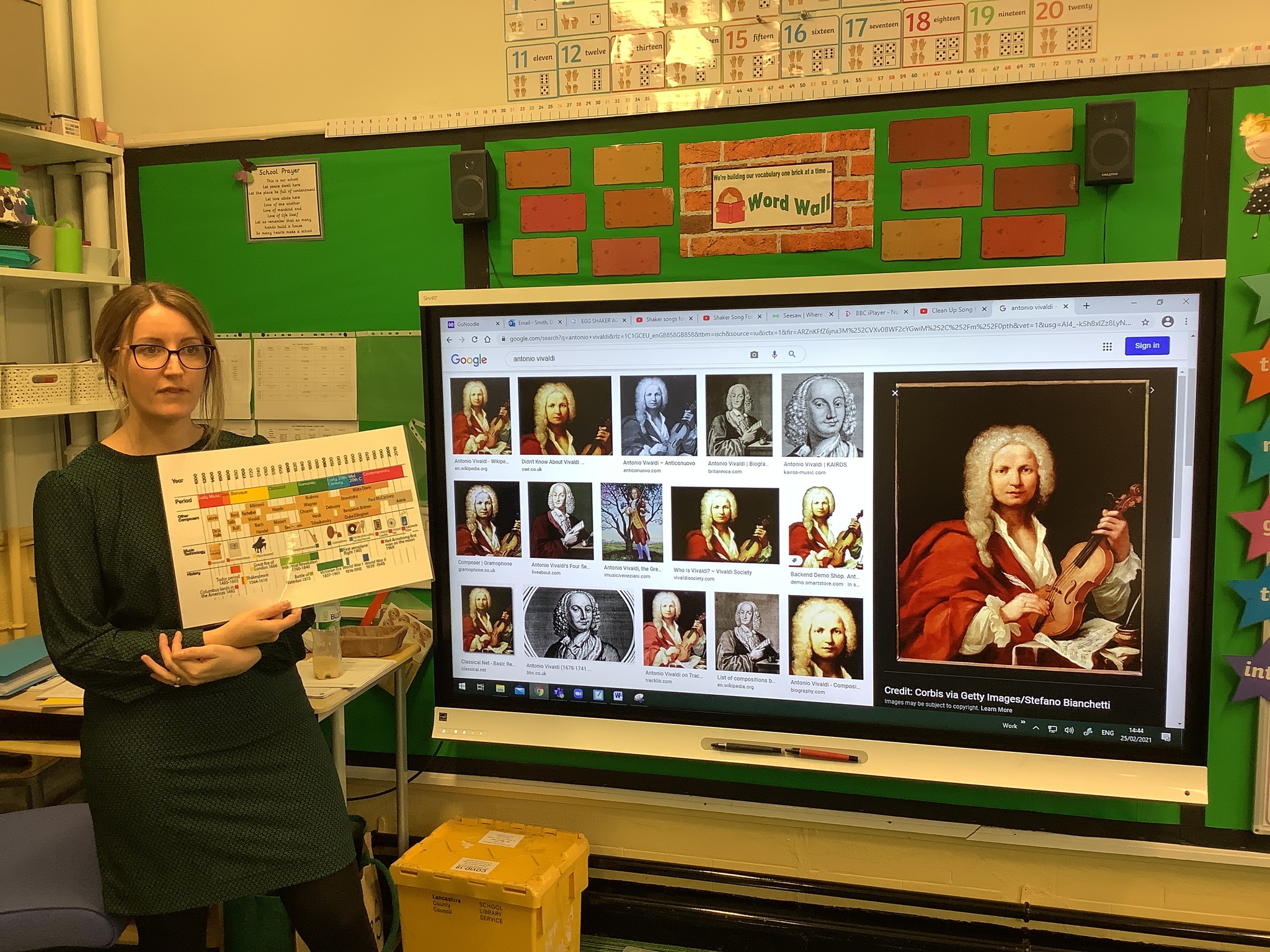 We discussed the meaning of the word ‘composer’ and looked at our timeline. We noticed that Vivaldi composed songs around the same time as the Great Fire of London. We decided to find out a little bit more about him and his music. We used our maracas to join in with one of his pieces of music called ‘Spring’.
