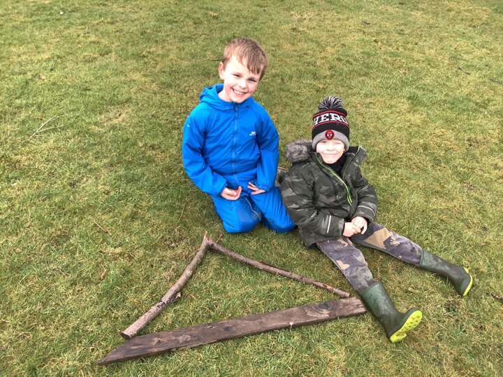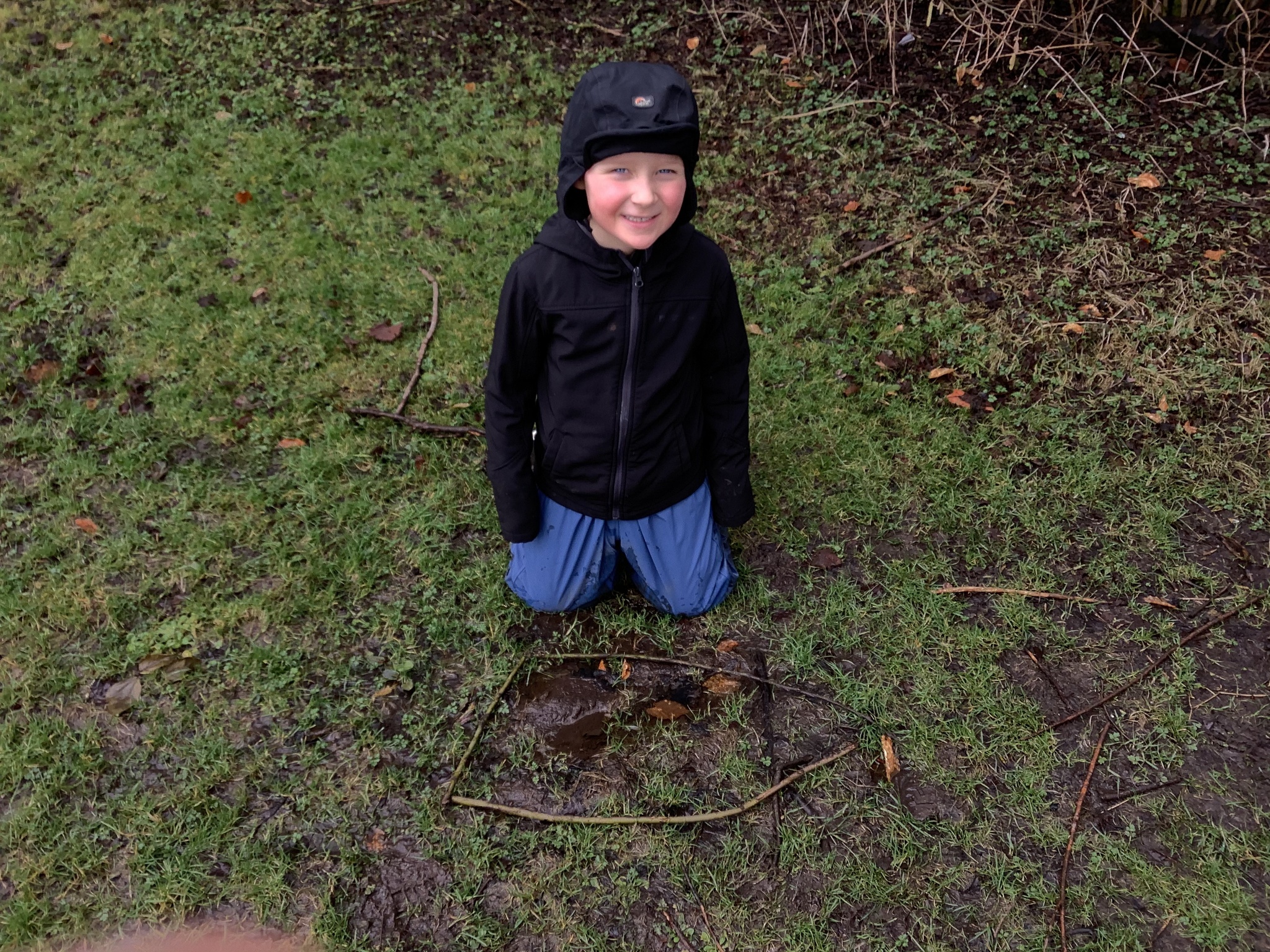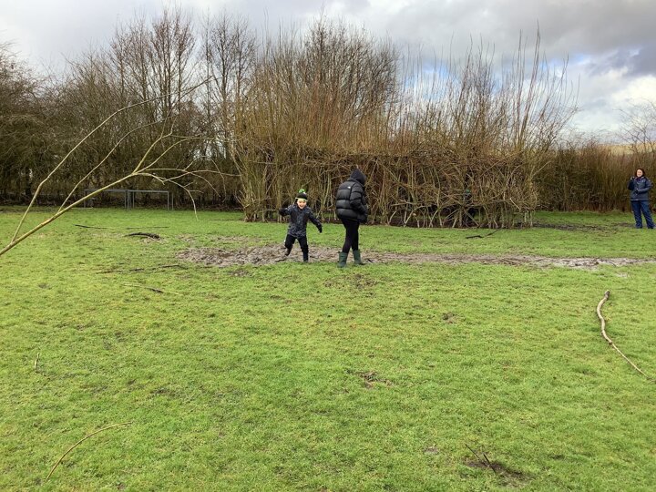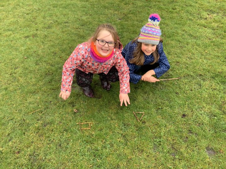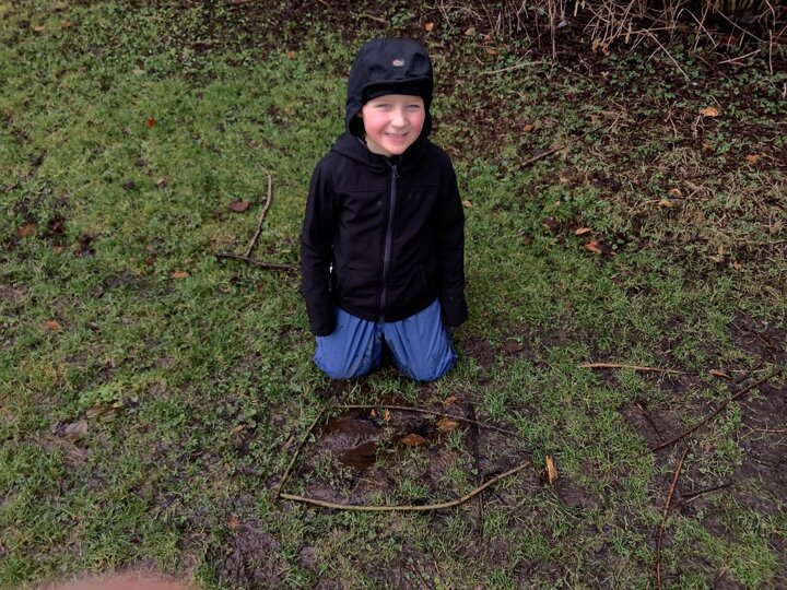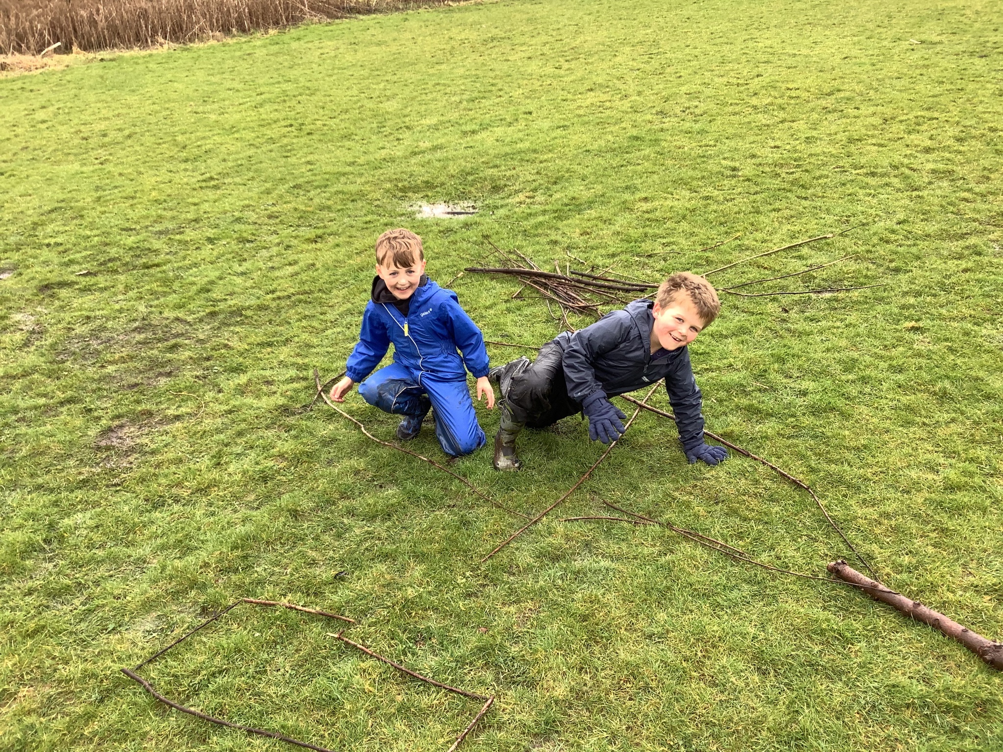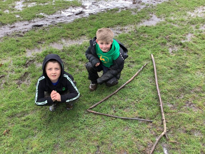The children decided the focus of the lesson and began by using materials around our school field to create 2D shapes, once this task was completed, they wanted to explore the very muddy field and work in small groups to make dens of various shapes and sizes.