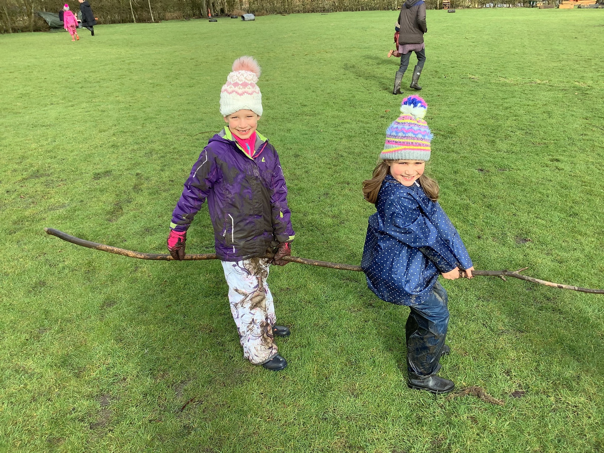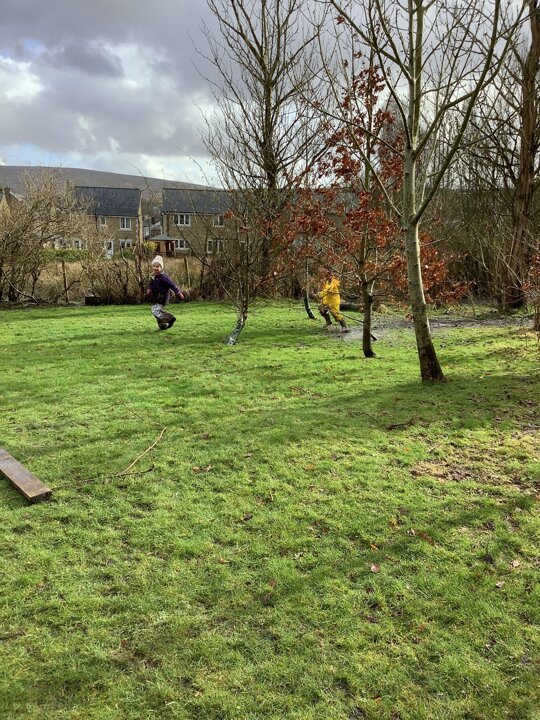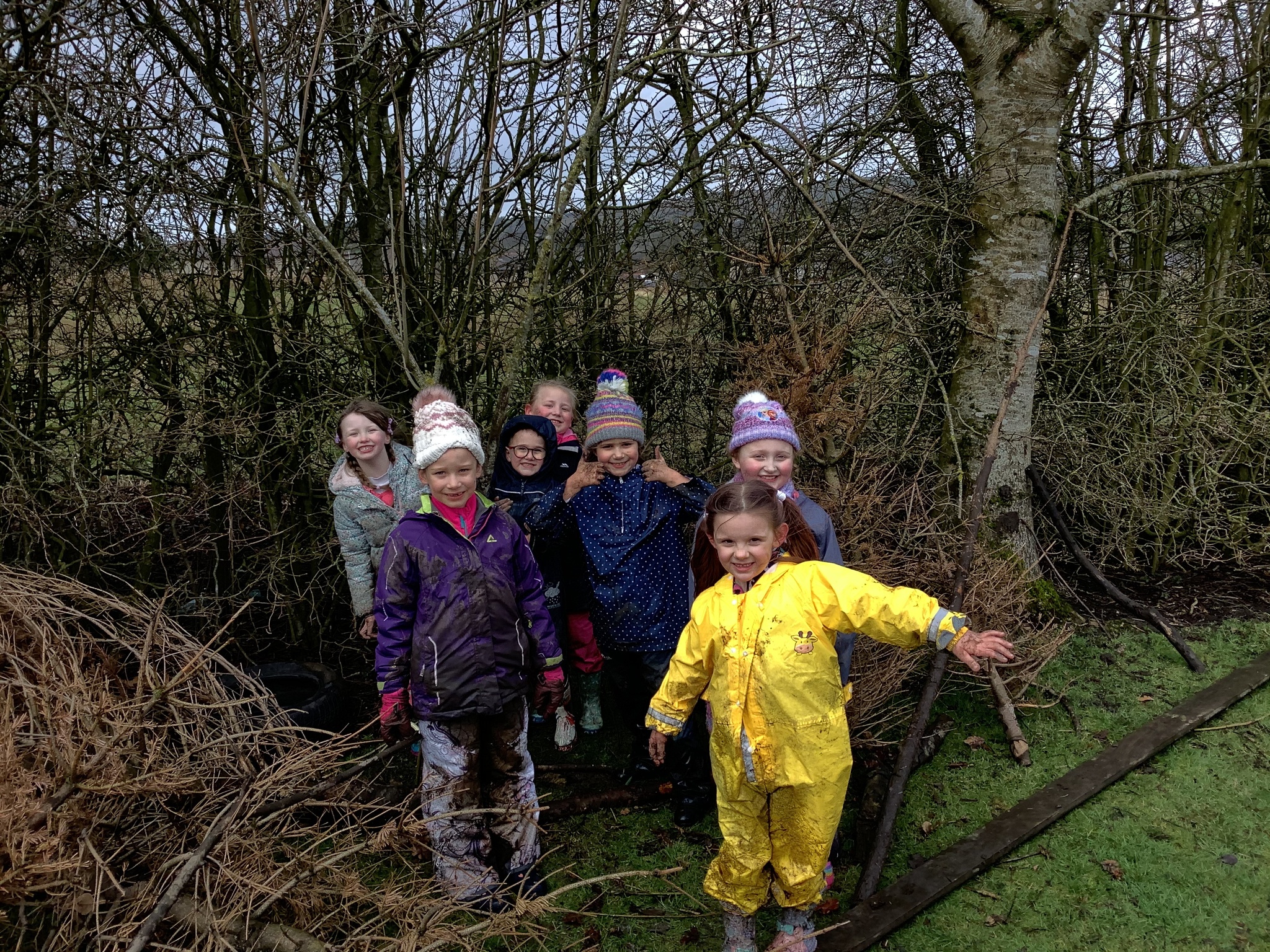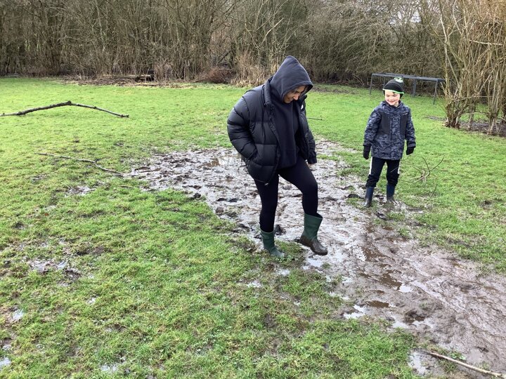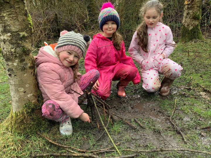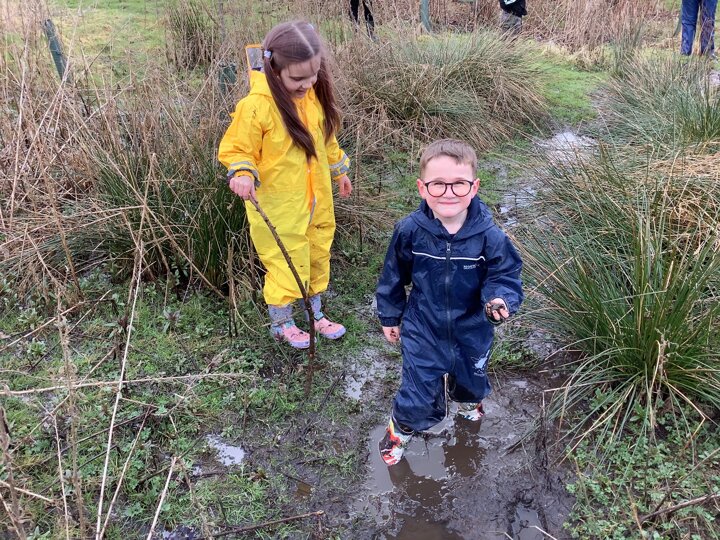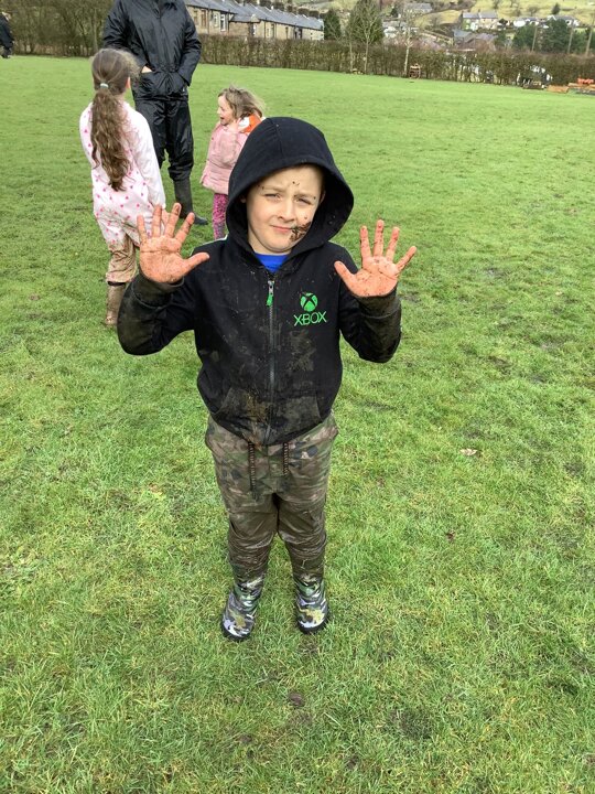 The children decided the focus of the lesson and began by using materials around our school field to create 2D shapes, once this task was completed, they wanted to explore the very muddy field and work in small groups to make dens of various shapes and sizes.