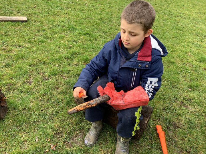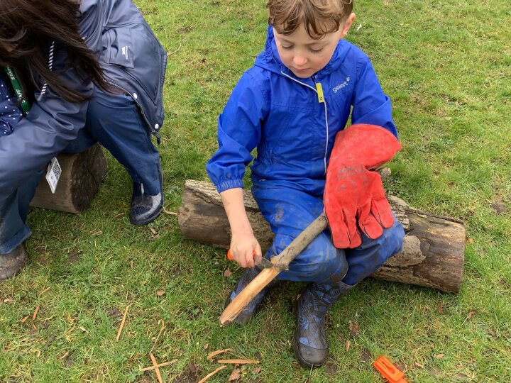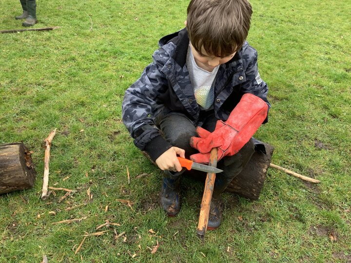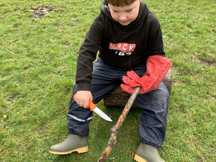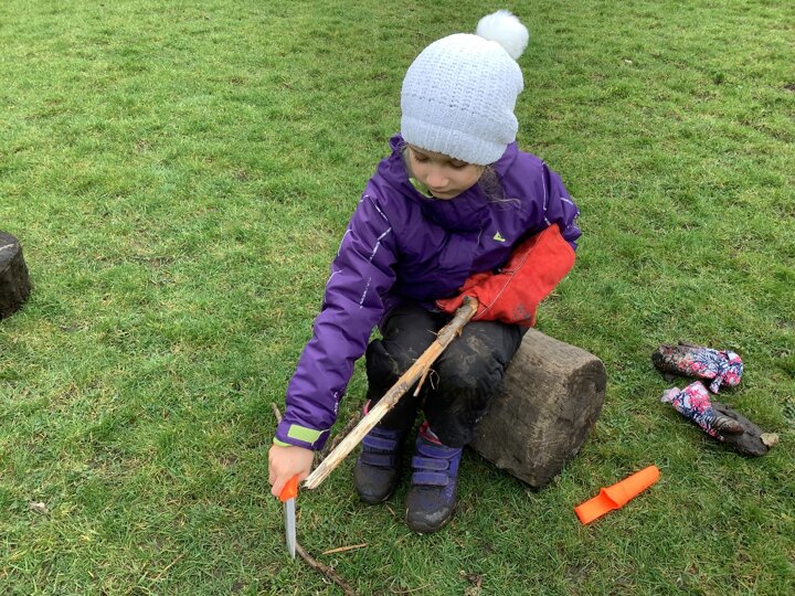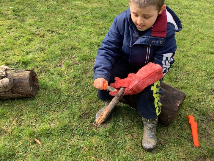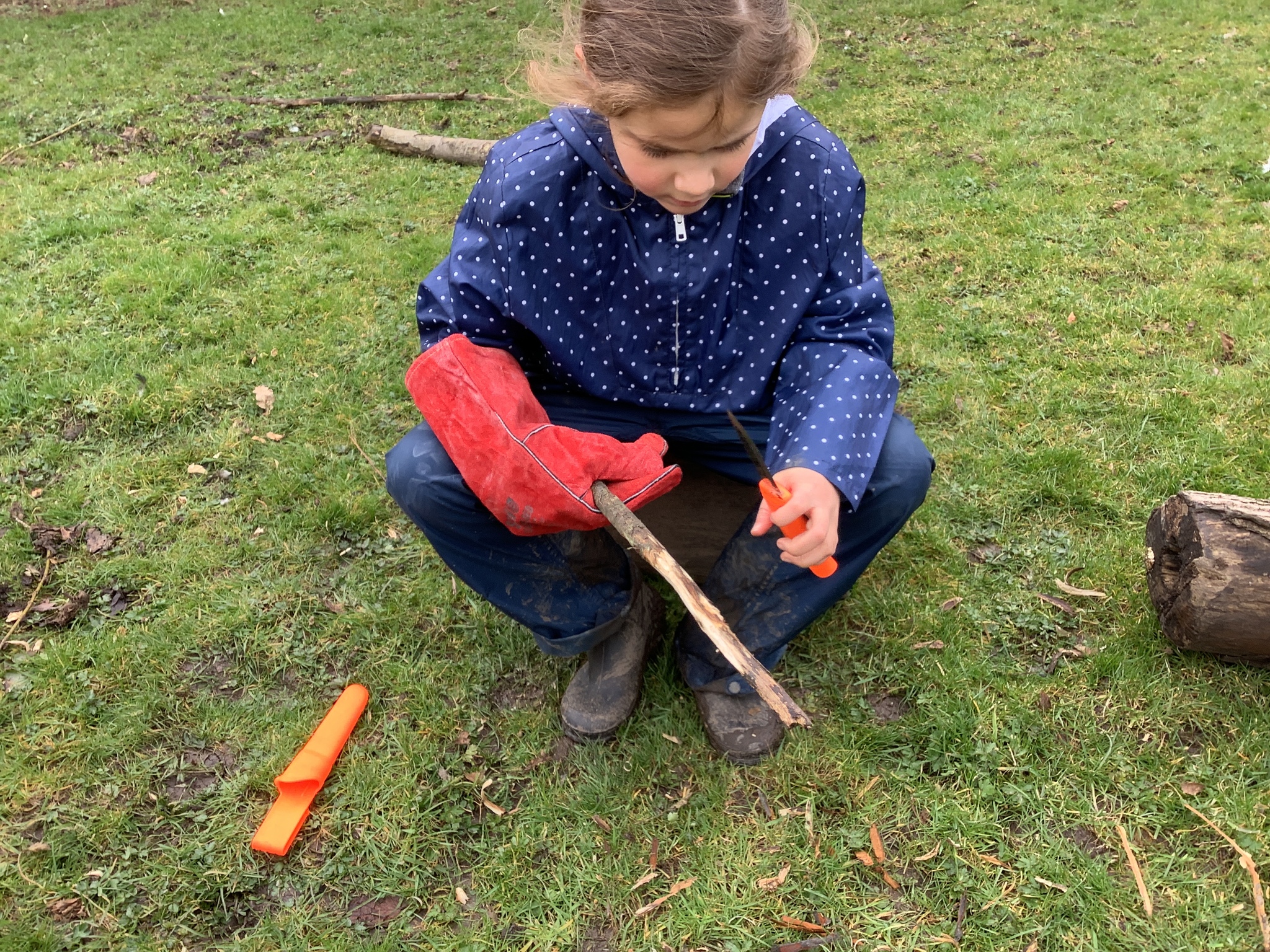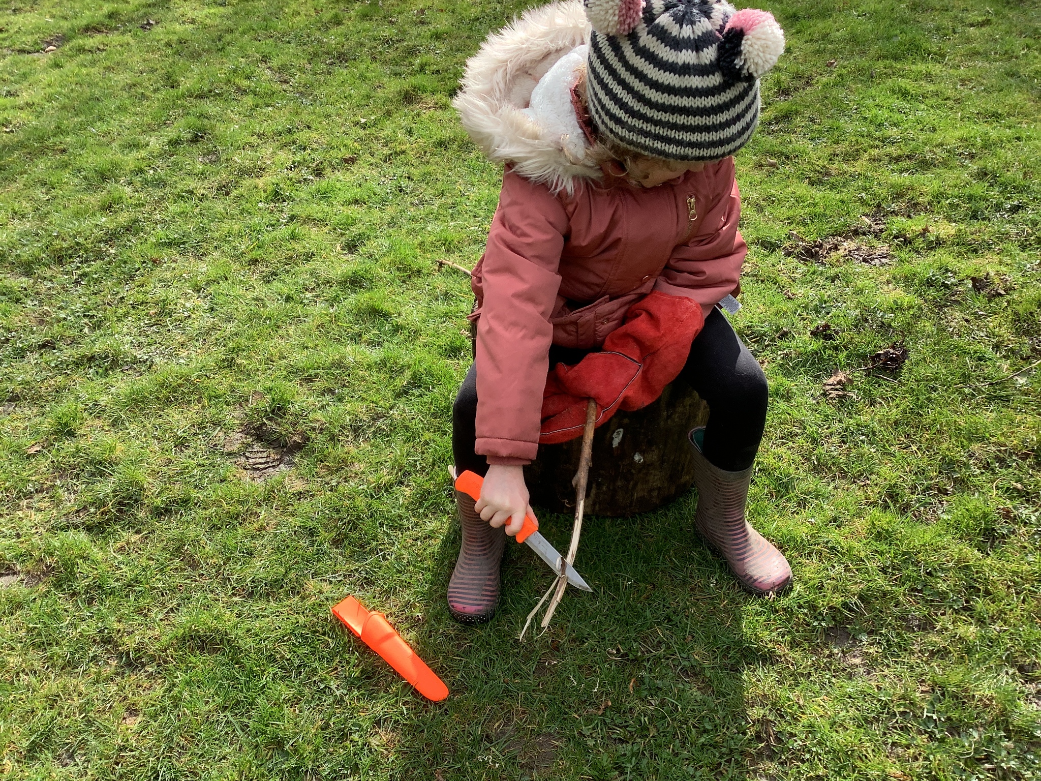 Today, Year 2 had one of their most exciting and dangerous Forest School lessons so far! They had the opportunity to use knives to remove the bark from branches.