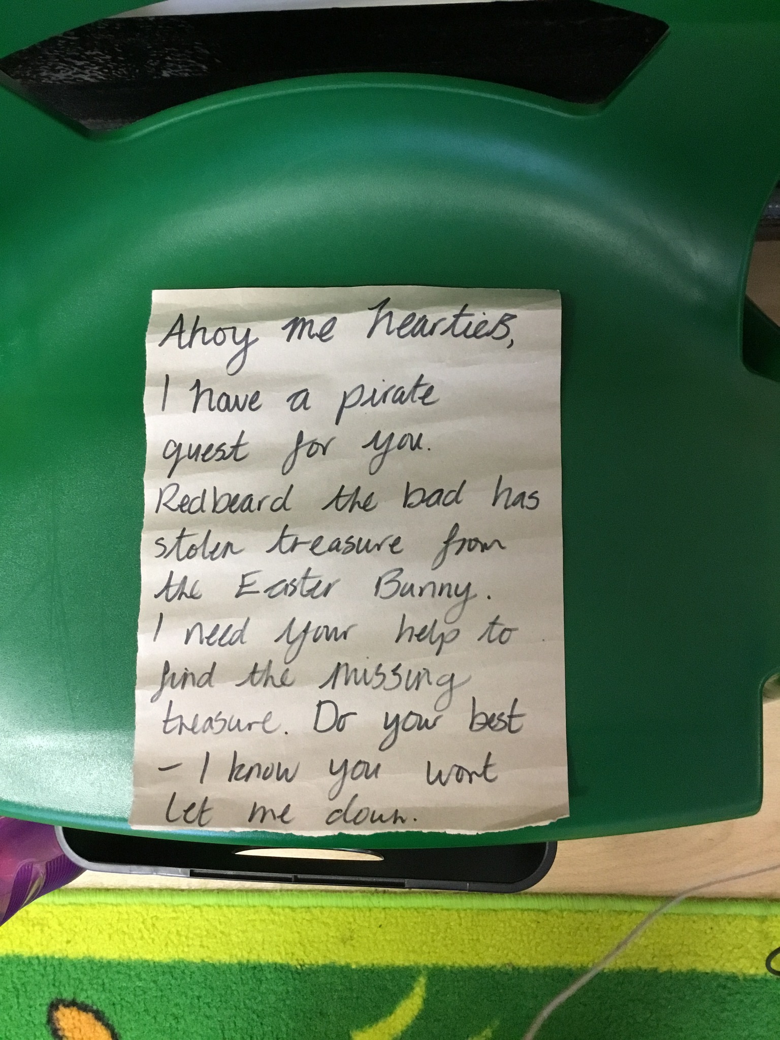 This afternoon Reception found a mysterious letter in their classroom. It came from someone called Captain Flint and told us that a notorious pirate named Redbeard-the-Bad had stolen the Easter Bunny's treasure!