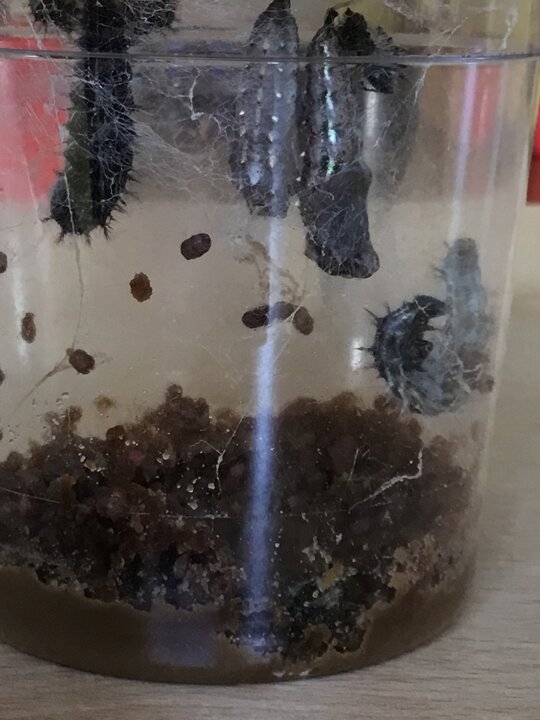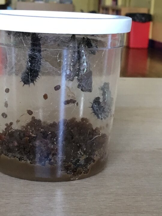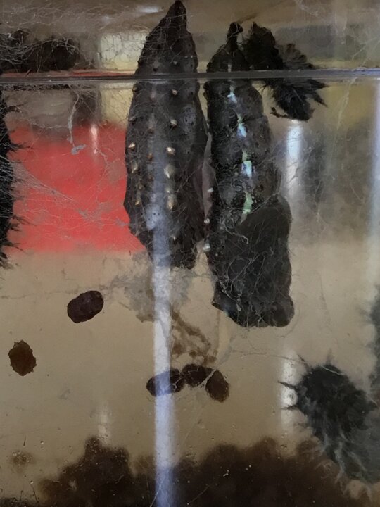 They climbed to the top of the pot and hung down. Then they changed colour slightly as they started to form the chrysalis in which they will transform.