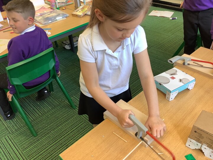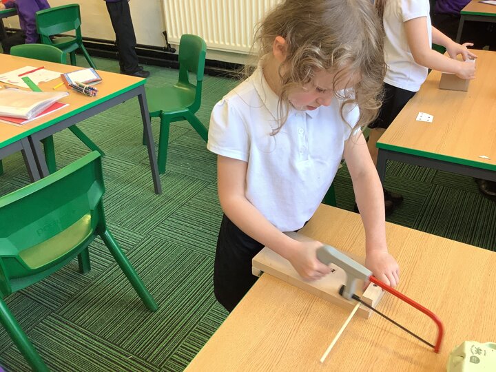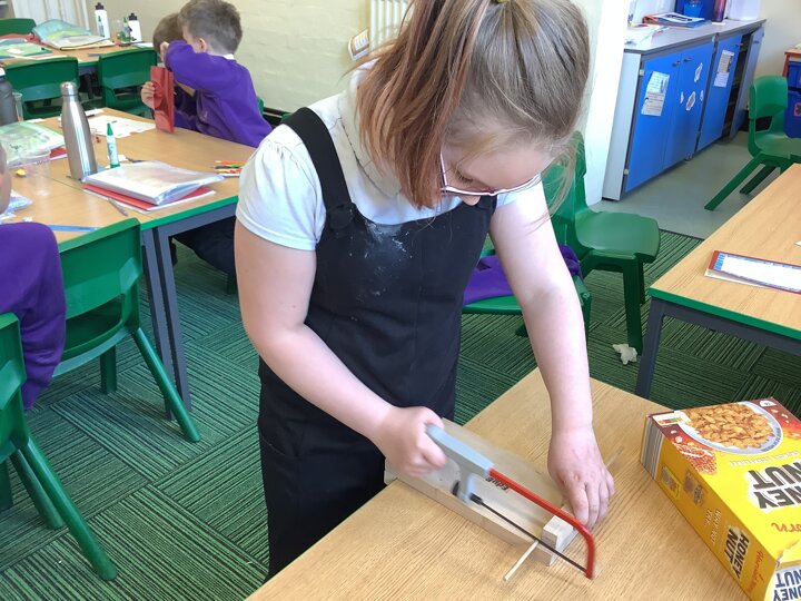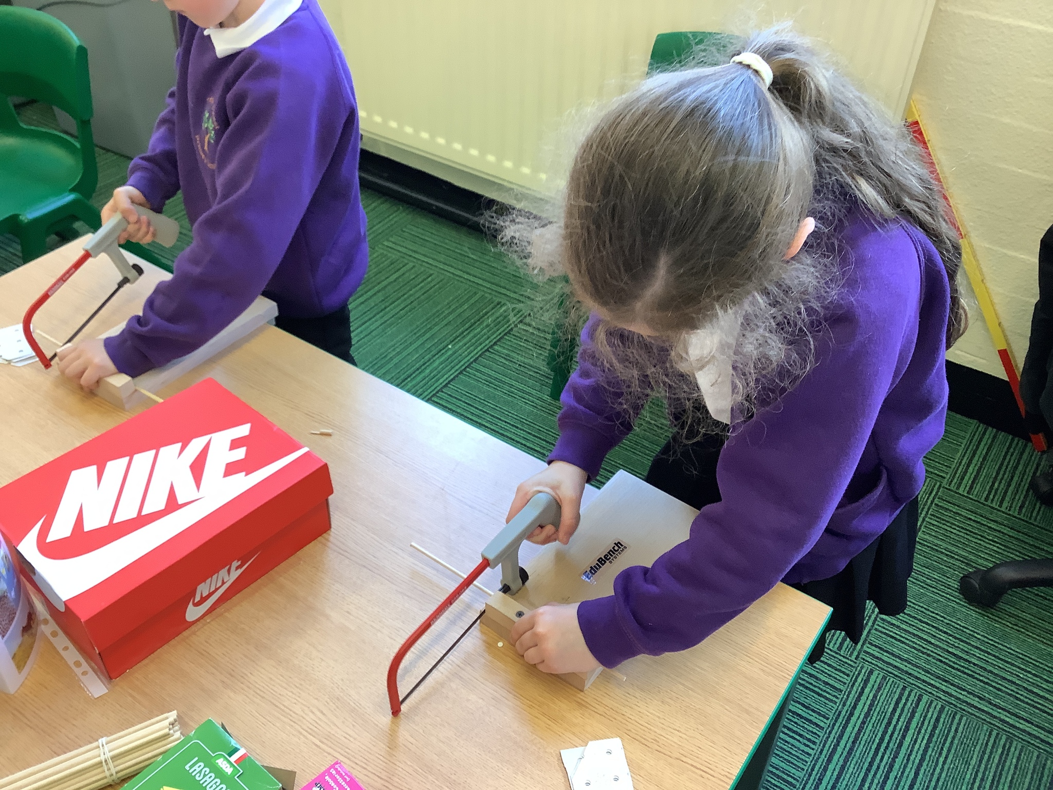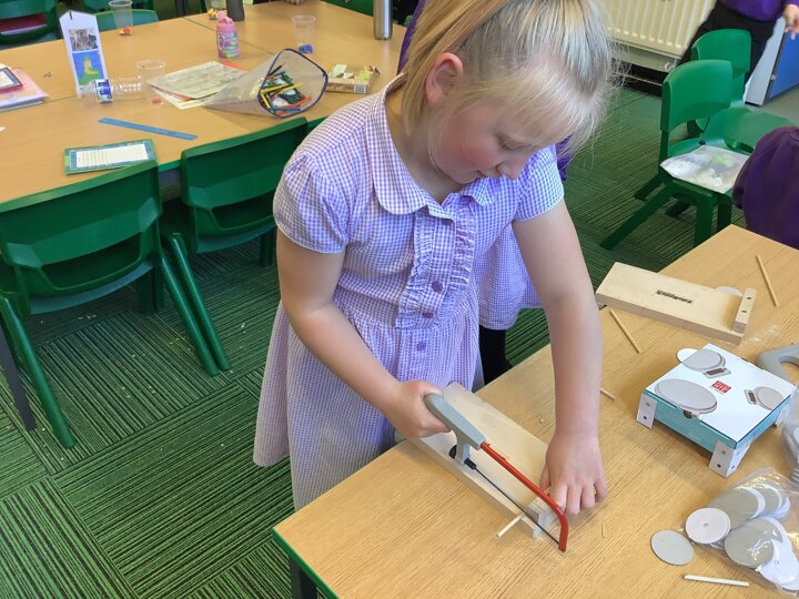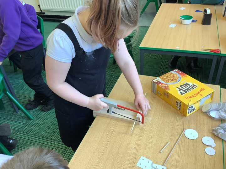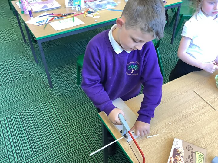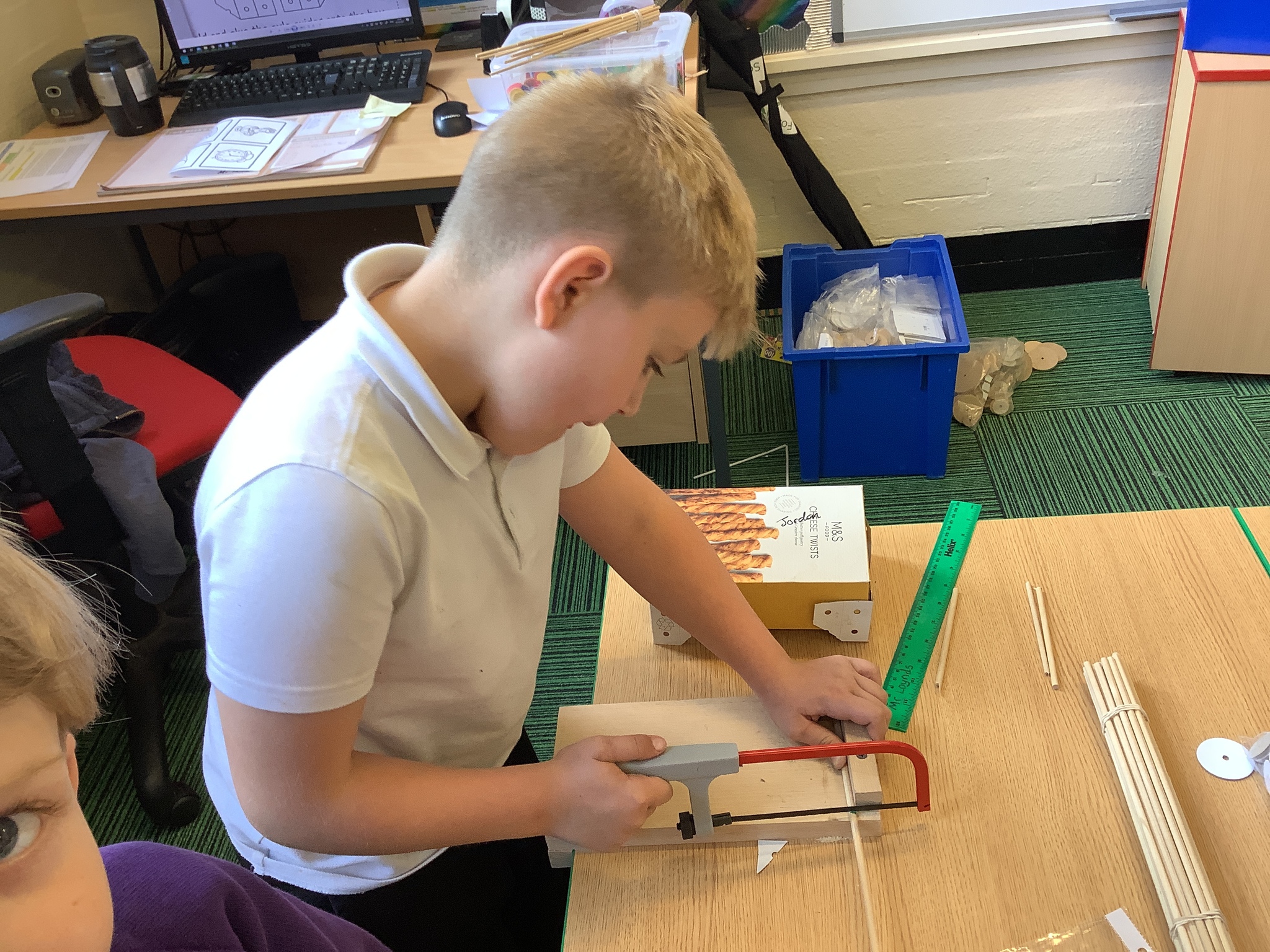 While we were making them, we had to cut out specific shapes to attach our axles, glue them to our vehicle and safely use a junior hacksaw to cut the dowel rod to the correct size for our axles.