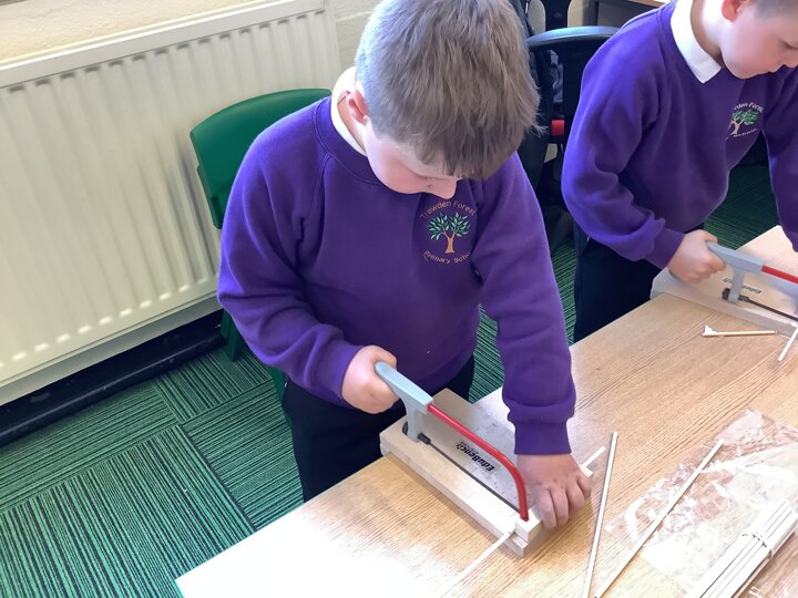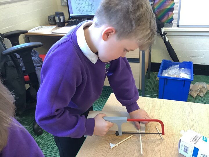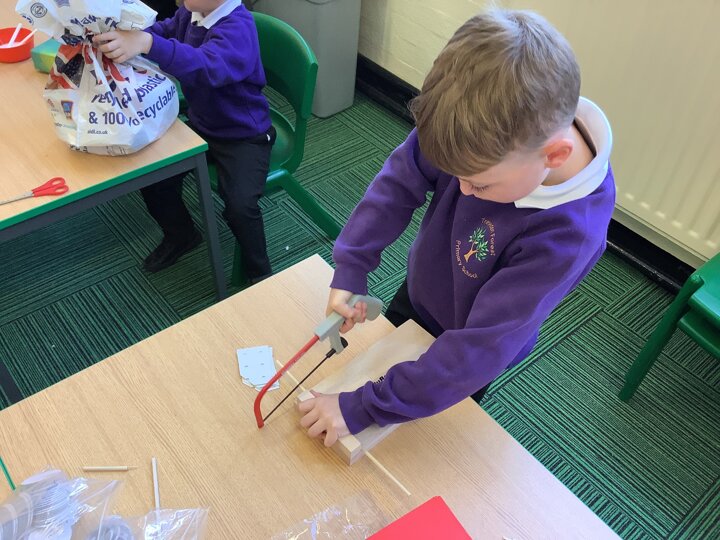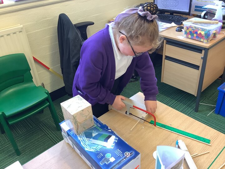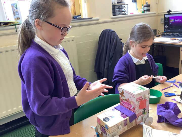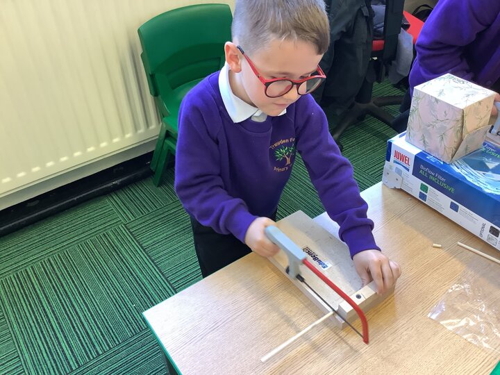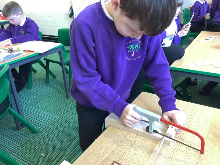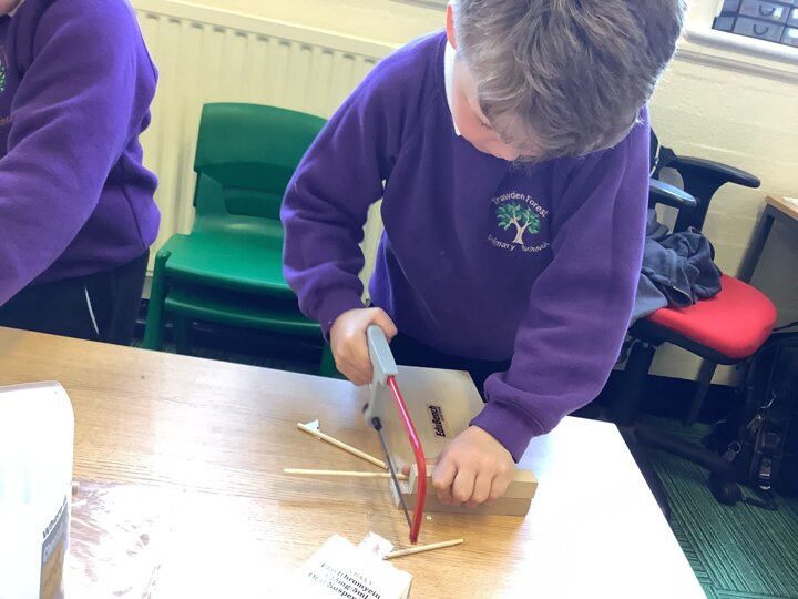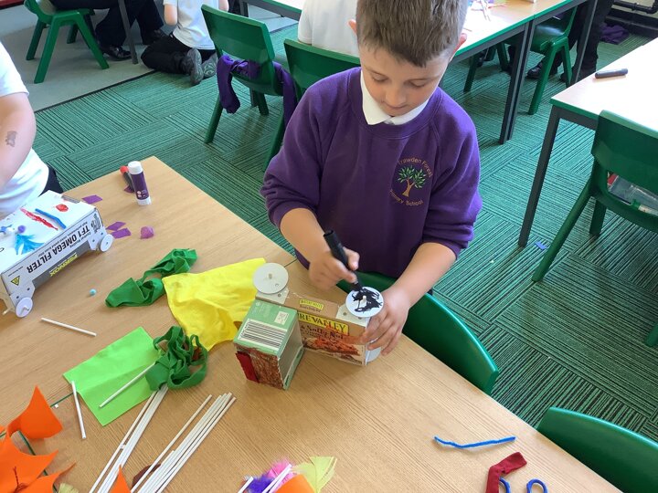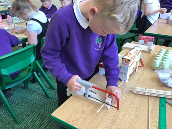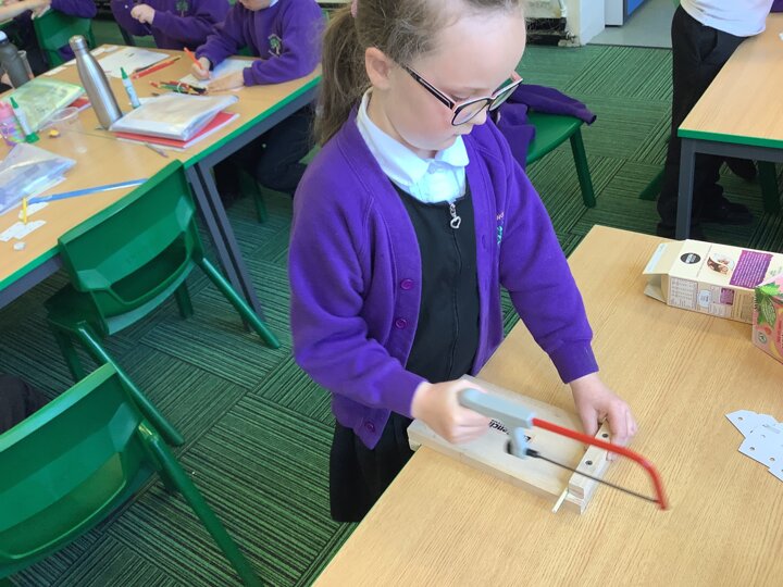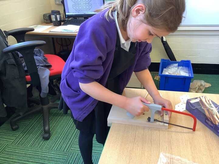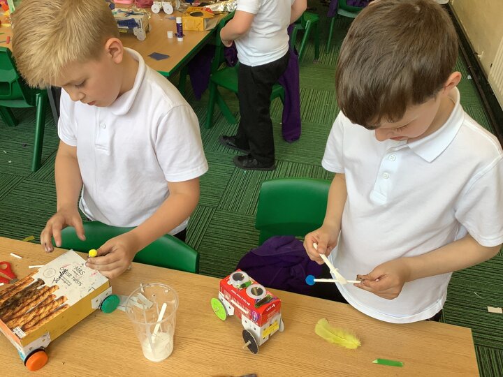 While we were making them, we had to cut out specific shapes to attach our axles, glue them to our vehicle and safely use a junior hacksaw to cut the dowel rod to the correct size for our axles.