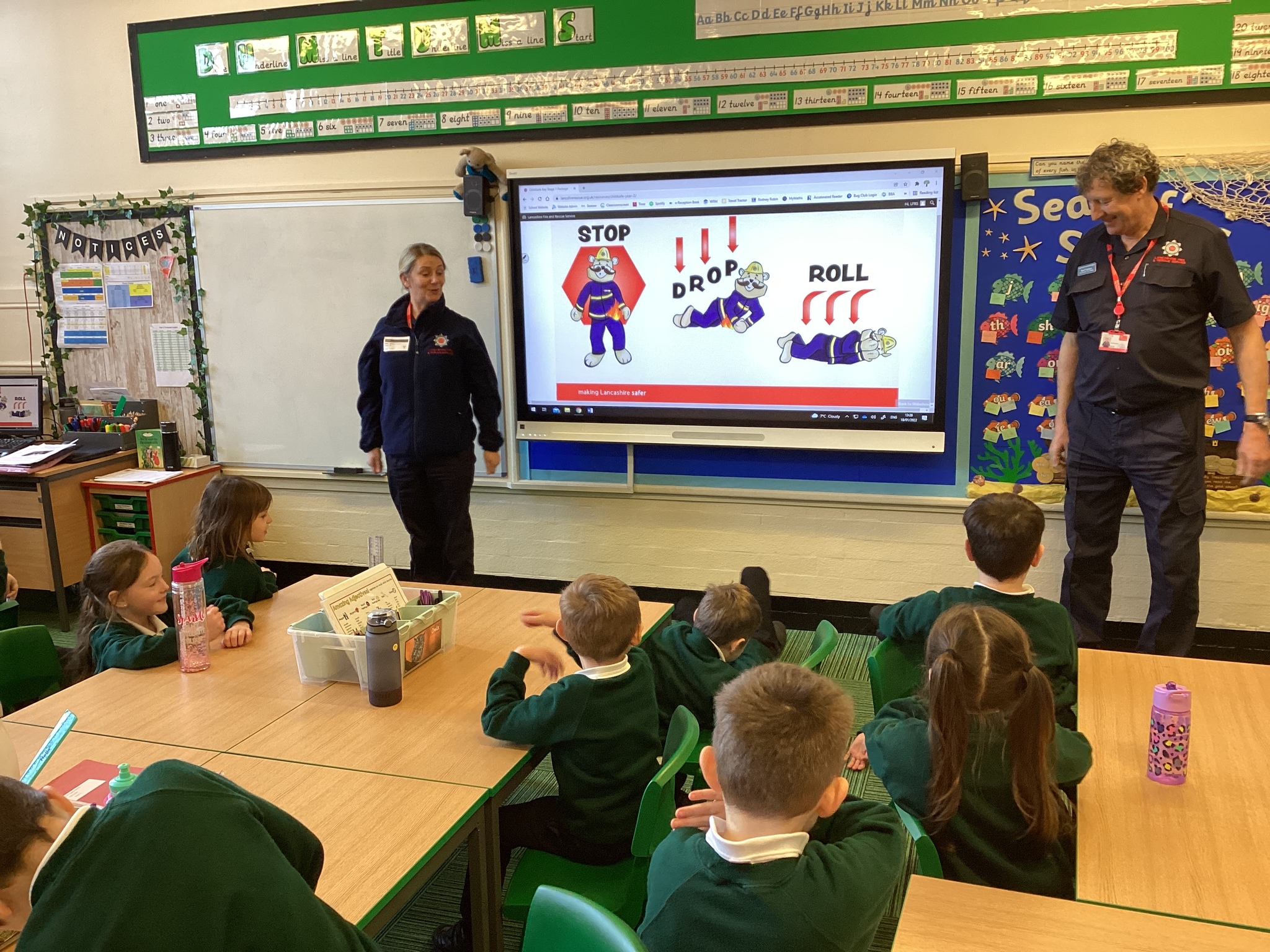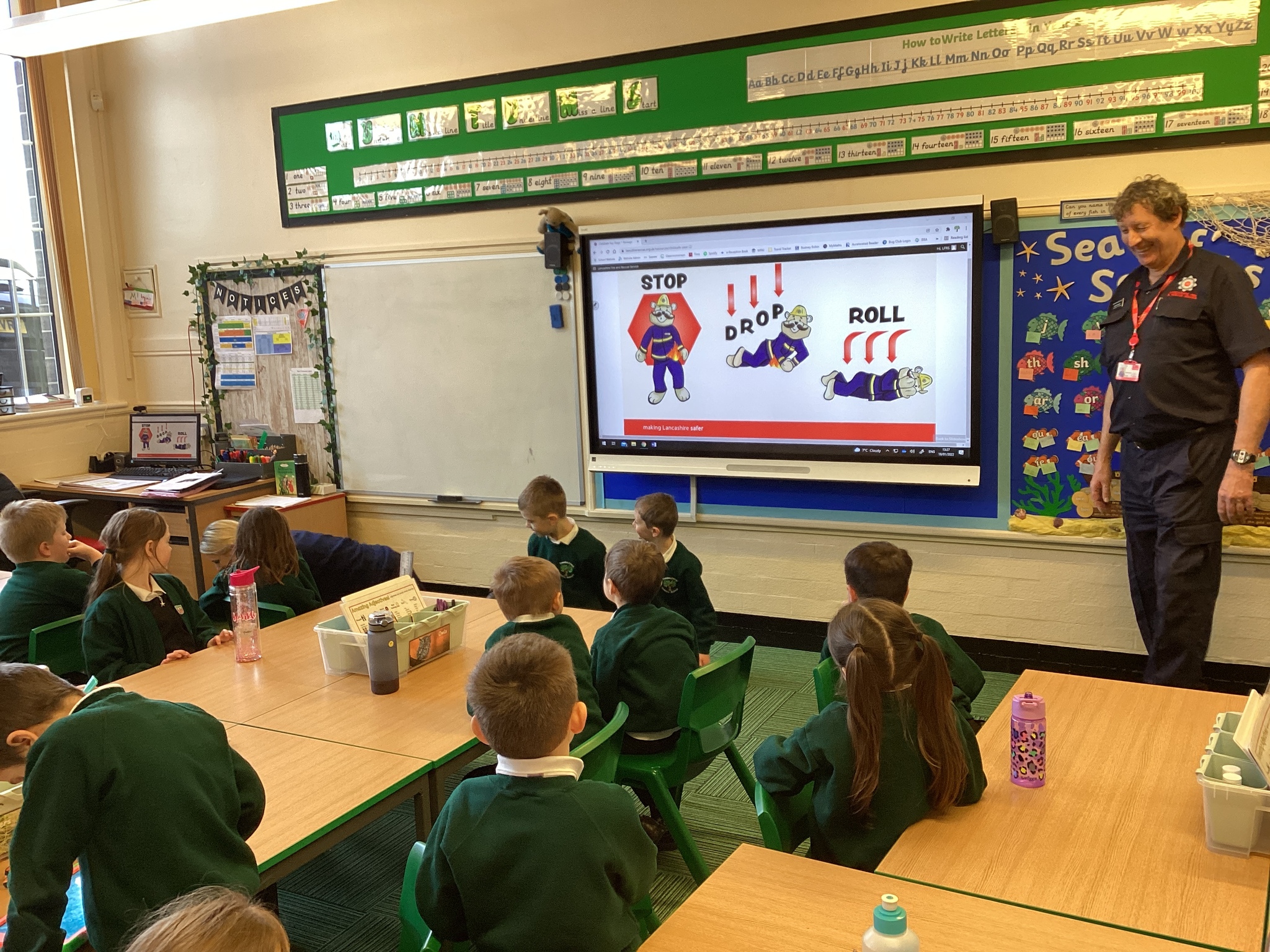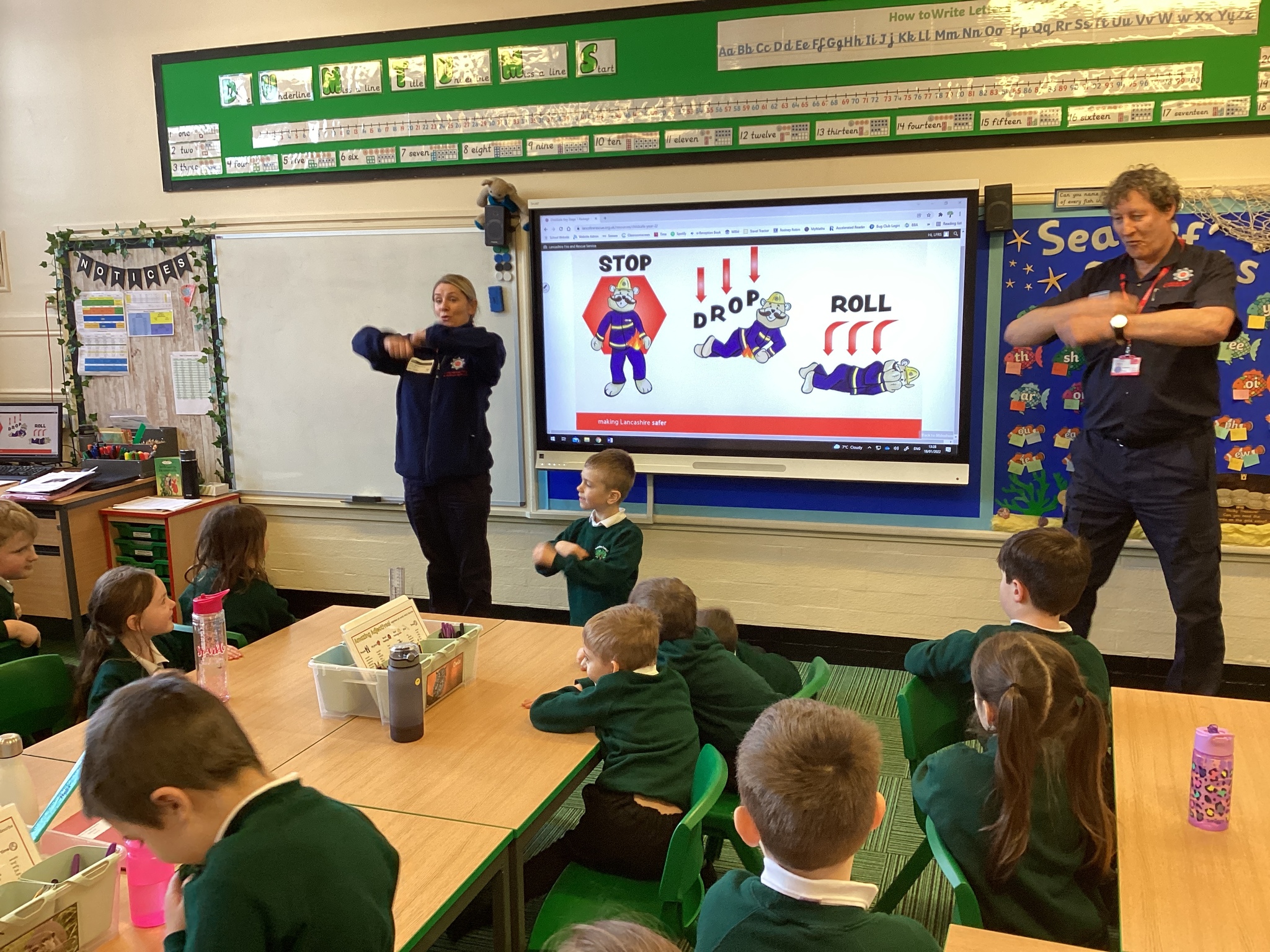 Today, we were lucky enough to have a visit from Lancashire Fire Service and Smokey the Bear. They came to school to teach us all about fire safety and what we should do if we ever have a fire at home. They told us about different techniques to stay safe, such as 'Stop! Drop! Roll!' (this was was fun to practise), crawling around to avoid breathing in smoke and how to check if there is fire on the opposite side of a door.