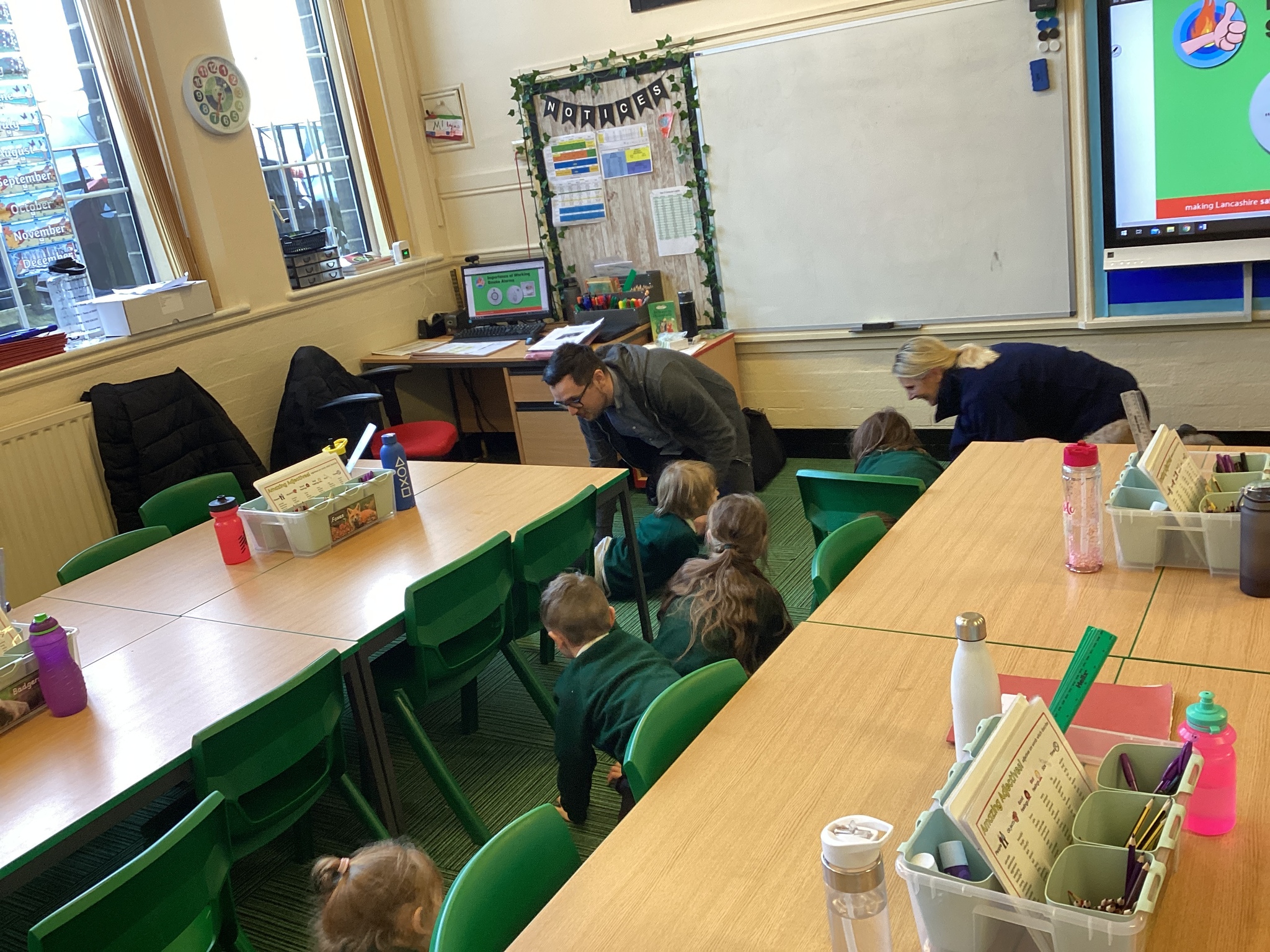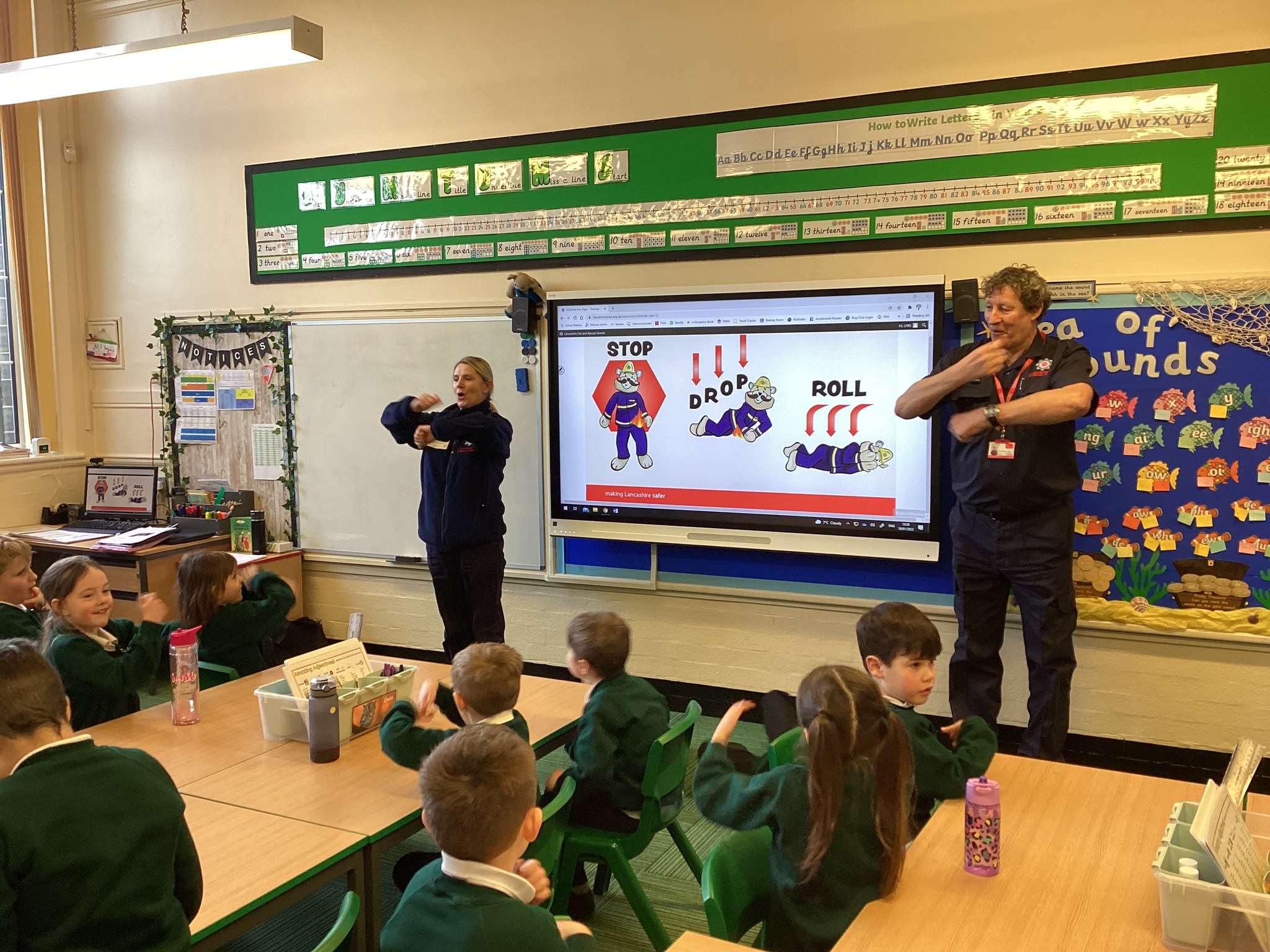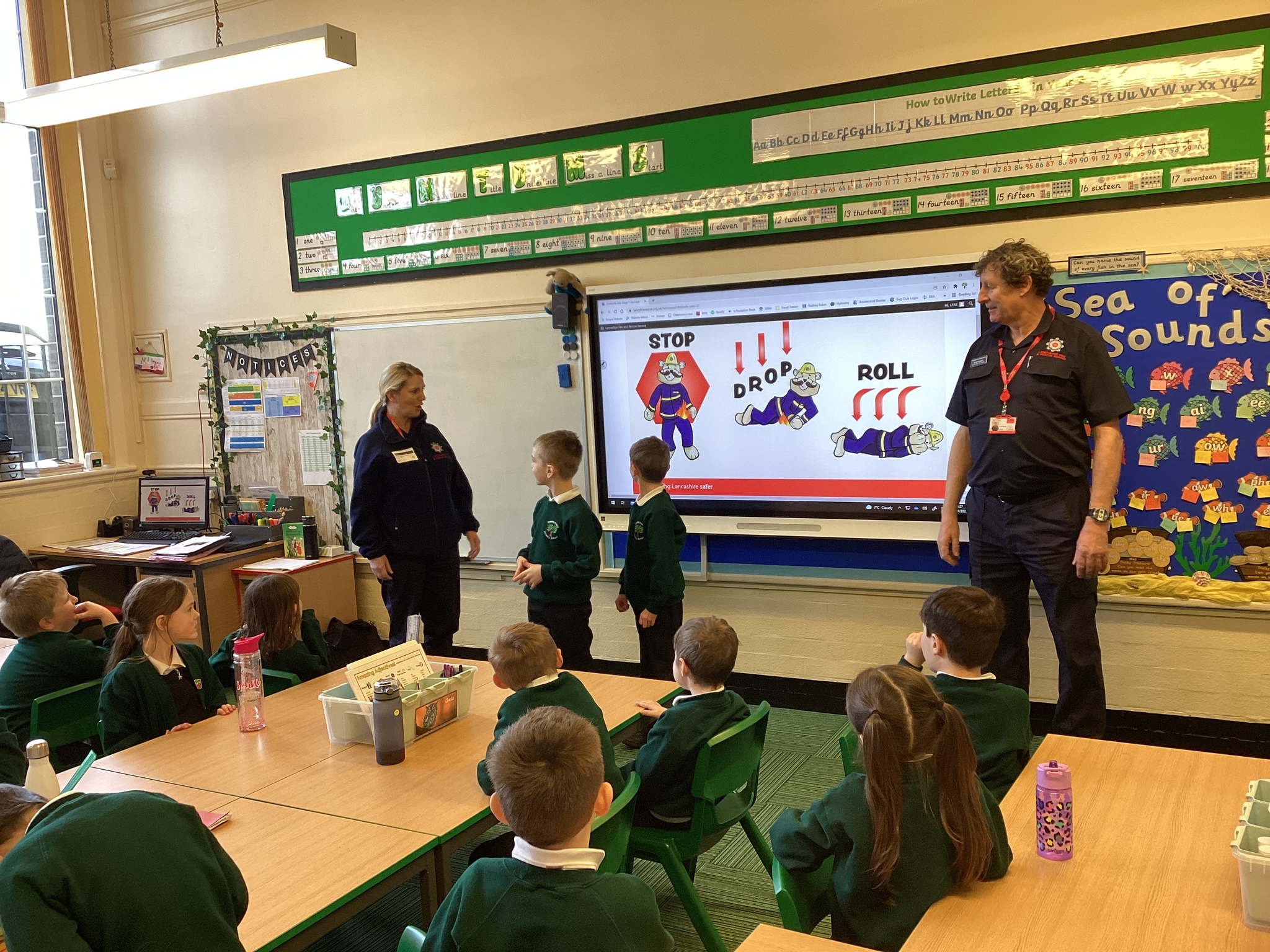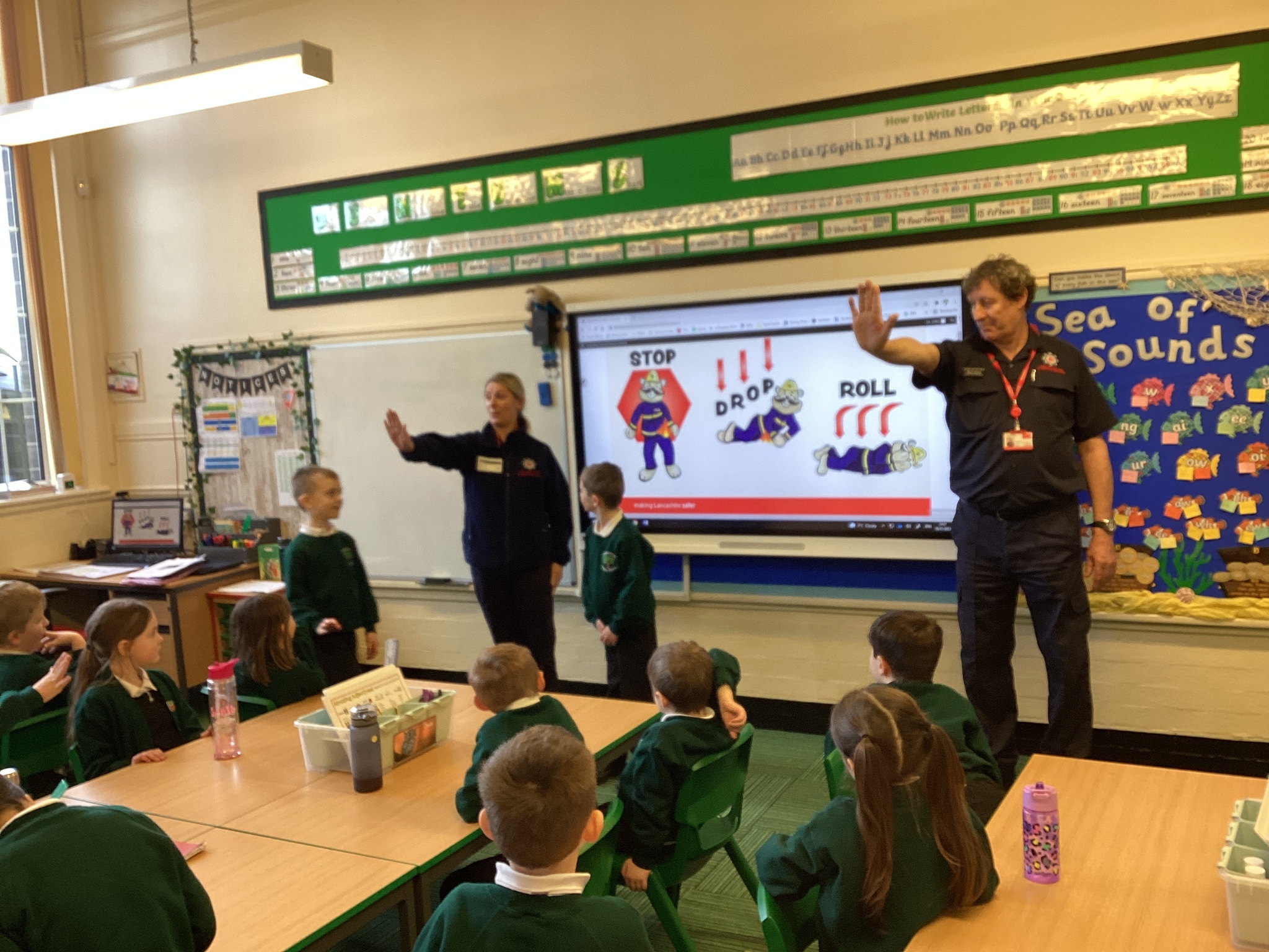 Today, we were lucky enough to have a visit from Lancashire Fire Service and Smokey the Bear. They came to school to teach us all about fire safety and what we should do if we ever have a fire at home. They told us about different techniques to stay safe, such as 'Stop! Drop! Roll!' (this was was fun to practise), crawling around to avoid breathing in smoke and how to check if there is fire on the opposite side of a door.