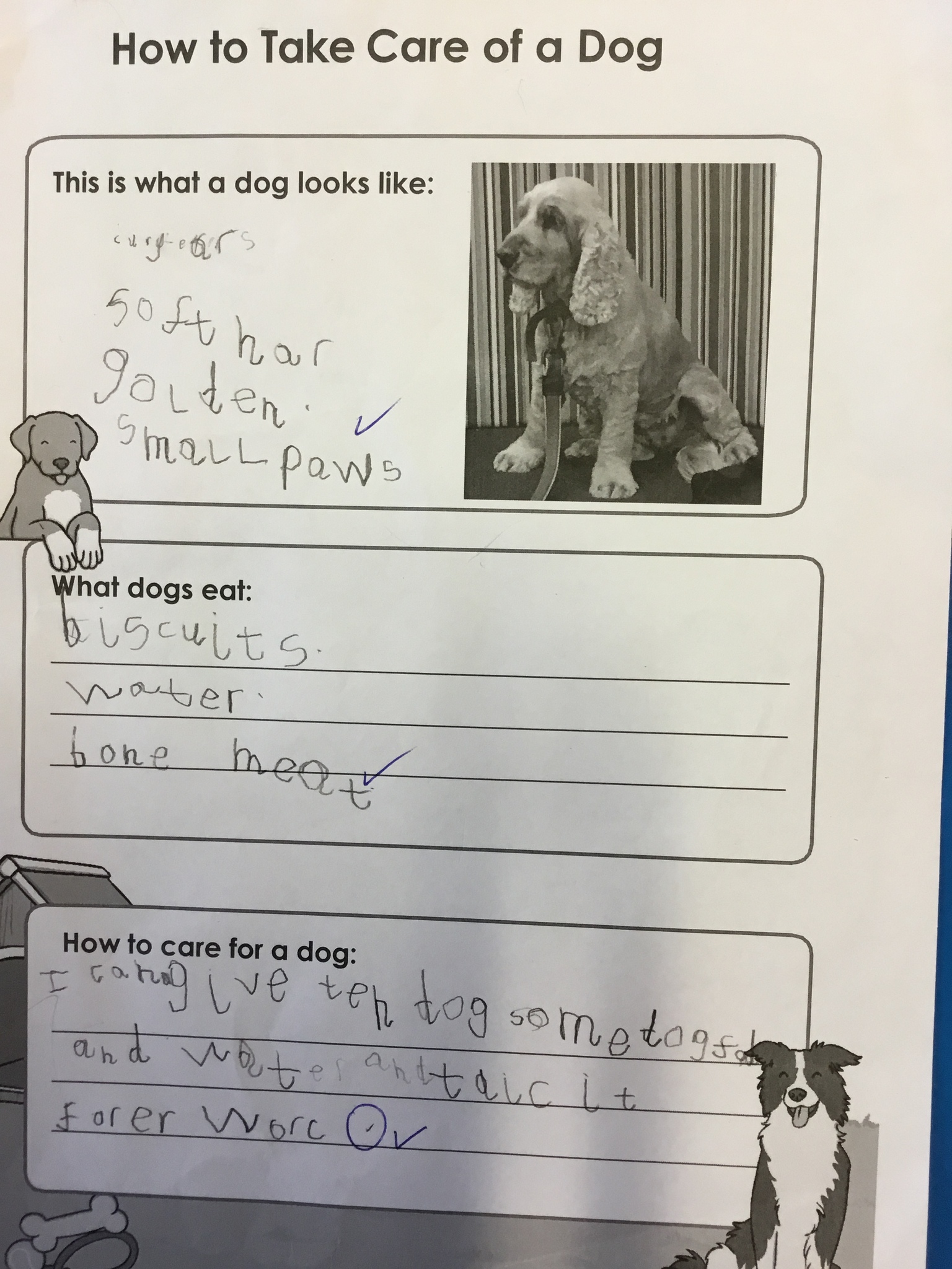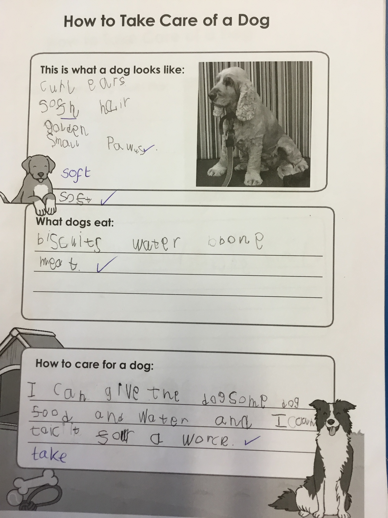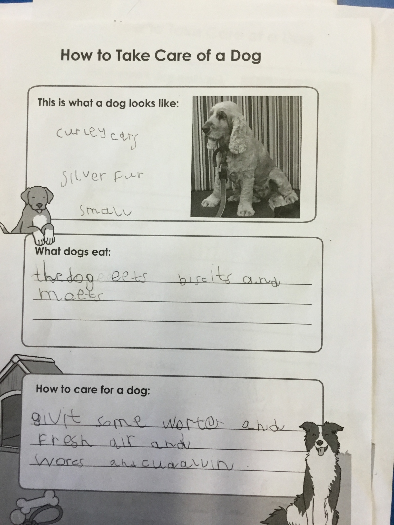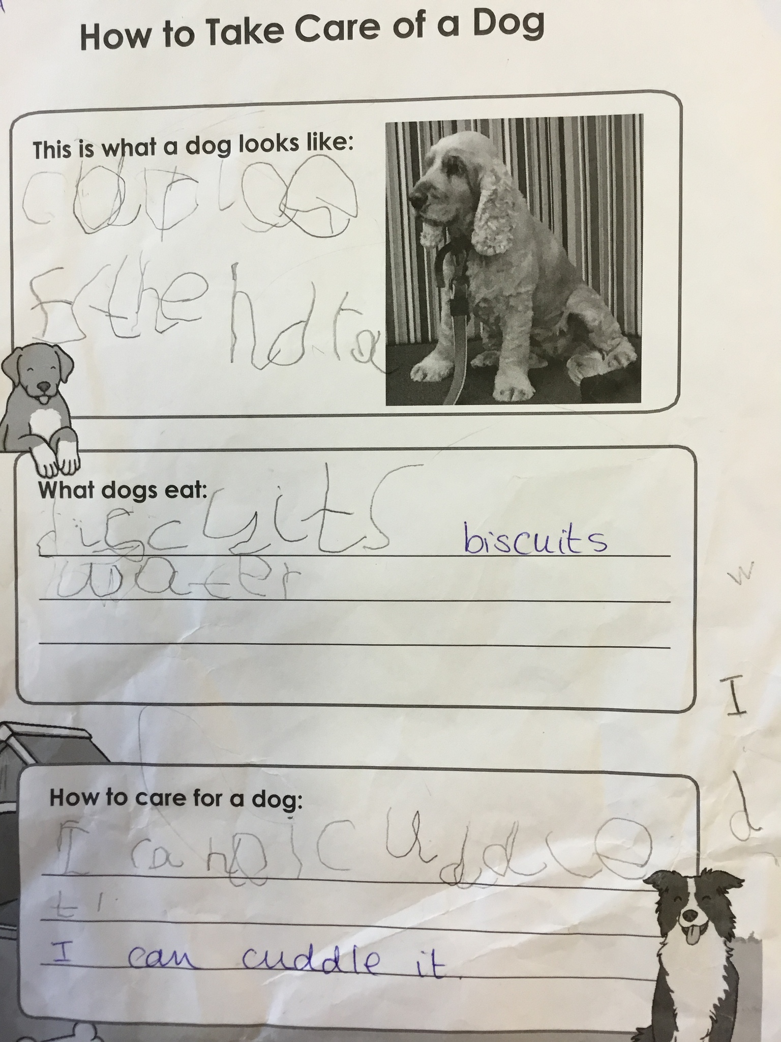 Our animal topic this week has been about pets so we asked Sophia and her owner if we could spend time finding out about her. The children all got a chance to stroke and look at Sophia and her owner told us lots of information about what she needs. We then wrote our own help sheet on how to care for a dog.
