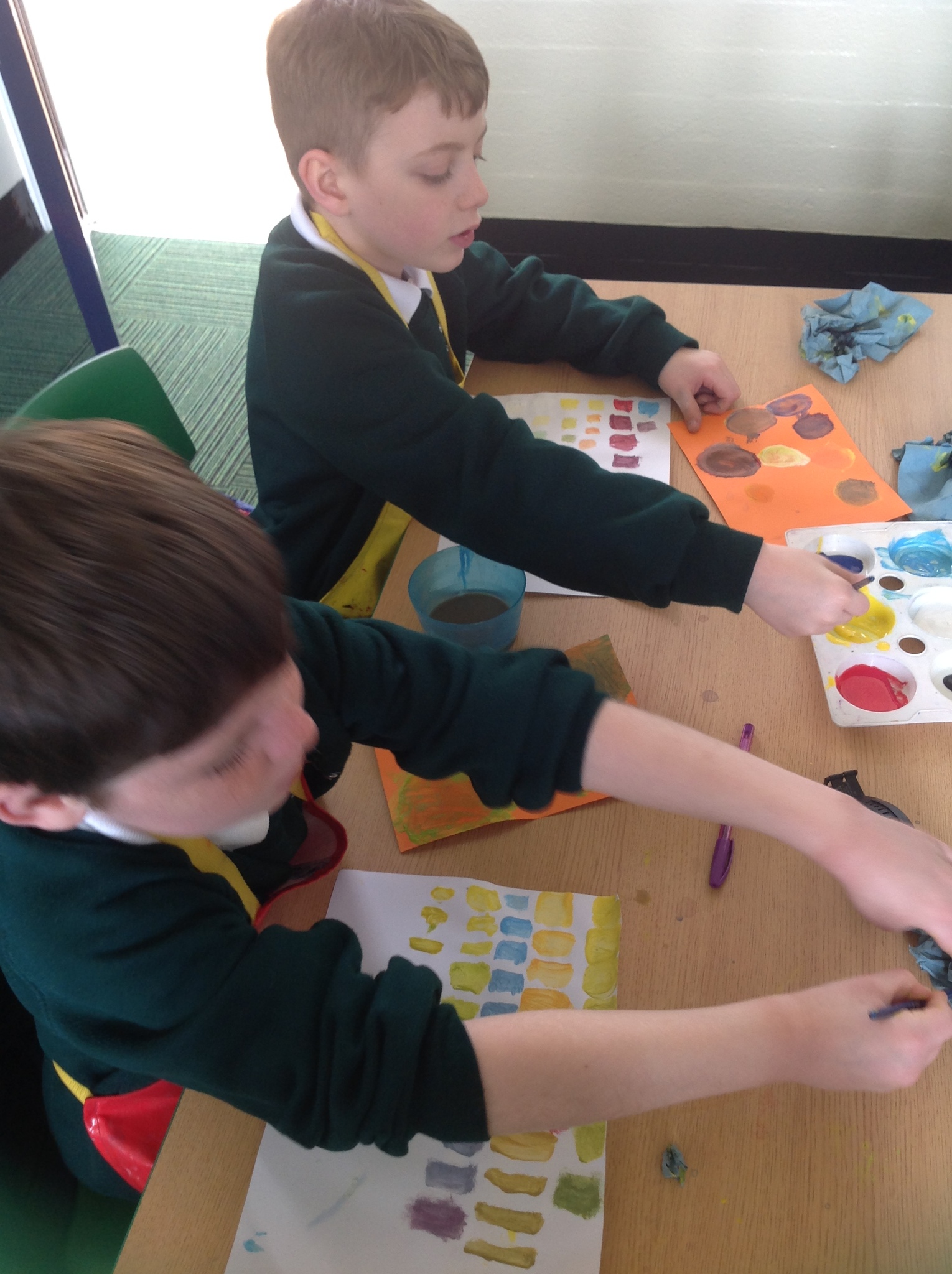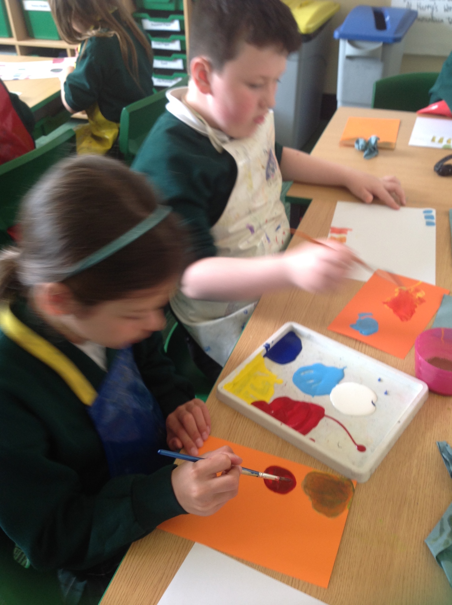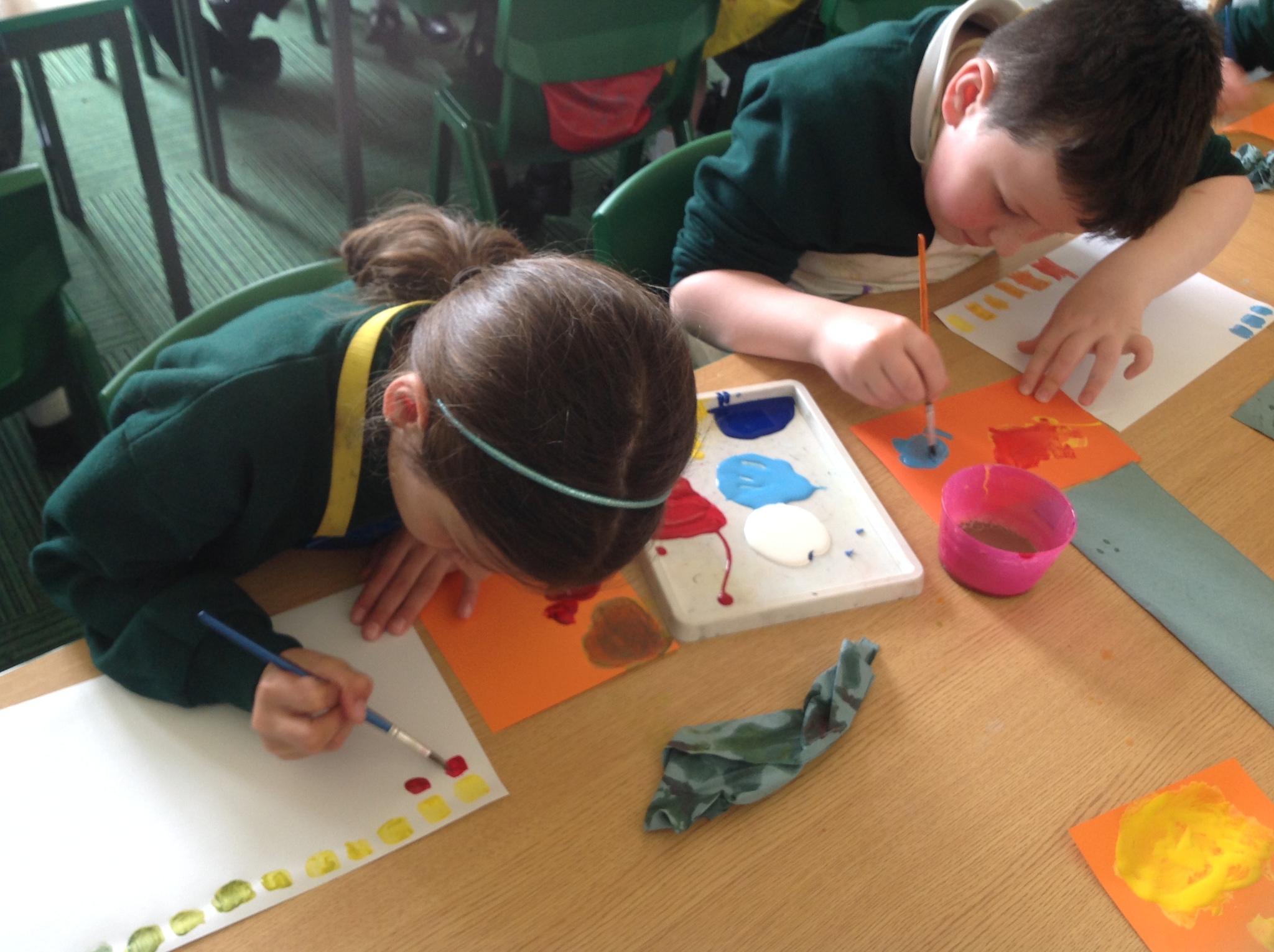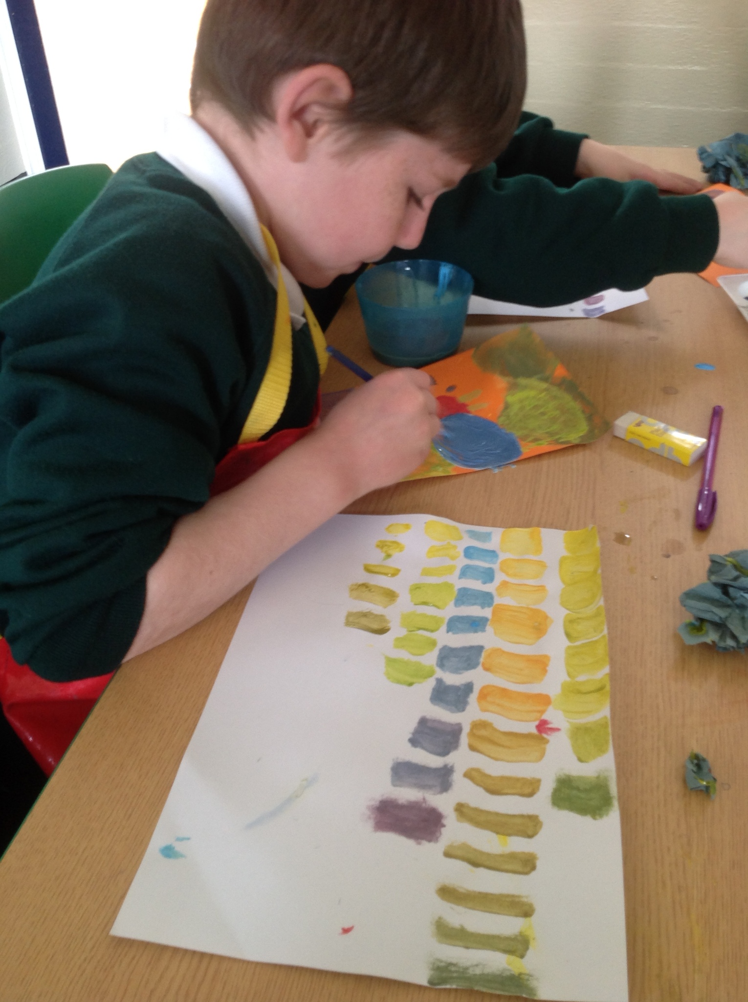 During this afternoon, Year 4 continued their art work from Friday. They used the primary colours to create secondary colours whilst adding a small amount of the darker colour at a time to create more subtle changes in colour. They also experimented with creating other shades and tints of colour. It was interesting to see that the amount of colour could have significant impact on the shade or not much impact at all.