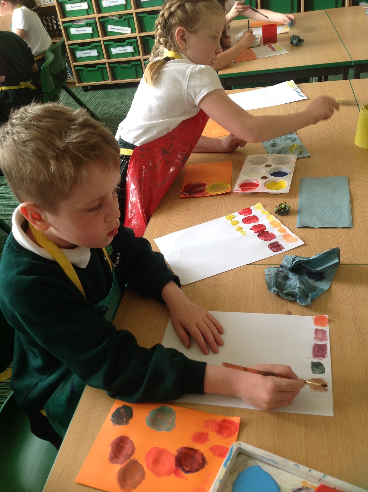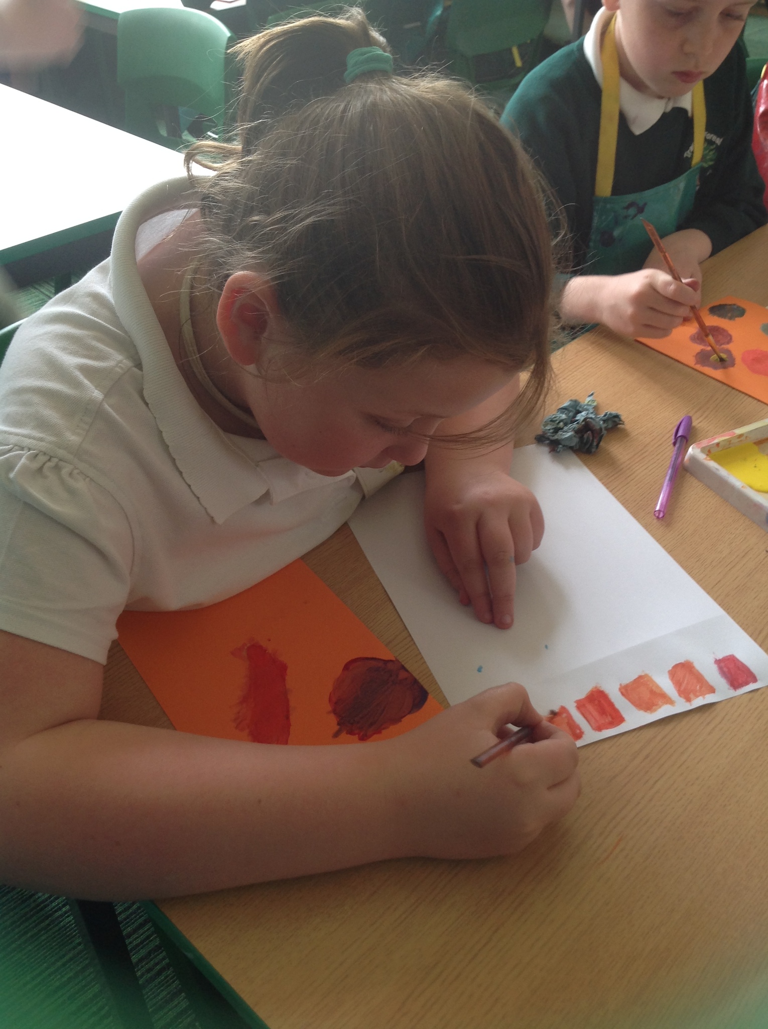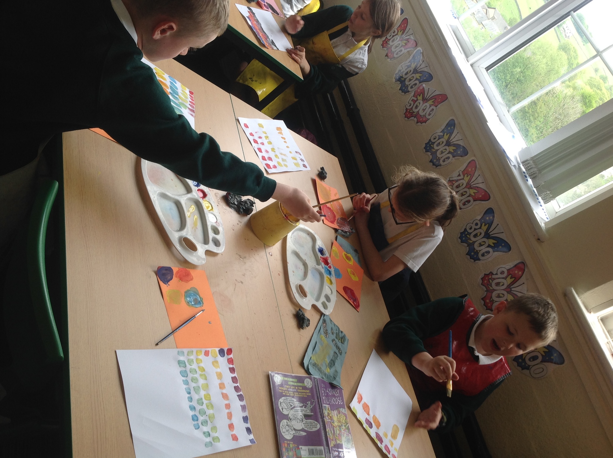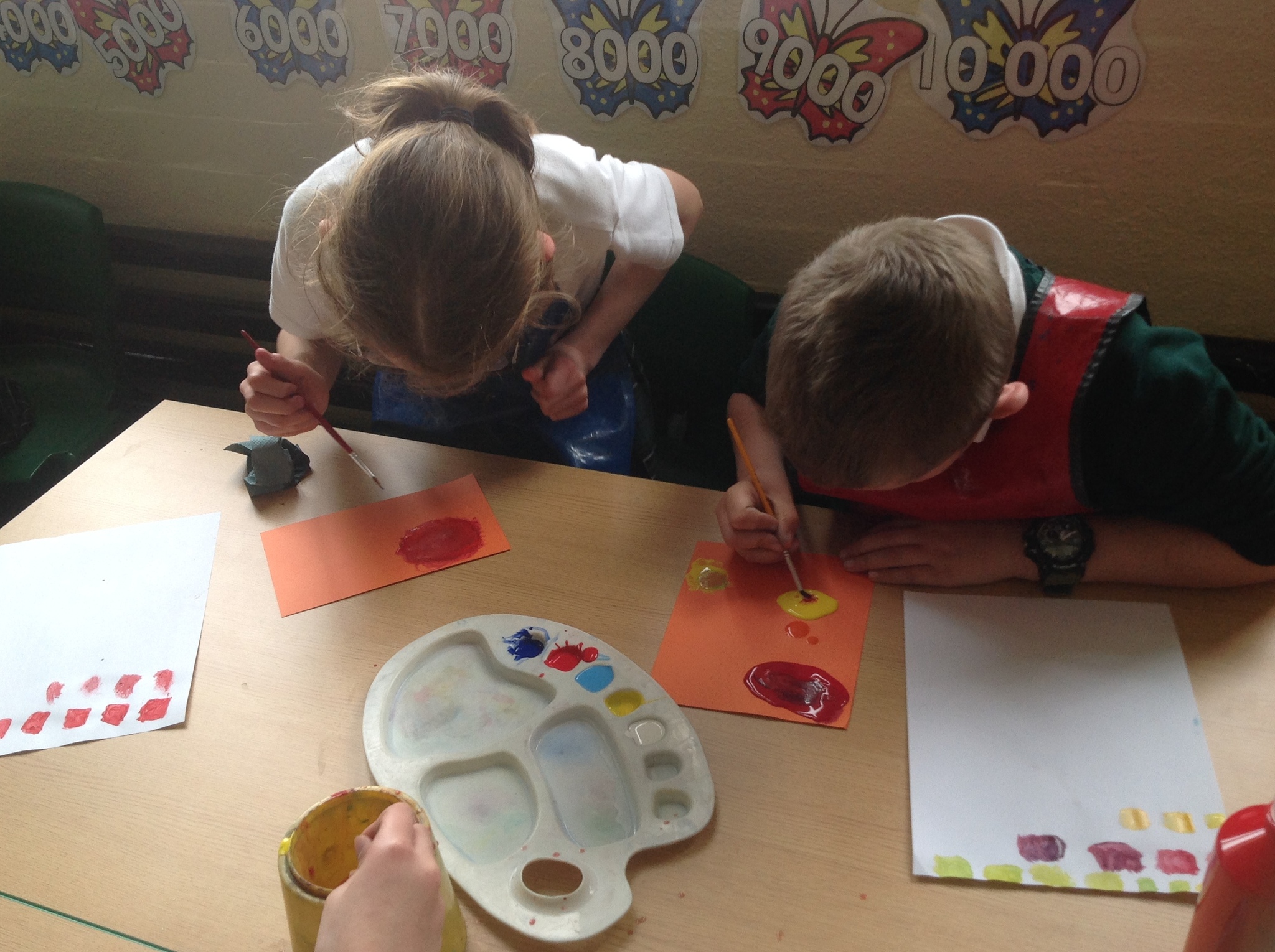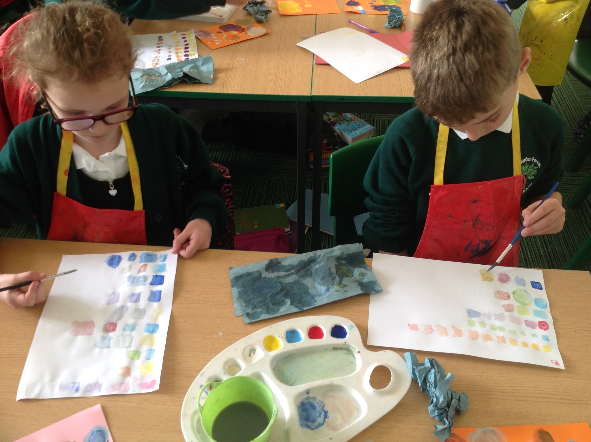 During this afternoon, Year 4 continued their art work from Friday. They used the primary colours to create secondary colours whilst adding a small amount of the darker colour at a time to create more subtle changes in colour. They also experimented with creating other shades and tints of colour. It was interesting to see that the amount of colour could have significant impact on the shade or not much impact at all.