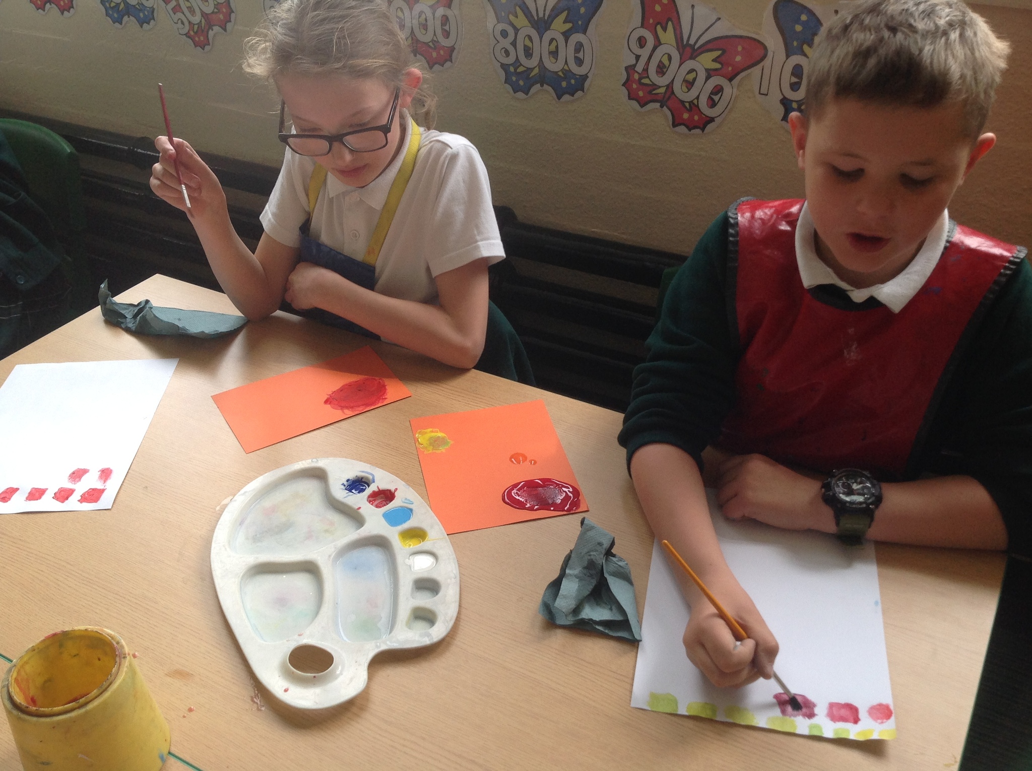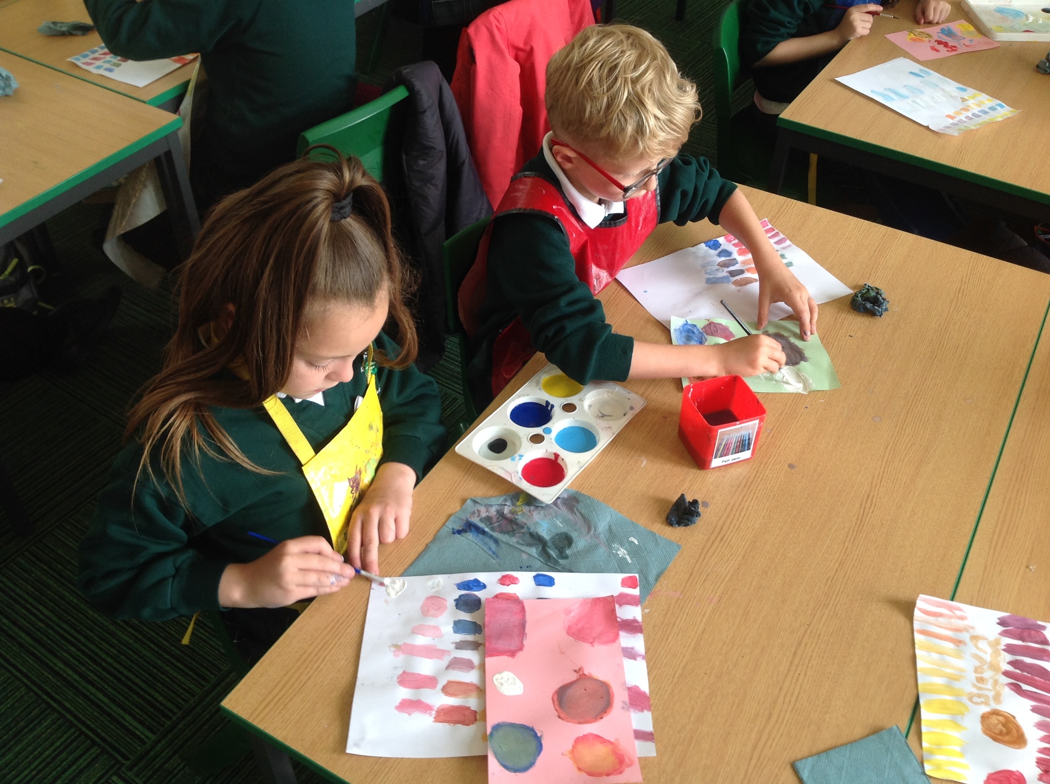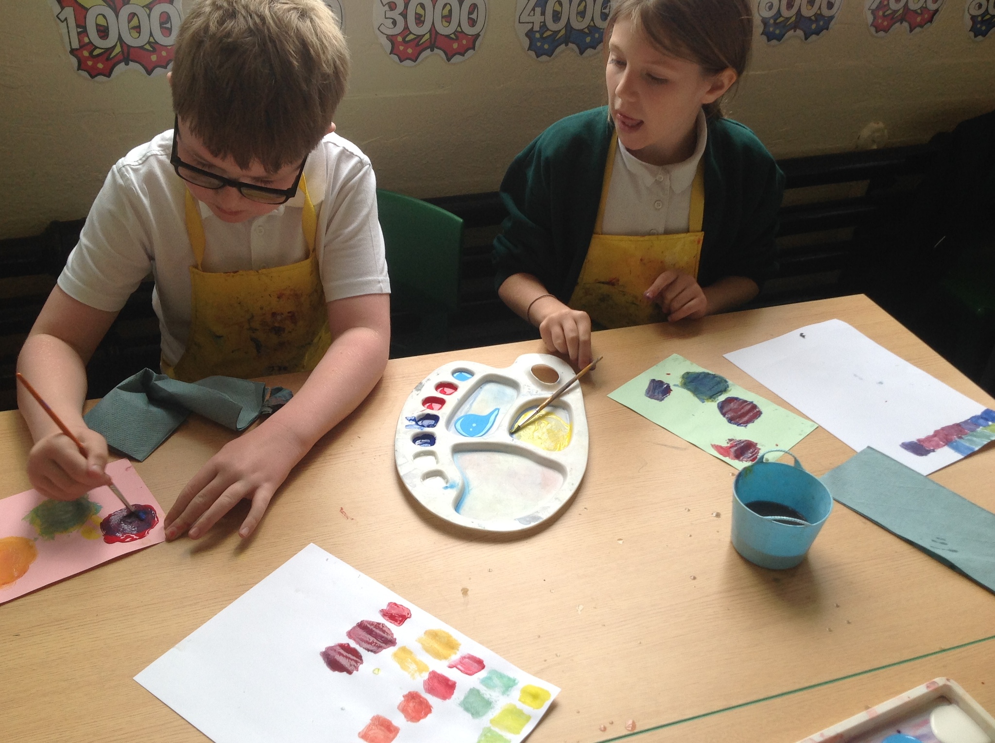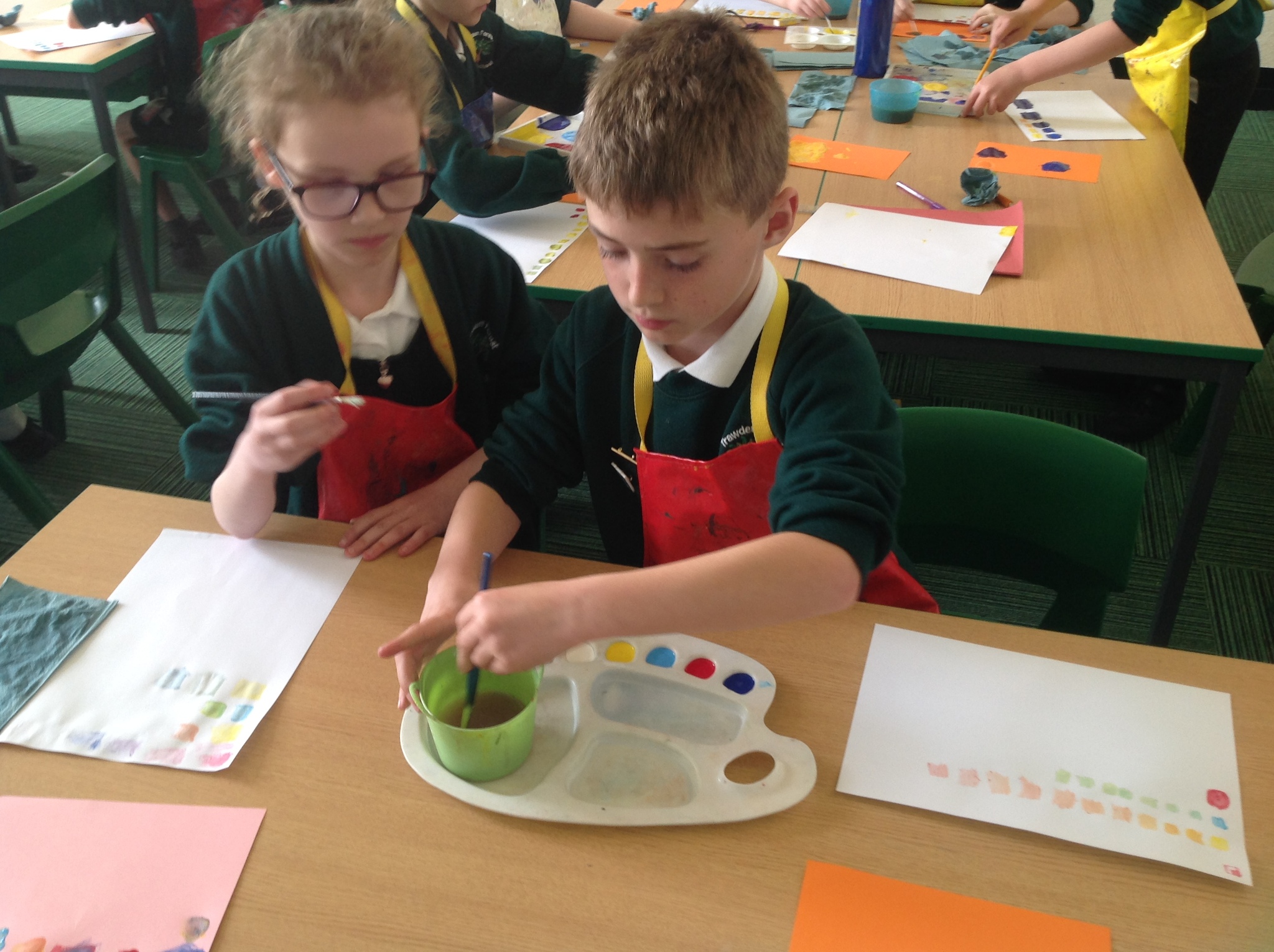 During this afternoon, Year 4 continued their art work from Friday. They used the primary colours to create secondary colours whilst adding a small amount of the darker colour at a time to create more subtle changes in colour. They also experimented with creating other shades and tints of colour. It was interesting to see that the amount of colour could have significant impact on the shade or not much impact at all.