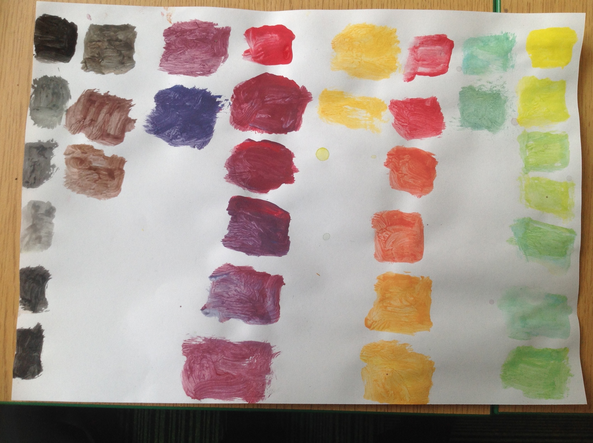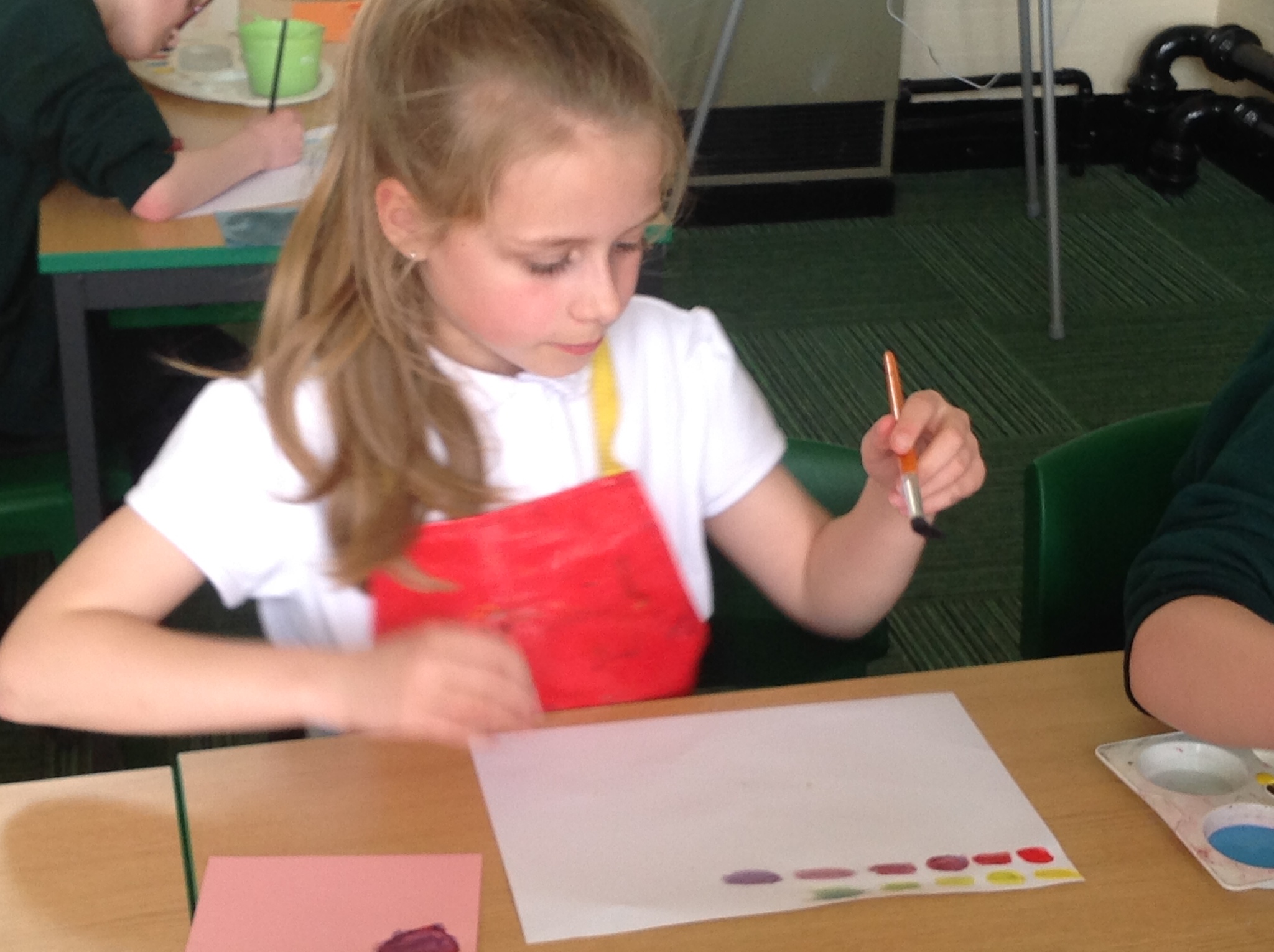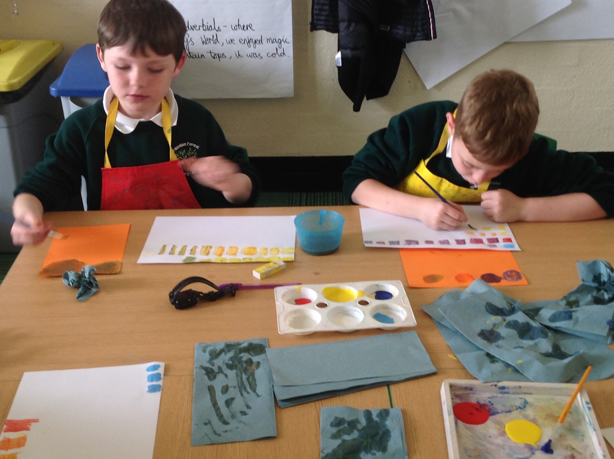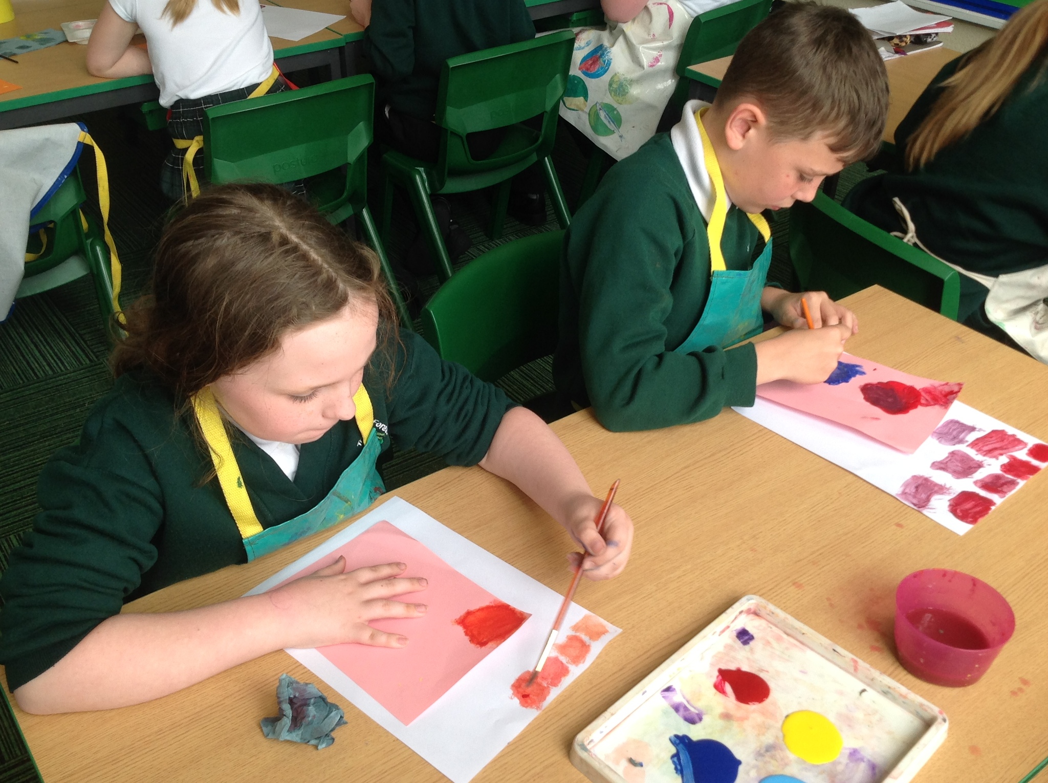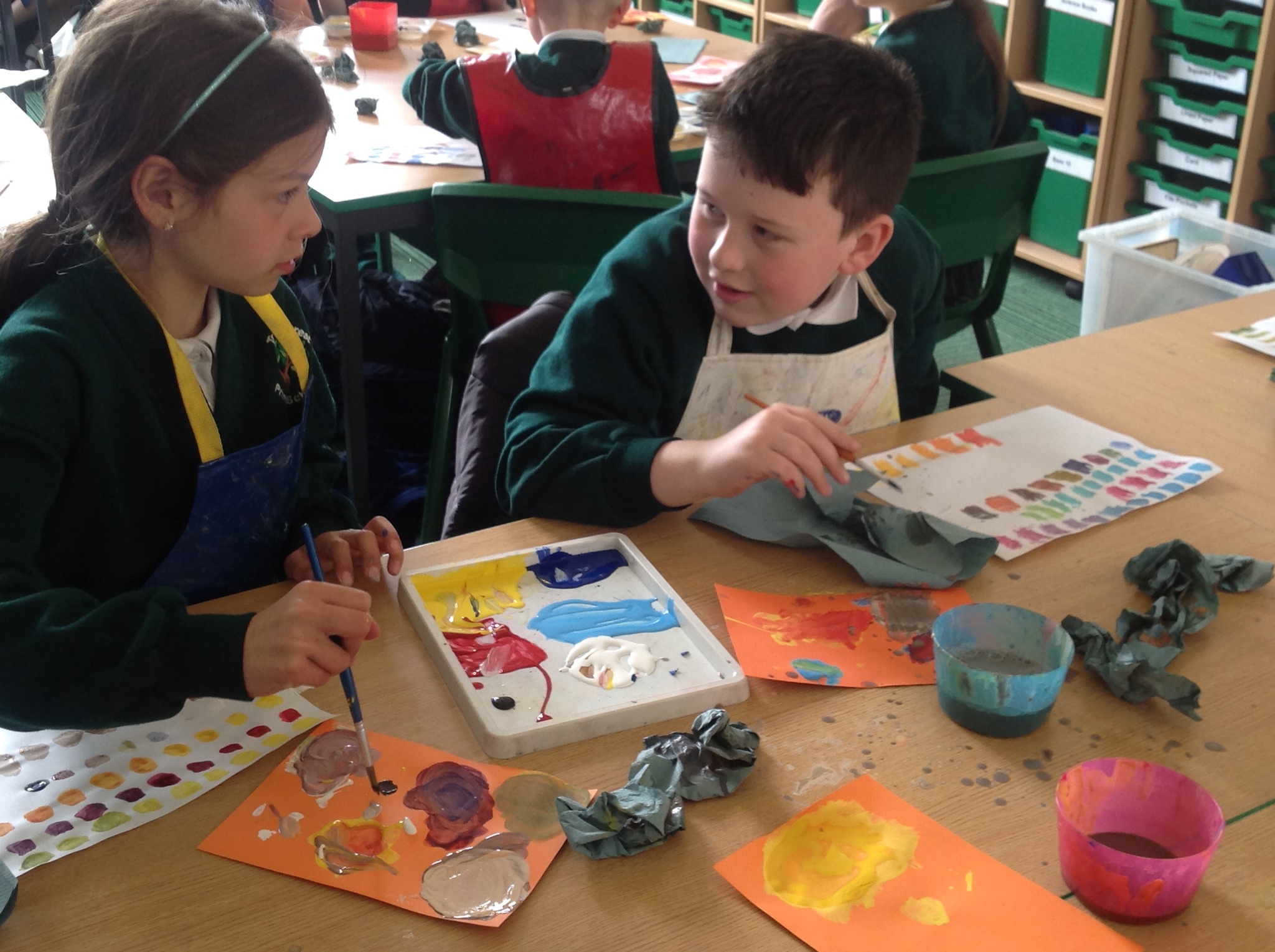 During this afternoon, Year 4 continued their art work from Friday. They used the primary colours to create secondary colours whilst adding a small amount of the darker colour at a time to create more subtle changes in colour. They also experimented with creating other shades and tints of colour. It was interesting to see that the amount of colour could have significant impact on the shade or not much impact at all.
