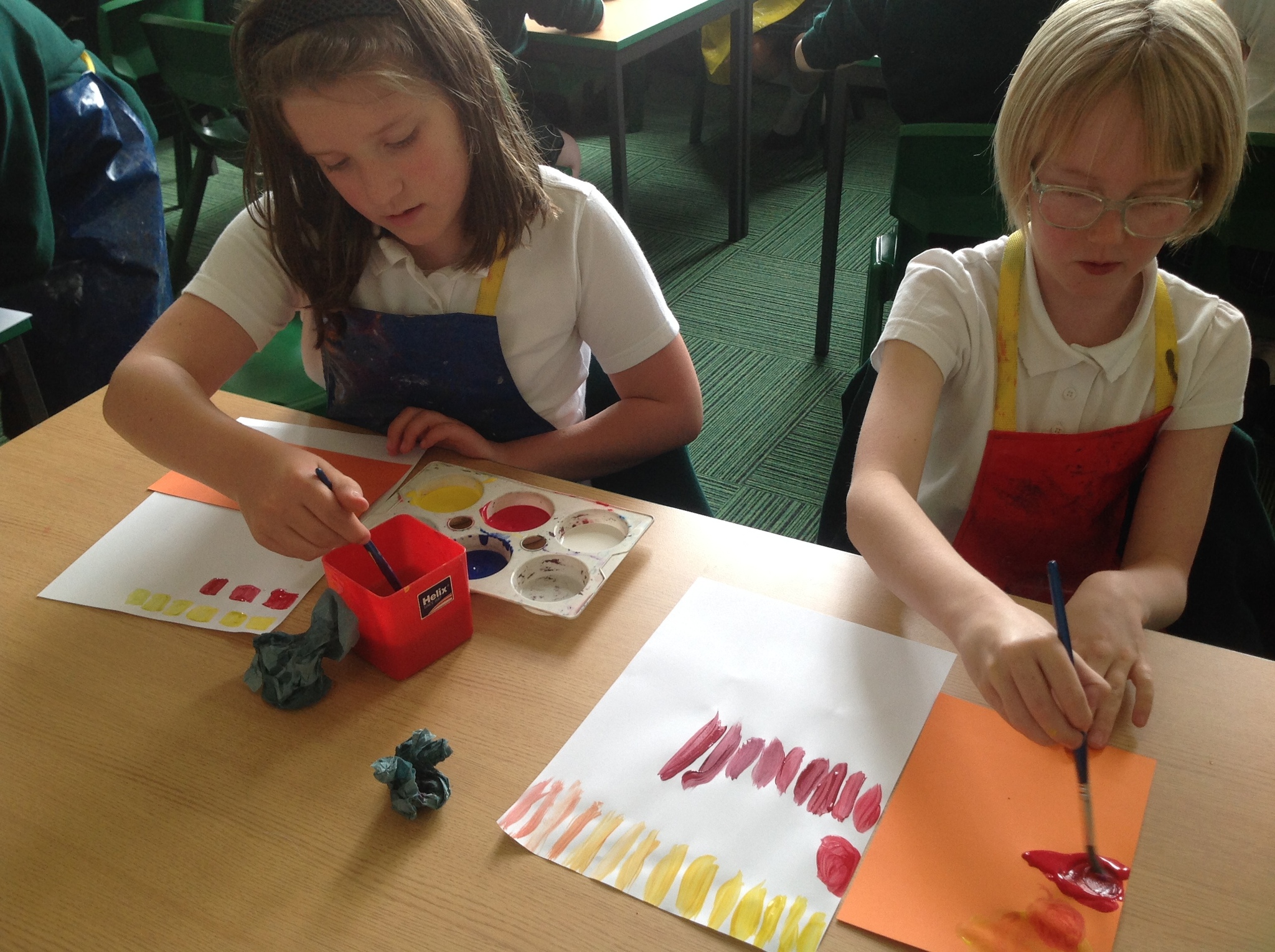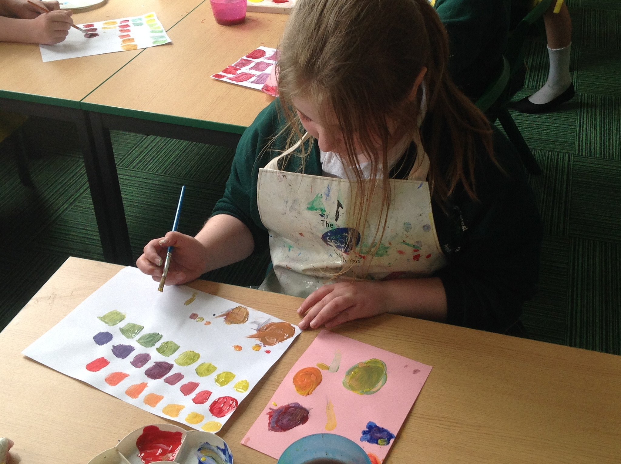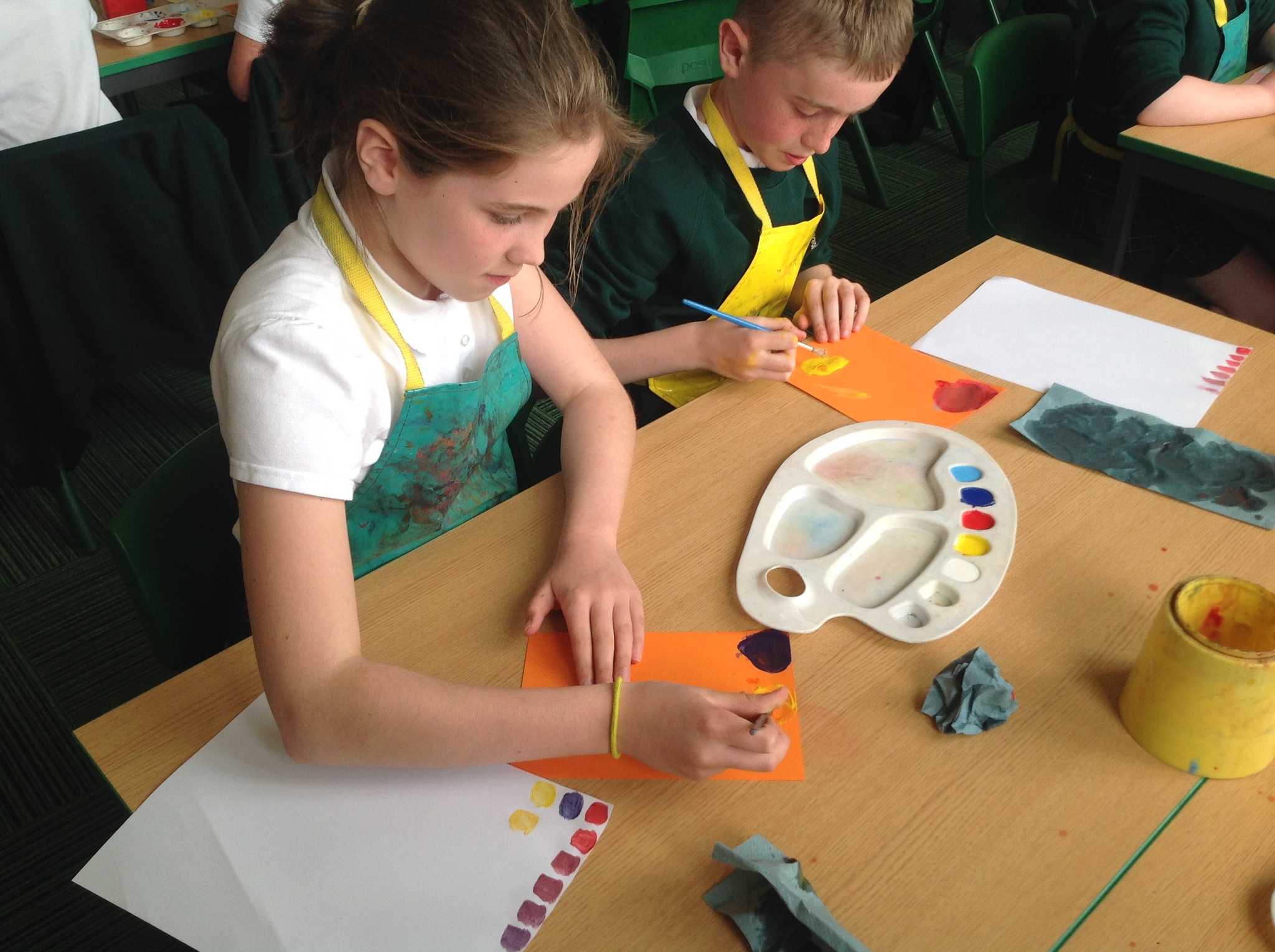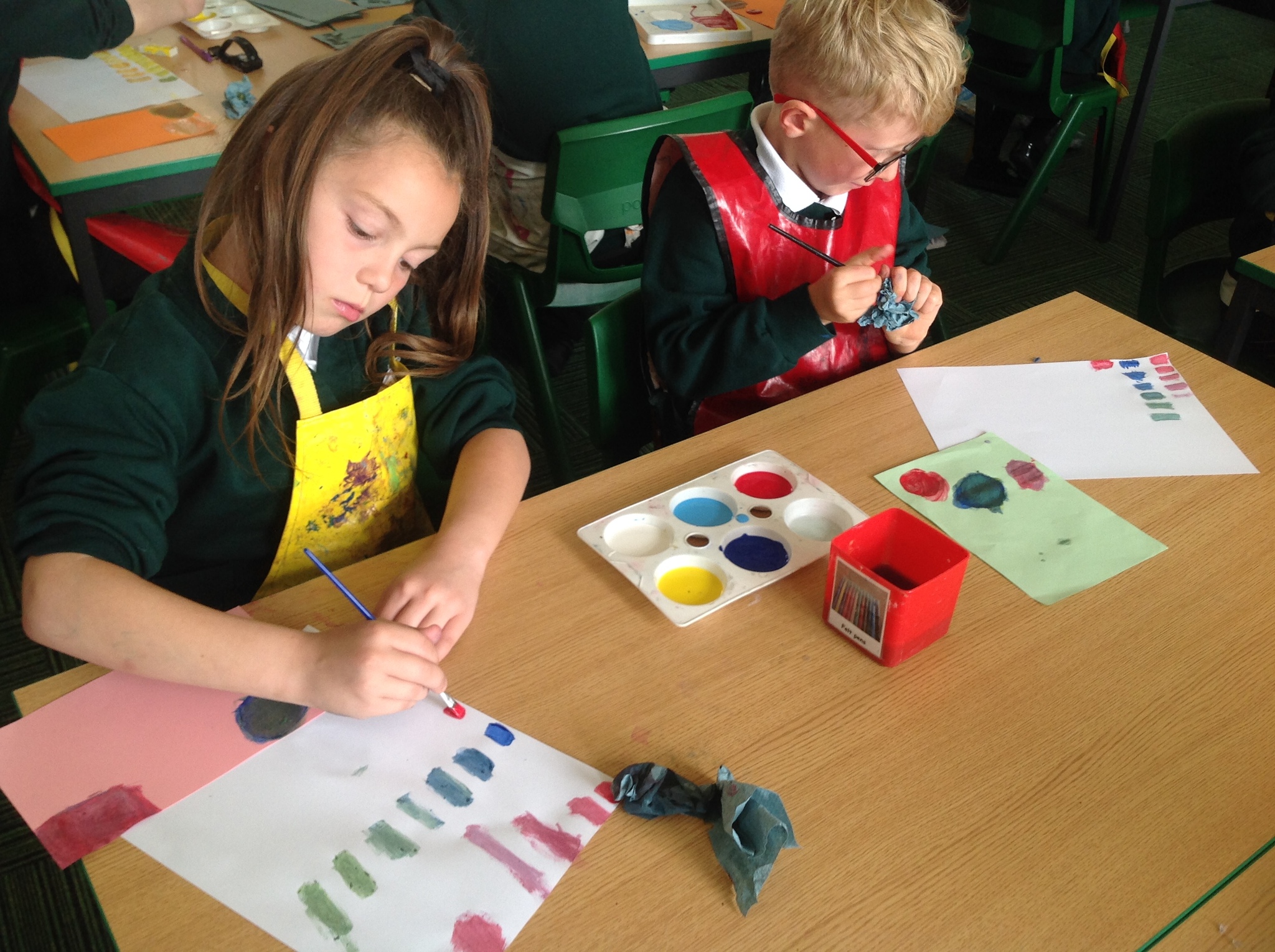 During this afternoon, Year 4 continued their art work from Friday. They used the primary colours to create secondary colours whilst adding a small amount of the darker colour at a time to create more subtle changes in colour. They also experimented with creating other shades and tints of colour. It was interesting to see that the amount of colour could have significant impact on the shade or not much impact at all.