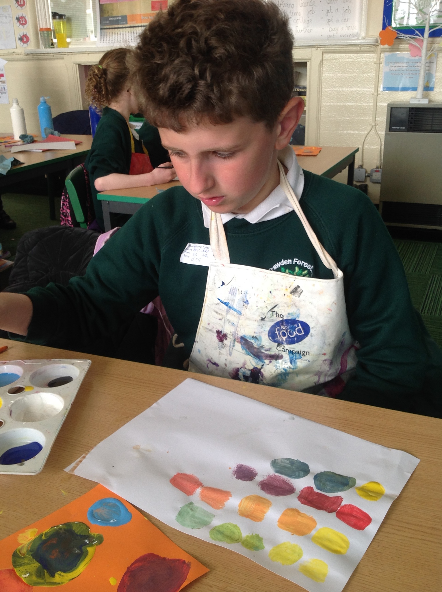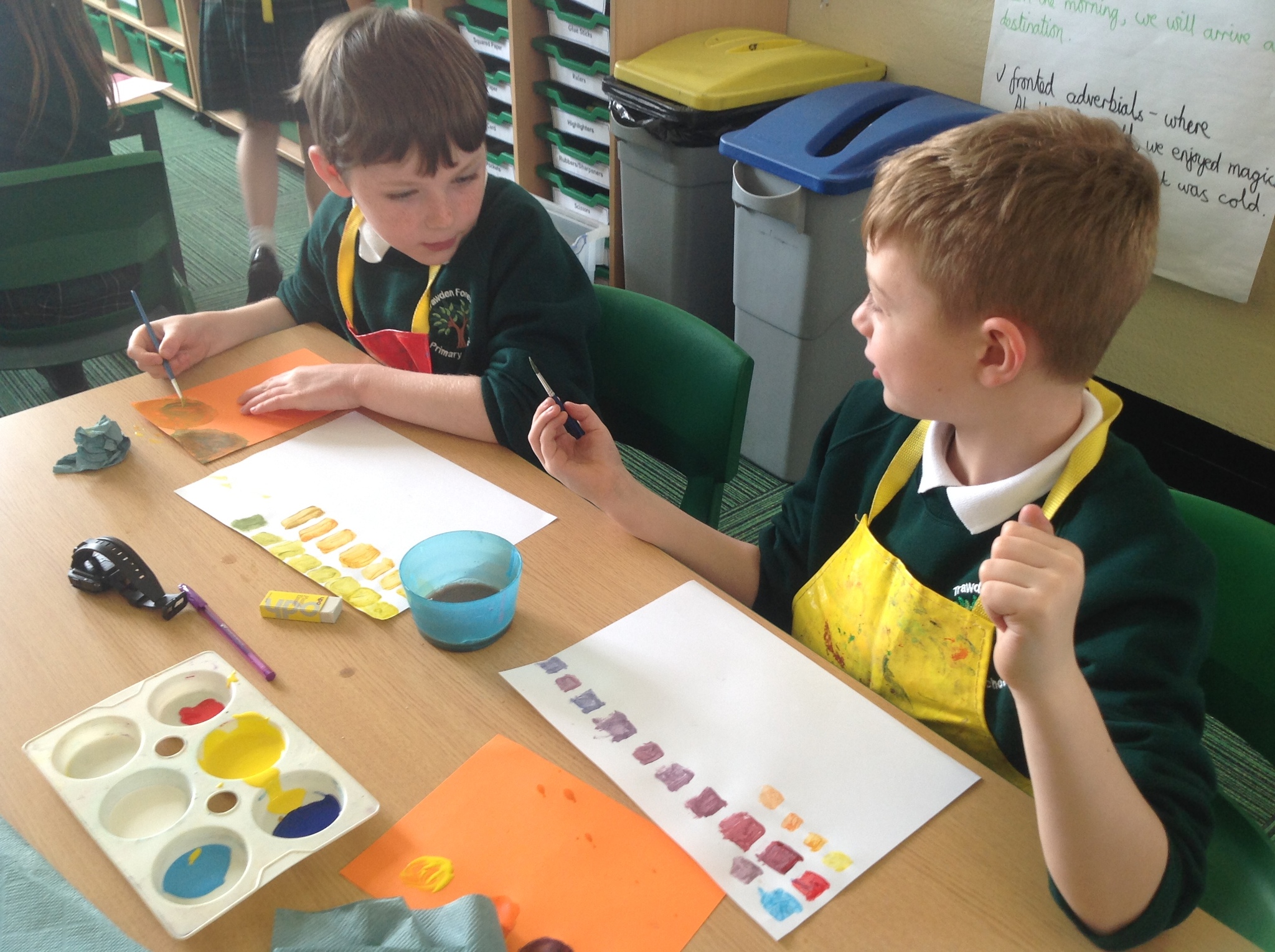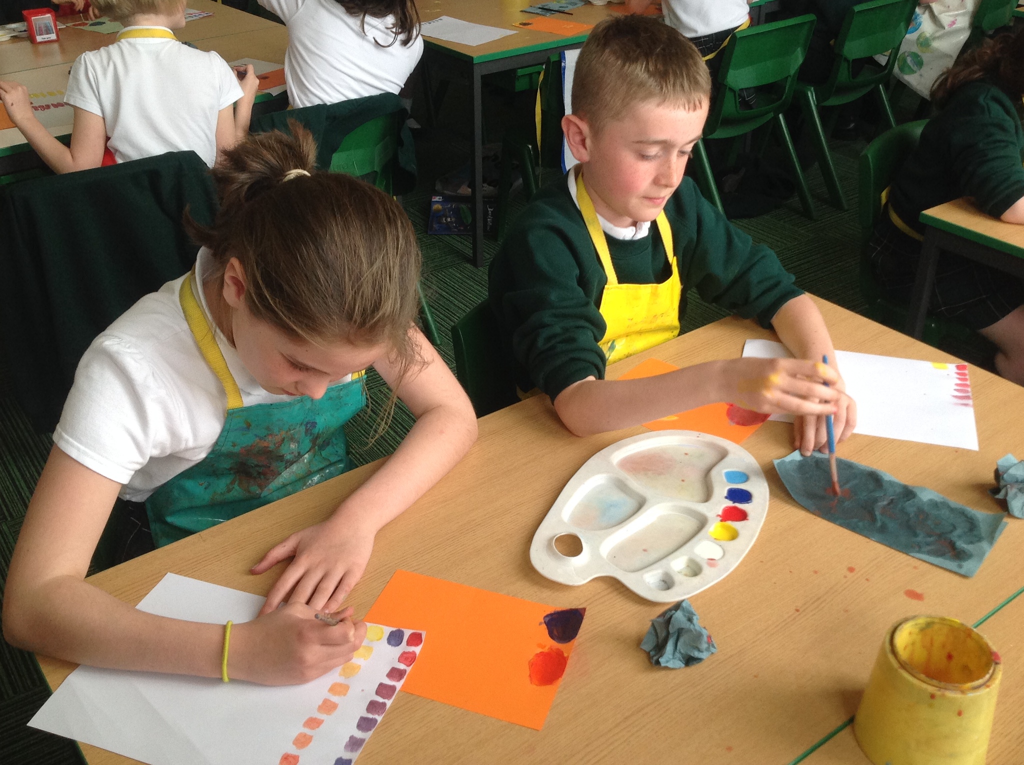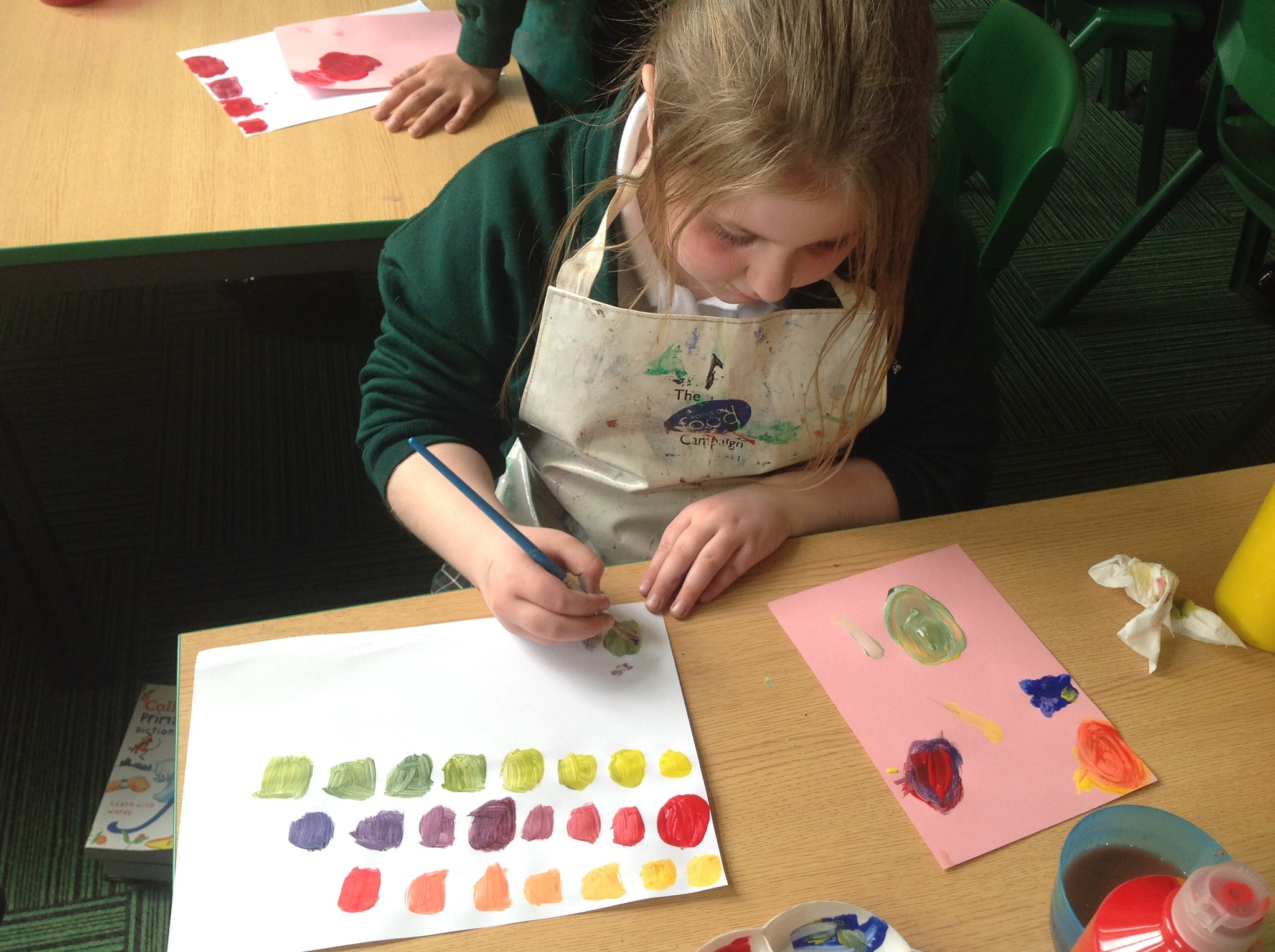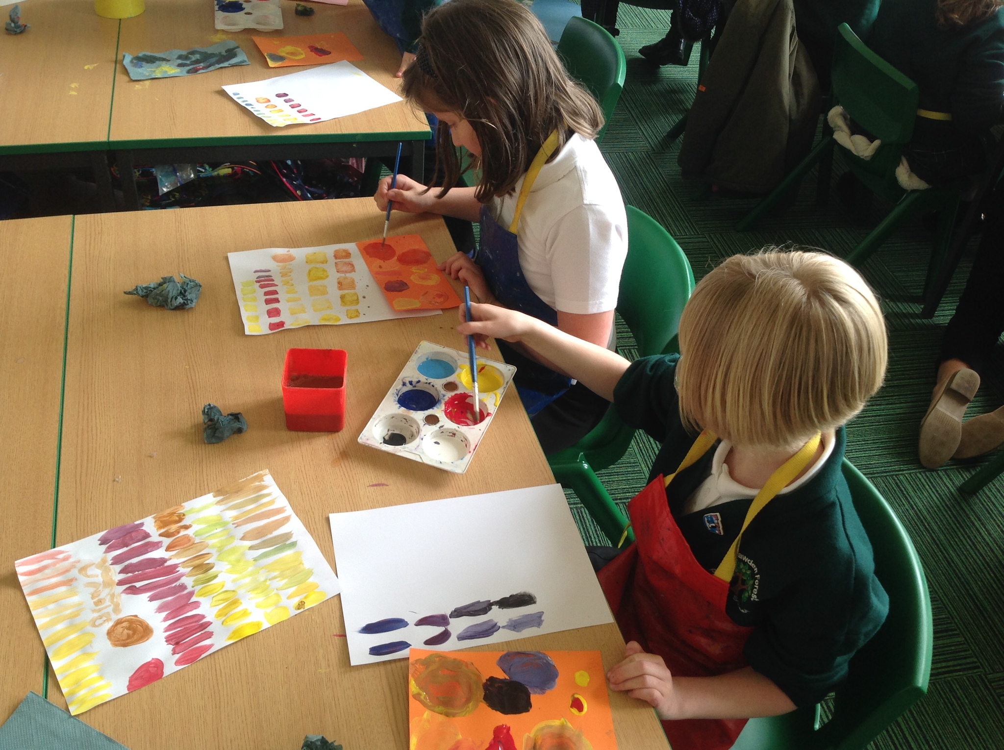 During this afternoon, Year 4 continued their art work from Friday. They used the primary colours to create secondary colours whilst adding a small amount of the darker colour at a time to create more subtle changes in colour. They also experimented with creating other shades and tints of colour. It was interesting to see that the amount of colour could have significant impact on the shade or not much impact at all.
