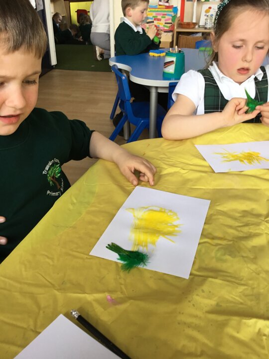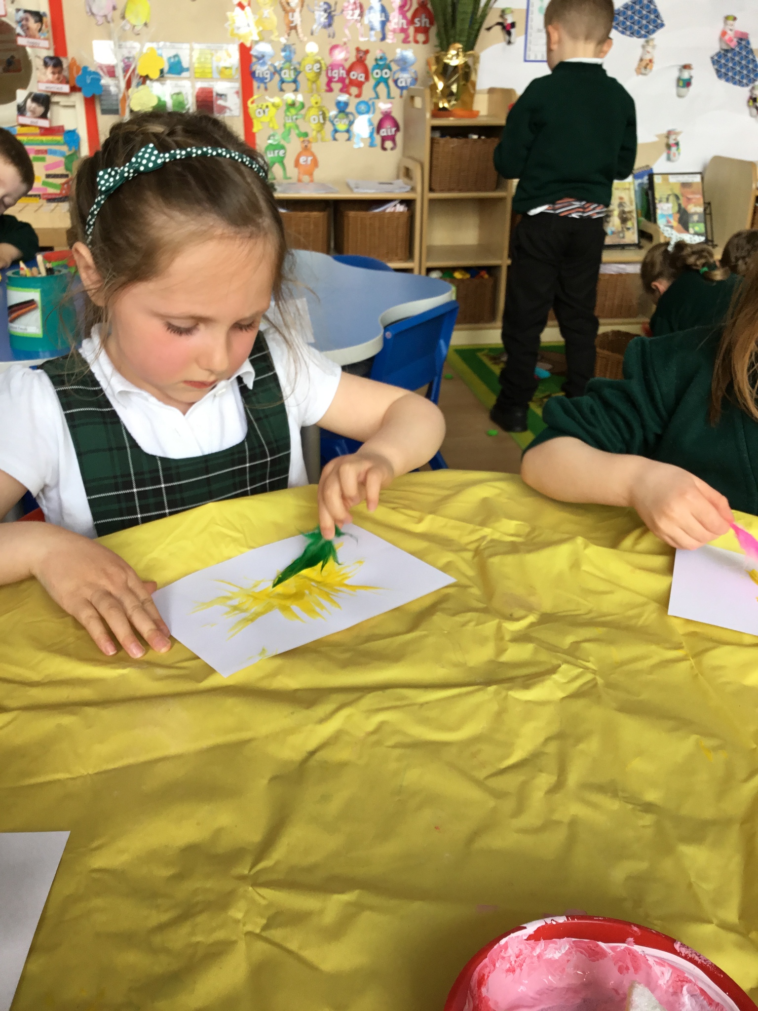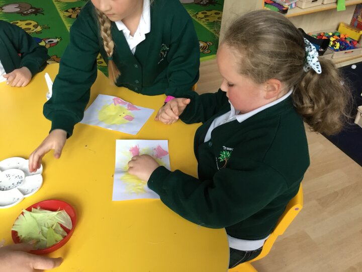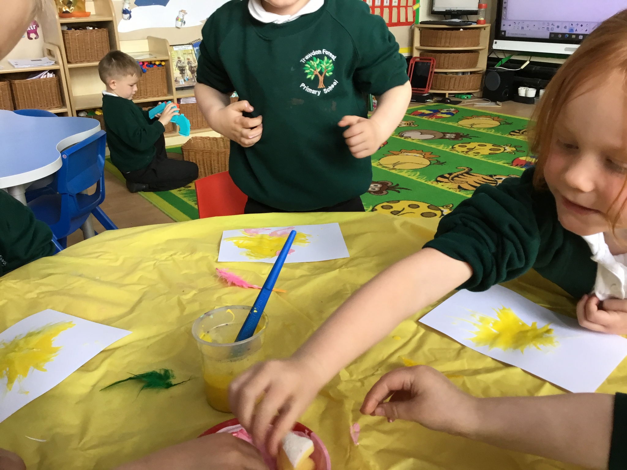 We used feathers to paint its fluffy body and printed shapes for its beak and feet.