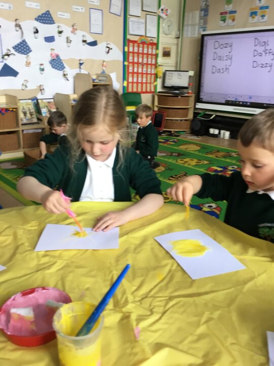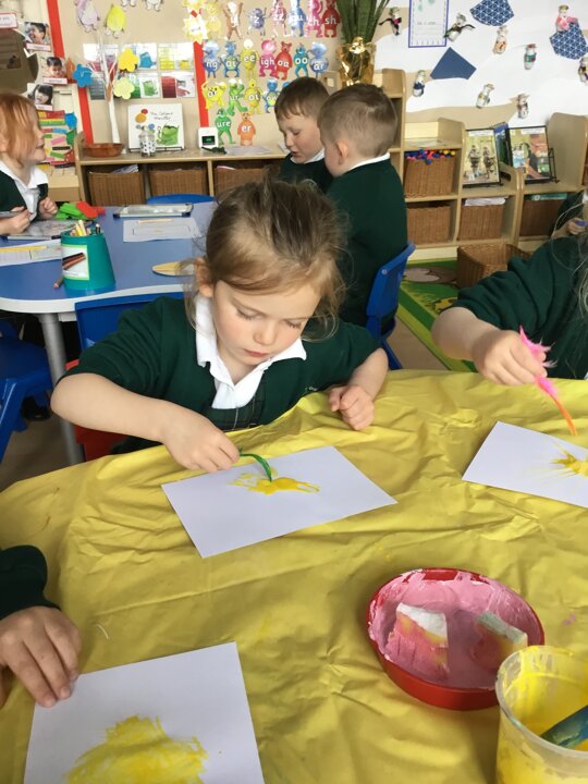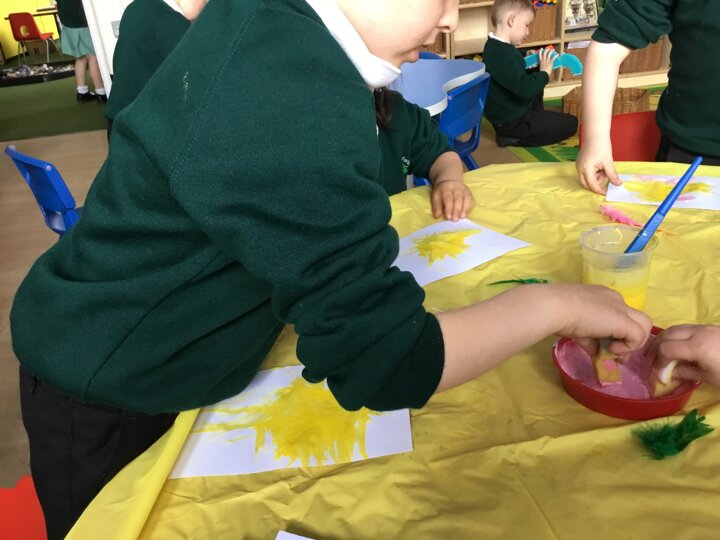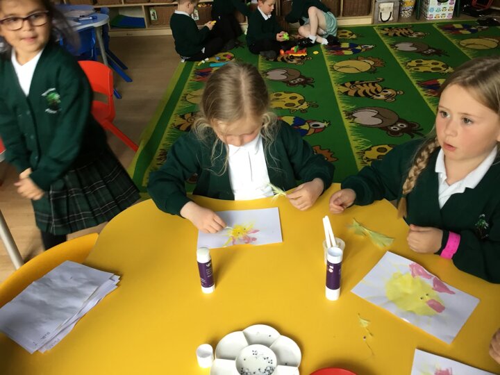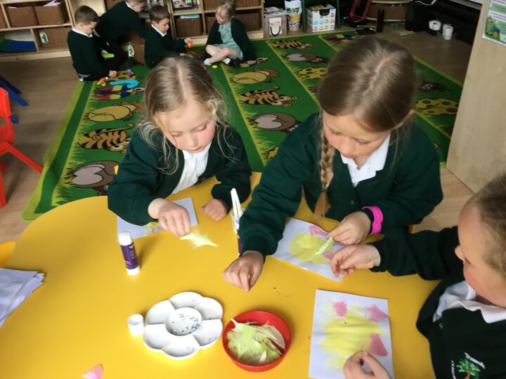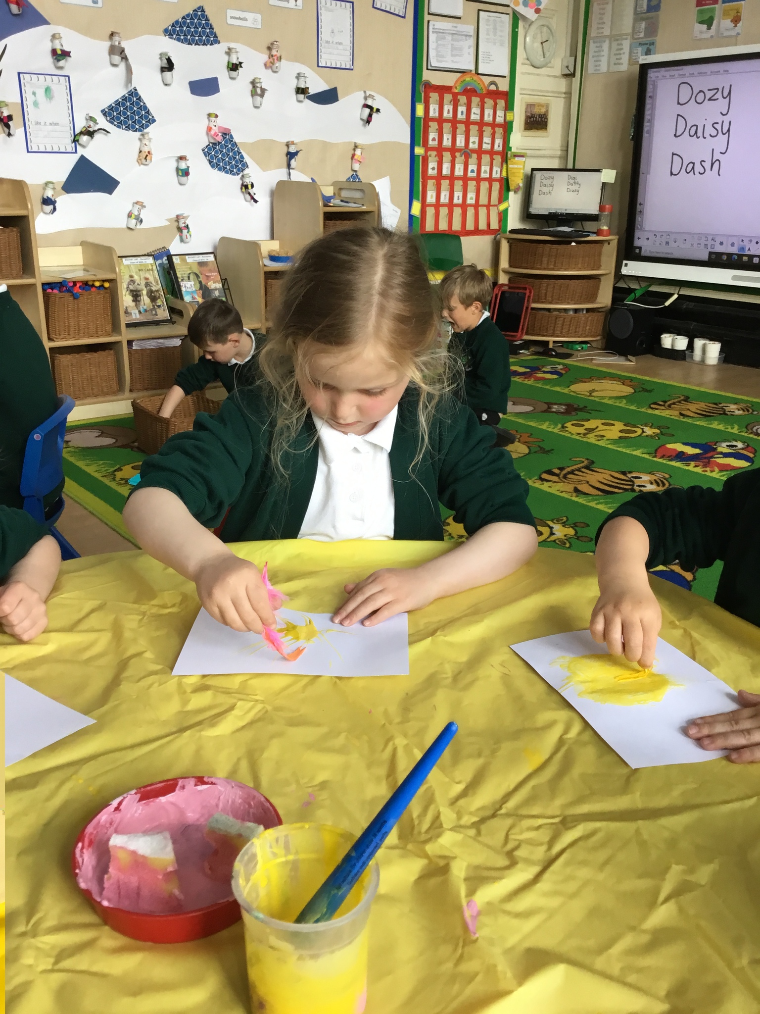 We used feathers to paint its fluffy body and printed shapes for its beak and feet.