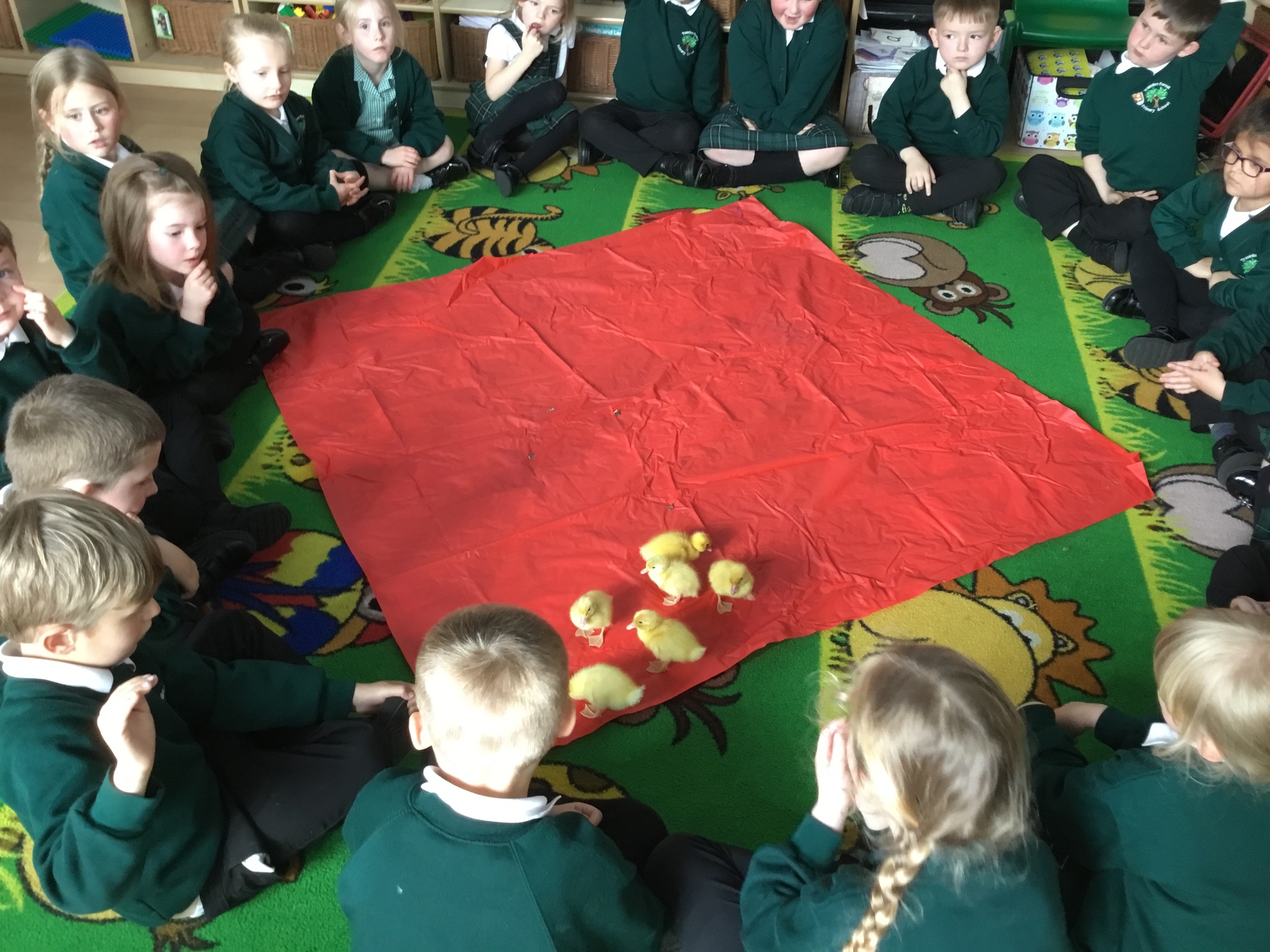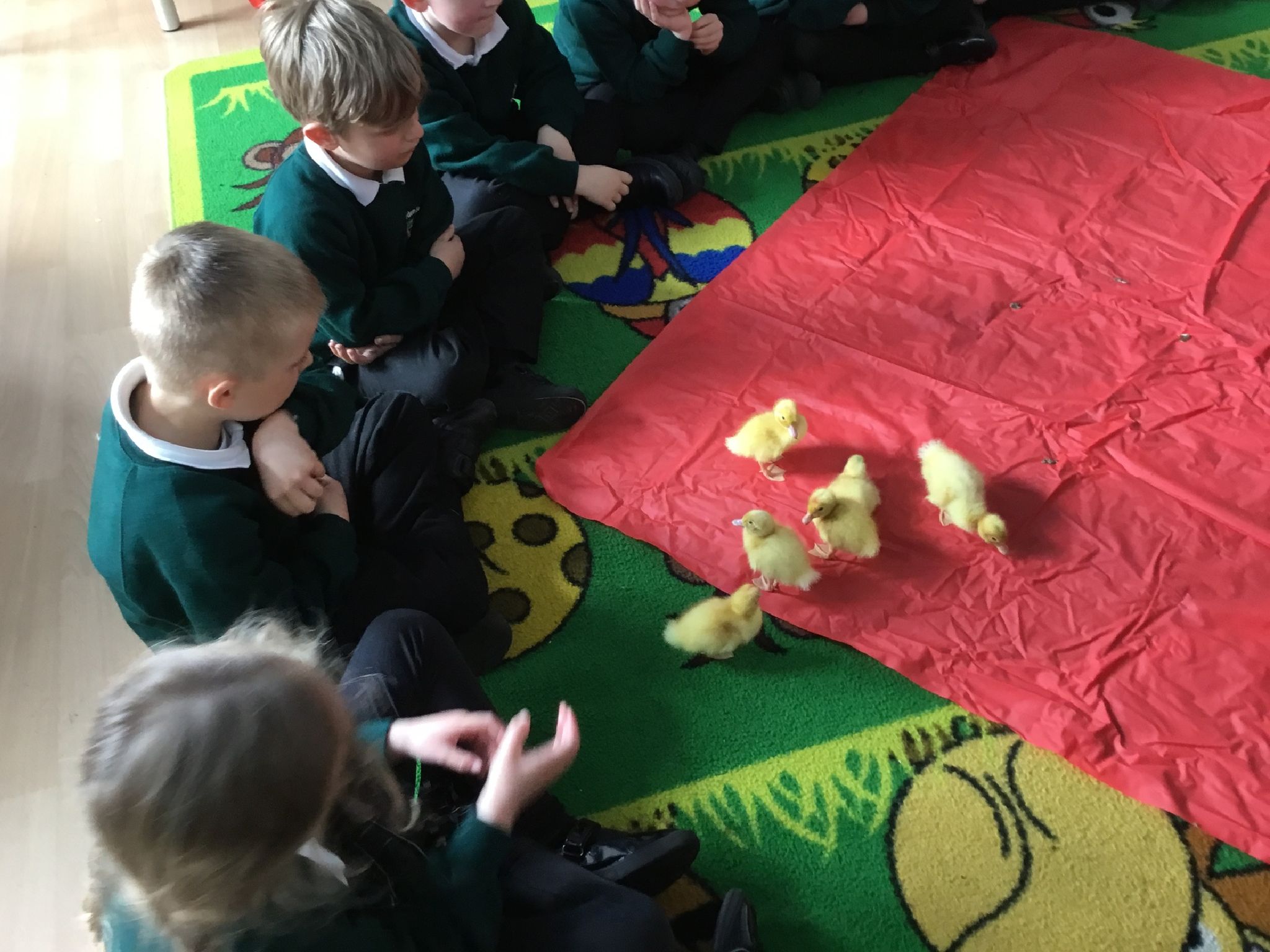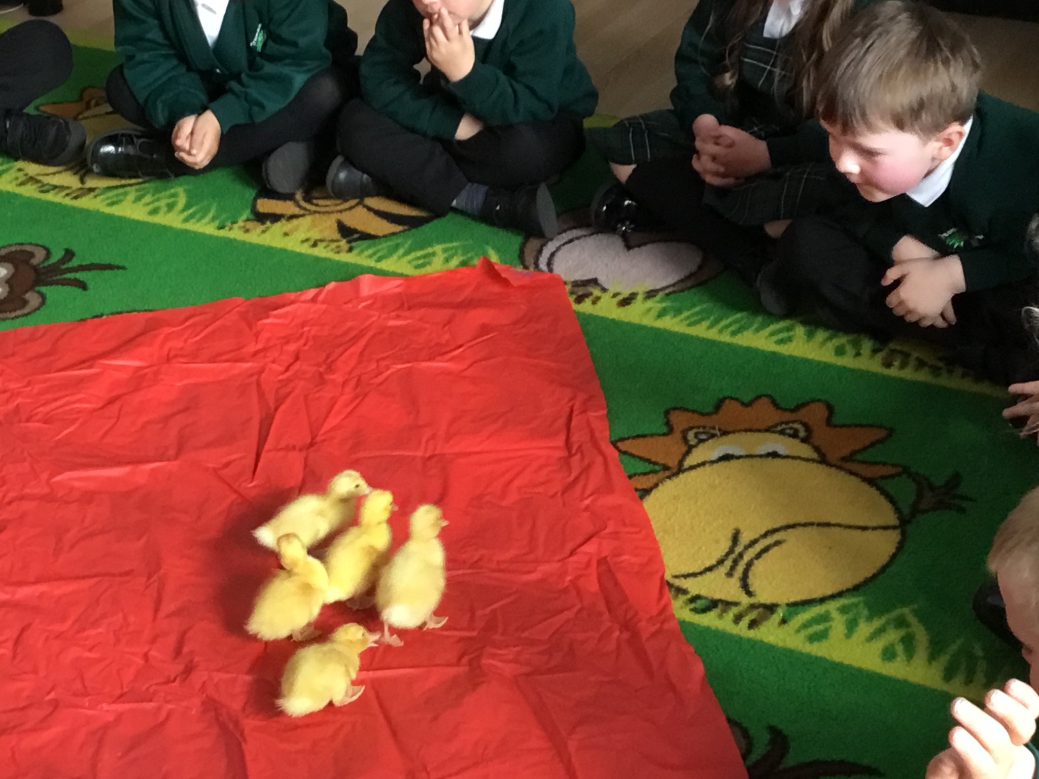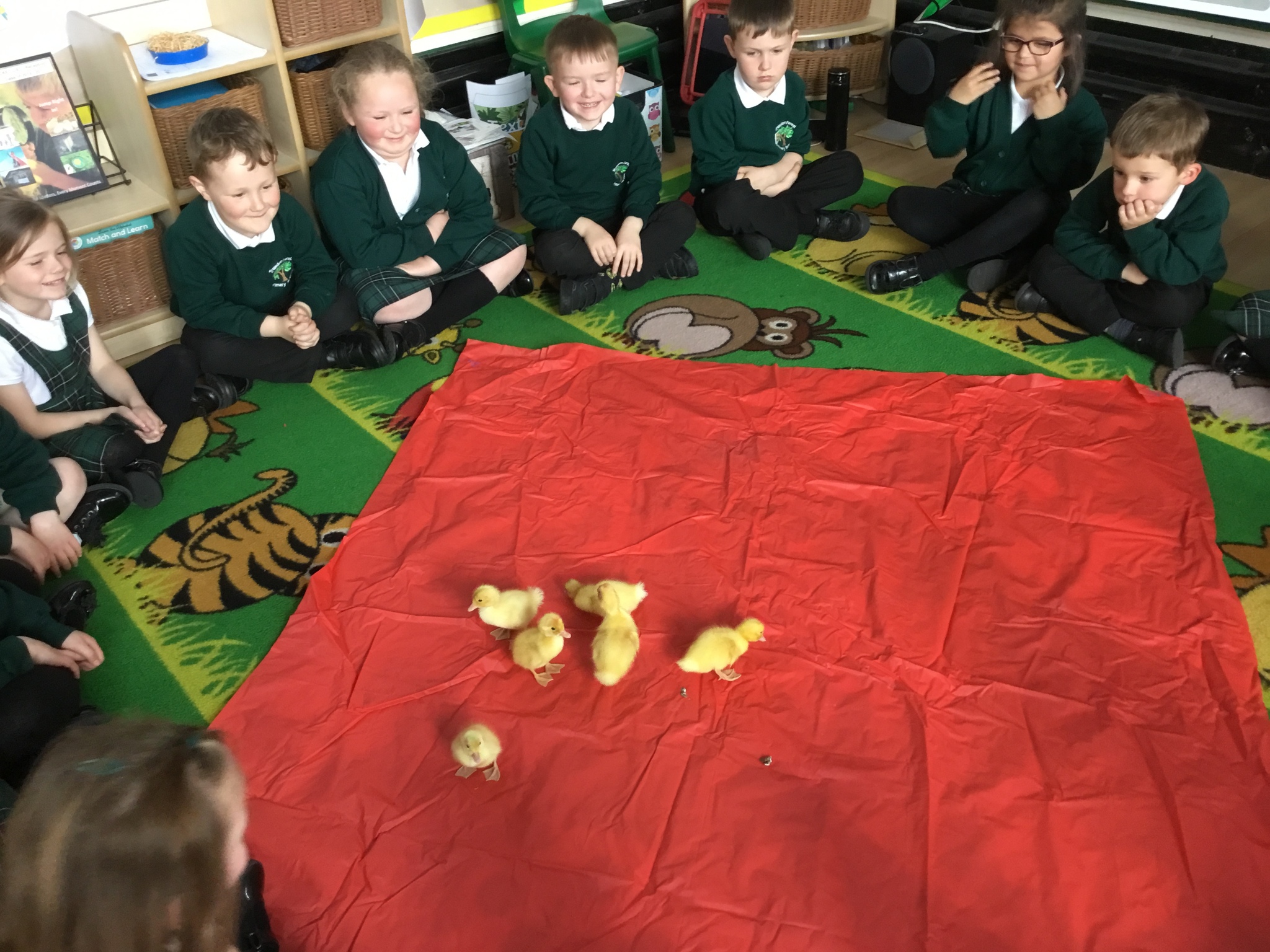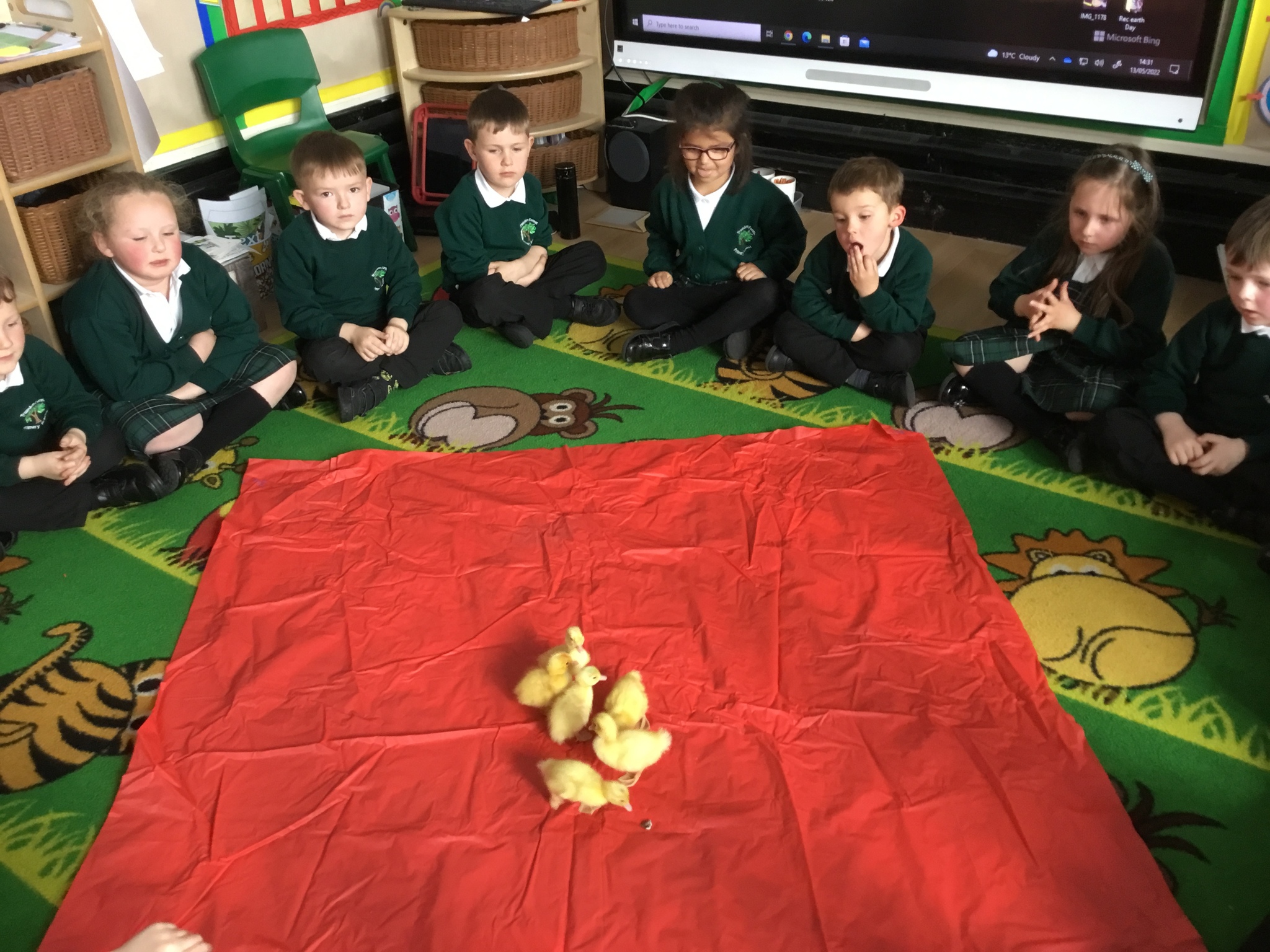 We put them on a mat for everyone to see and gave them names: Daisy, Dozy, Dizzy, Daffy, Digi and Dash. We talked about their feet, down and bills and were amazed at how they possibly fit inside the eggs.