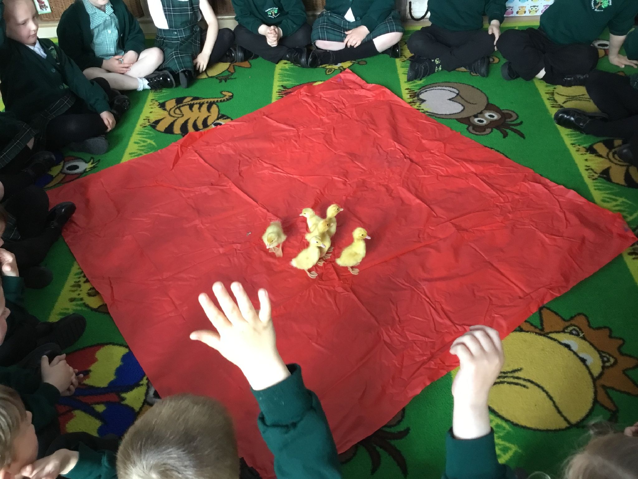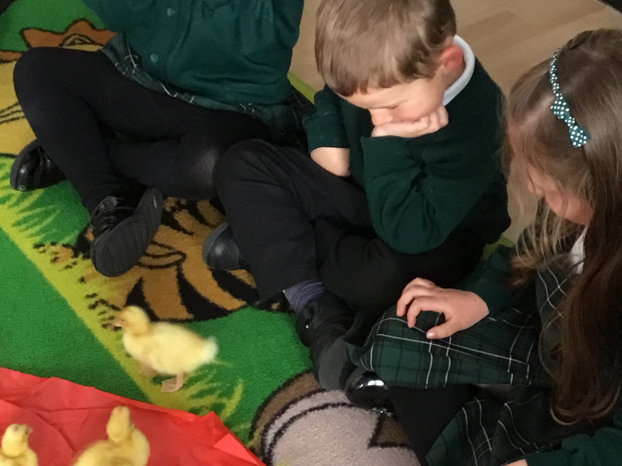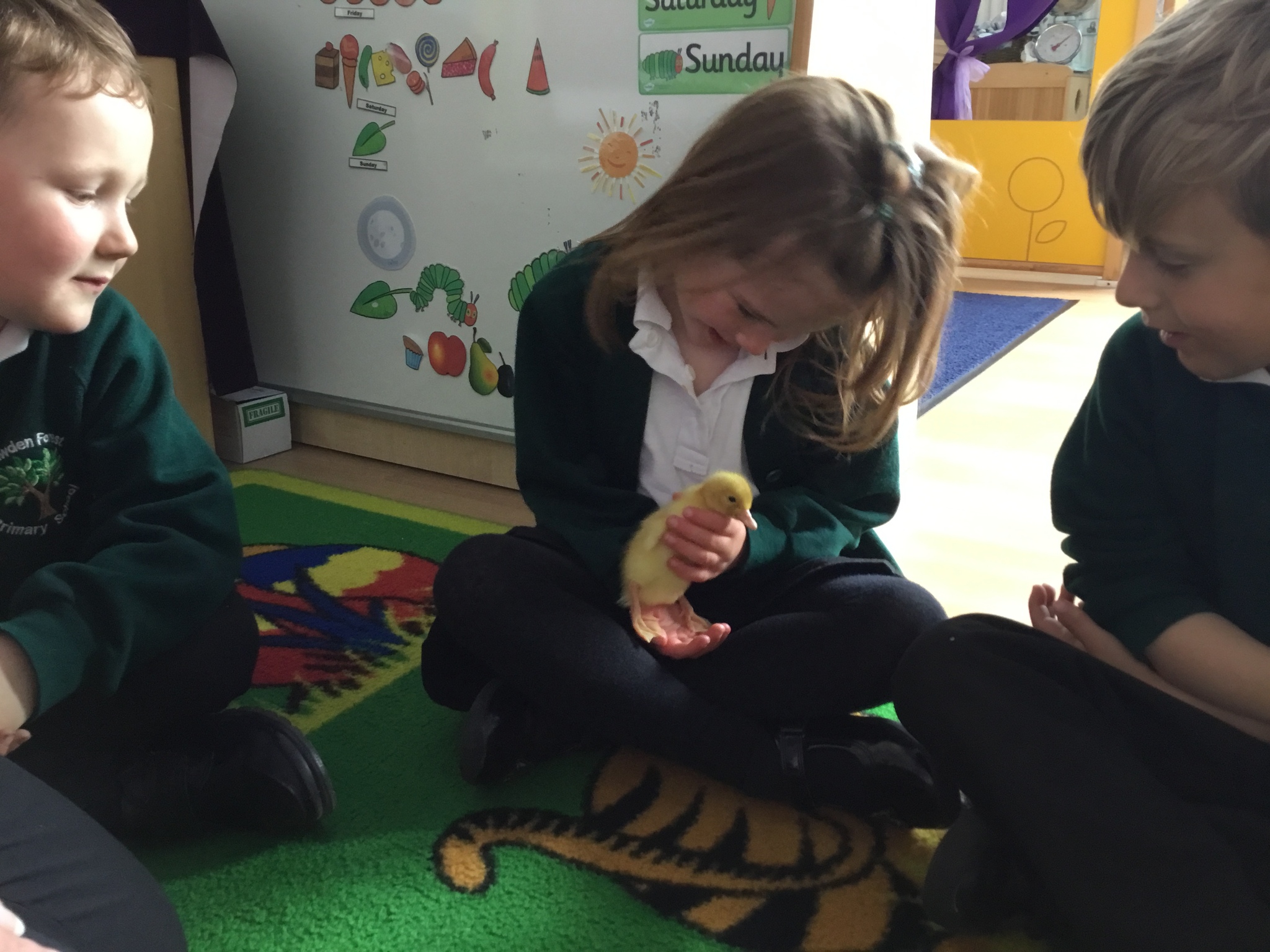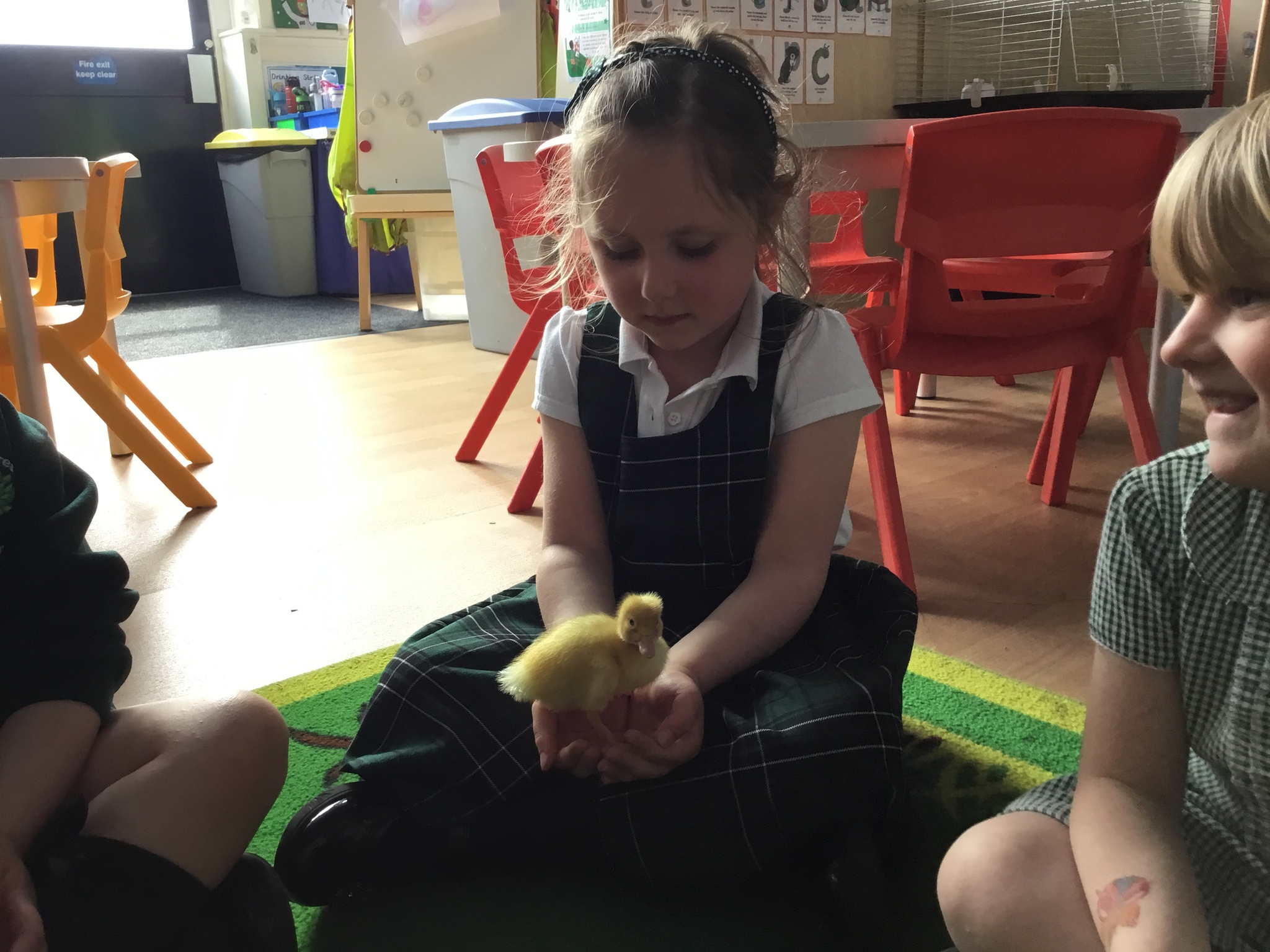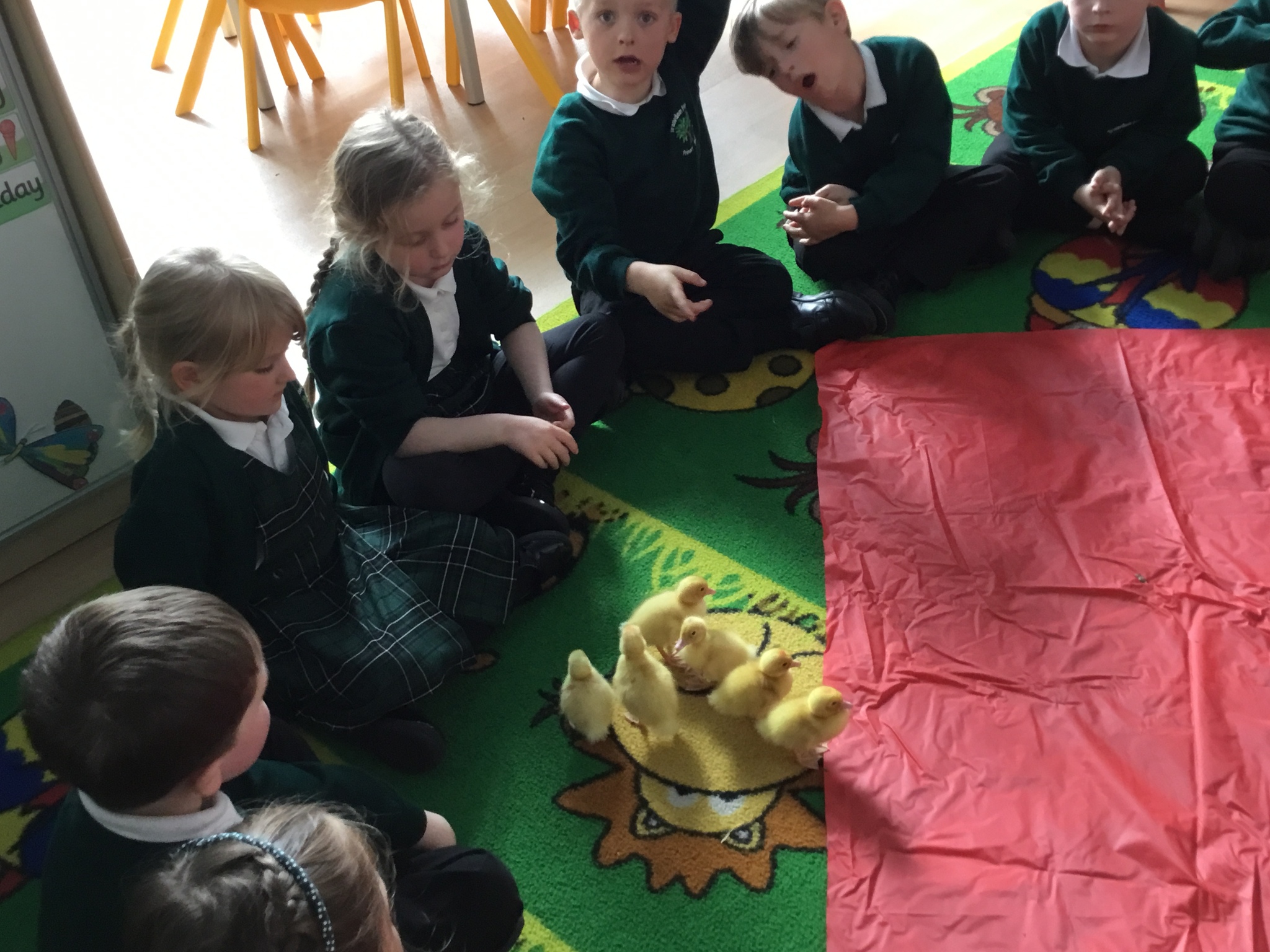 We put them on a mat for everyone to see and gave them names: Daisy, Dozy, Dizzy, Daffy, Digi and Dash. We talked about their feet, down and bills and were amazed at how they possibly fit inside the eggs.