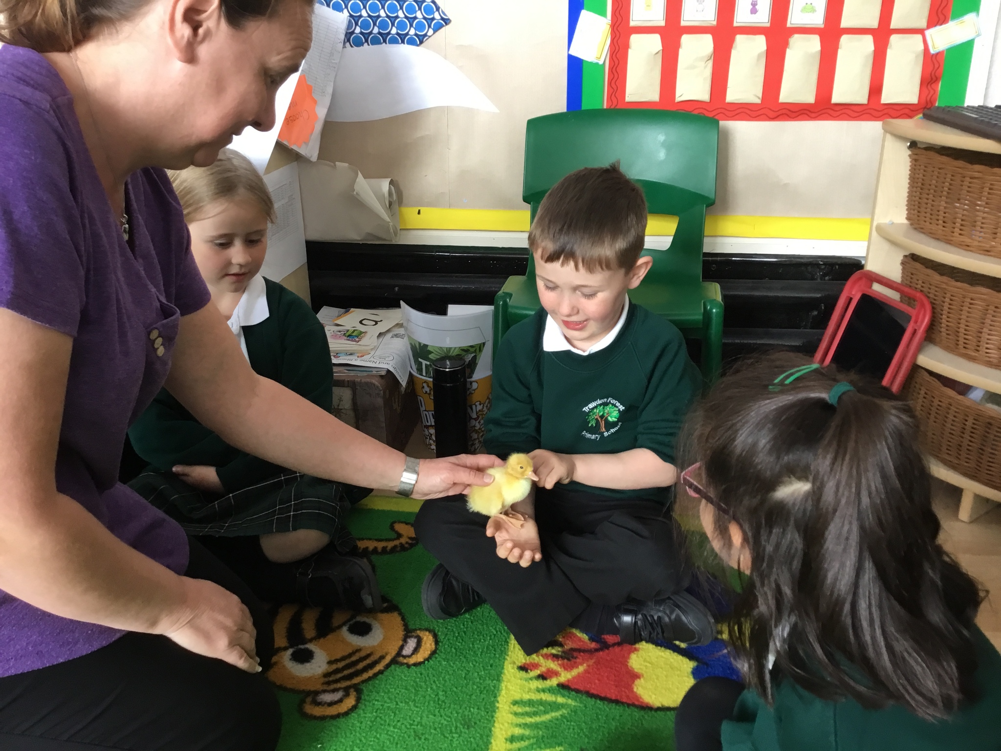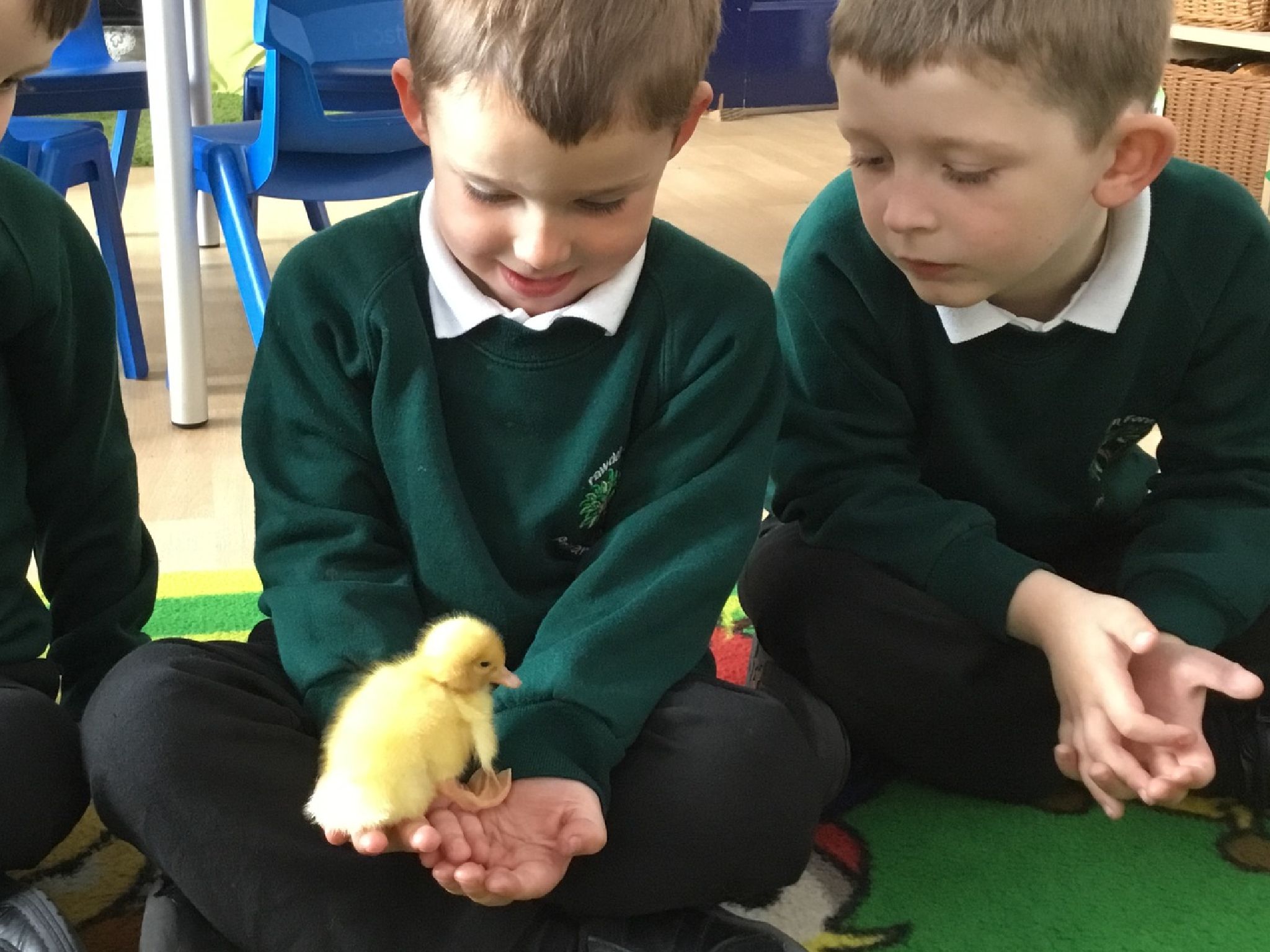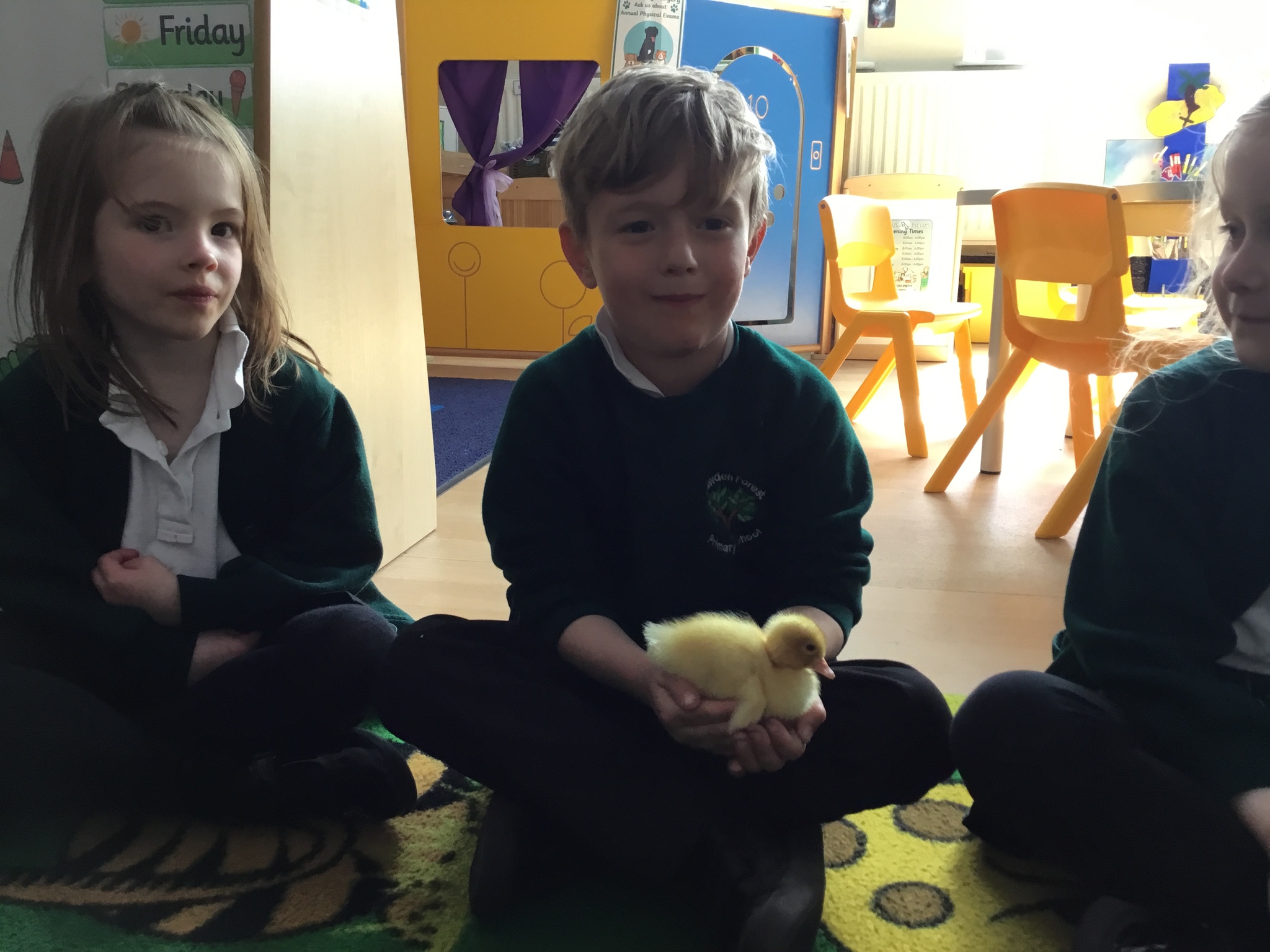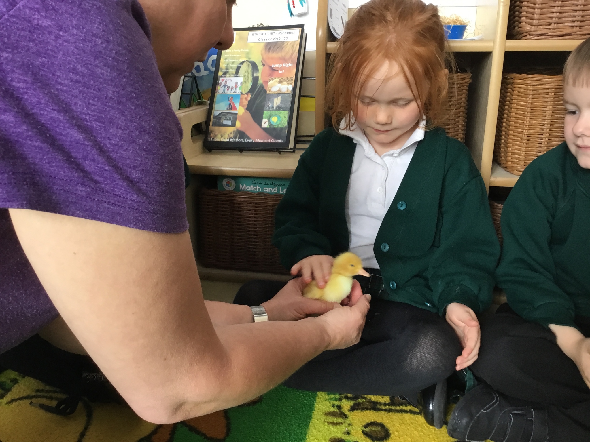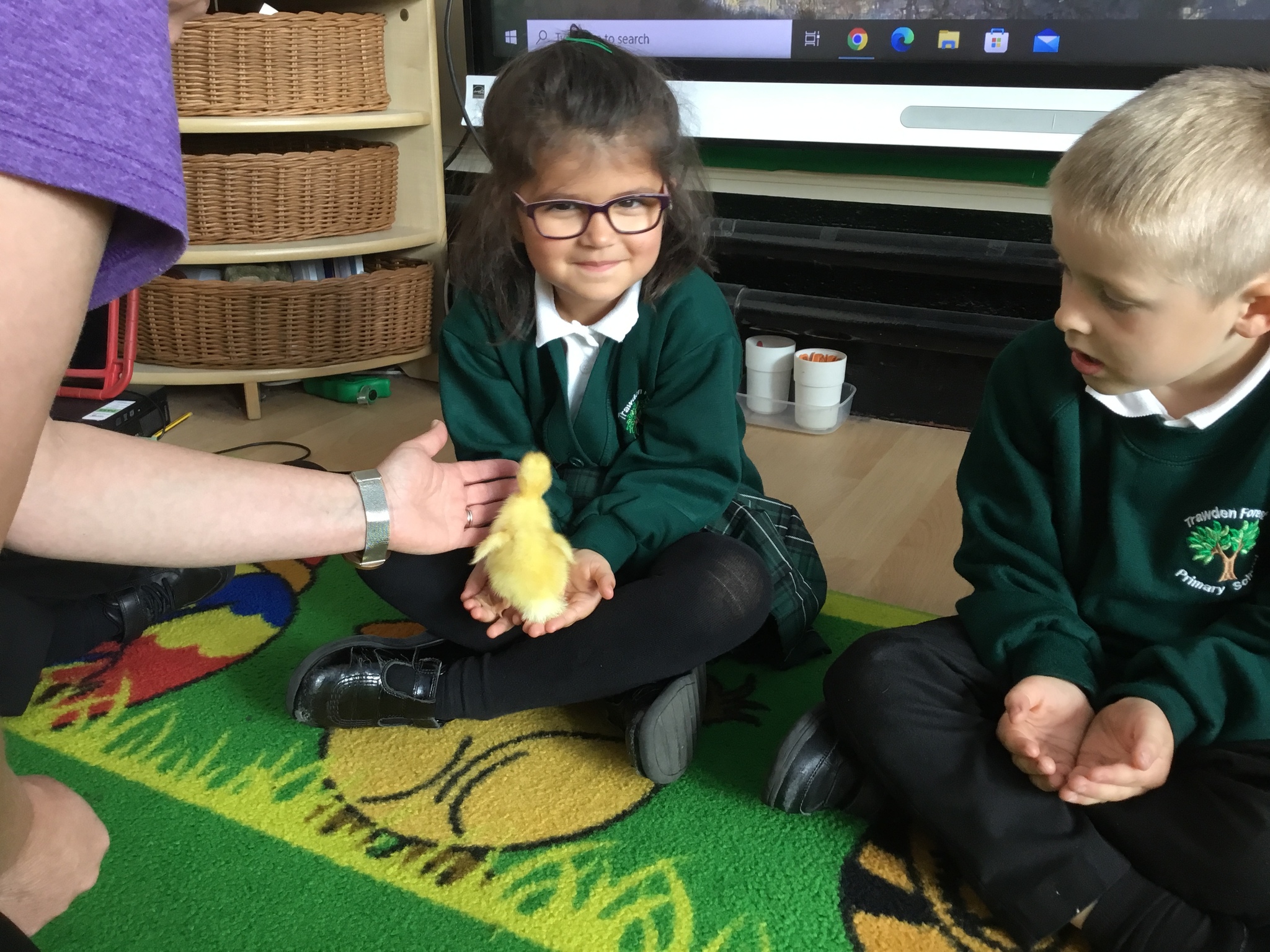 We put them on a mat for everyone to see and gave them names: Daisy, Dozy, Dizzy, Daffy, Digi and Dash. We talked about their feet, down and bills and were amazed at how they possibly fit inside the eggs.
