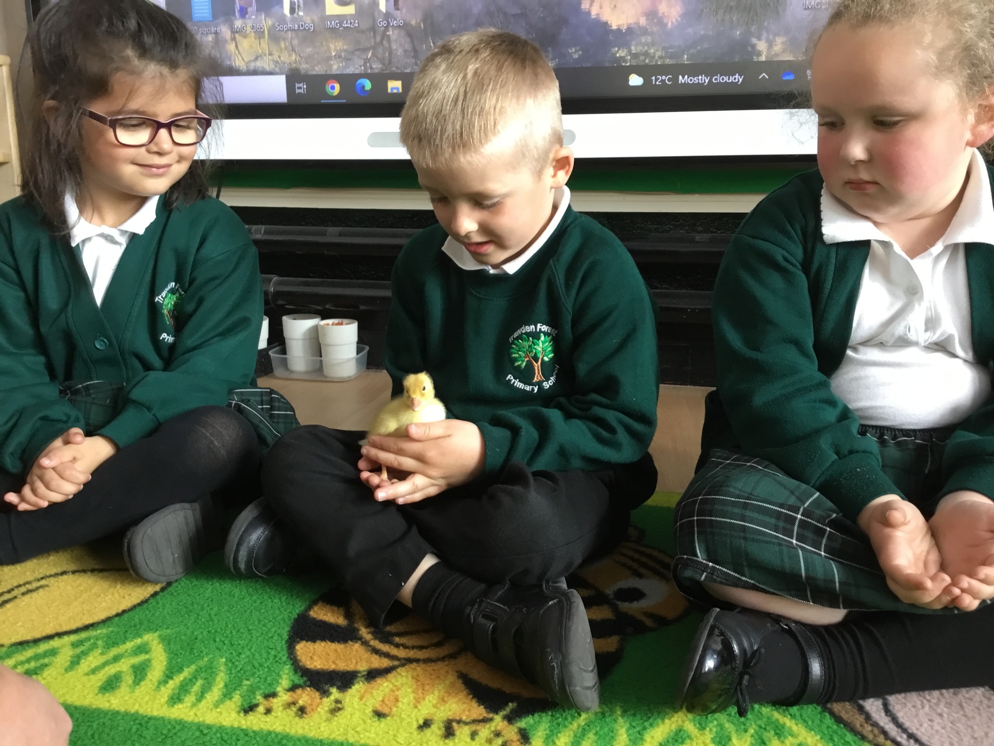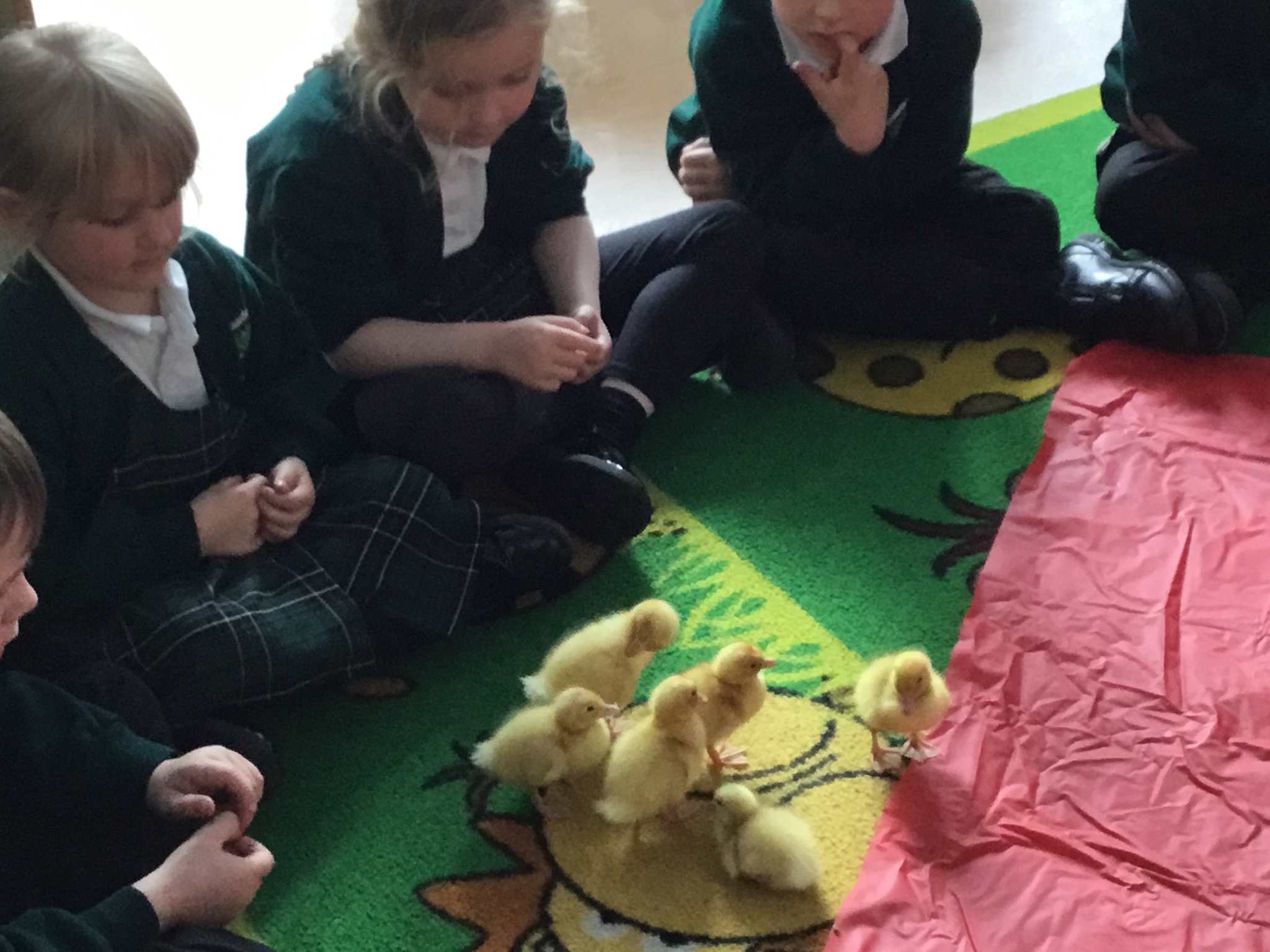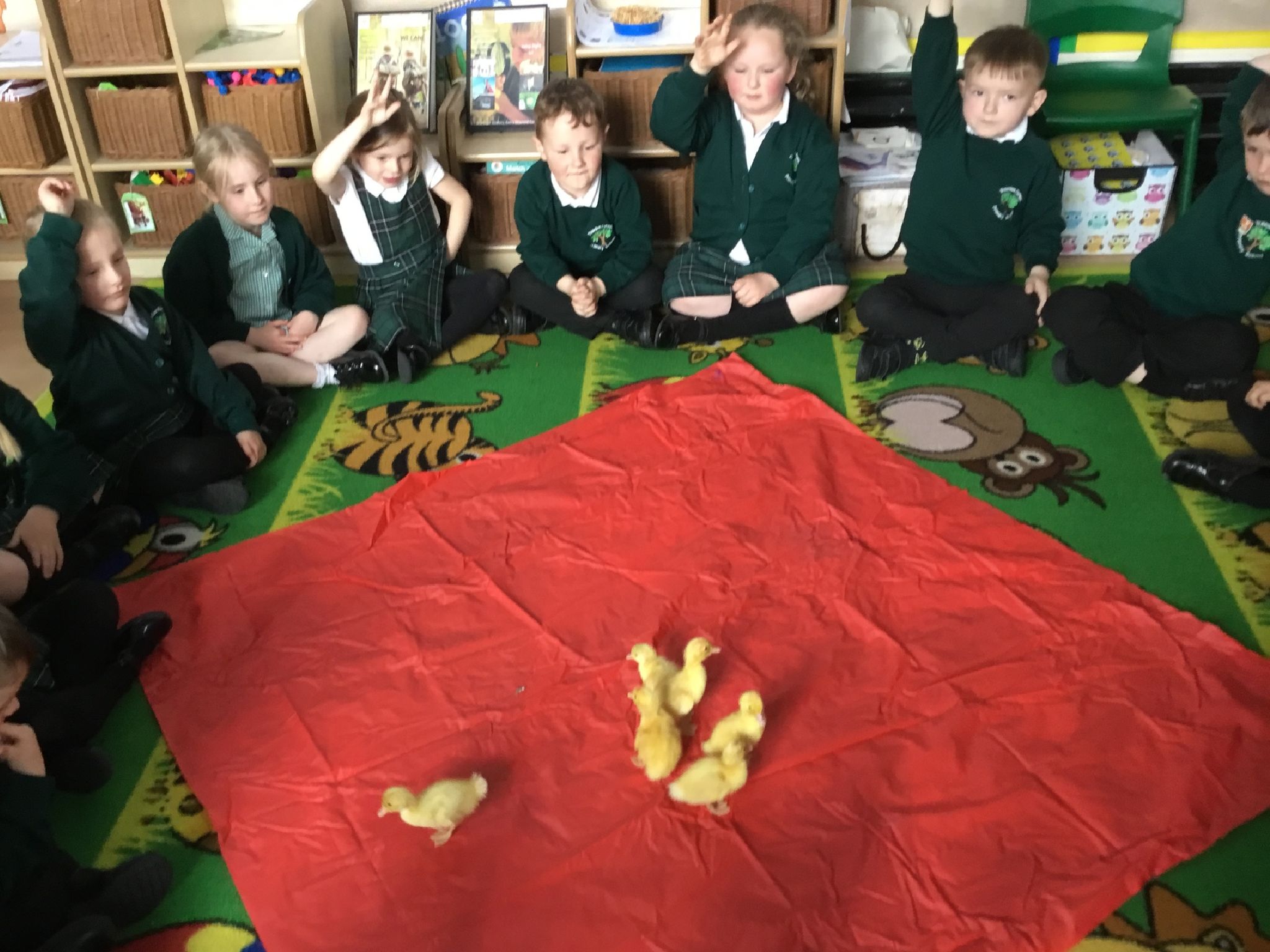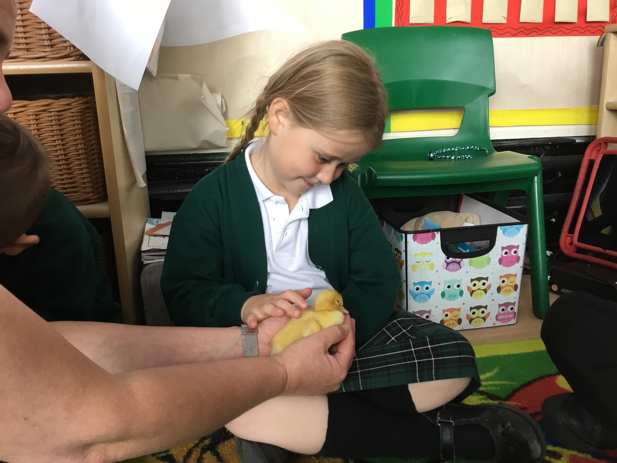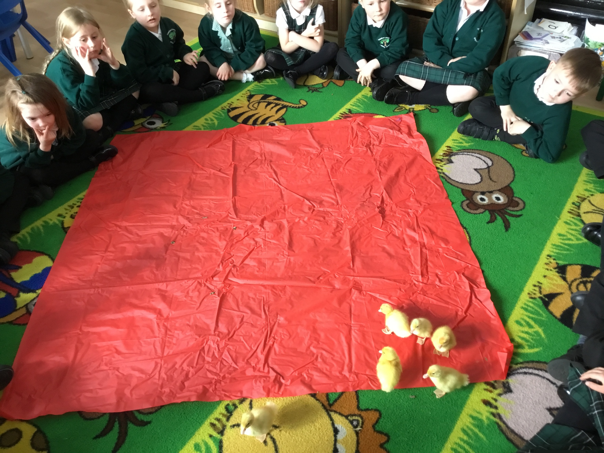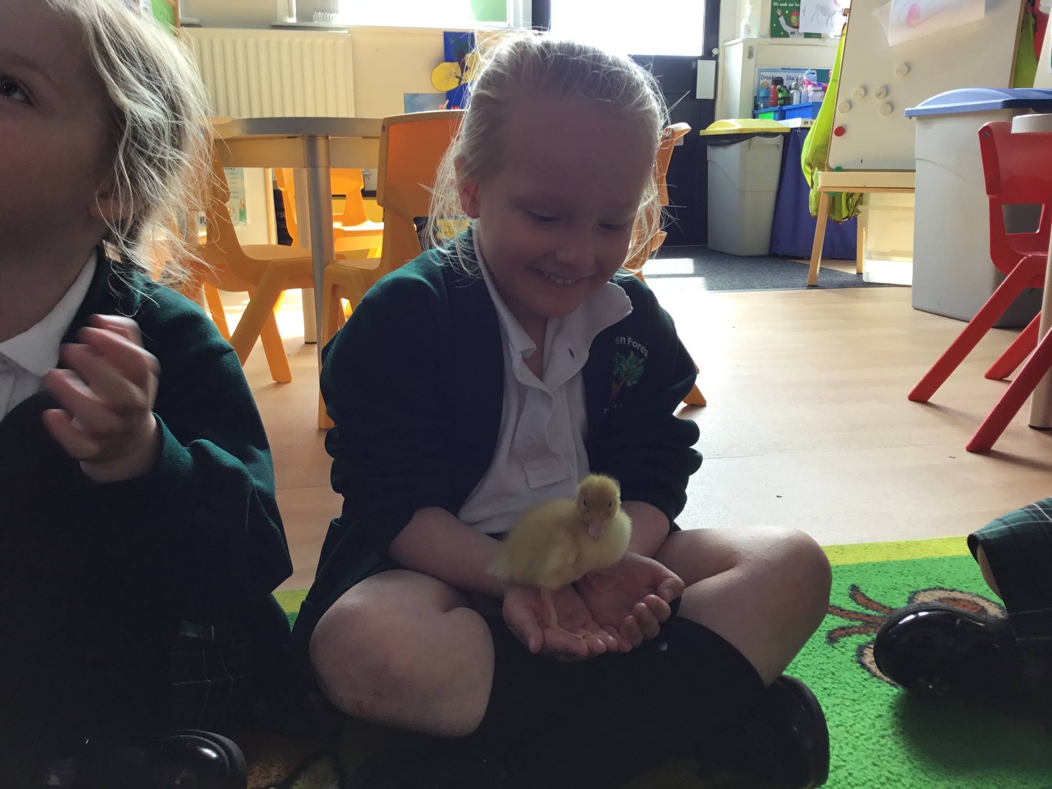 We put them on a mat for everyone to see and gave them names: Daisy, Dozy, Dizzy, Daffy, Digi and Dash. We talked about their feet, down and bills and were amazed at how they possibly fit inside the eggs.