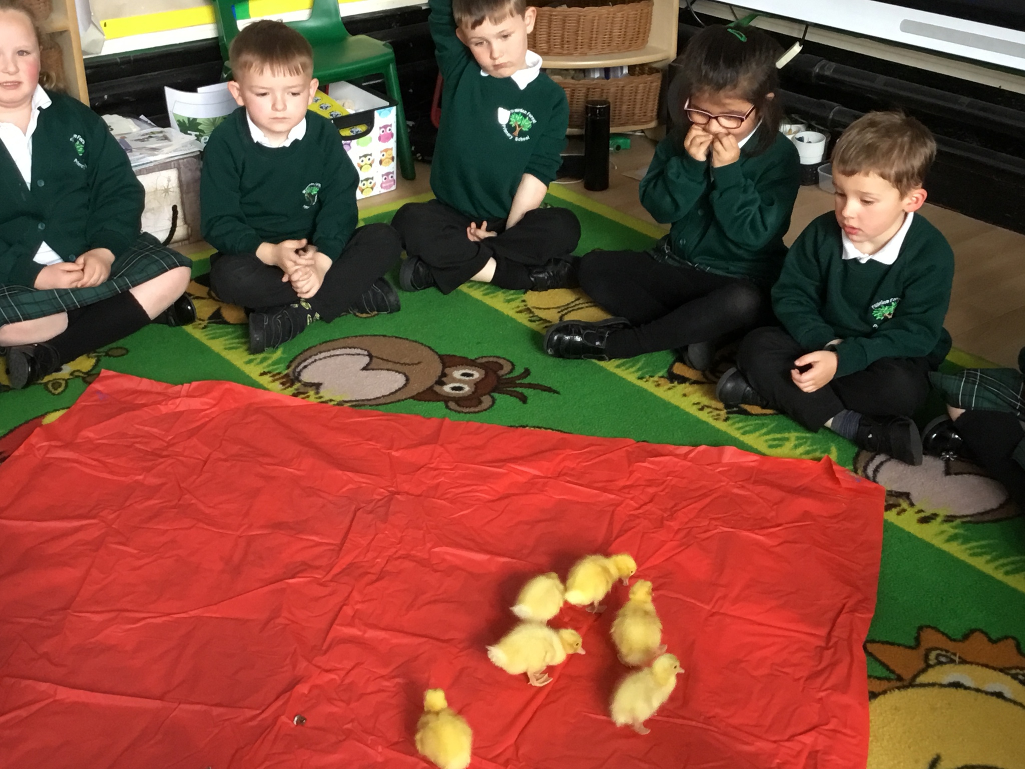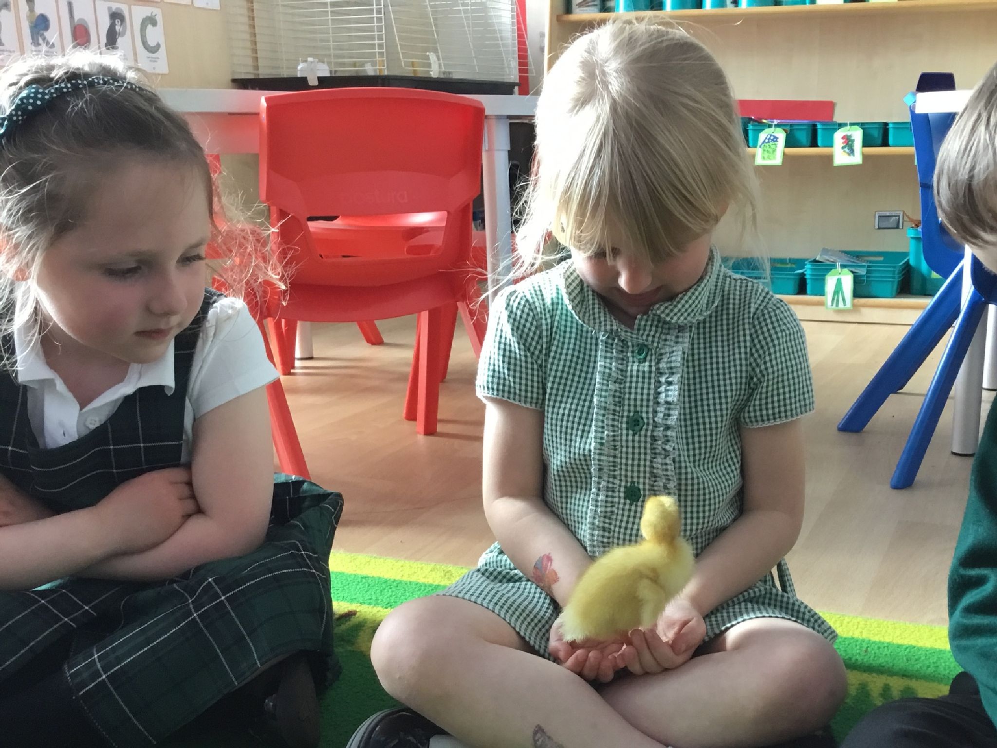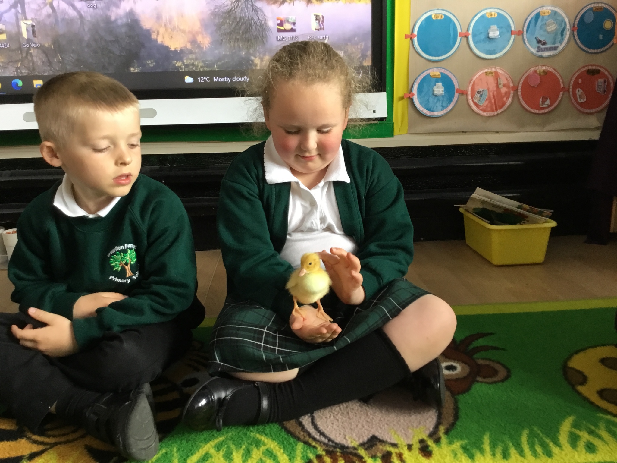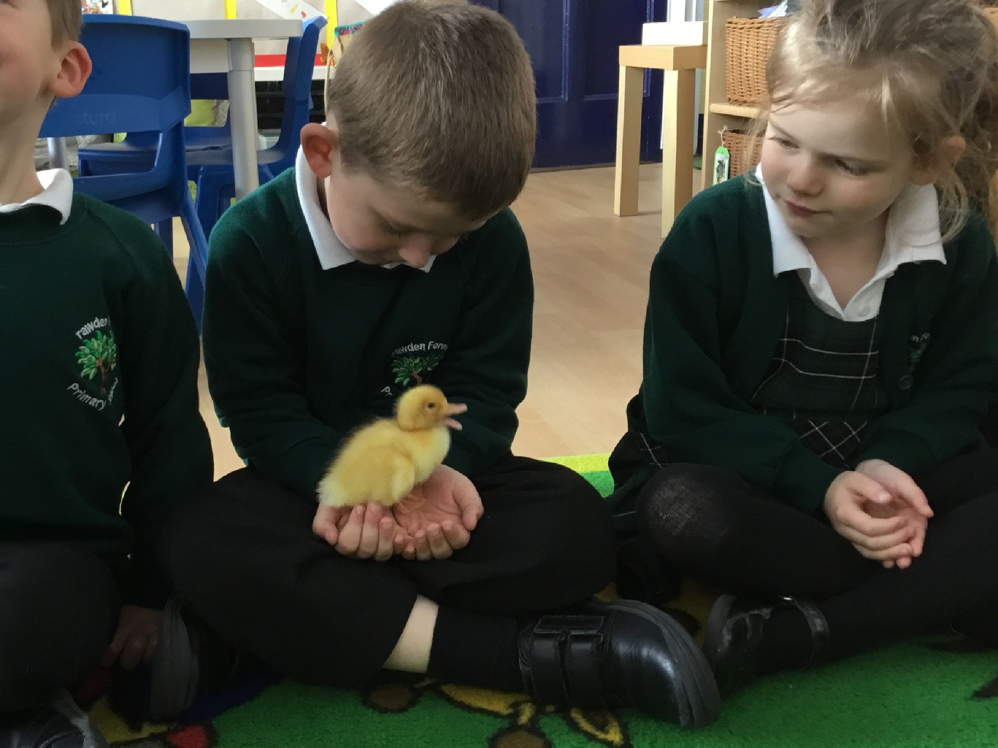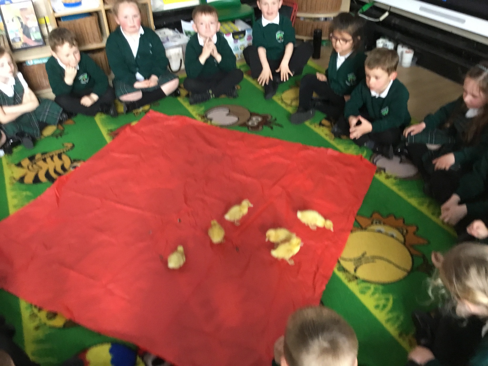 We put them on a mat for everyone to see and gave them names: Daisy, Dozy, Dizzy, Daffy, Digi and Dash. We talked about their feet, down and bills and were amazed at how they possibly fit inside the eggs.