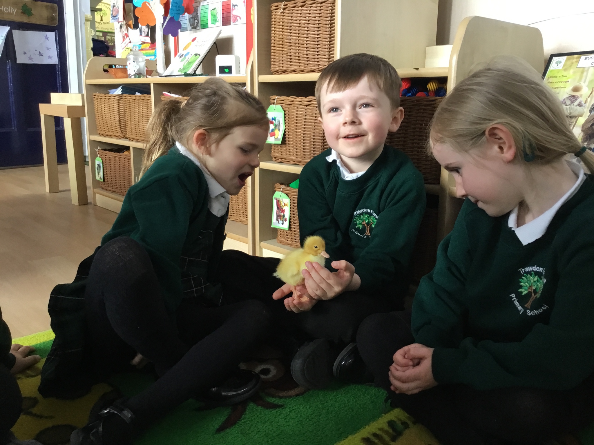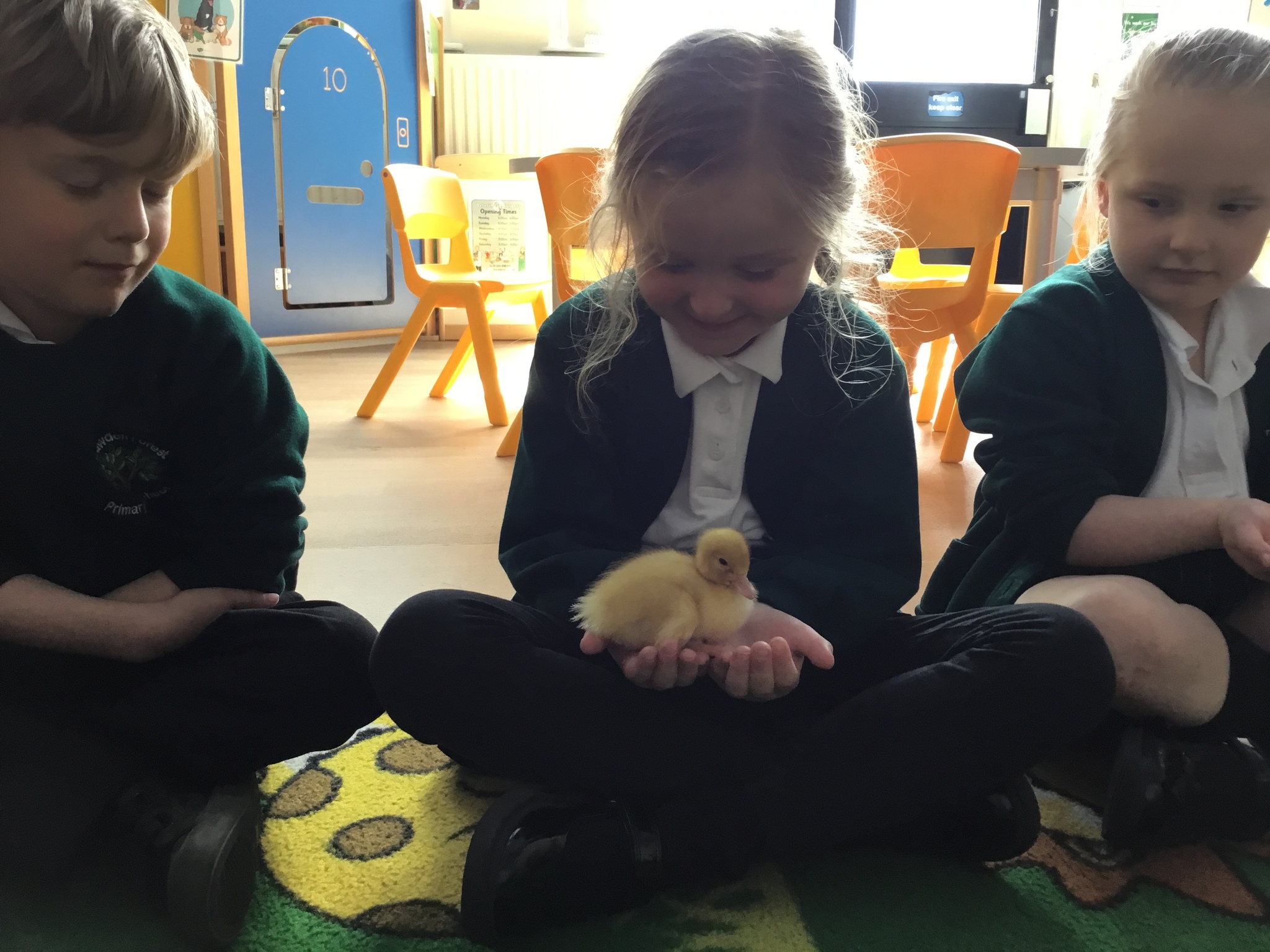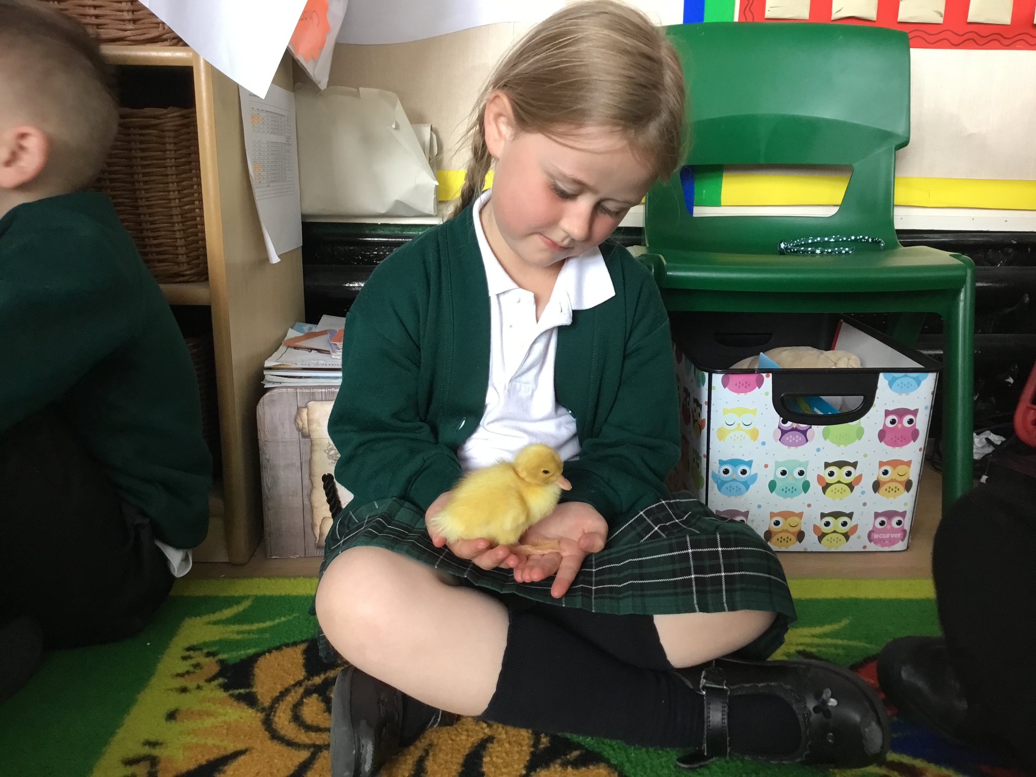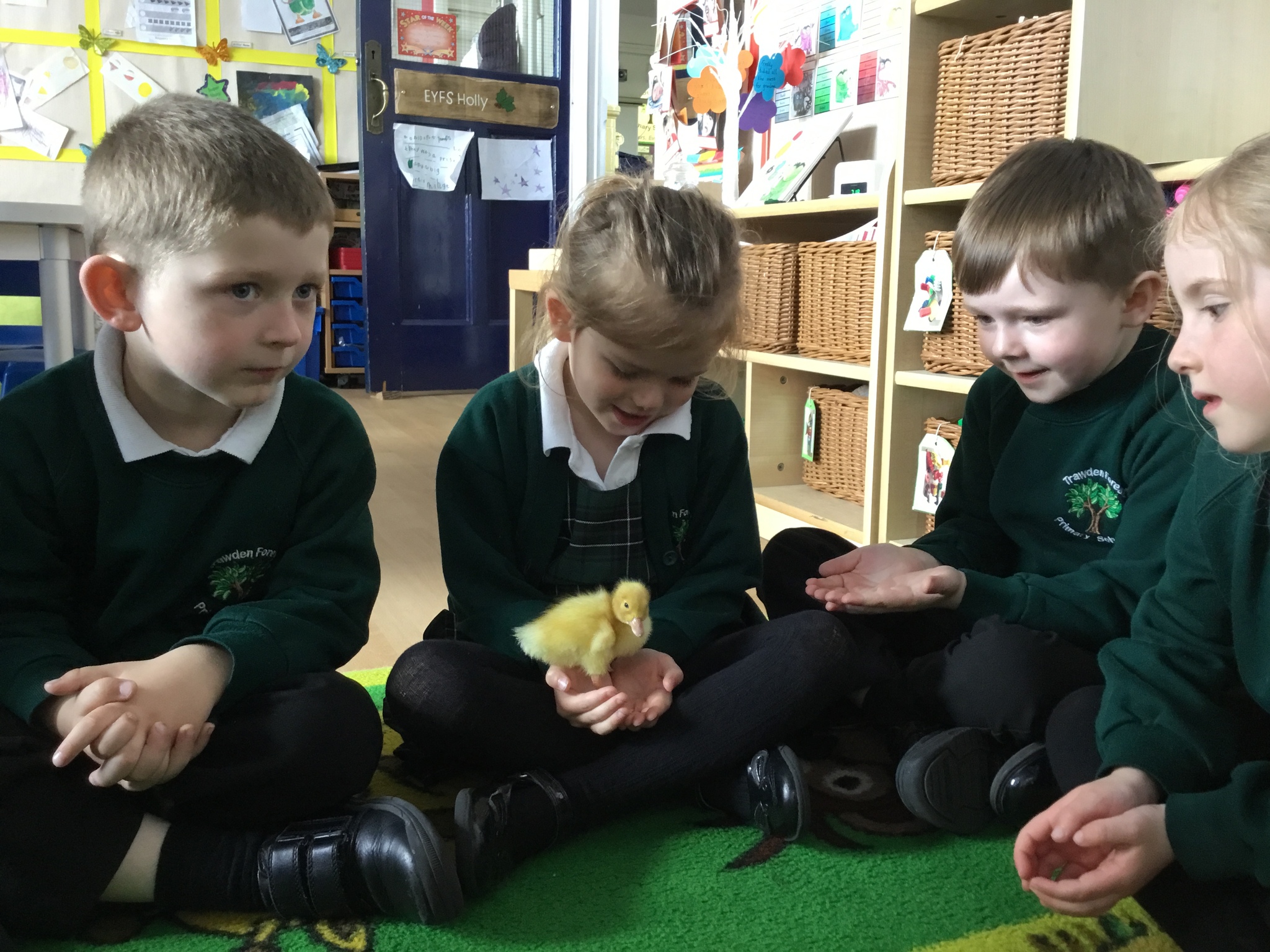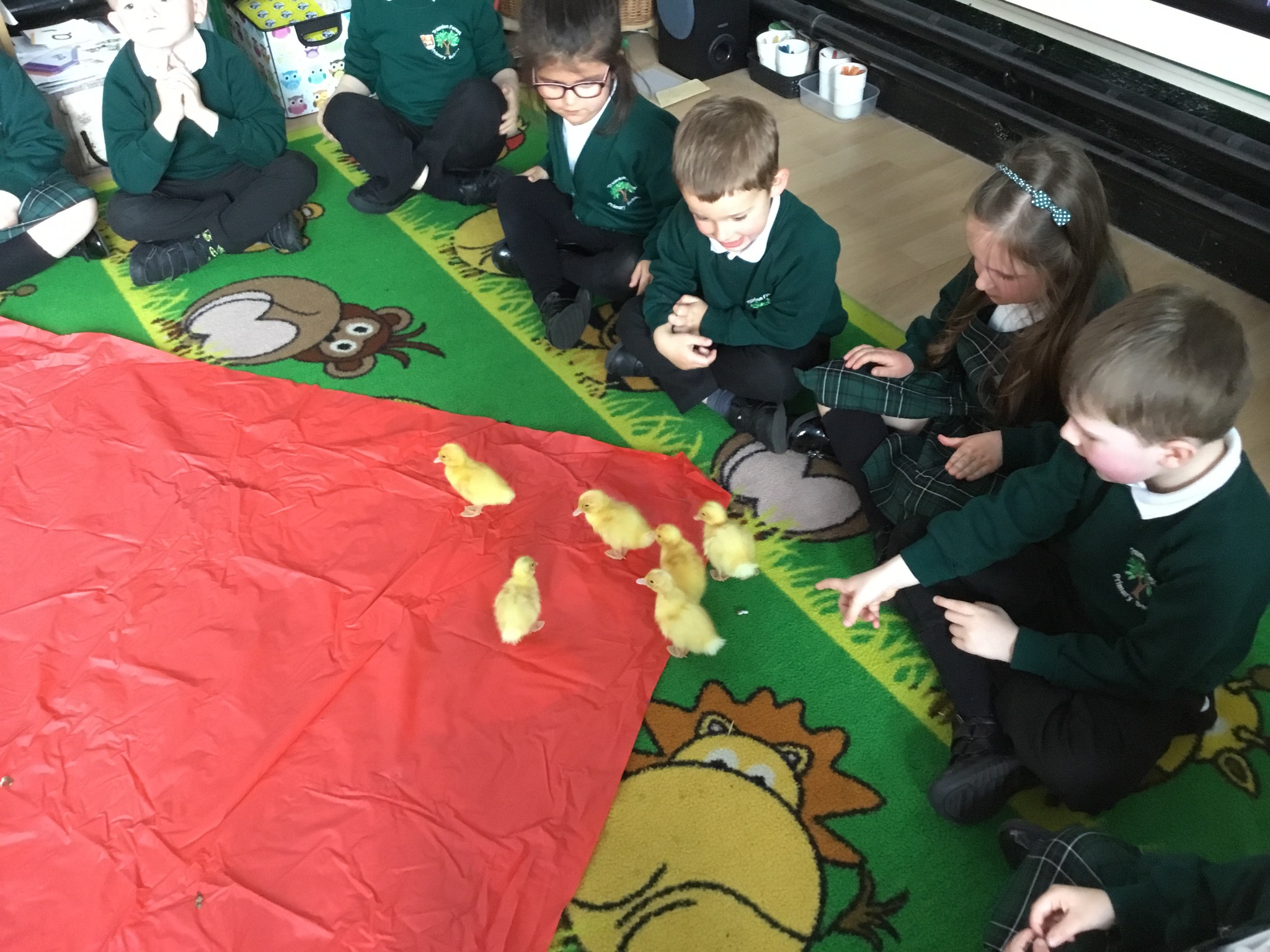 We put them on a mat for everyone to see and gave them names: Daisy, Dozy, Dizzy, Daffy, Digi and Dash. We talked about their feet, down and bills and were amazed at how they possibly fit inside the eggs.