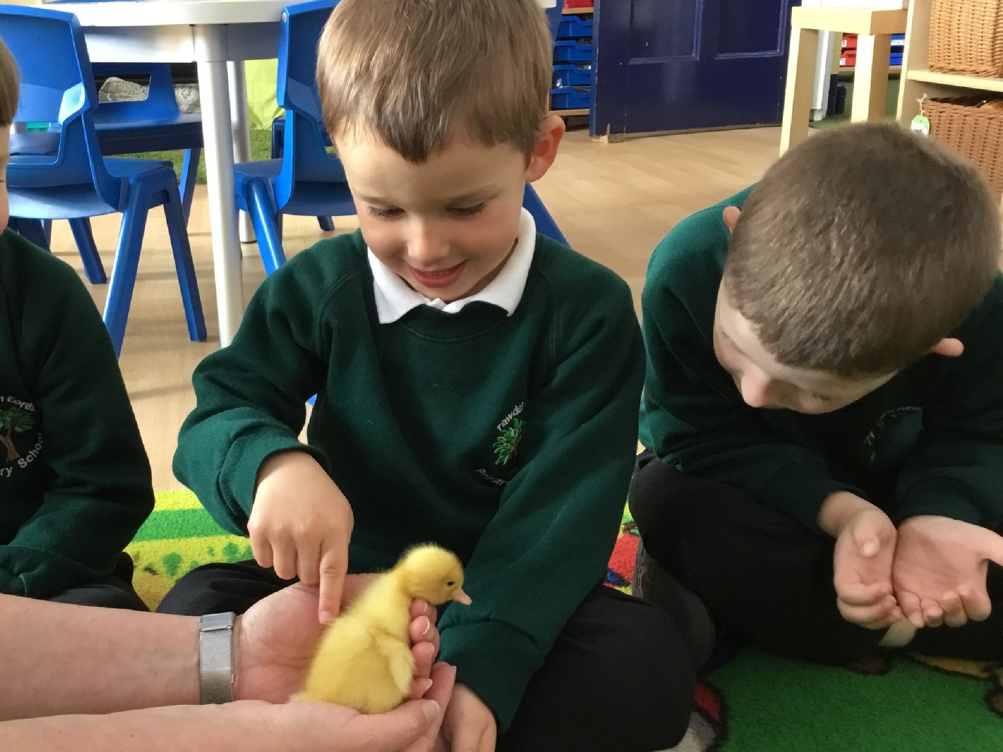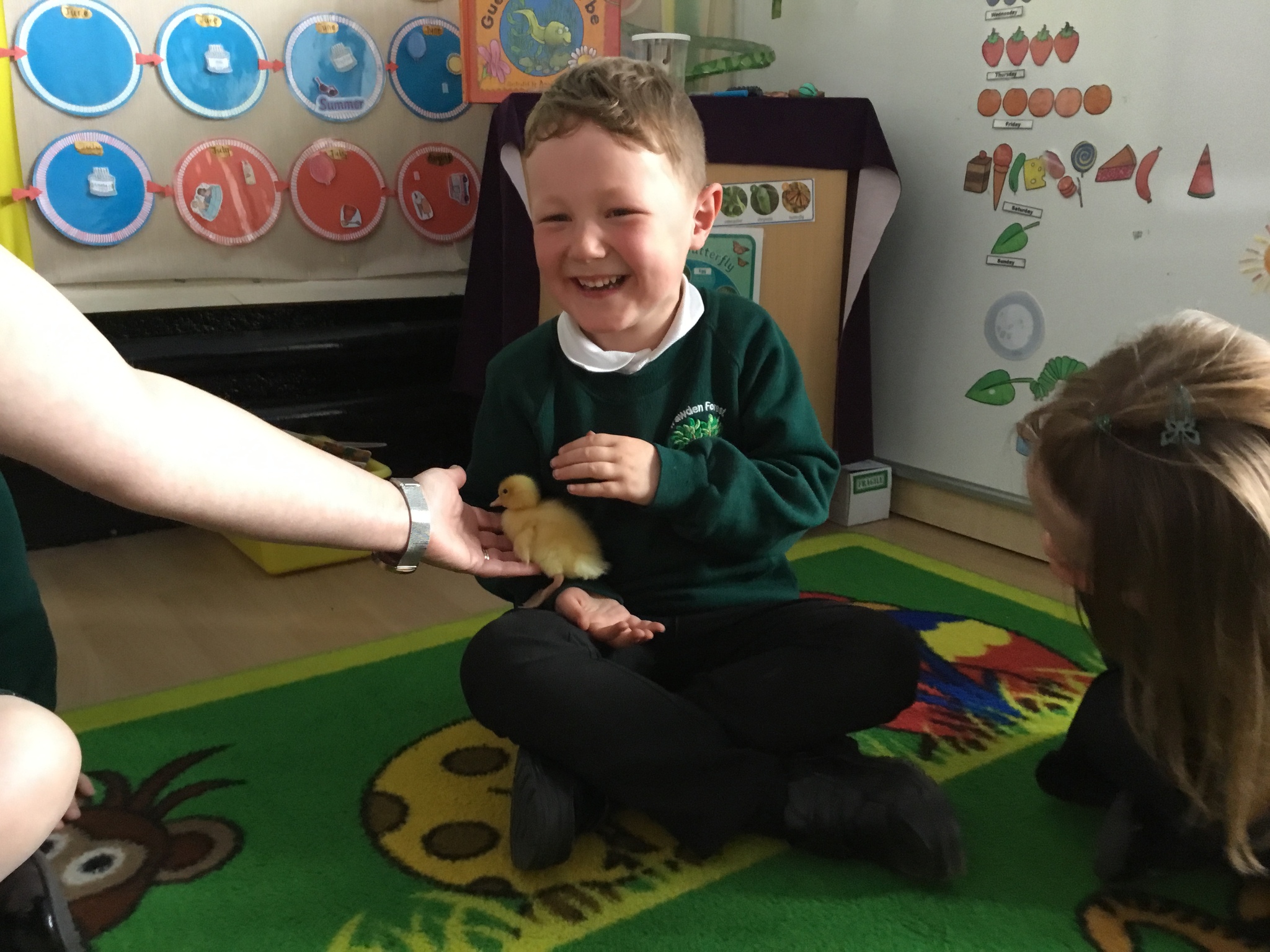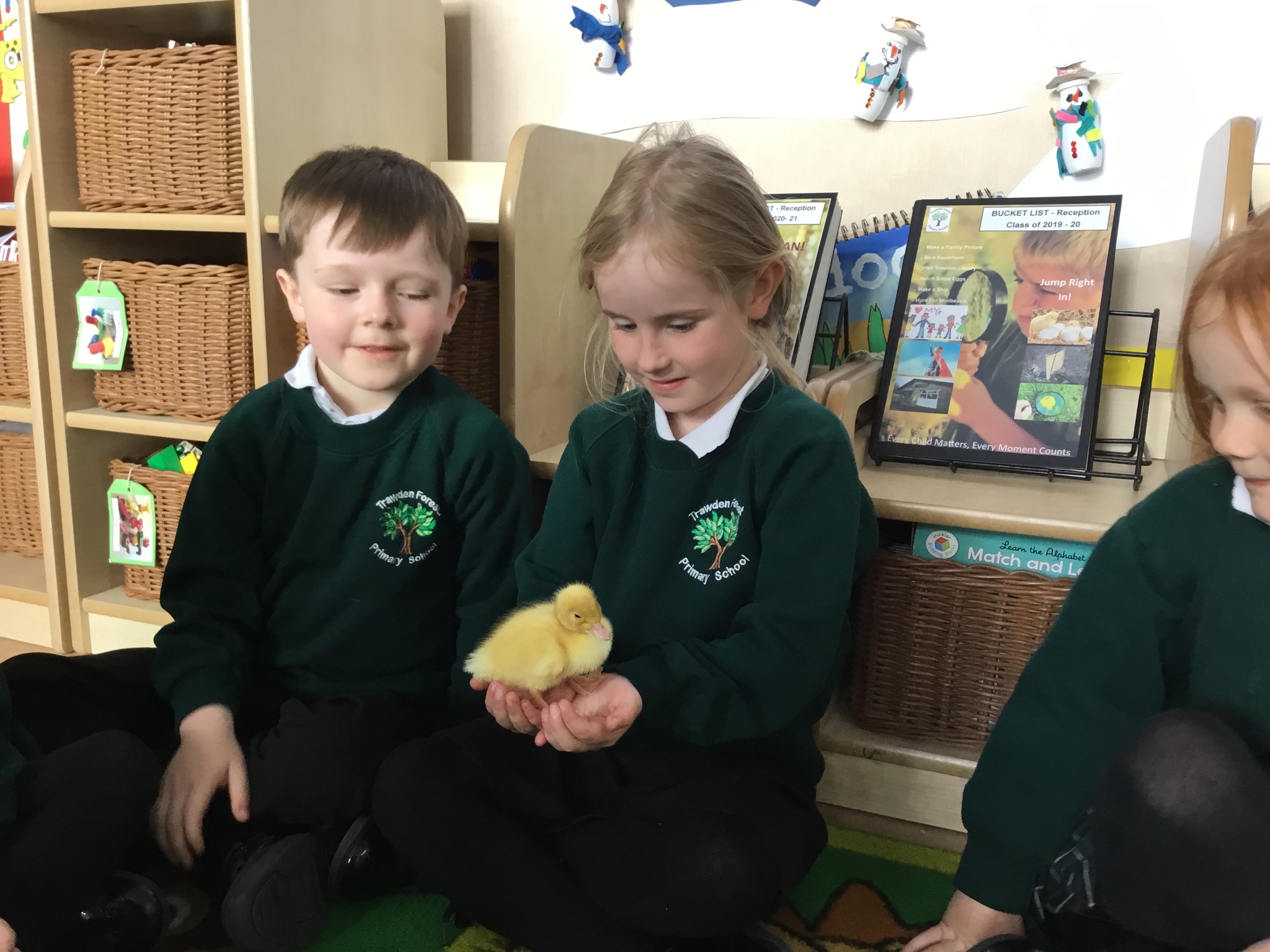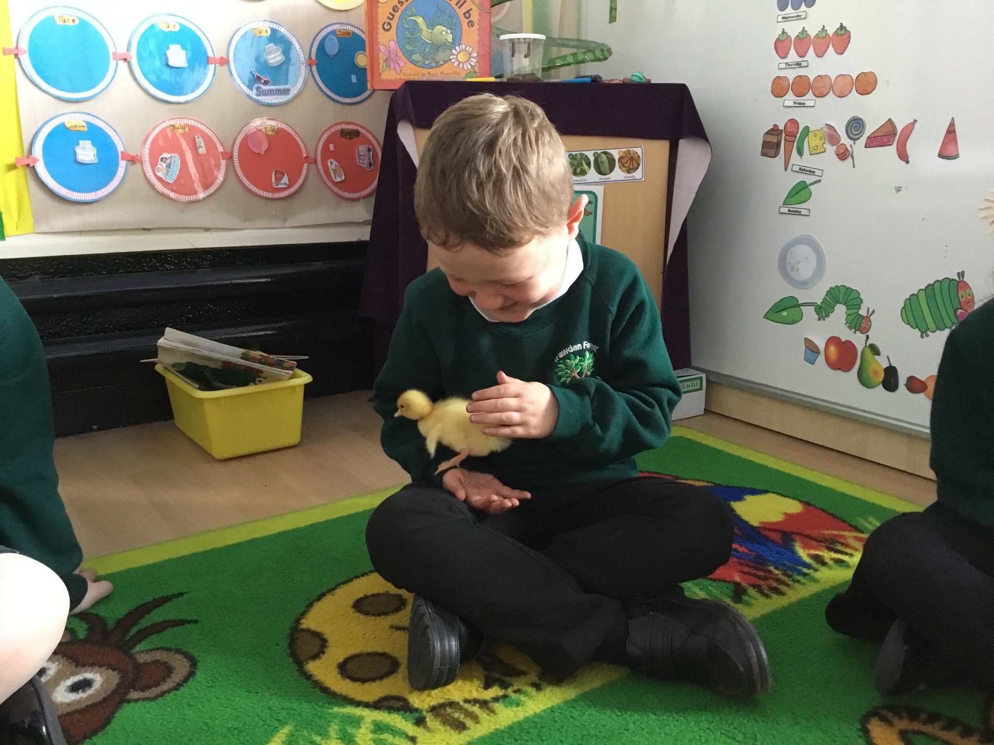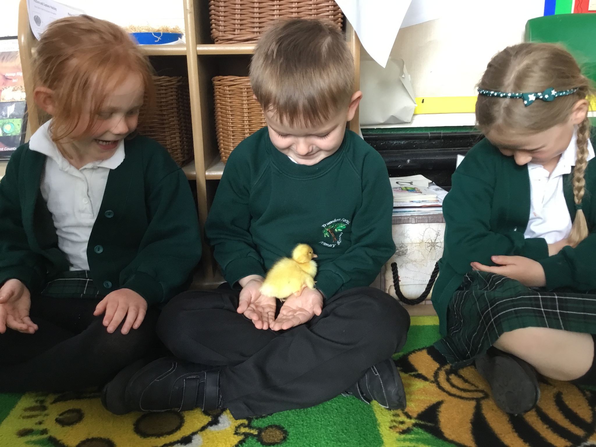 We put them on a mat for everyone to see and gave them names: Daisy, Dozy, Dizzy, Daffy, Digi and Dash. We talked about their feet, down and bills and were amazed at how they possibly fit inside the eggs.