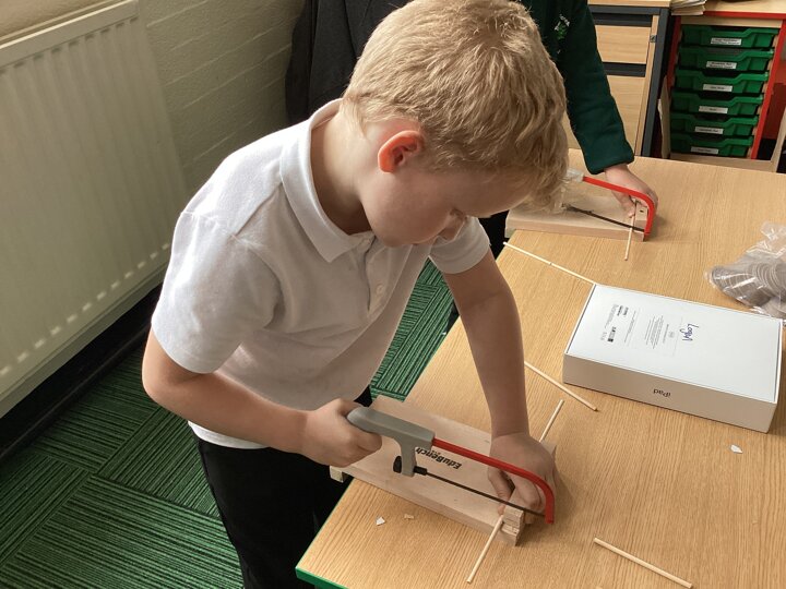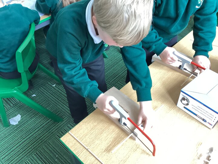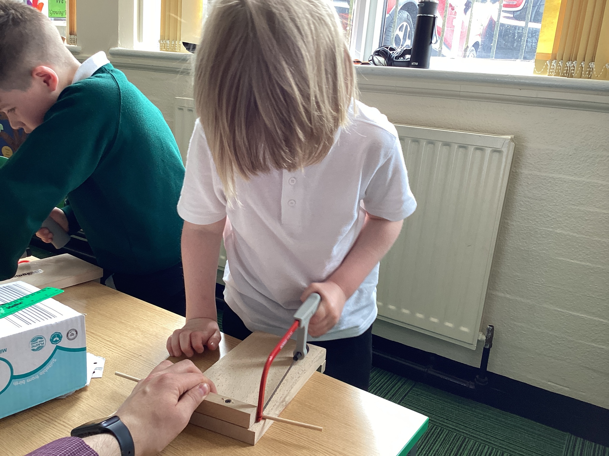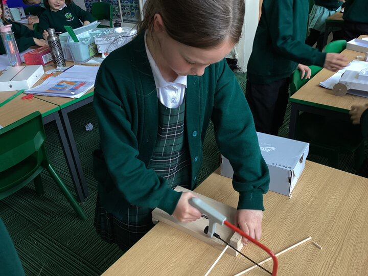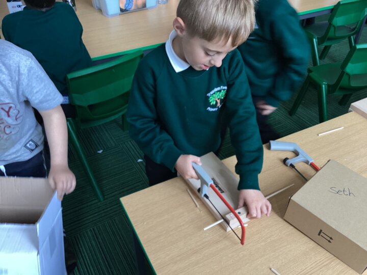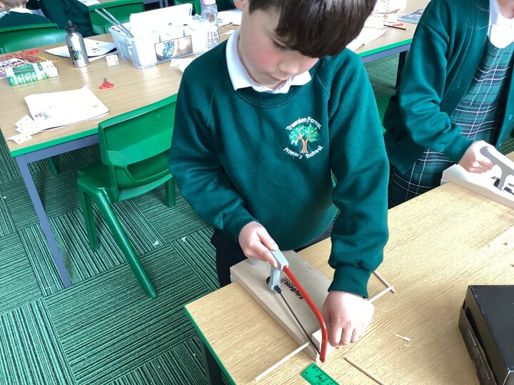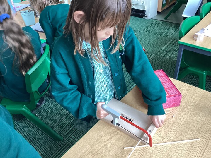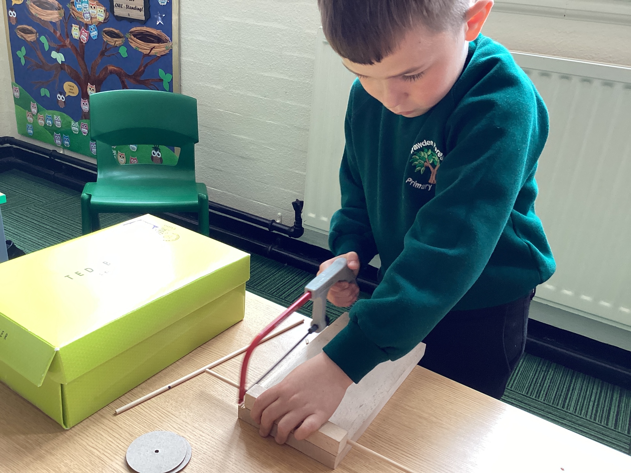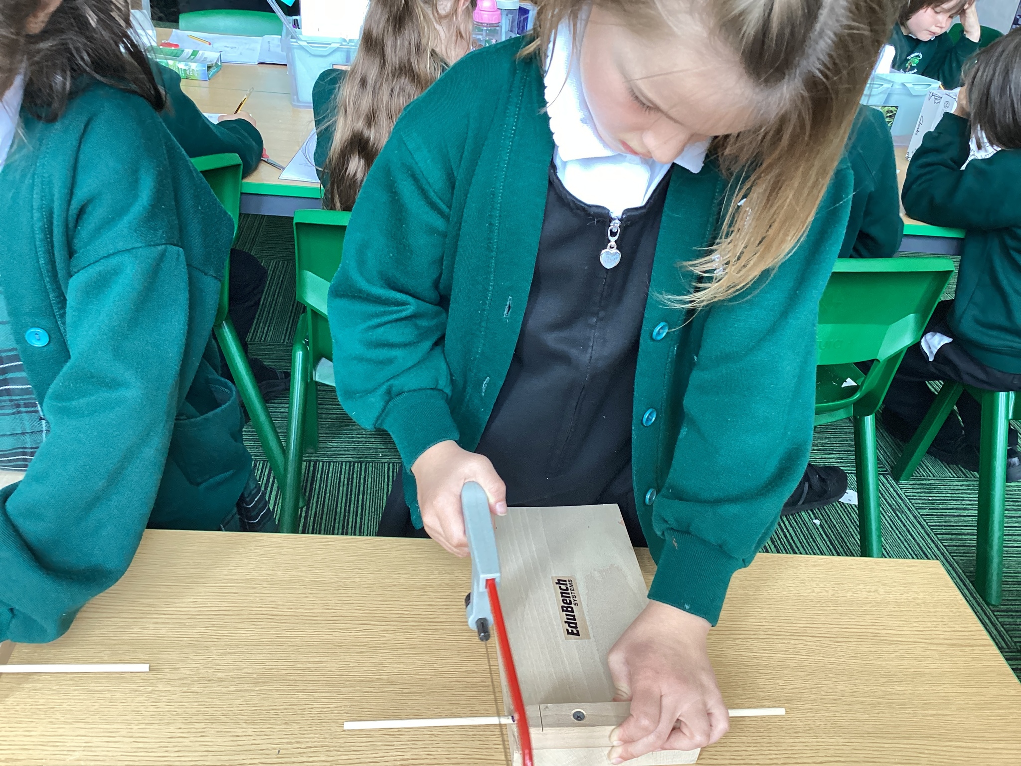 Today, we began making them. We had to cut out specific lengths to attach our axles, glue them to our vehicle and safely use a junior hacksaw to cut the dowel rod to the correct size for our axles.
