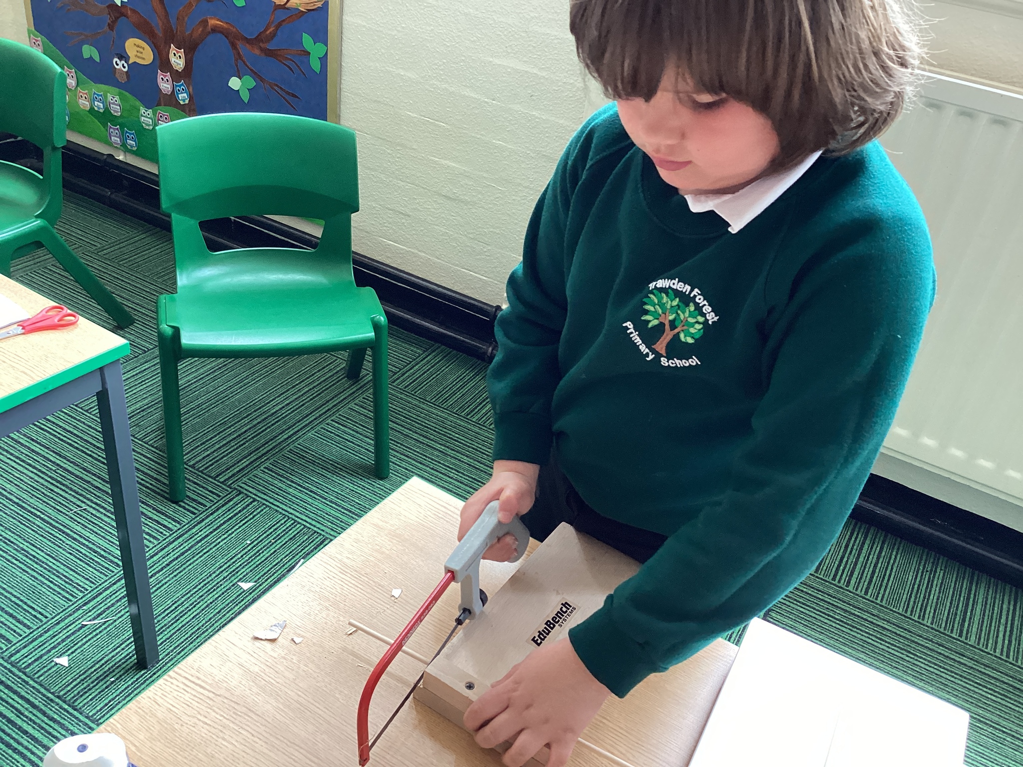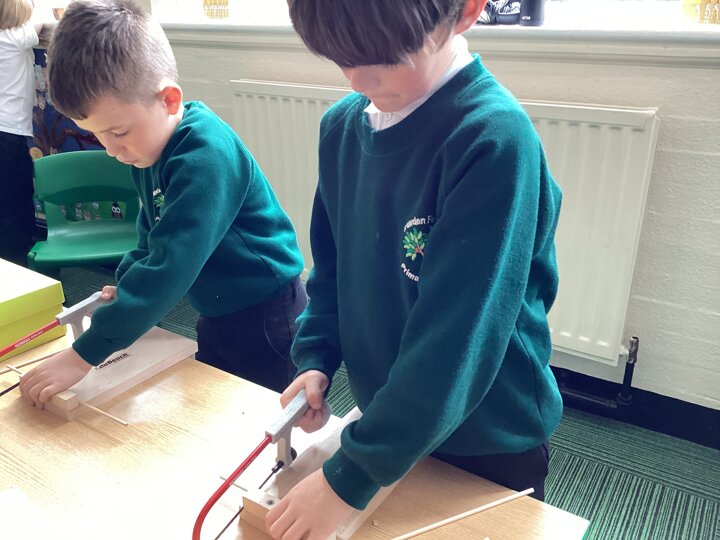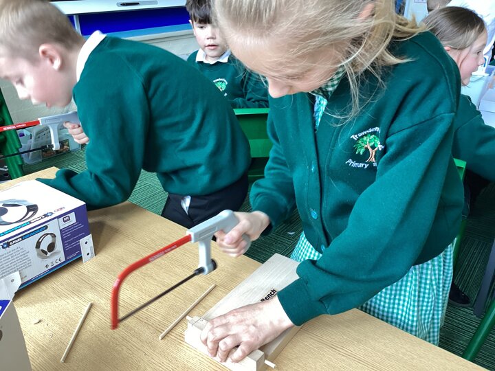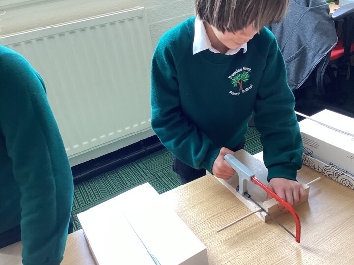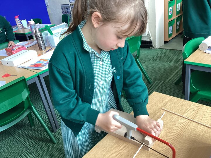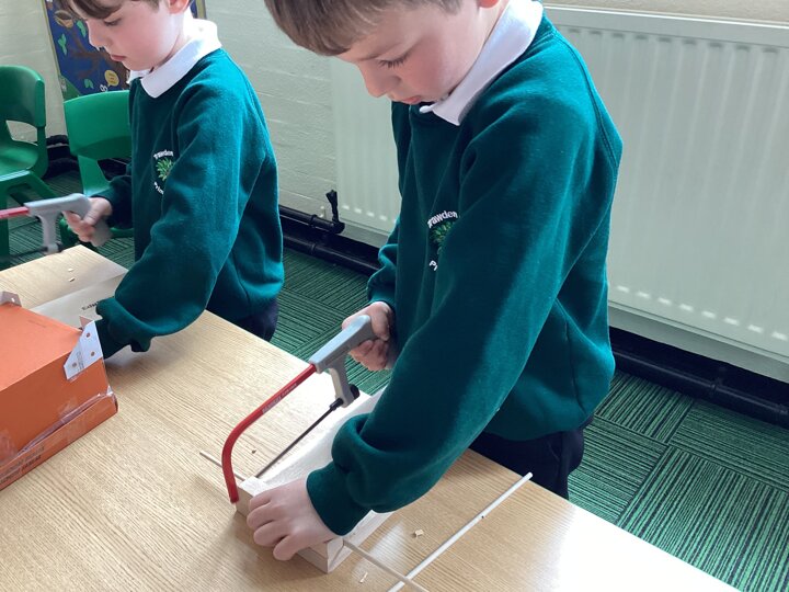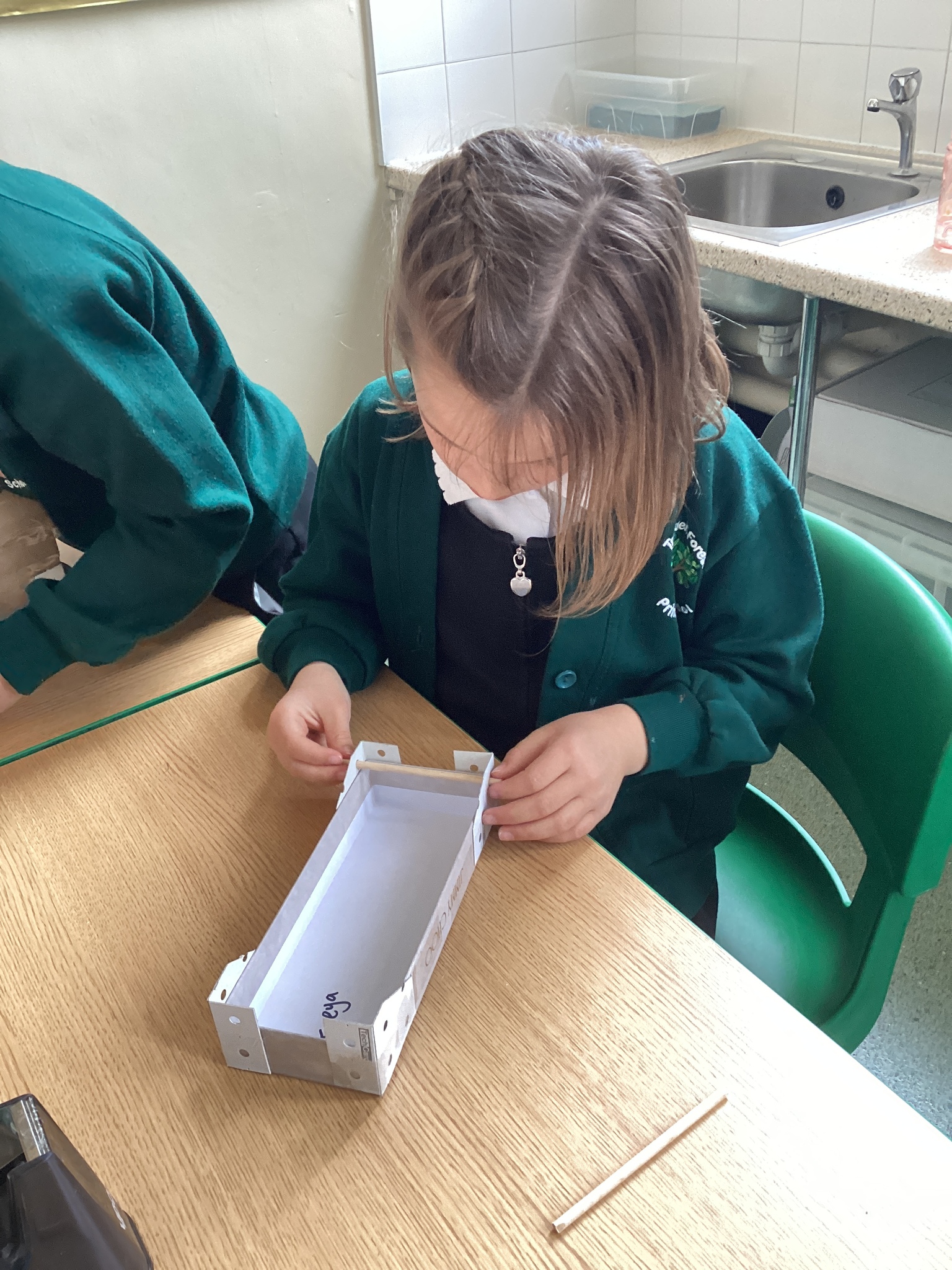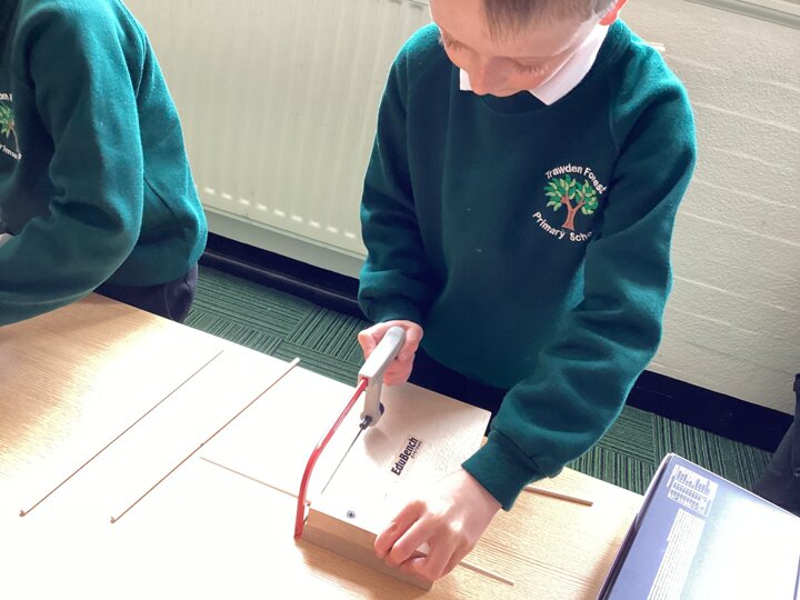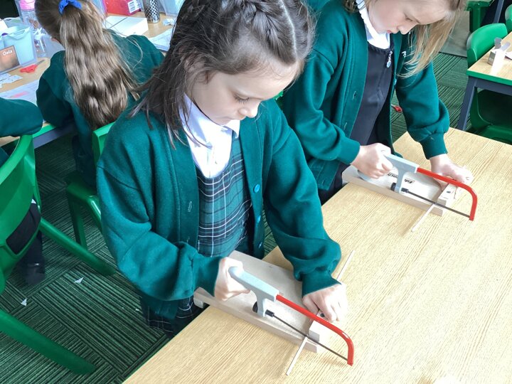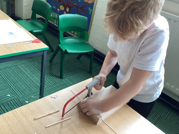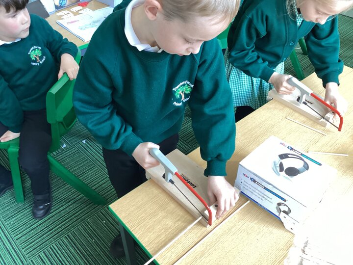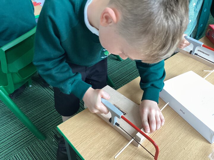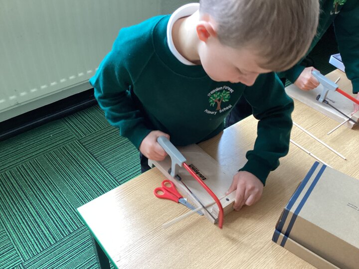 Today, we began making them. We had to cut out specific lengths to attach our axles, glue them to our vehicle and safely use a junior hacksaw to cut the dowel rod to the correct size for our axles.