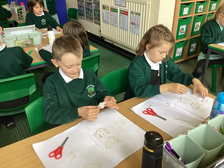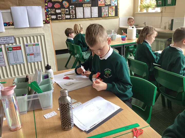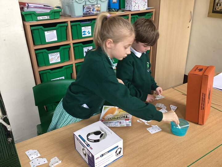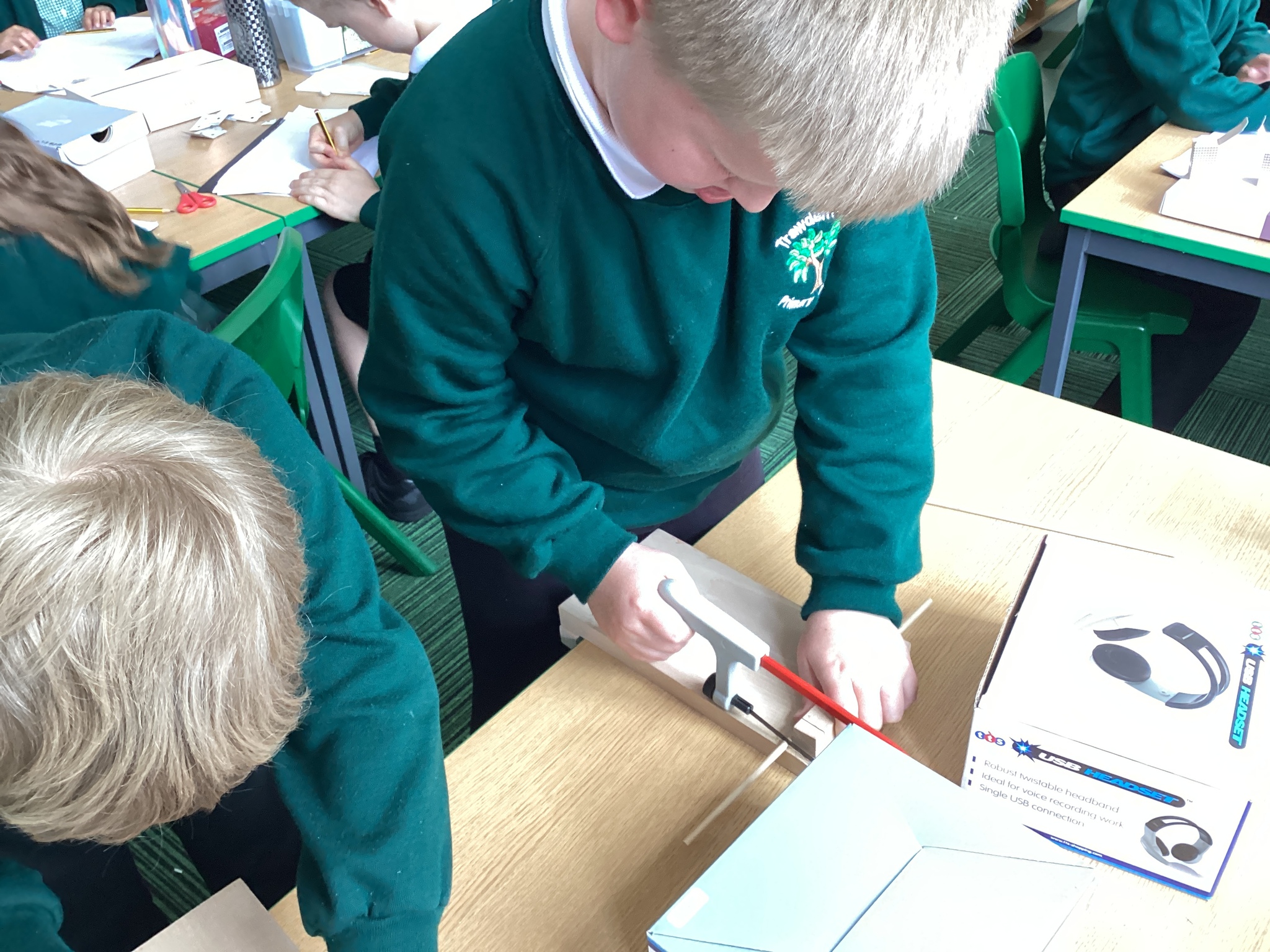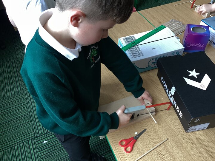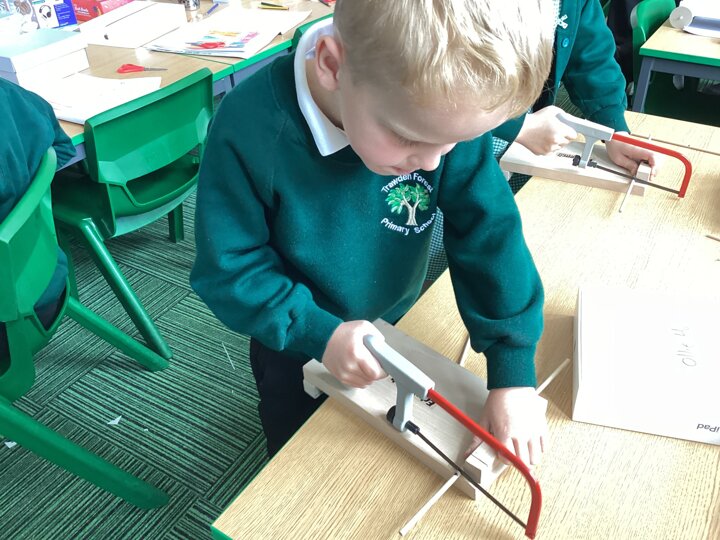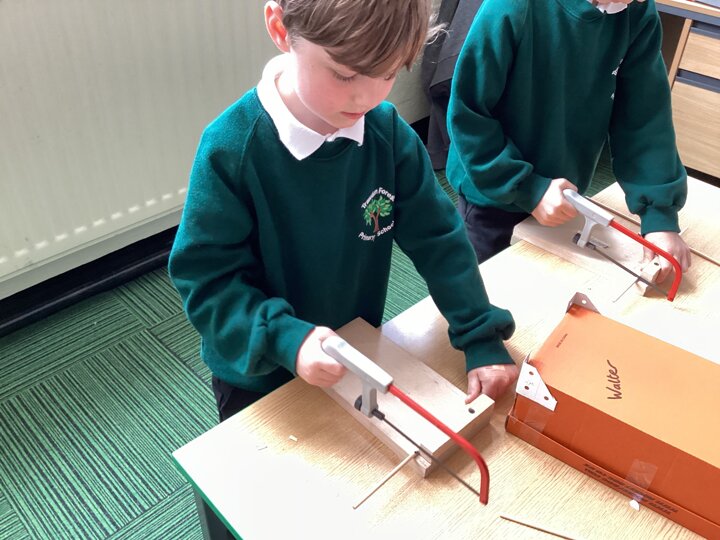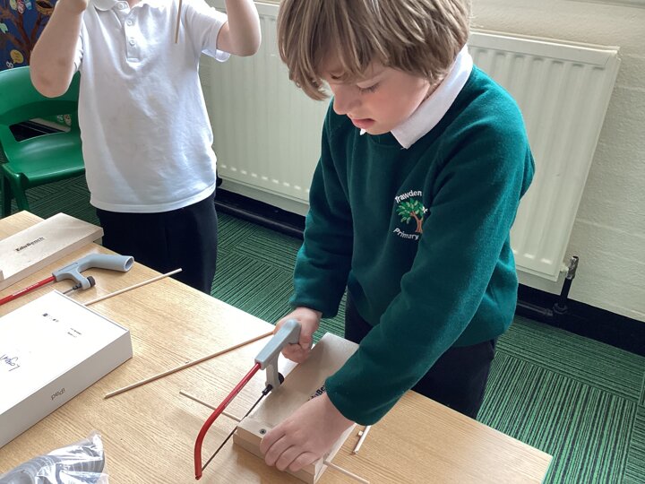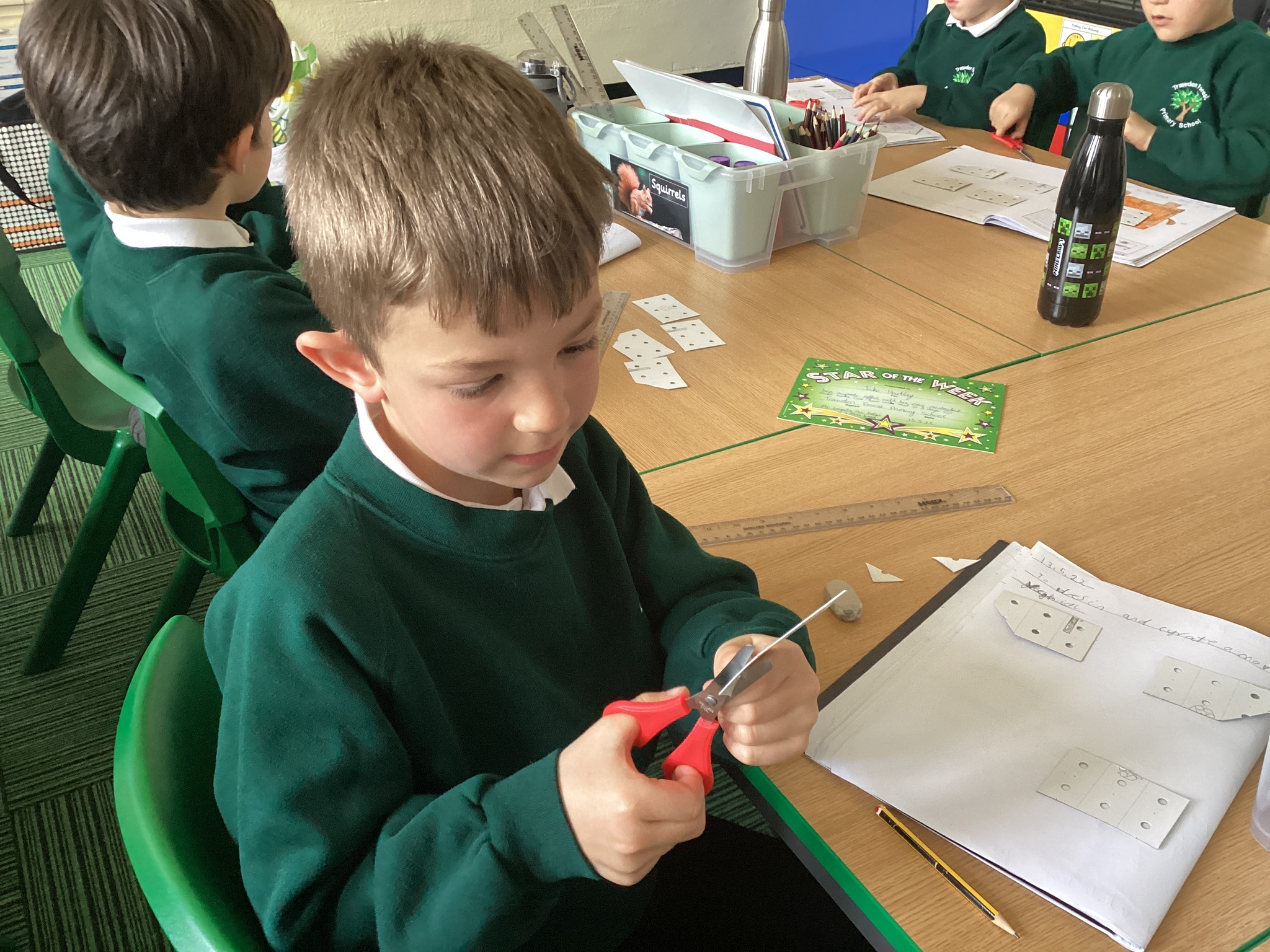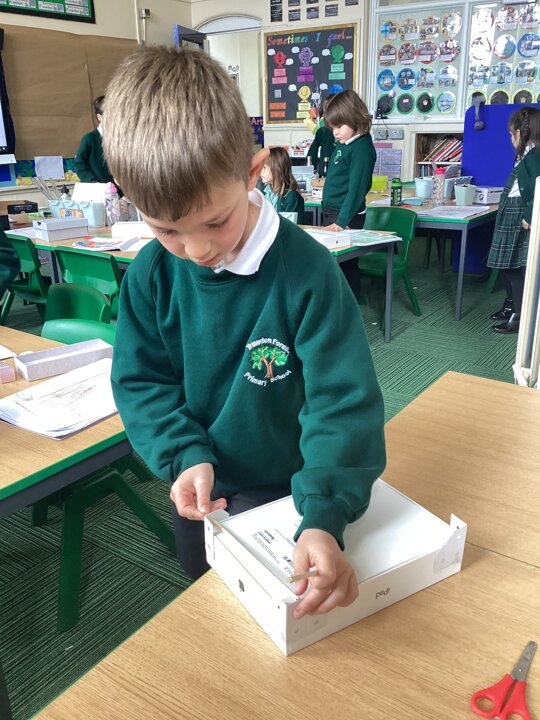 Today, we began making them. We had to cut out specific lengths to attach our axles, glue them to our vehicle and safely use a junior hacksaw to cut the dowel rod to the correct size for our axles.