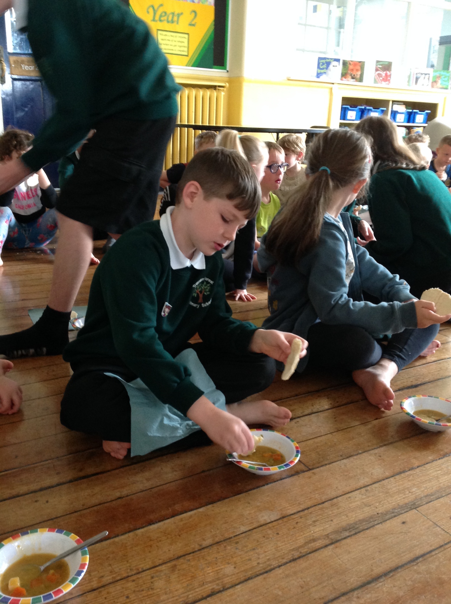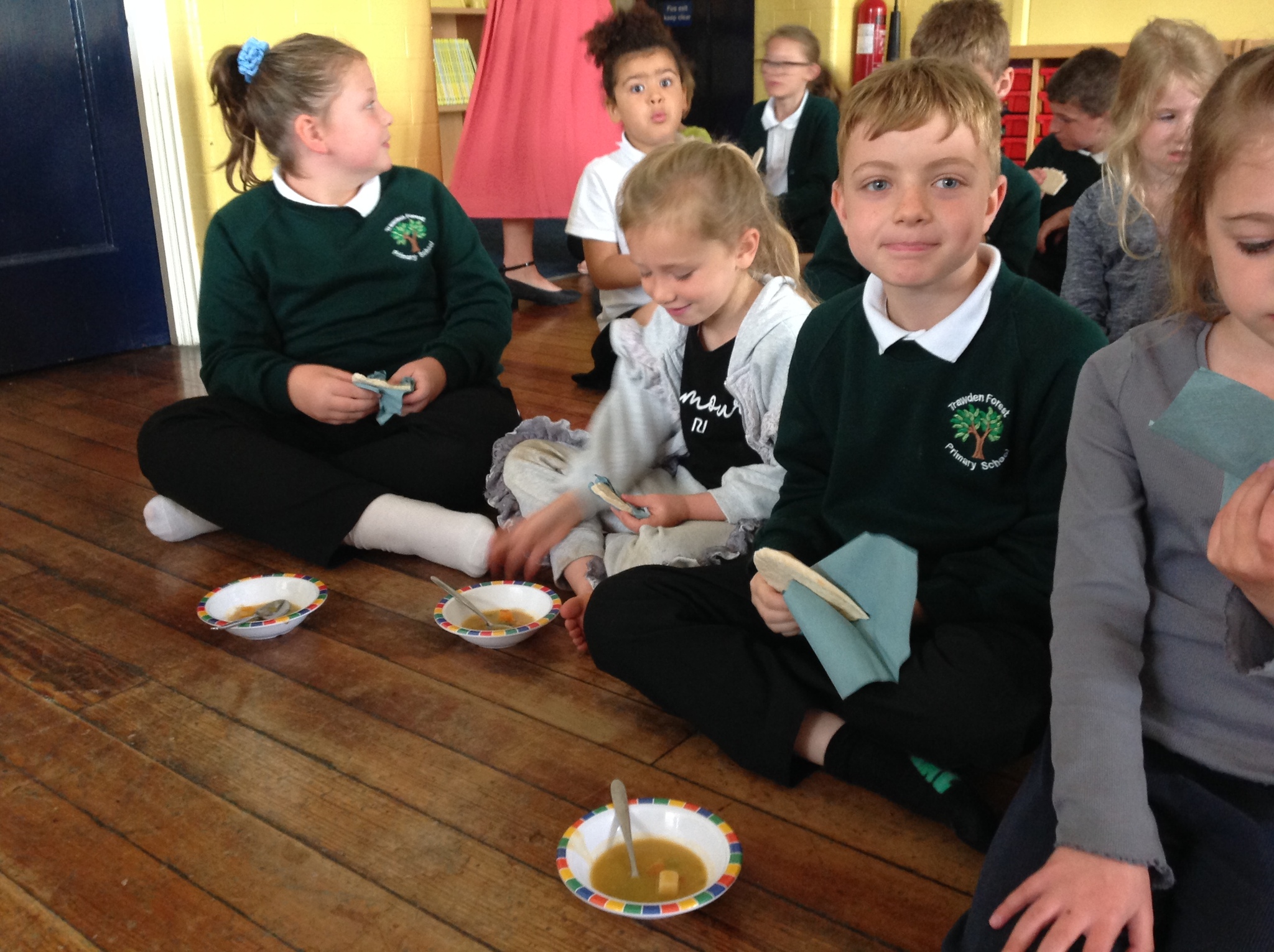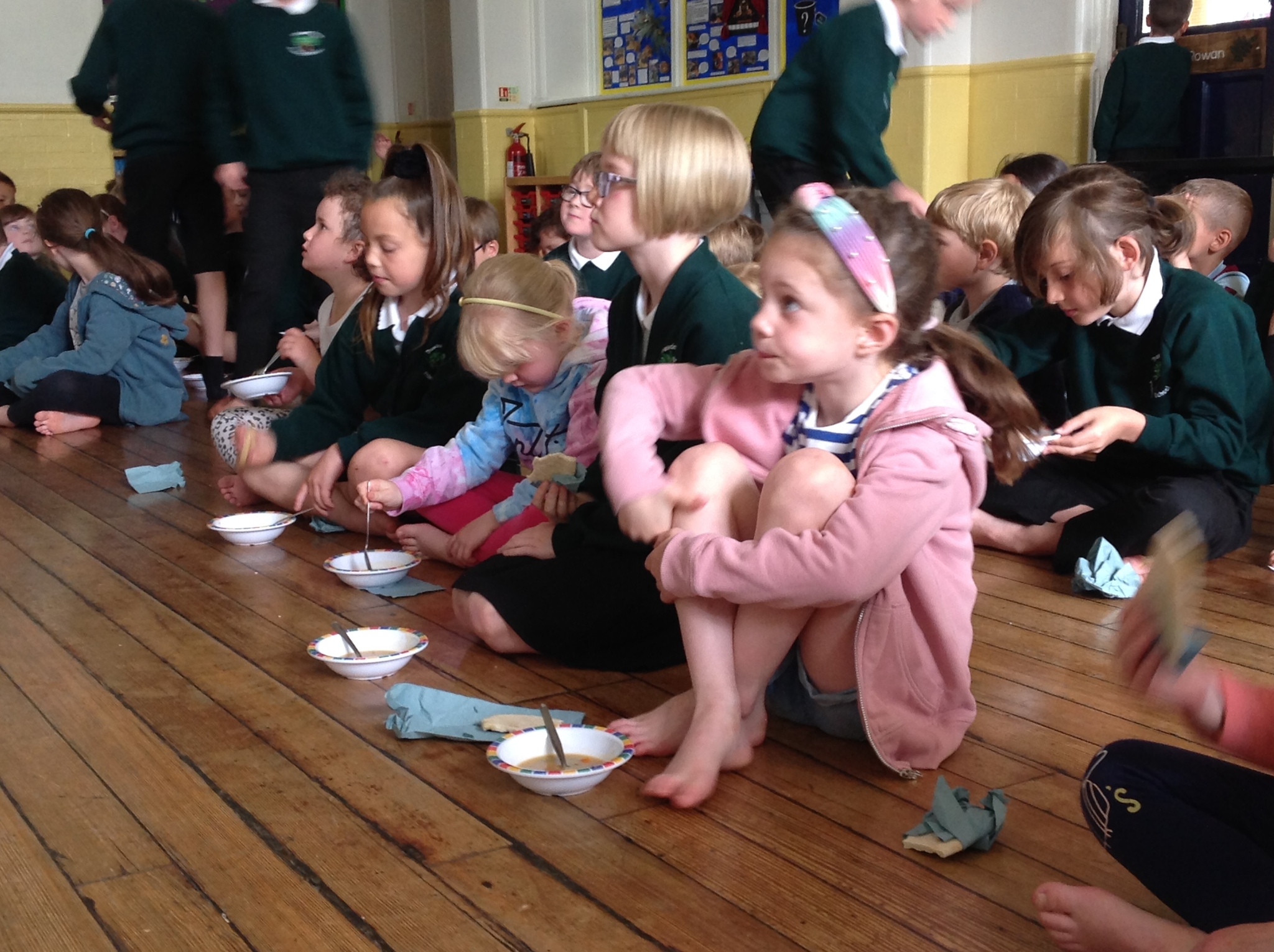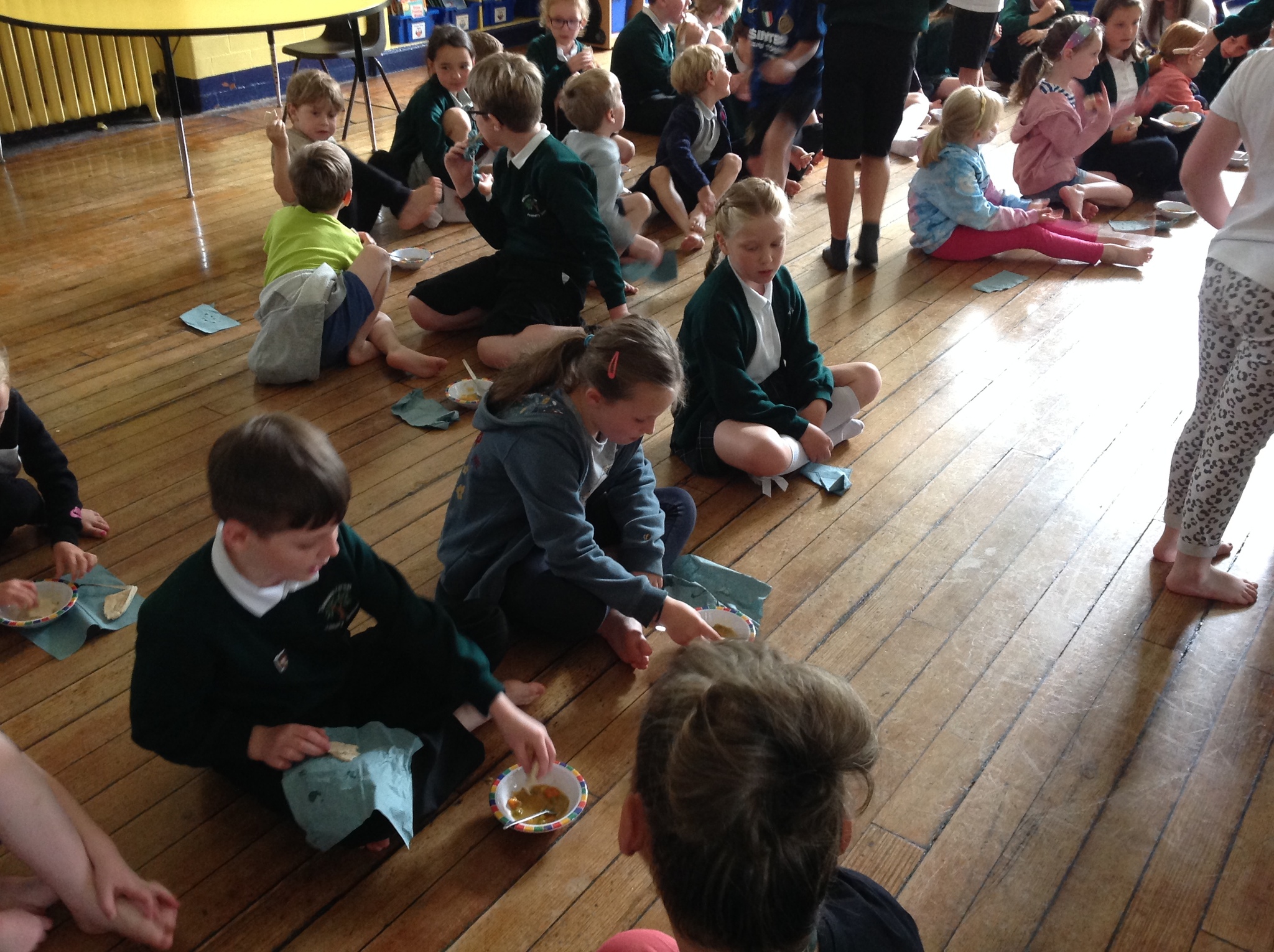 Year 1 have been learning about the Sikh religion. They have learned that Sikhs believe that serving one another is vey important. They have langar meals in their Gurudwara, where all people regardless of age, gender or religion are welcome and they serve a langar meal which is free to all. Year 1 invited Year 4 to join them in the langar meal. They sat in rows on the floor and ate soup and pitta. "Sharing is good and we can serve each other." Y1 child