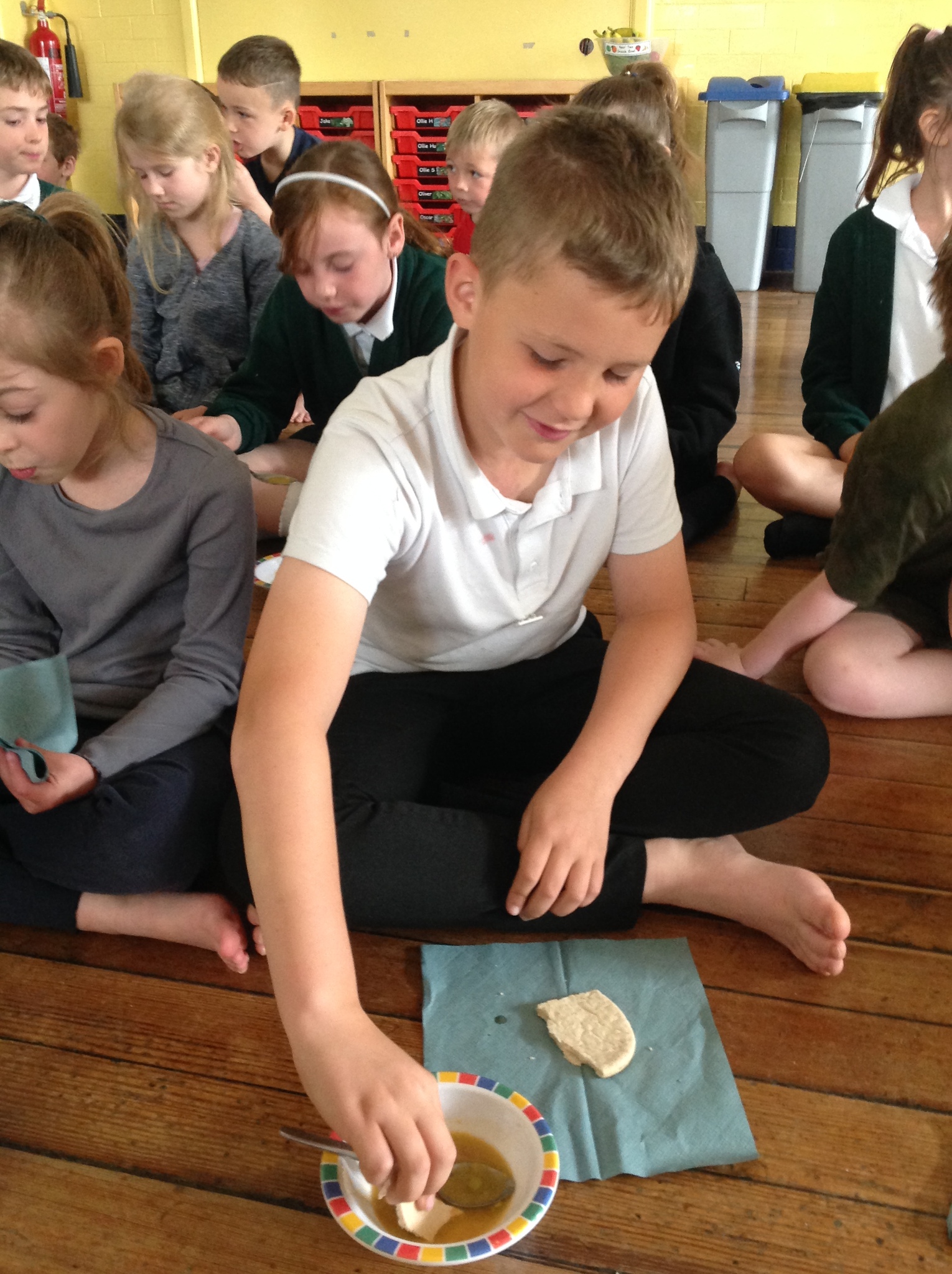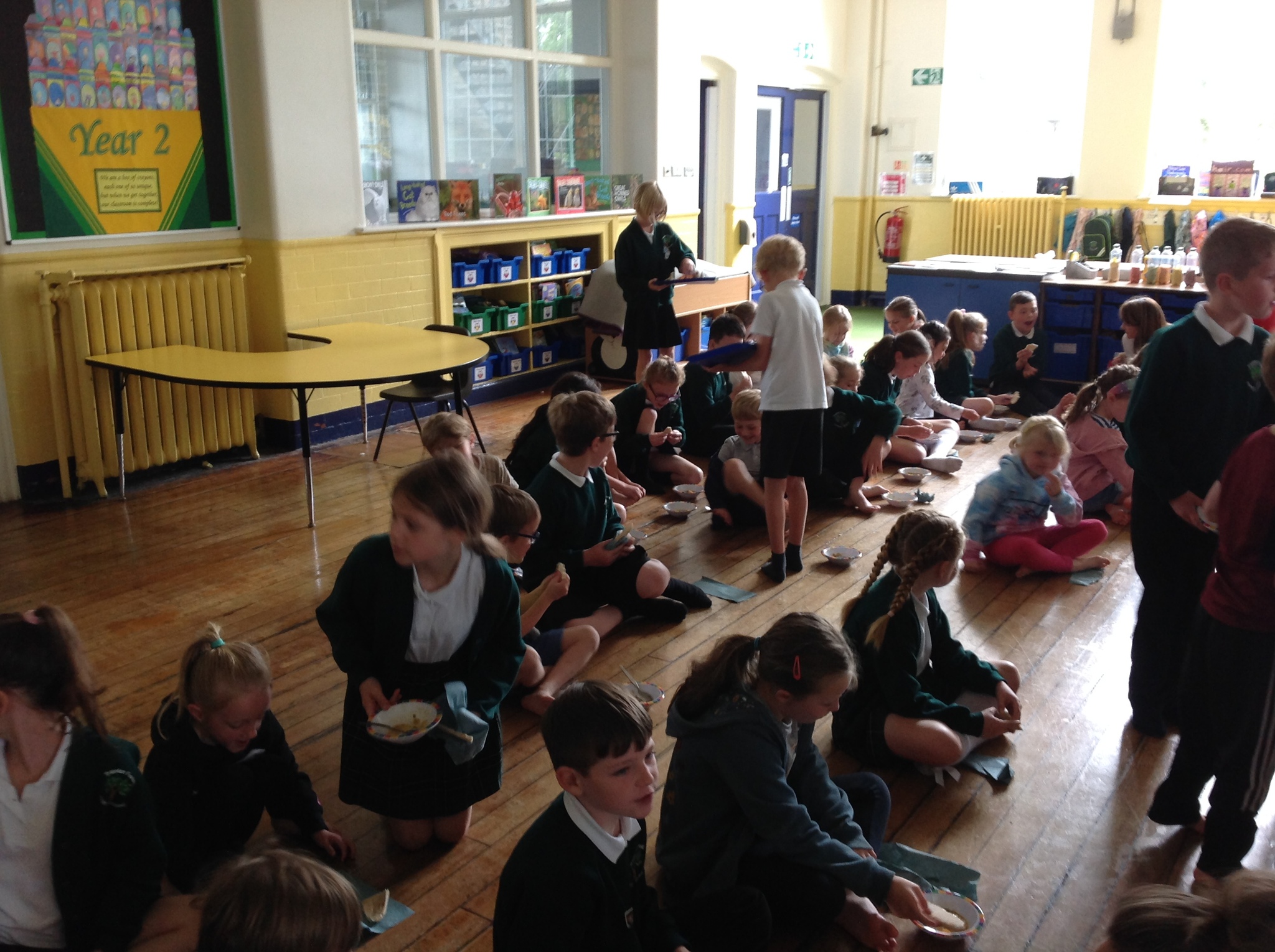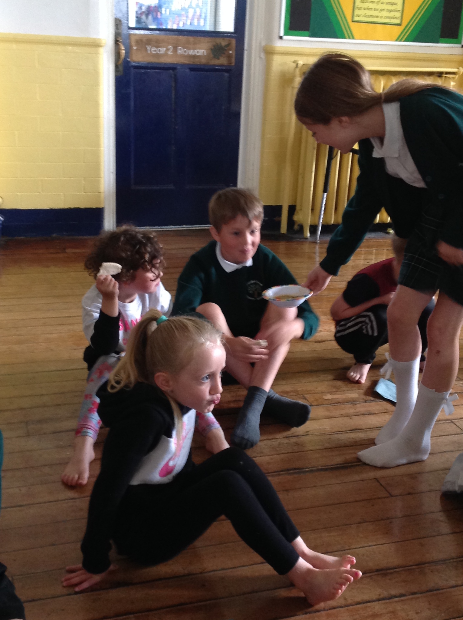 Year 1 have been learning about the Sikh religion. They have learned that Sikhs believe that serving one another is vey important. They have langar meals in their Gurudwara, where all people regardless of age, gender or religion are welcome and they serve a langar meal which is free to all. Year 1 invited Year 4 to join them in the langar meal. They sat in rows on the floor and ate soup and pitta. "Sharing is good and we can serve each other." Y1 child