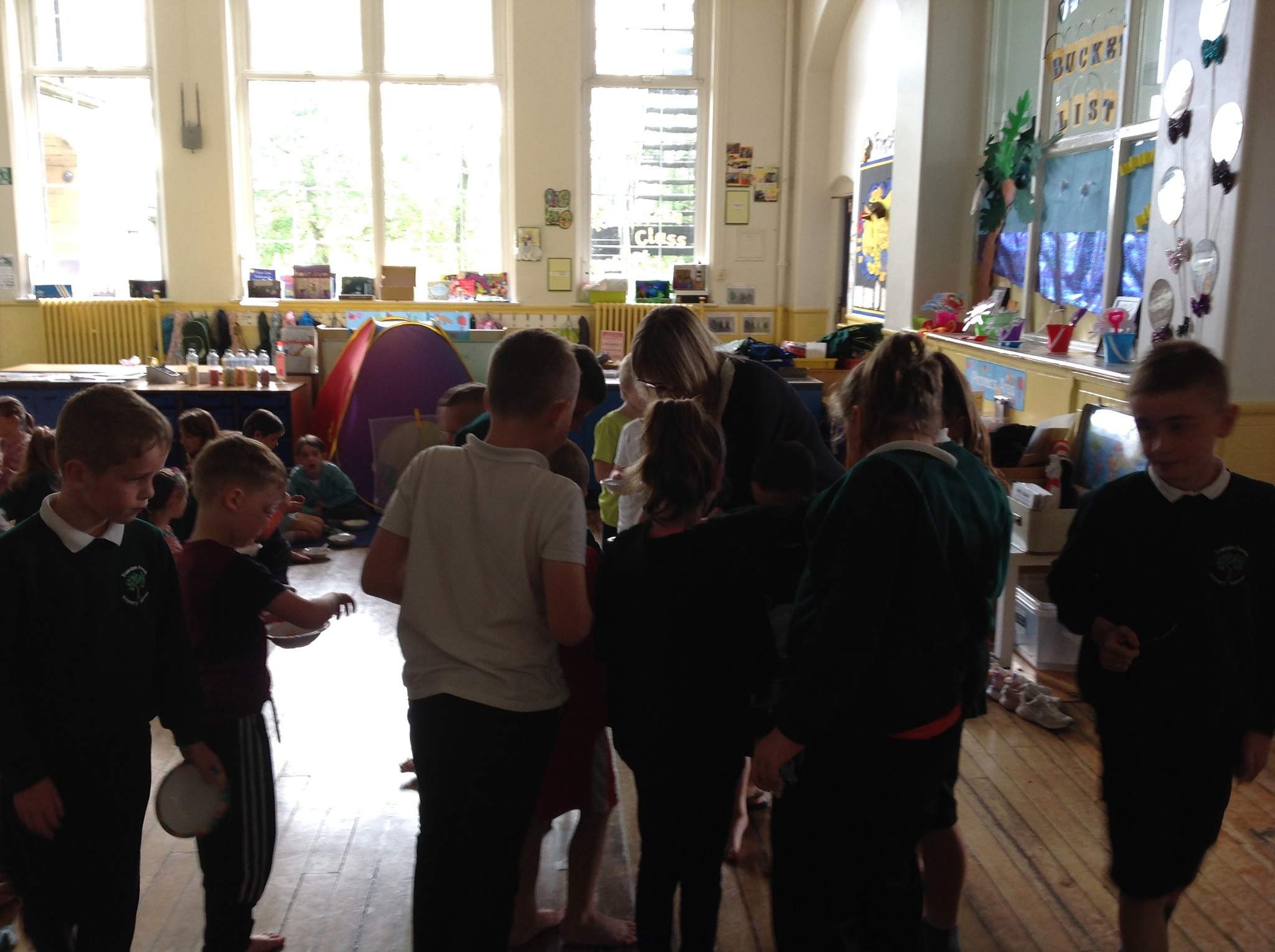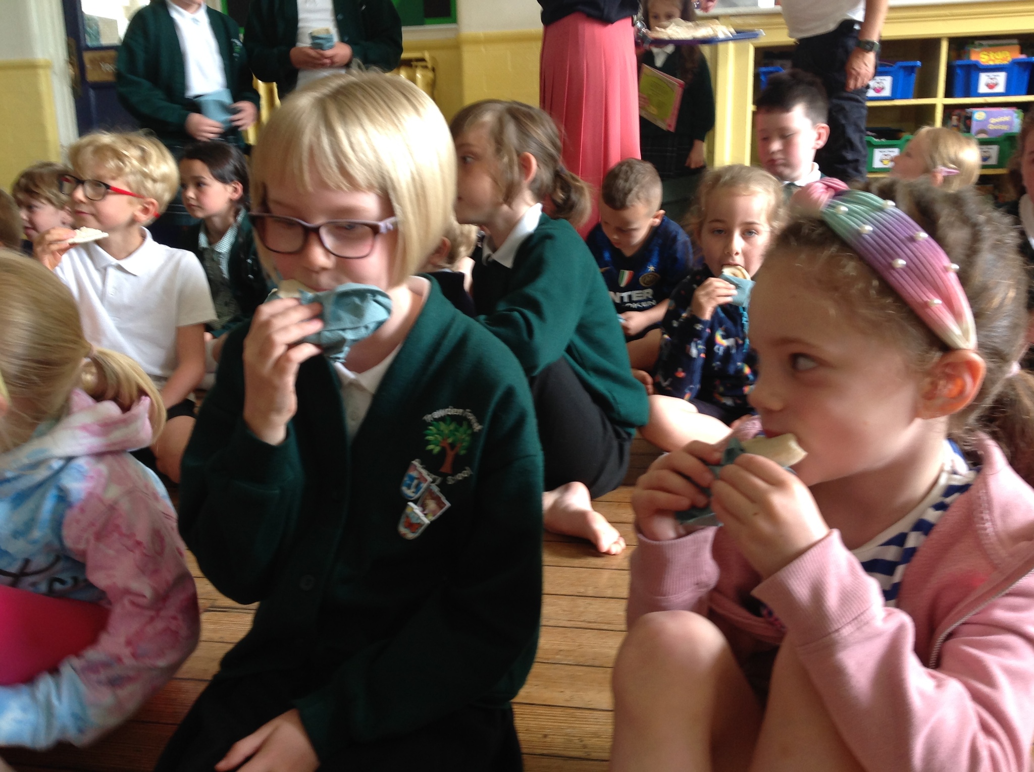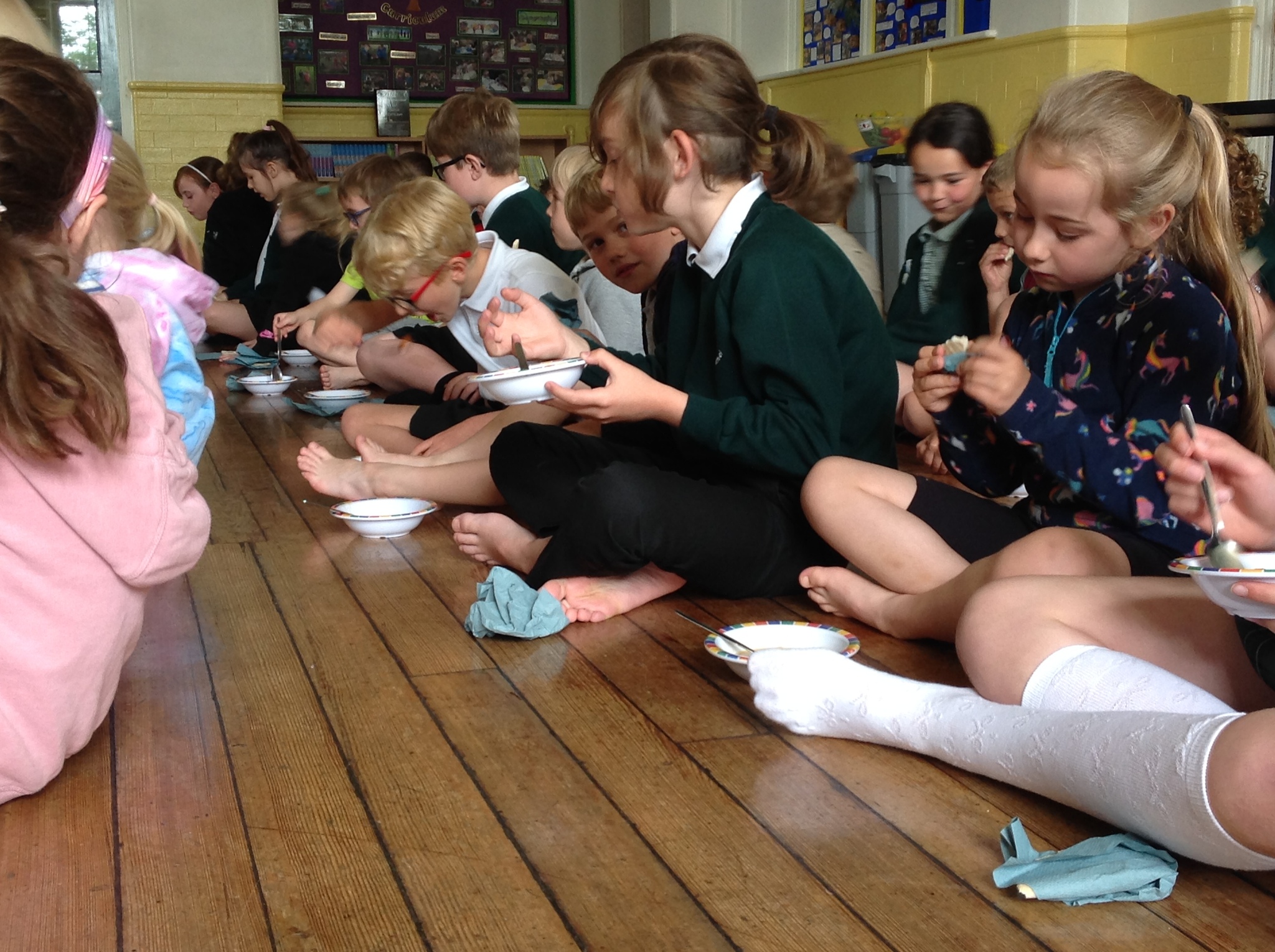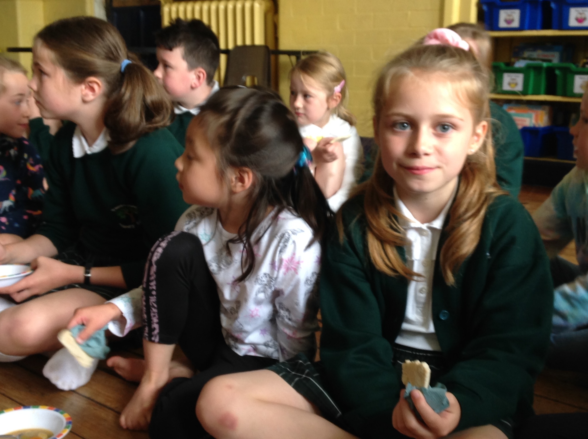 Year 1 have been learning about the Sikh religion. They have learned that Sikhs believe that serving one another is vey important. They have langar meals in their Gurudwara, where all people regardless of age, gender or religion are welcome and they serve a langar meal which is free to all. Year 1 invited Year 4 to join them in the langar meal. They sat in rows on the floor and ate soup and pitta. "Sharing is good and we can serve each other." Y1 child