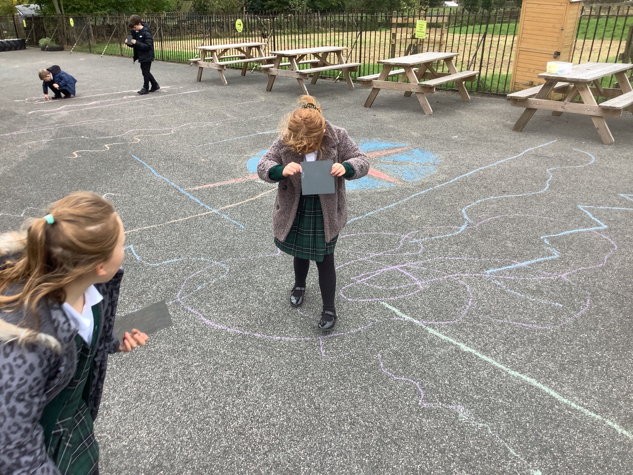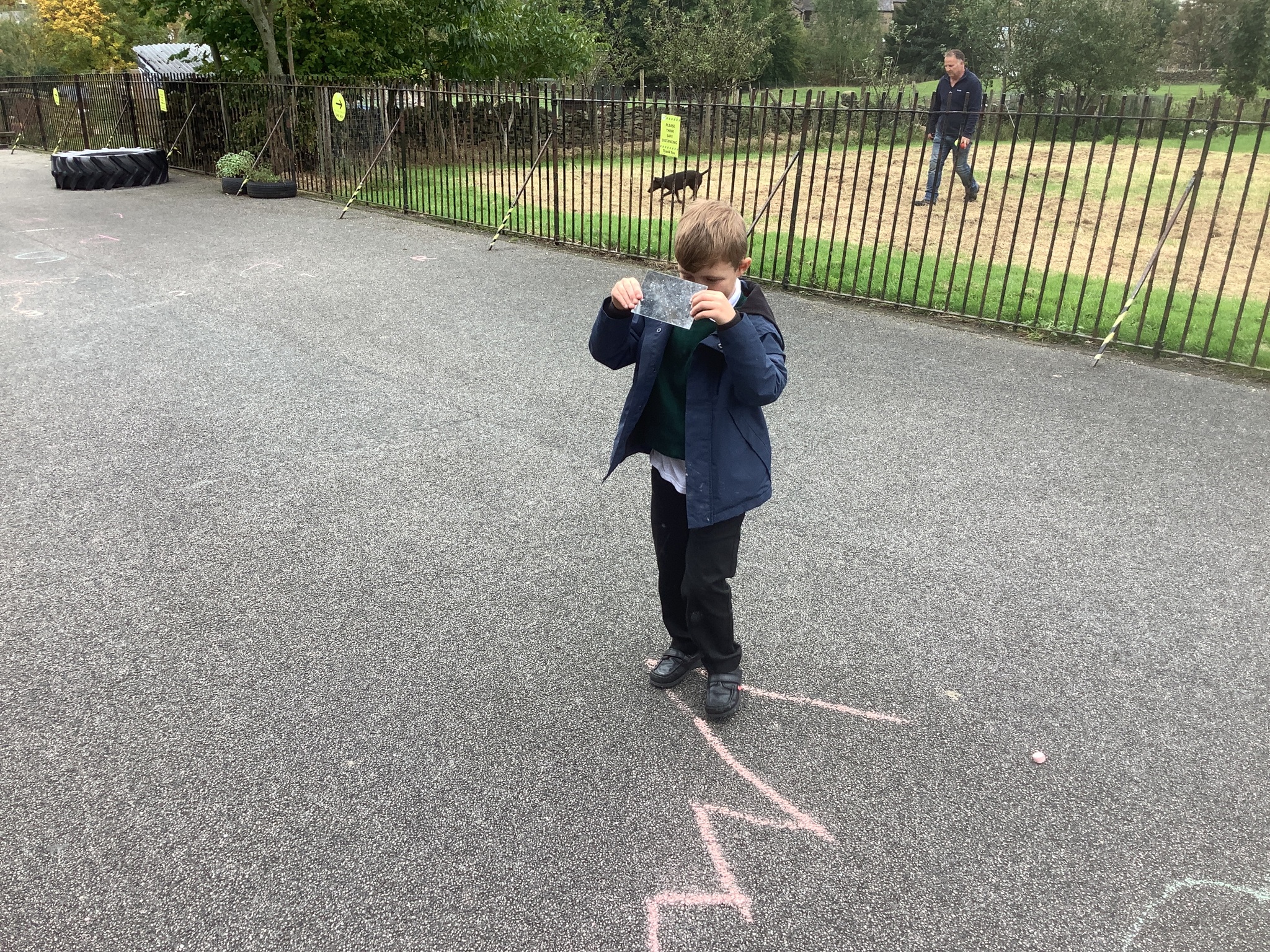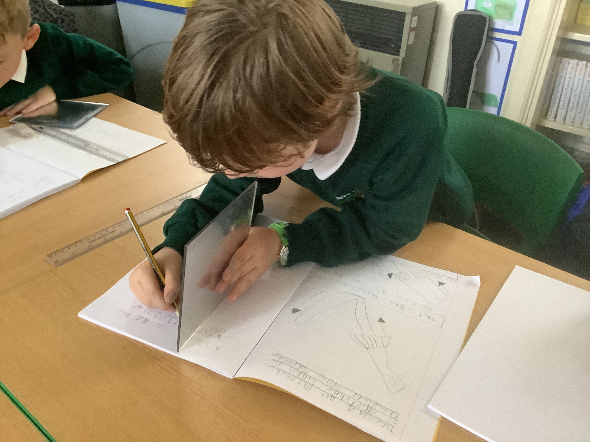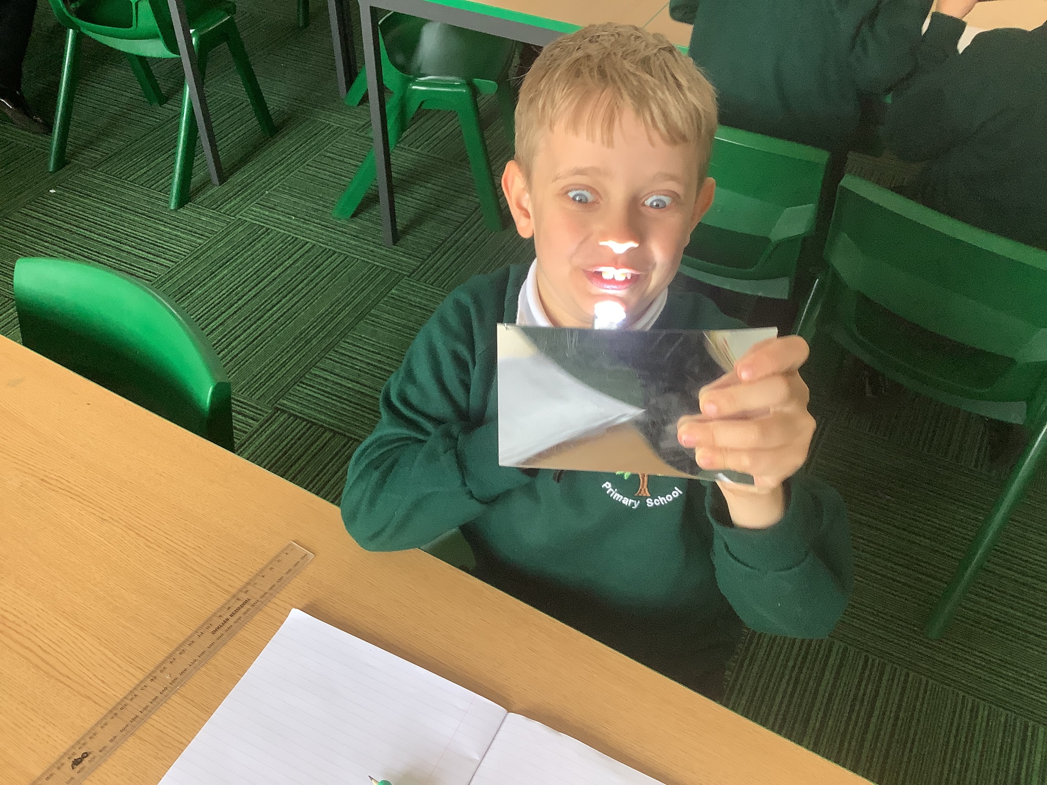 This afternoon, Year 3 had fun investigating how light is reflected from surfaces. They learnt that light is reflected better from smooth surfaces as the reflection is much clearer. On the playground, they experimented with following different lines using their mirror to reflect their line so that they could follow their lines using only the reflection in the mirror. Afterwards, they created messages which were backwards and used the mirror to reflect them the correct way.