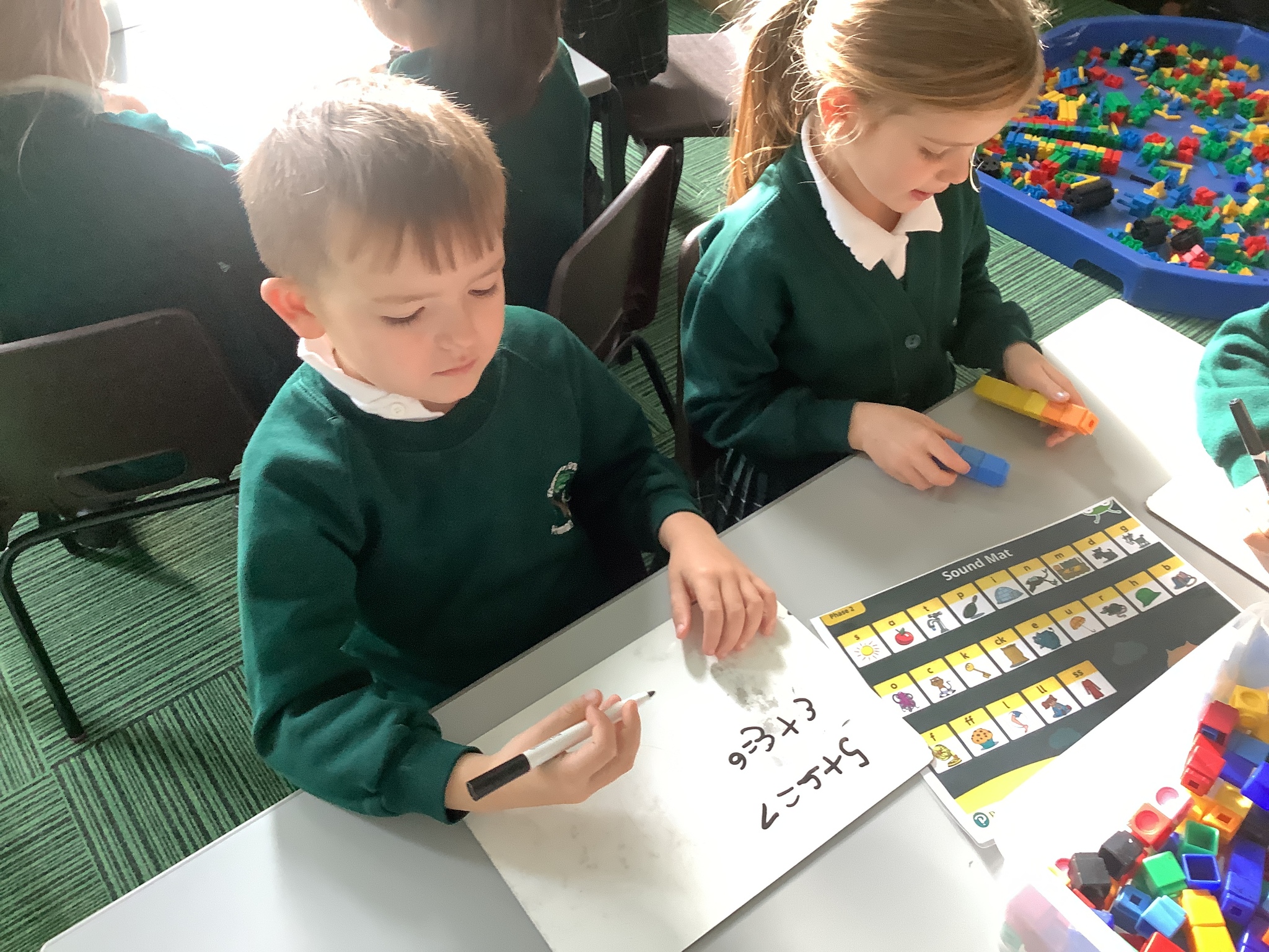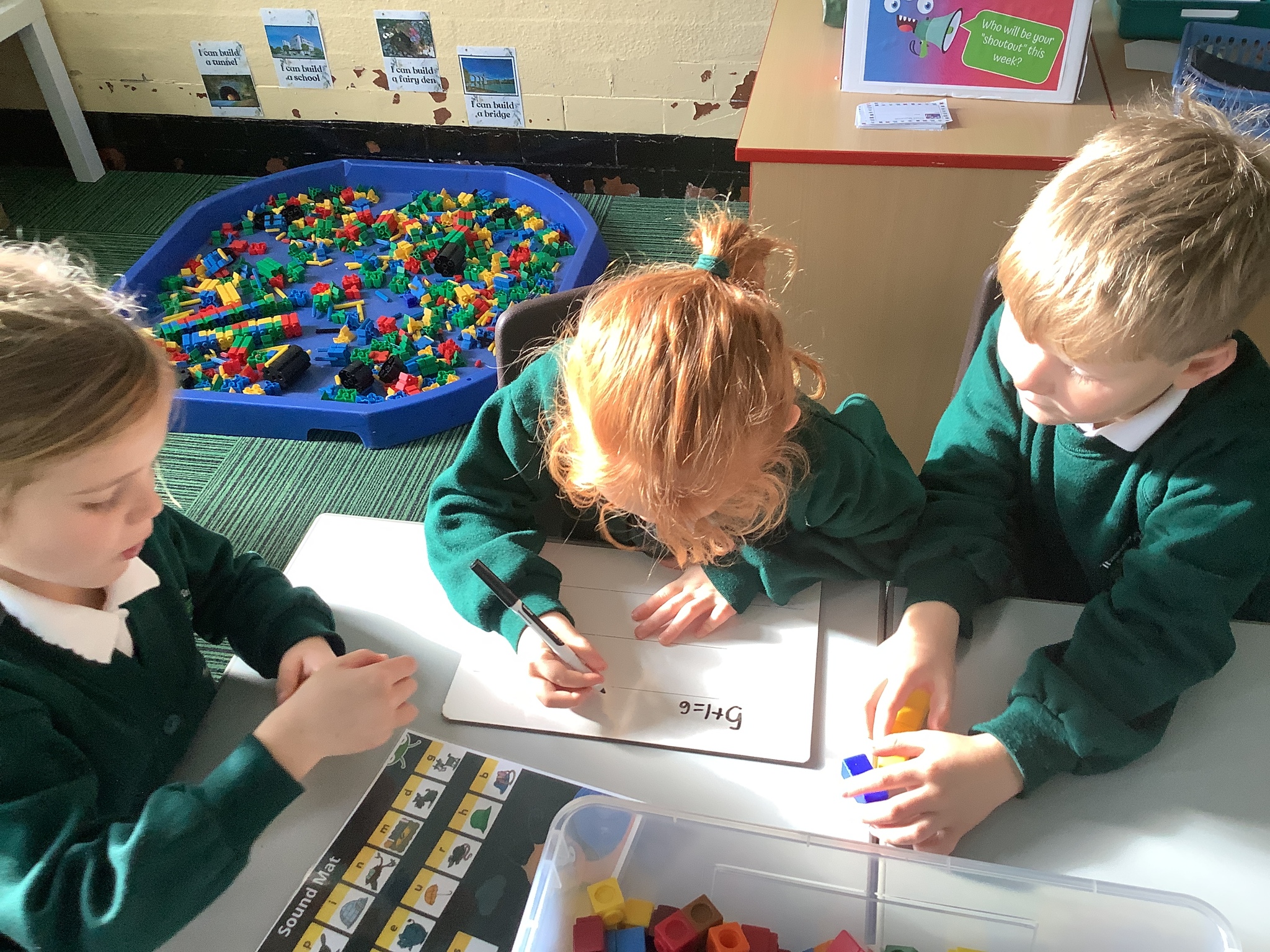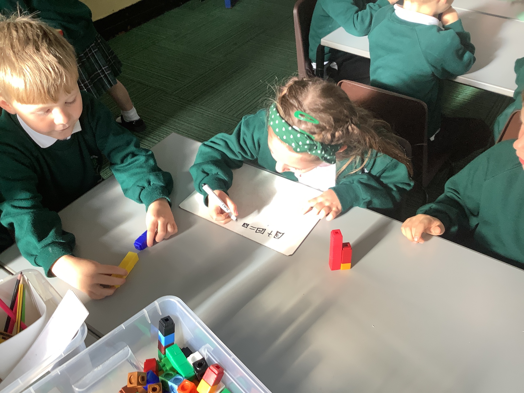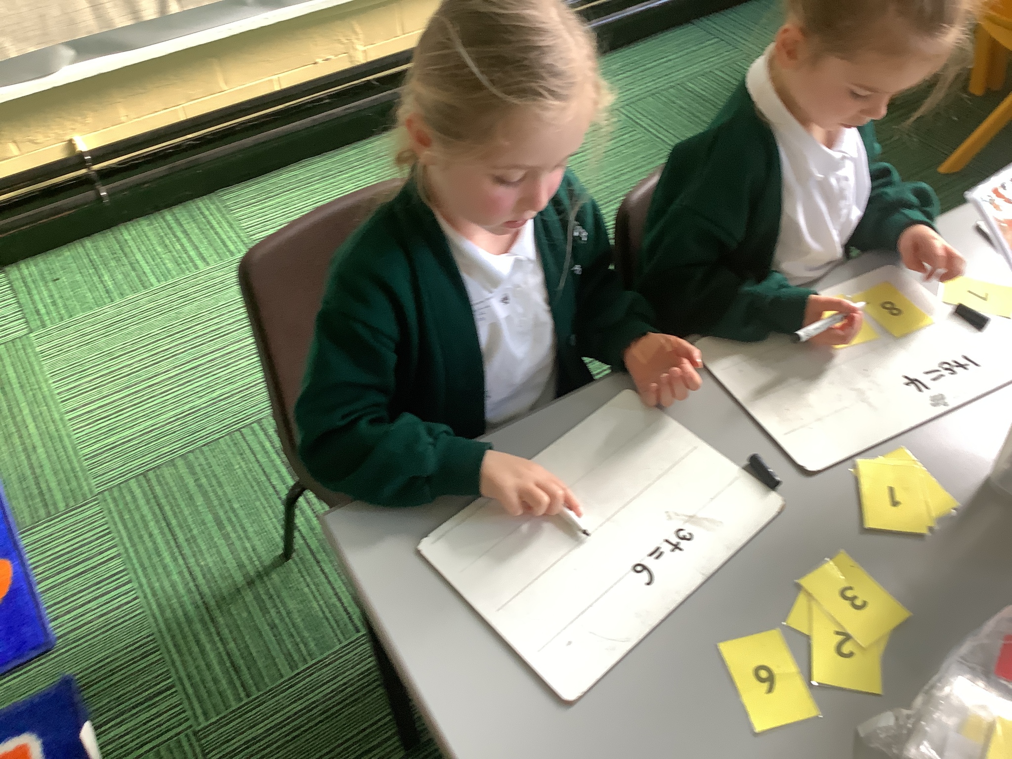 Today Year 1 have been having a go at writing number sentences. We used frogs and lily pads to make parts and whole before writing down, made stacks of cubes to add together and chose digit cards to make a number sentence then wrote them down,