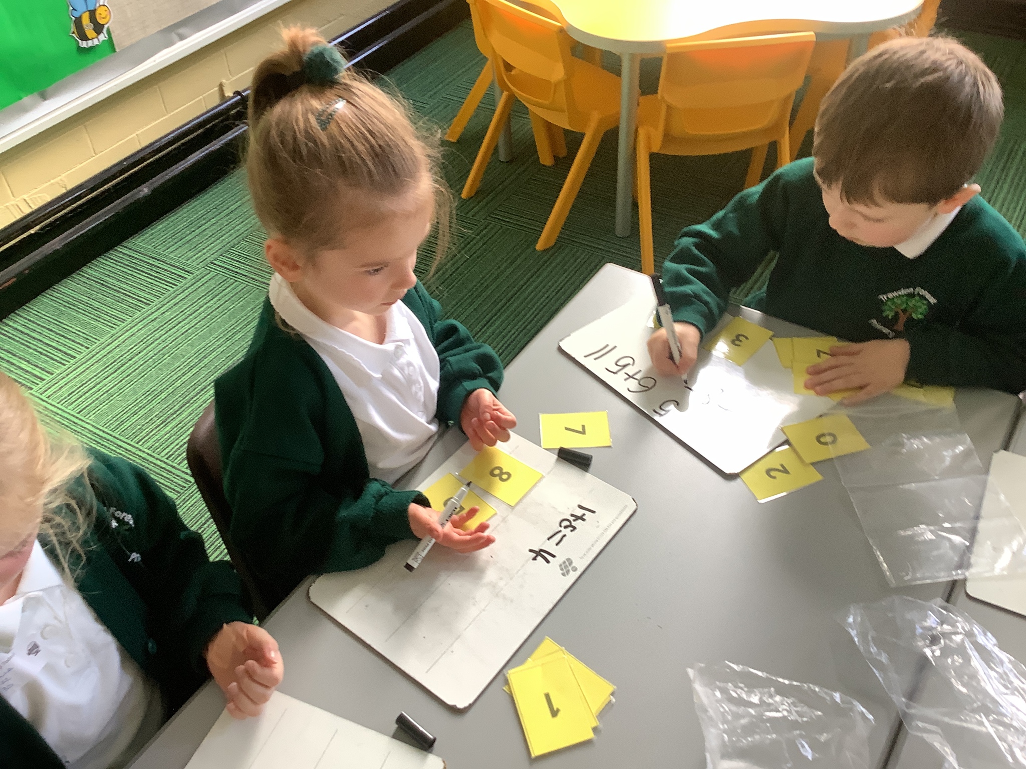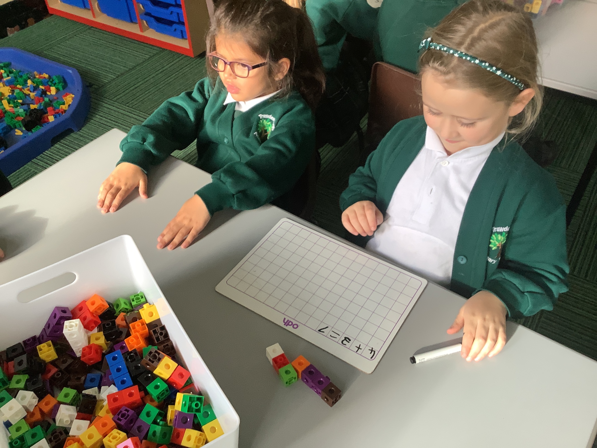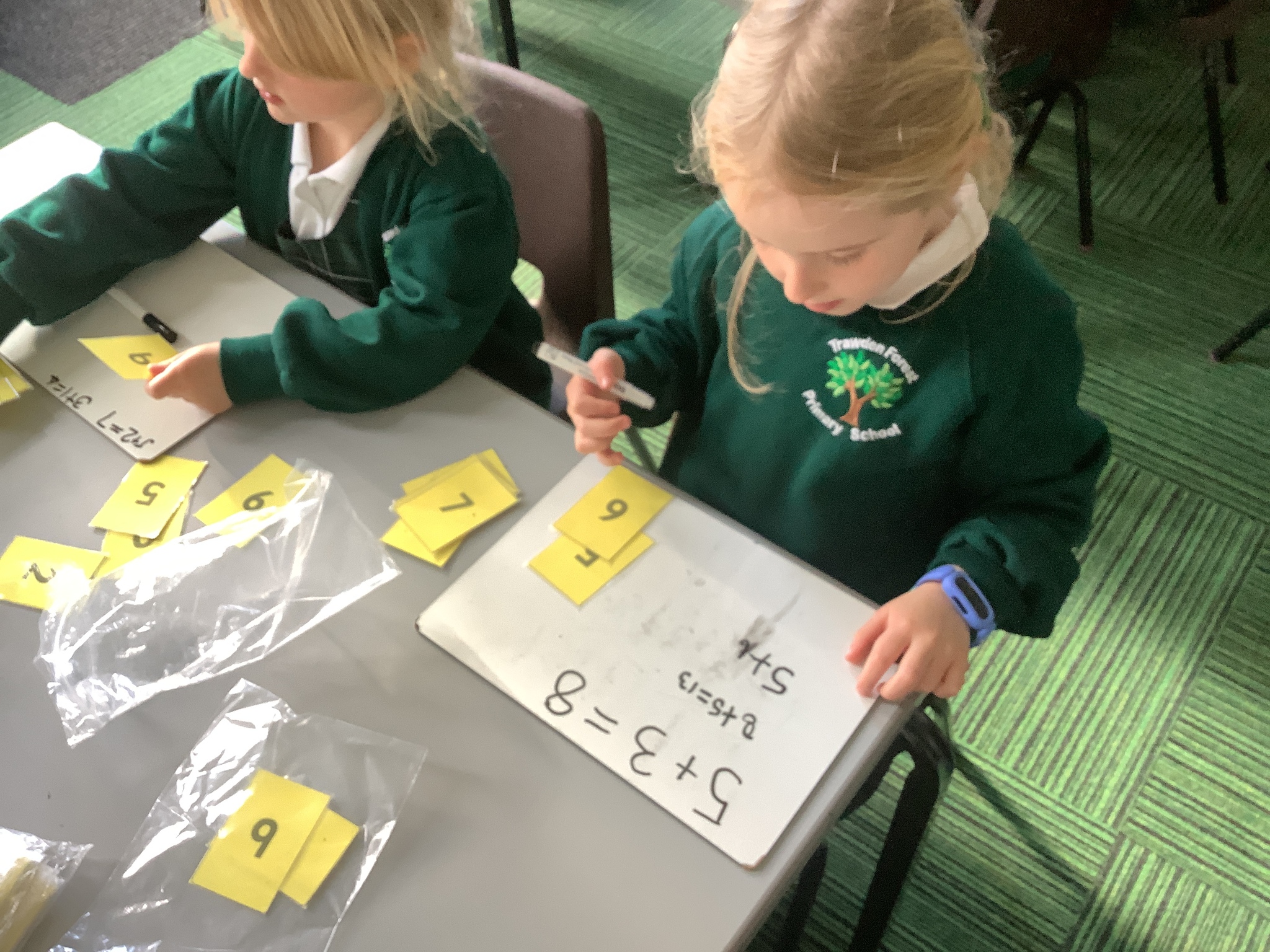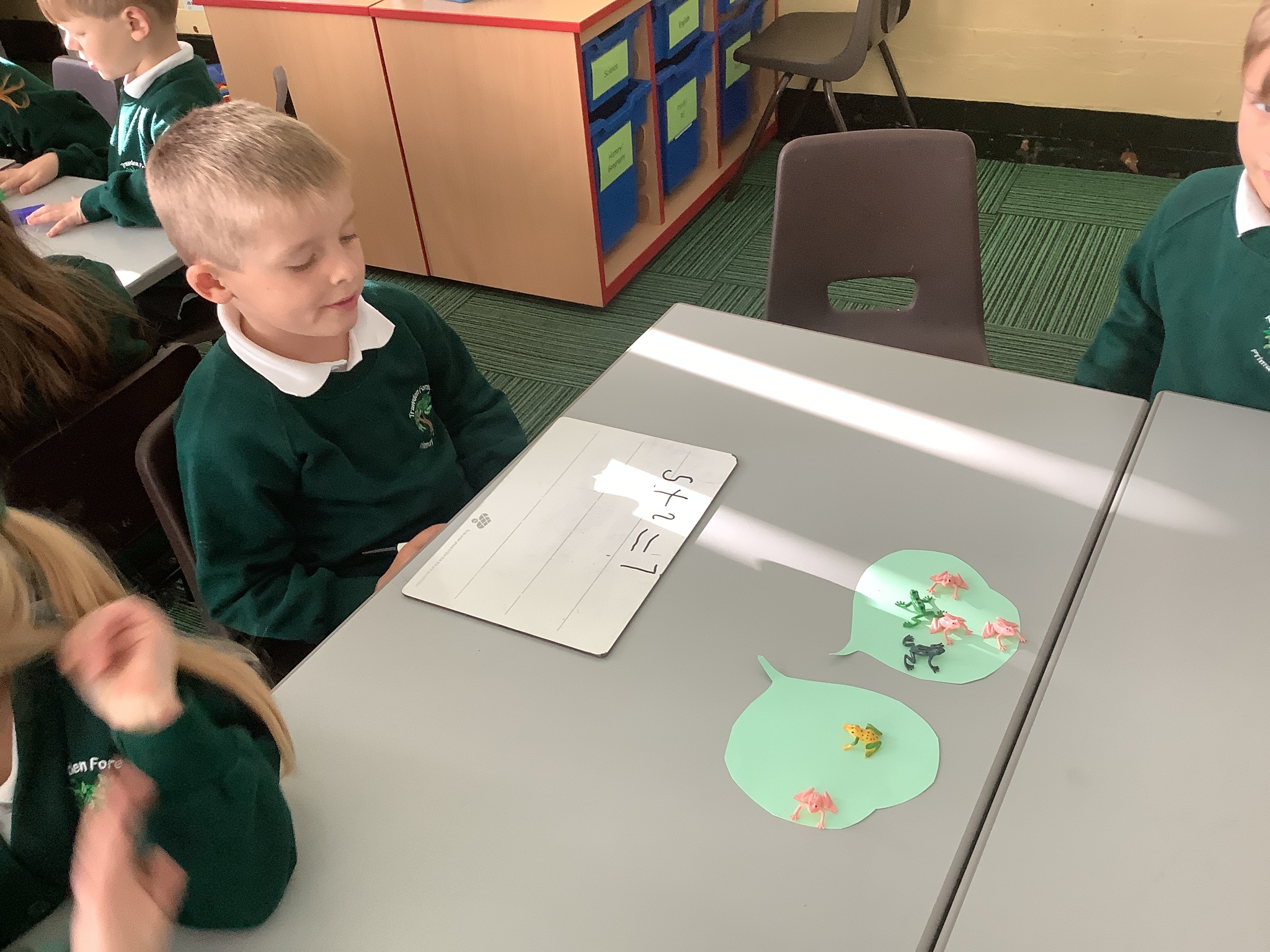 Today Year 1 have been having a go at writing number sentences. We used frogs and lily pads to make parts and whole before writing down, made stacks of cubes to add together and chose digit cards to make a number sentence then wrote them down,