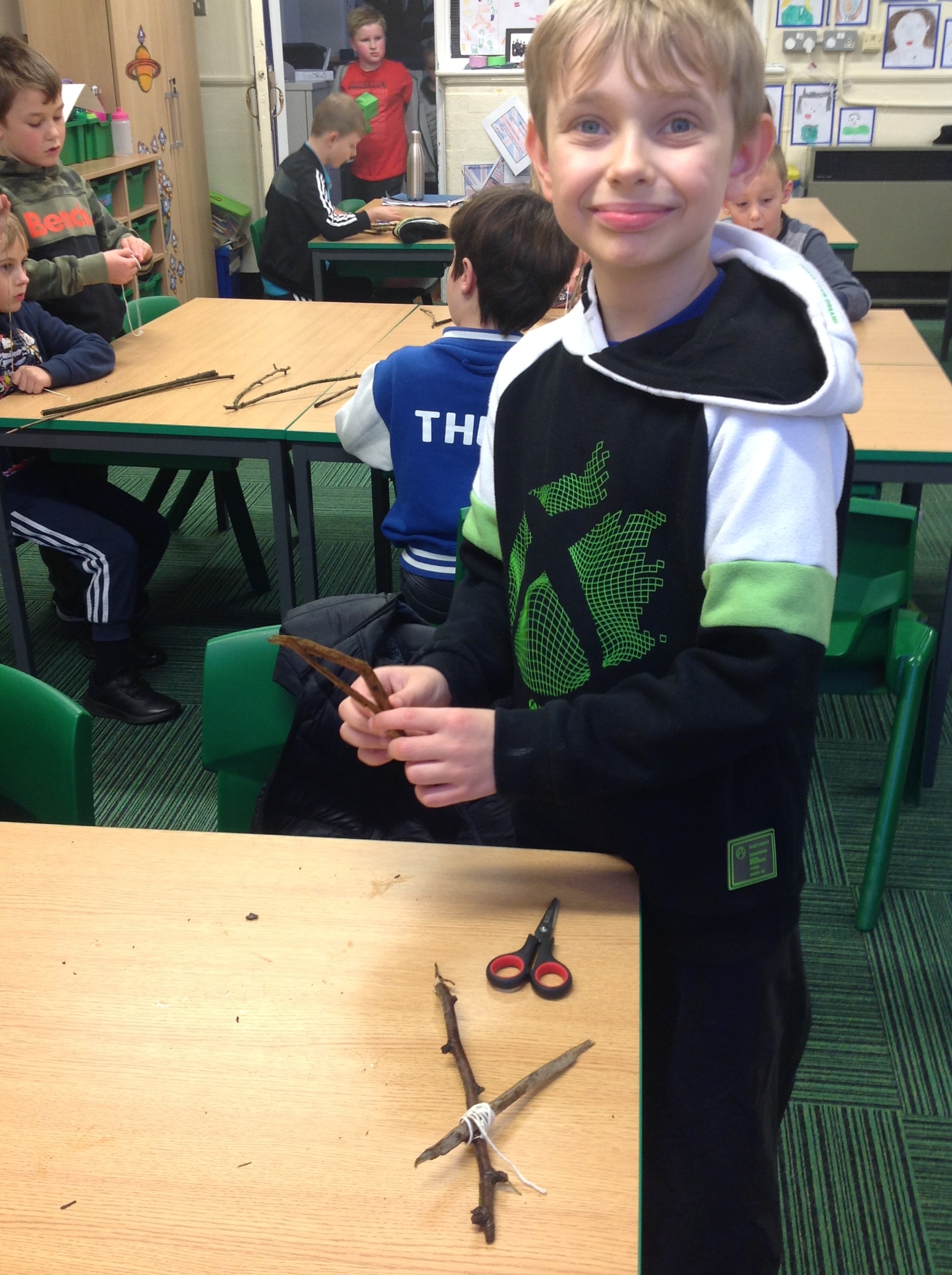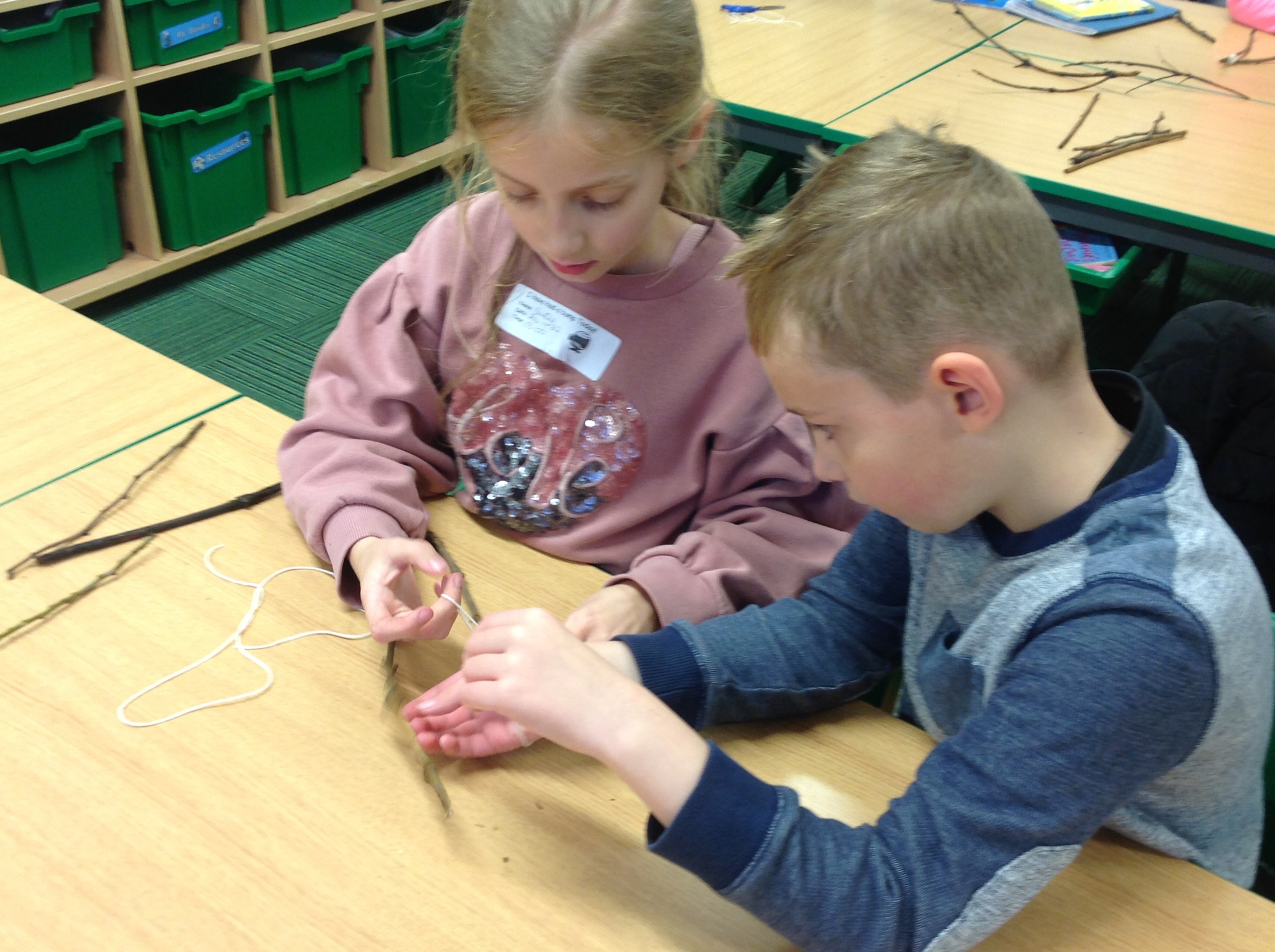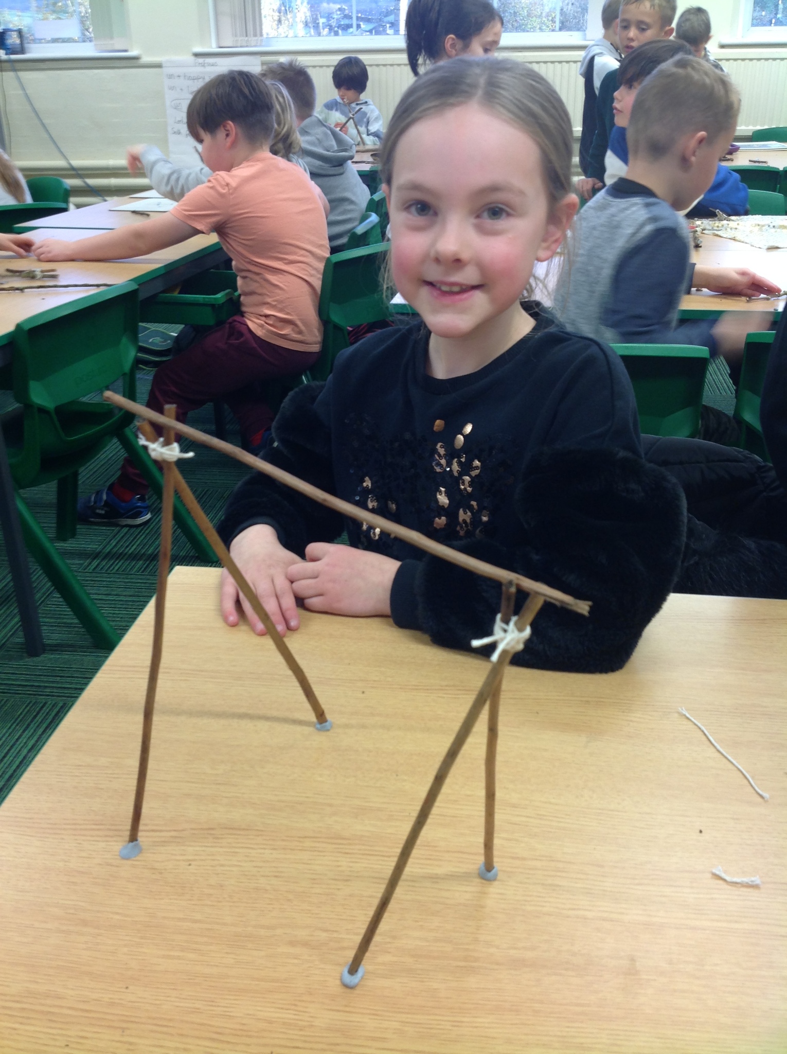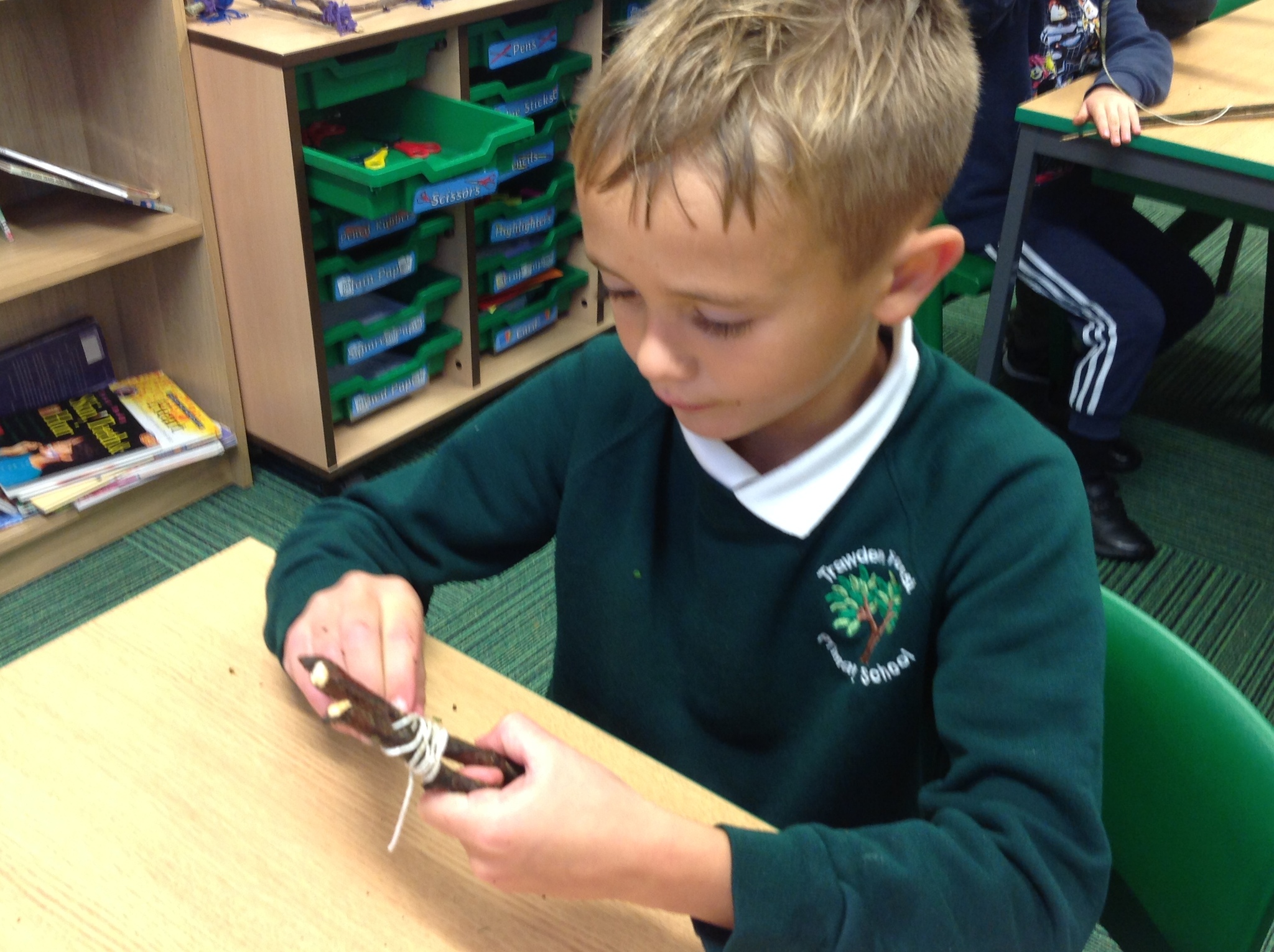 Another soggy week for Forest School but we did get outside. This week, Year 3 learnt hoe to do Sheer Lashing. They used string to fasten two sticks together so that they turned. They created tent-like shapes which they will be adding material to.