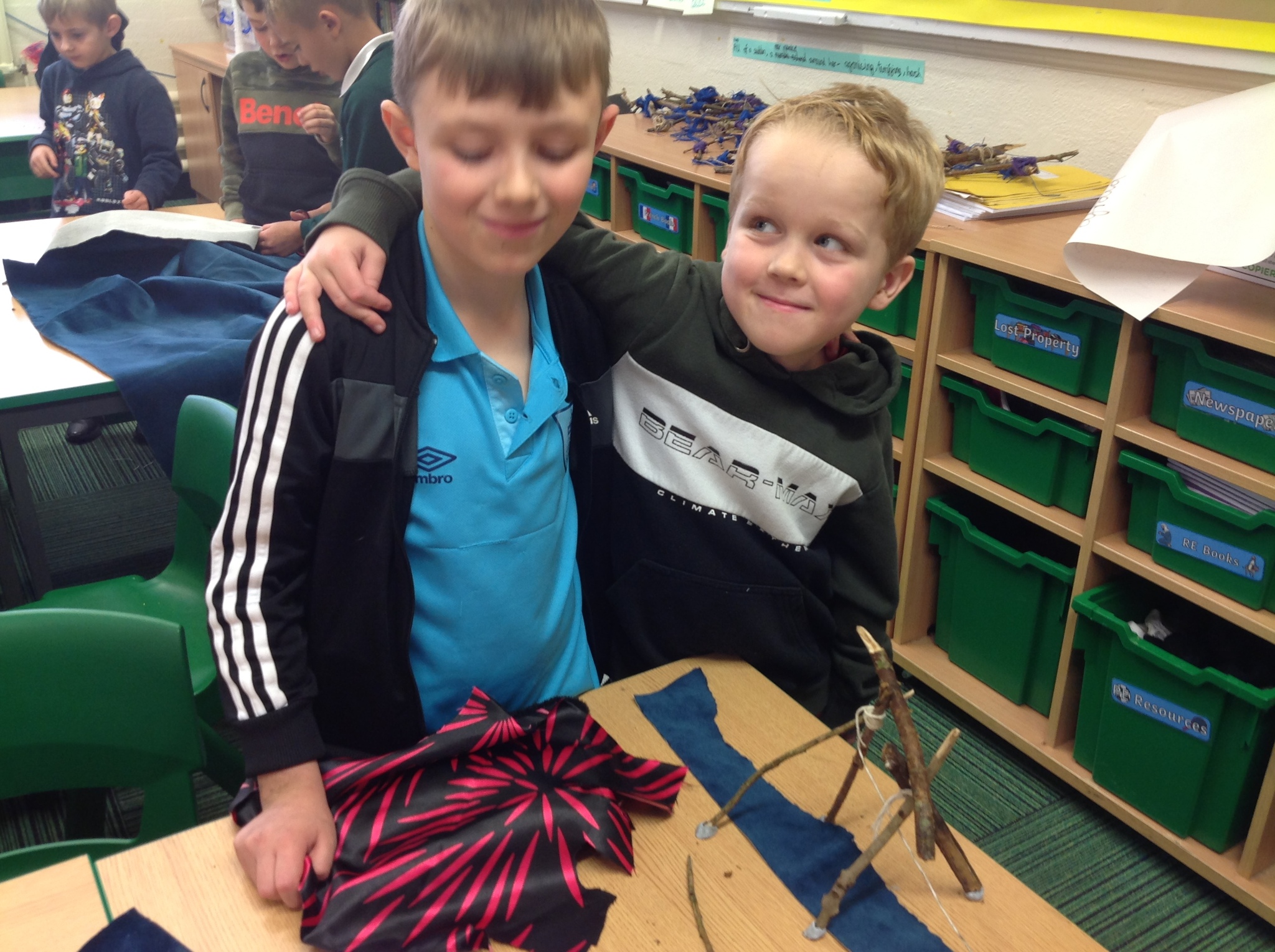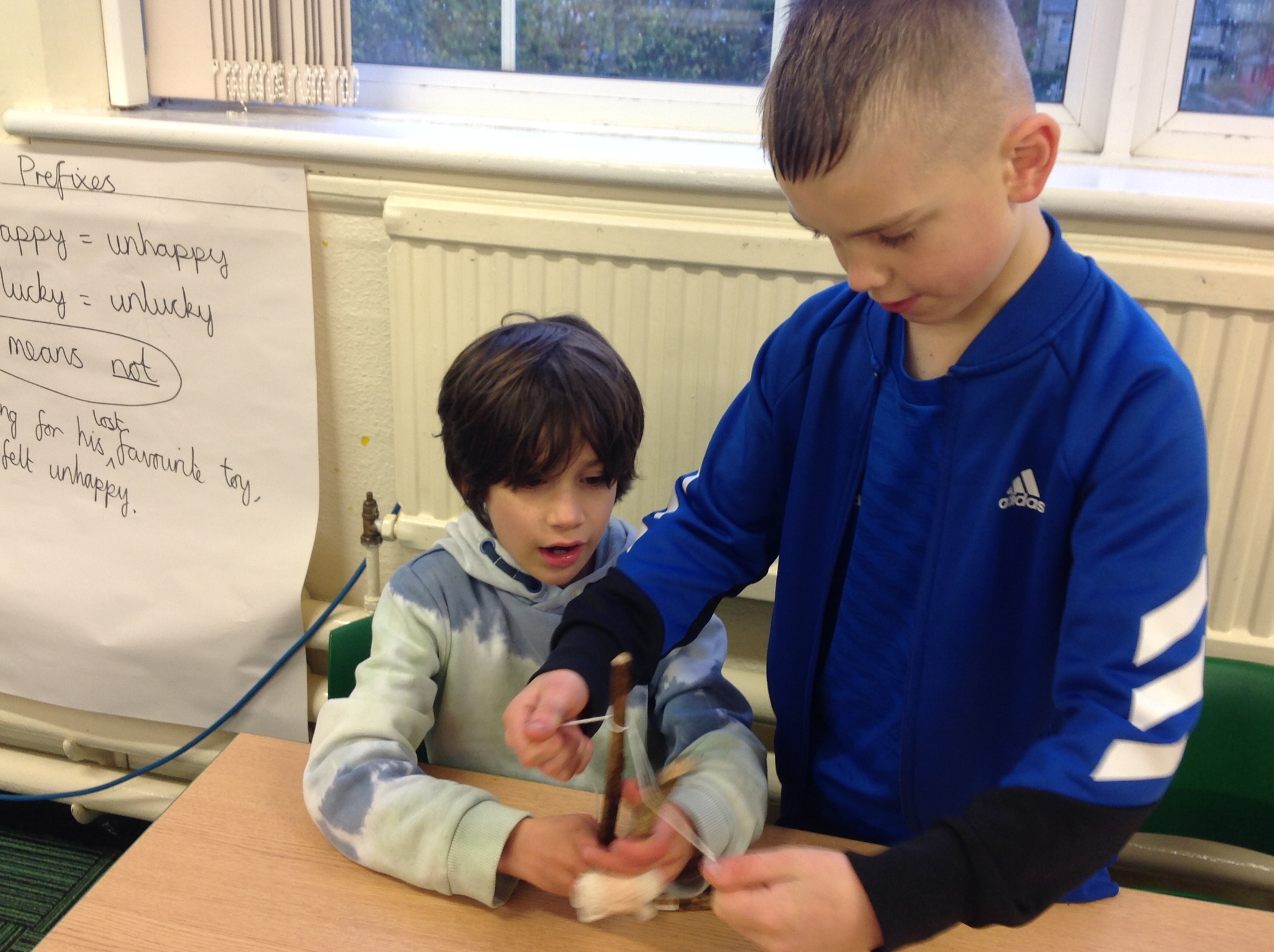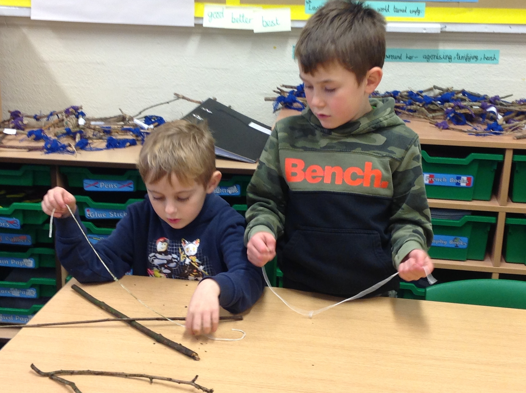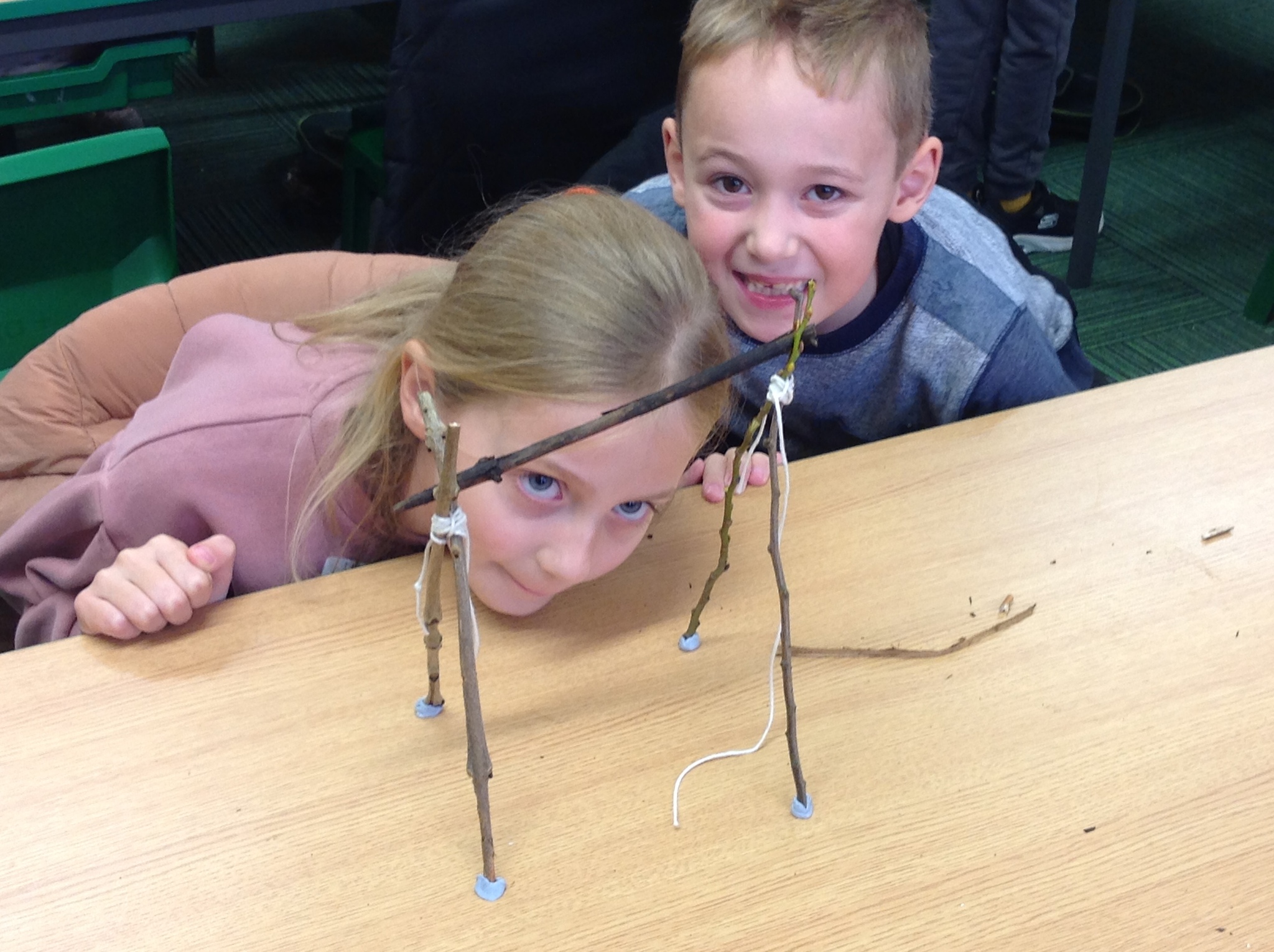 Another soggy week for Forest School but we did get outside. This week, Year 3 learnt hoe to do Sheer Lashing. They used string to fasten two sticks together so that they turned. They created tent-like shapes which they will be adding material to.