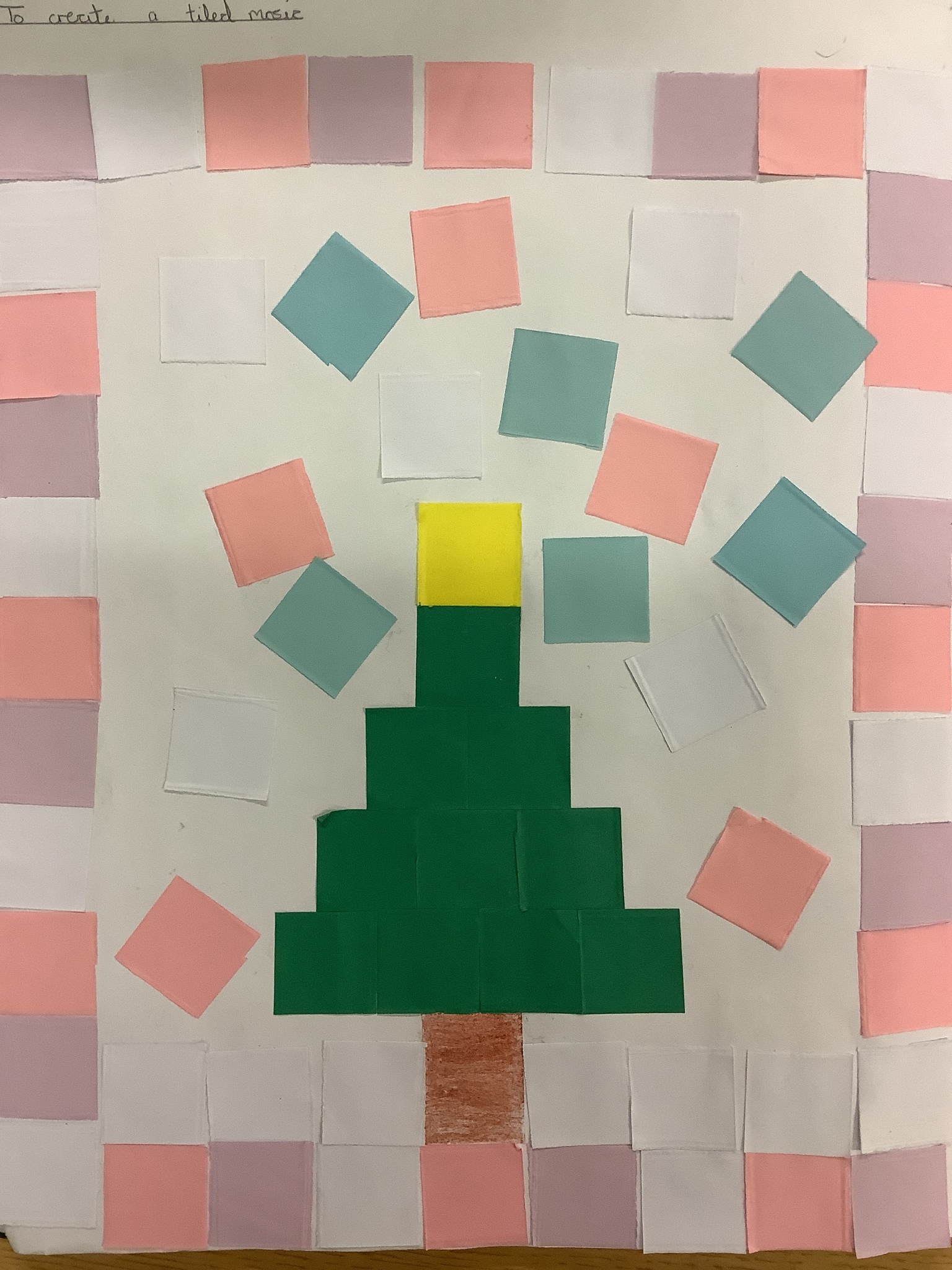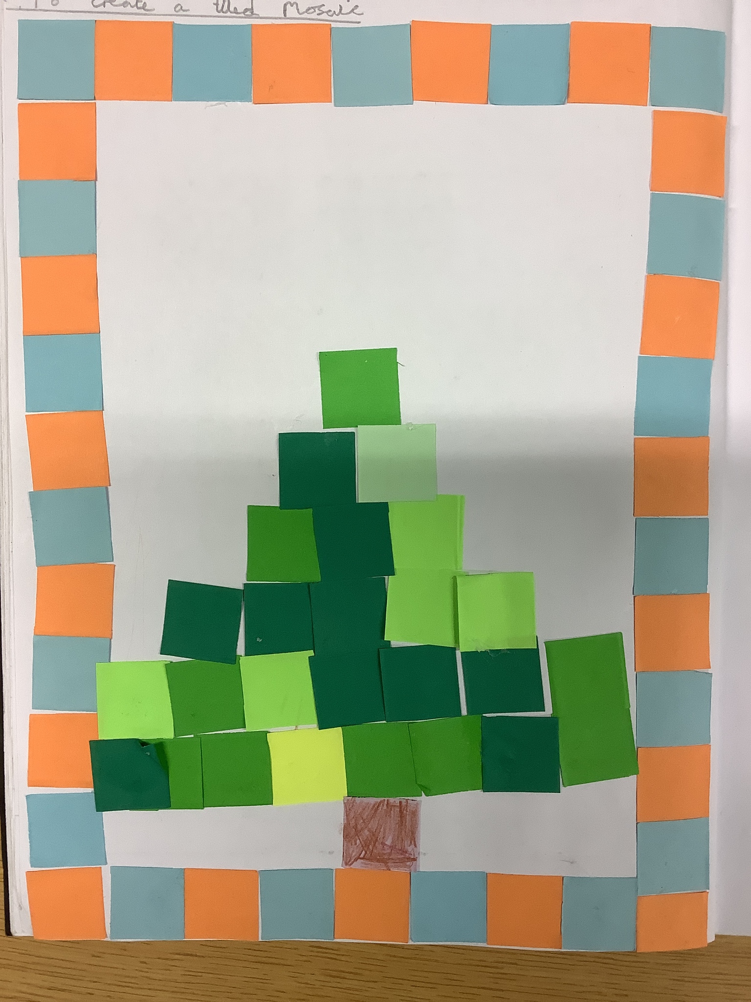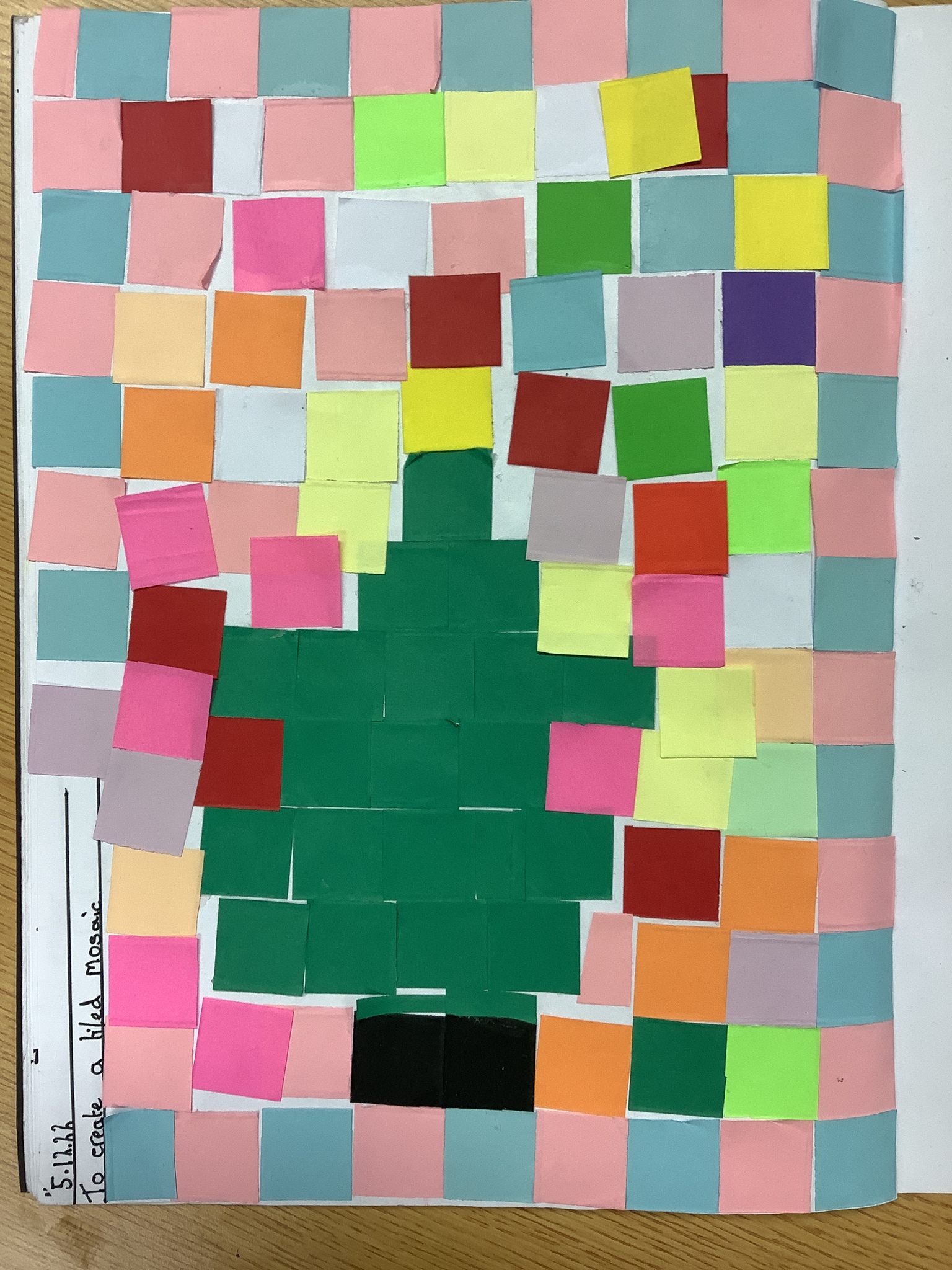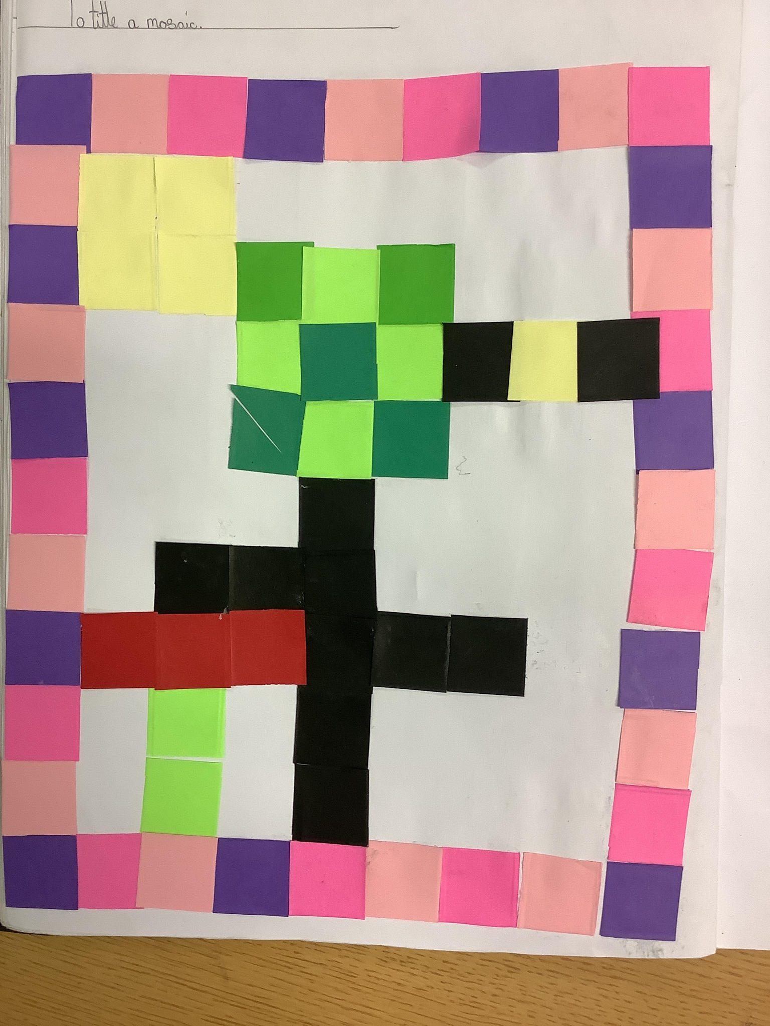In Year 4 this half term, we have been looking at Mosaics. Over the past few weeks, we have been progressing our knowledge and skill to produce more and more of a full mosaics. We began by looking at real mosaics and where they were from, we focused on Roman mosaics as we will be learning all about the Romans next week. We then moved on to looking at the borders of mosaics and how they usually follow a simple pattern. Next, we made our own by colouring in squared paper, before finally making these mosaics as our final piece of art on the topic. As you can see, we have worked very hard and really thought about how to make a picture show from these coloured pieces of paper.