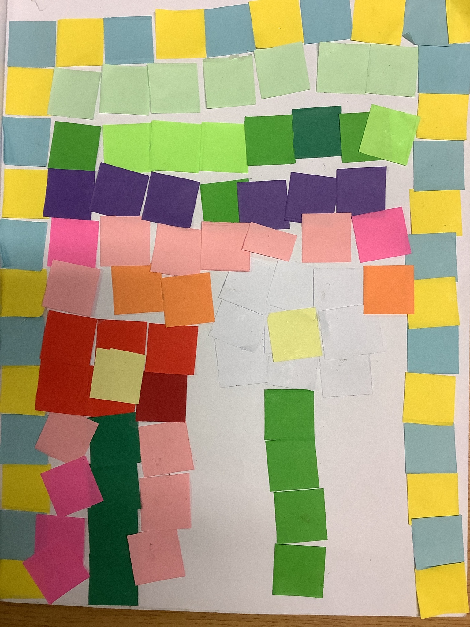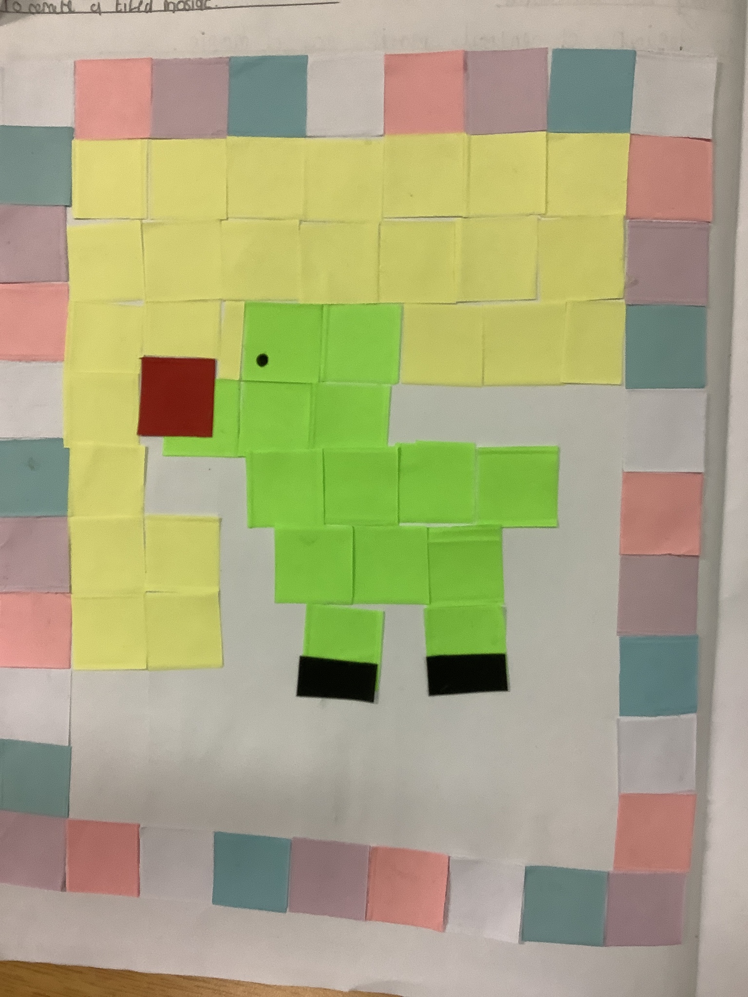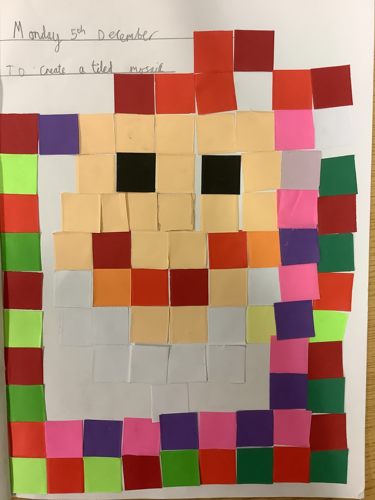In Year 4 this half term, we have been looking at Mosaics. Over the past few weeks, we have been progressing our knowledge and skill to produce more and more of a full mosaics. We began by looking at real mosaics and where they were from, we focused on Roman mosaics as we will be learning all about the Romans next week. We then moved on to looking at the borders of mosaics and how they usually follow a simple pattern. Next, we made our own by colouring in squared paper, before finally making these mosaics as our final piece of art on the topic. As you can see, we have worked very hard and really thought about how to make a picture show from these coloured pieces of paper.