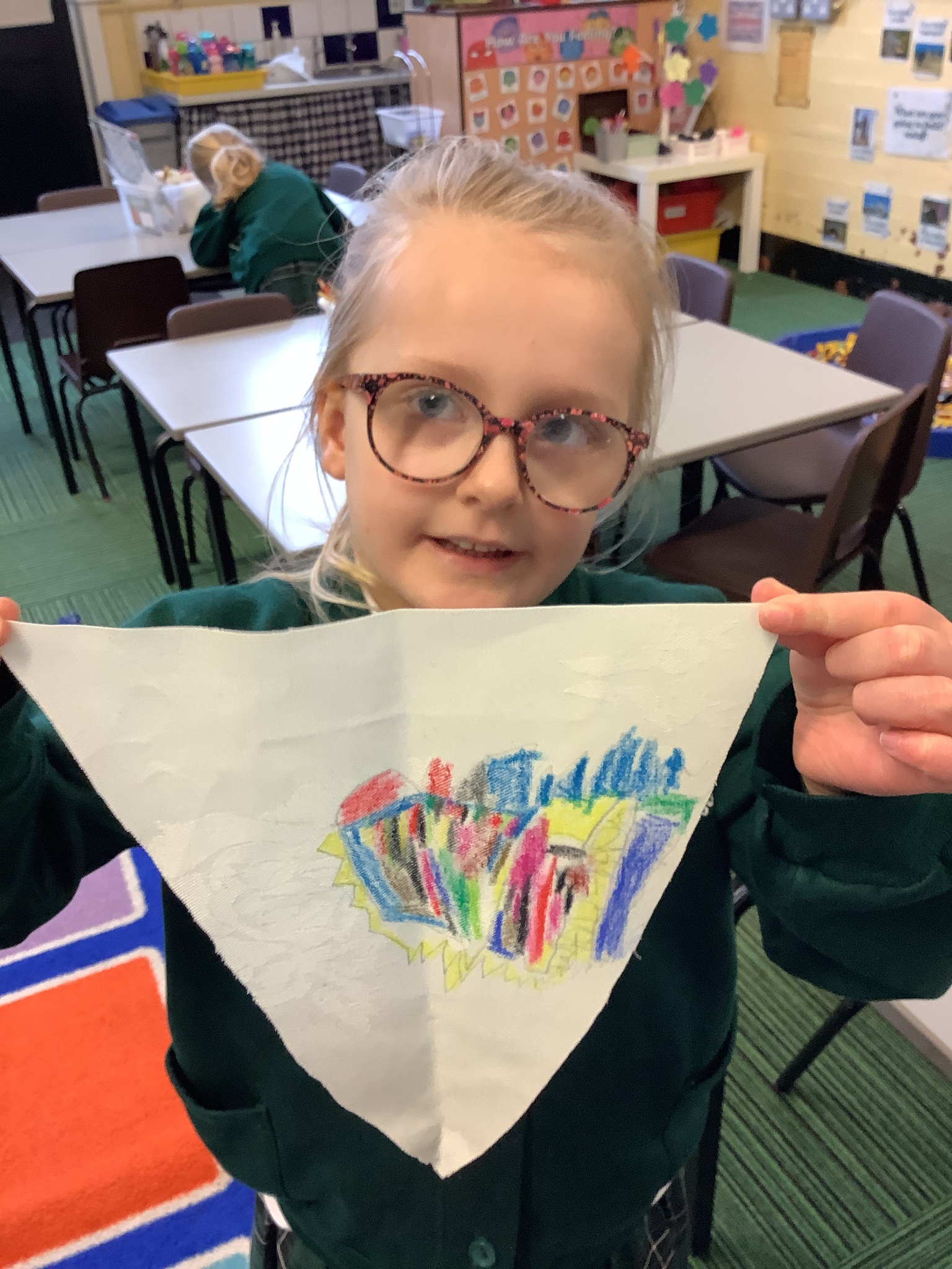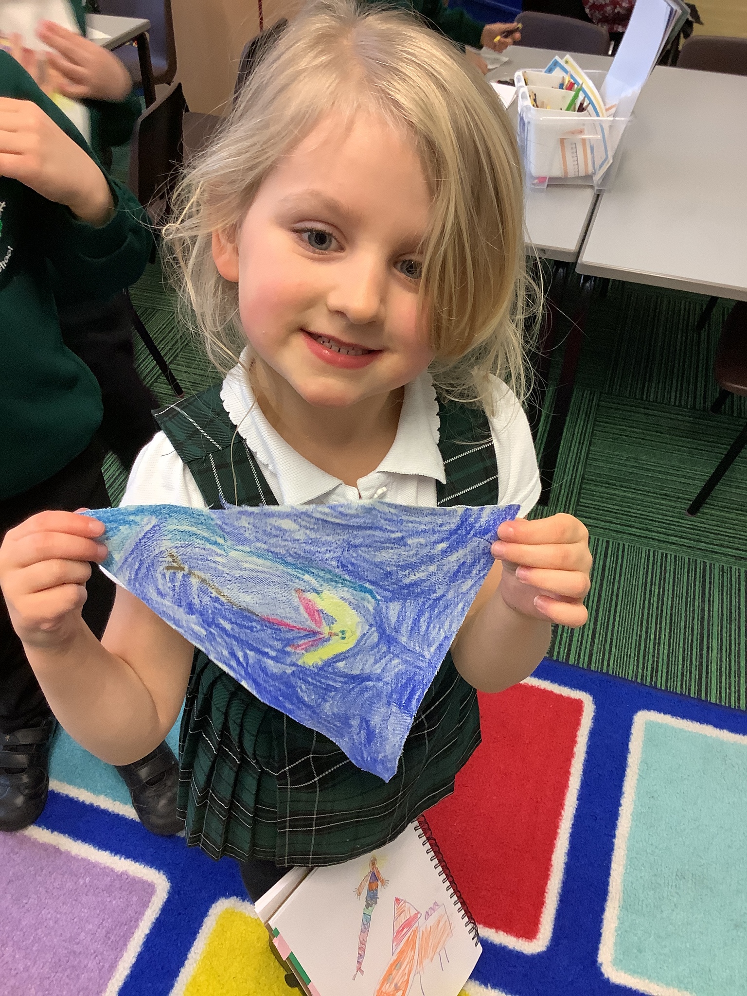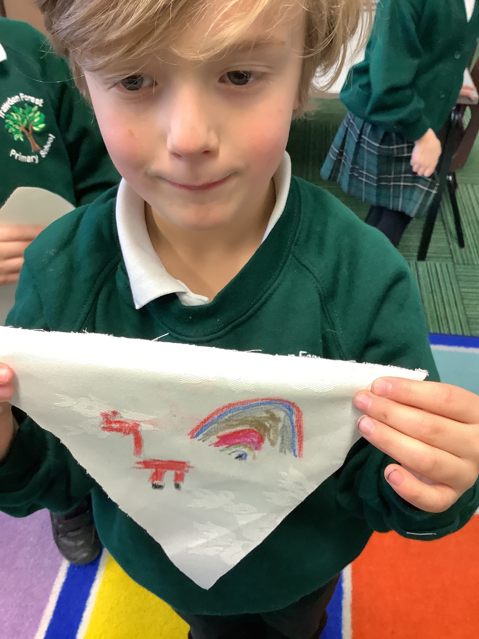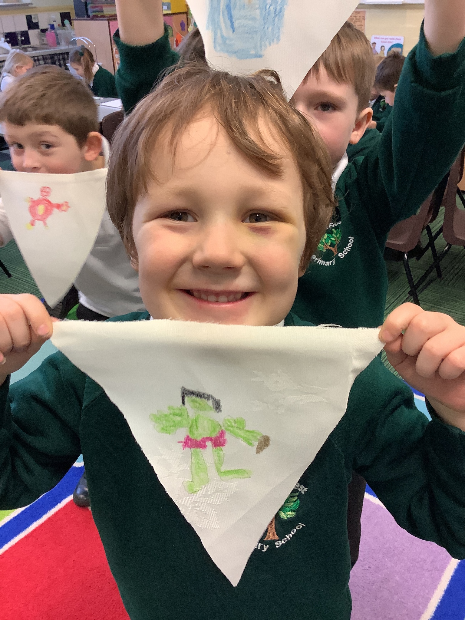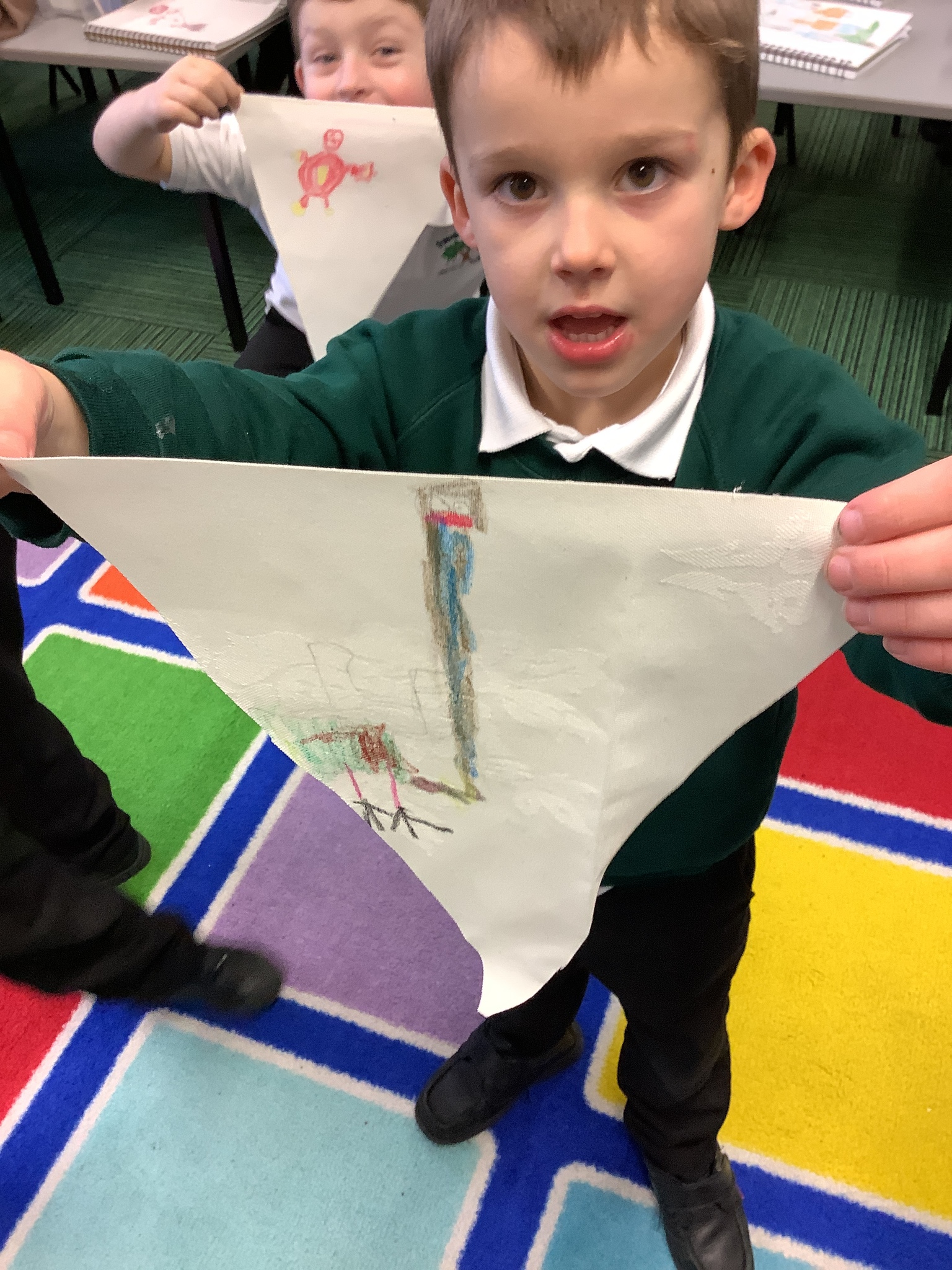 In our Art topic on fabrics, this week we looked at how to use fabric crayons to draw designs straight onto a piece of fabric.