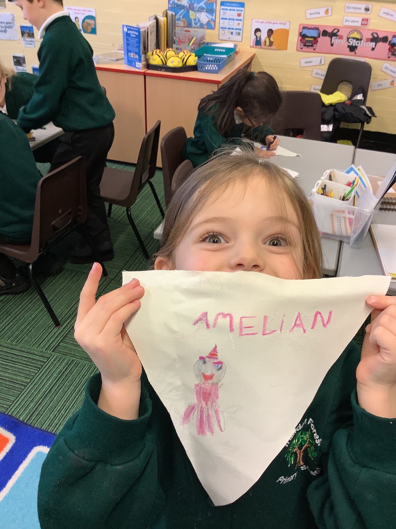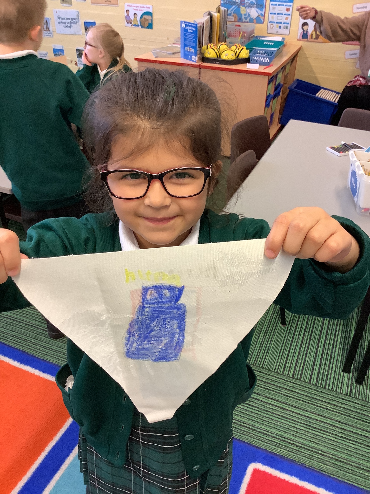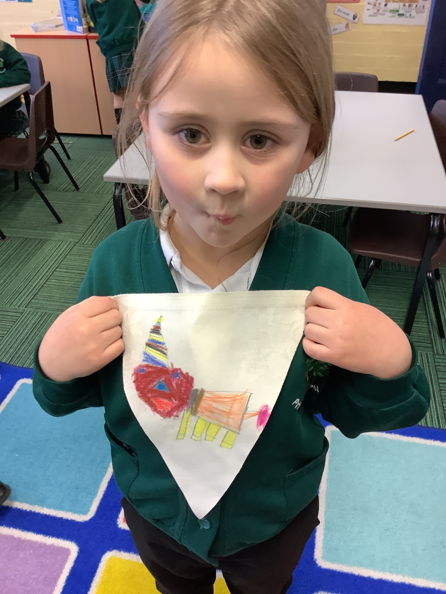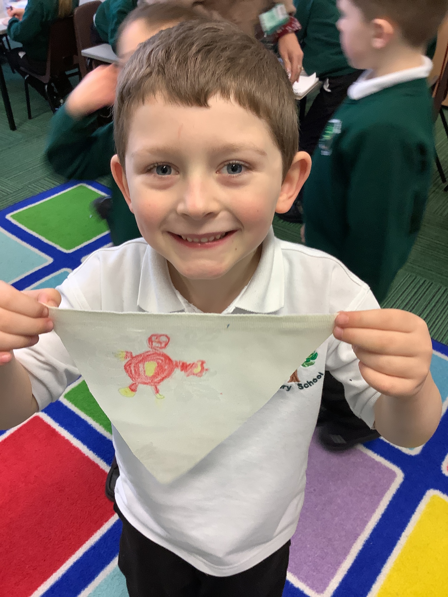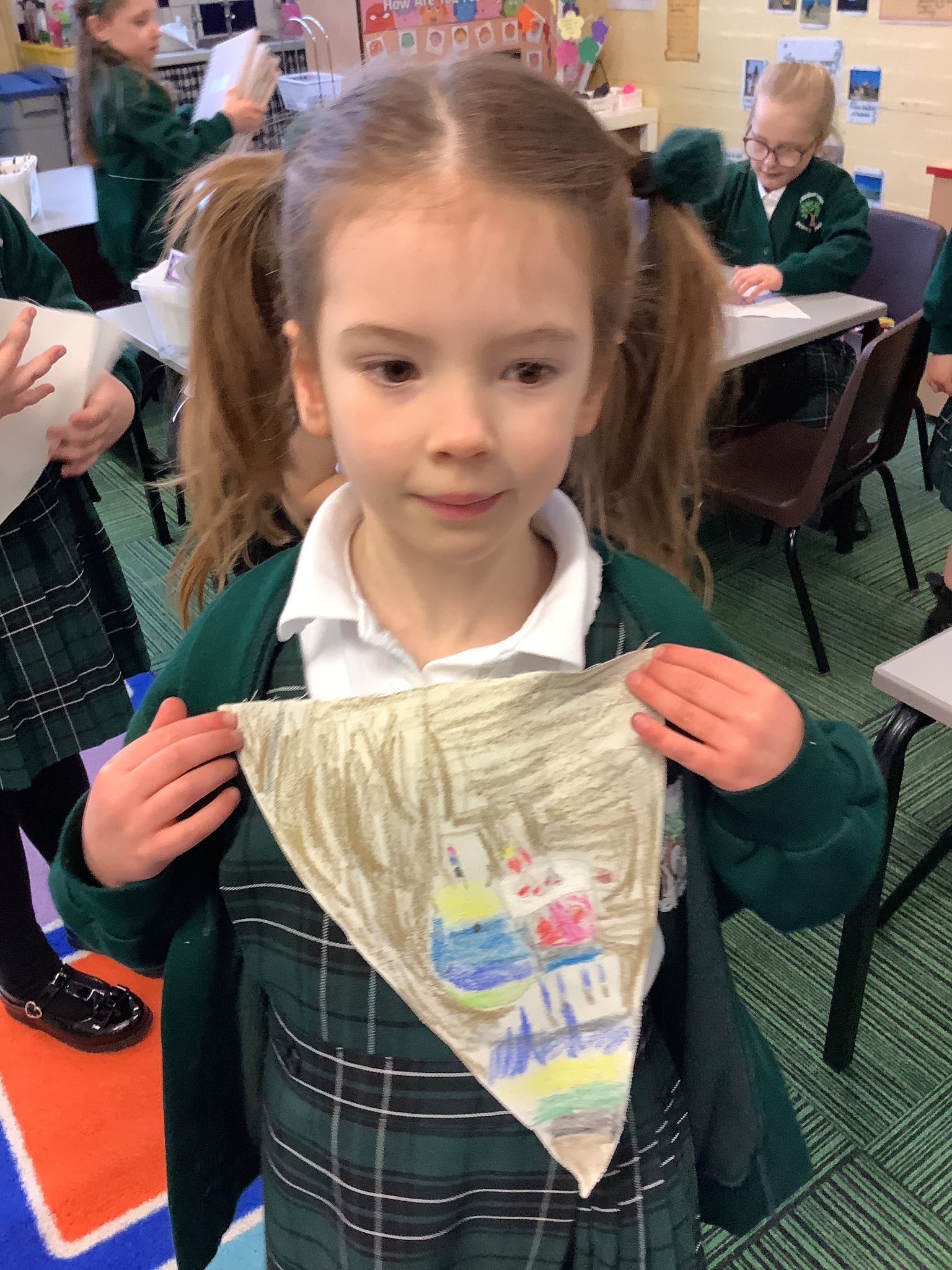 In our Art topic on fabrics, this week we looked at how to use fabric crayons to draw designs straight onto a piece of fabric.