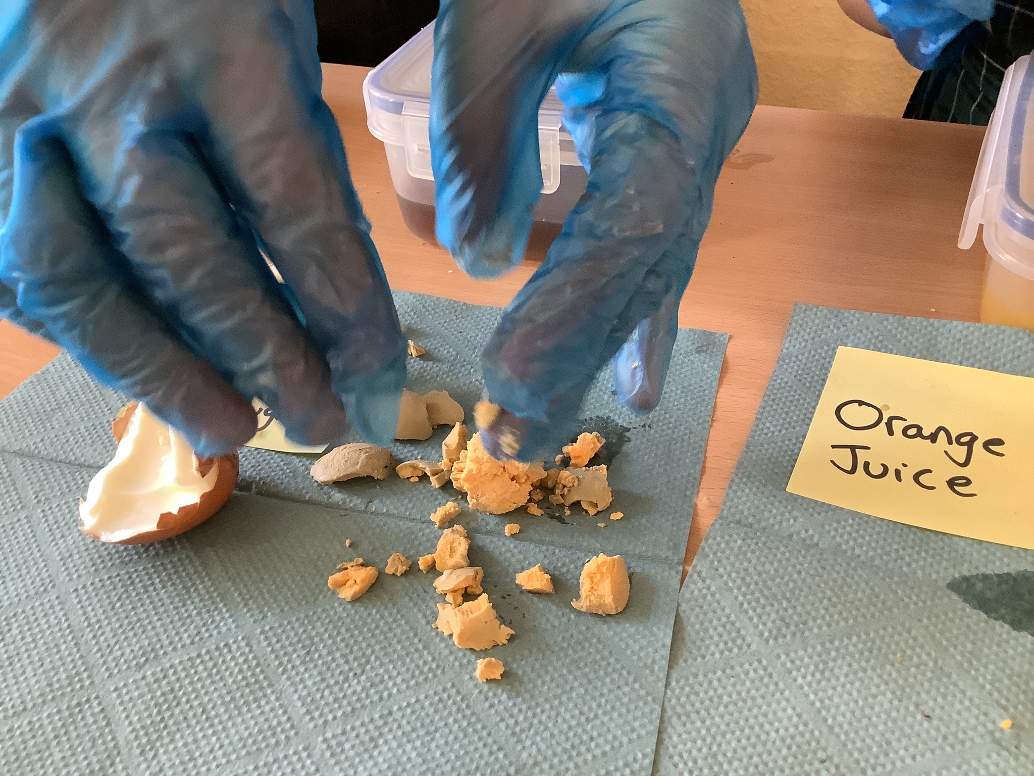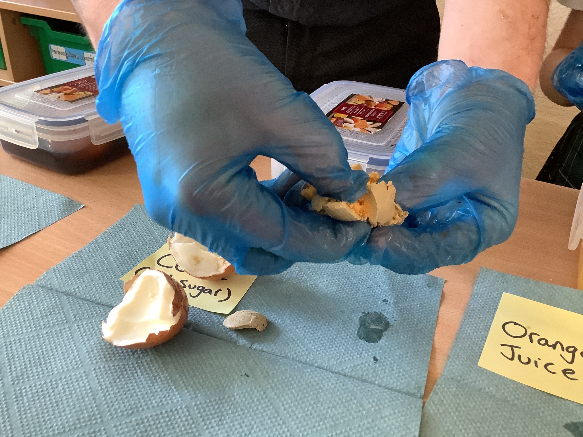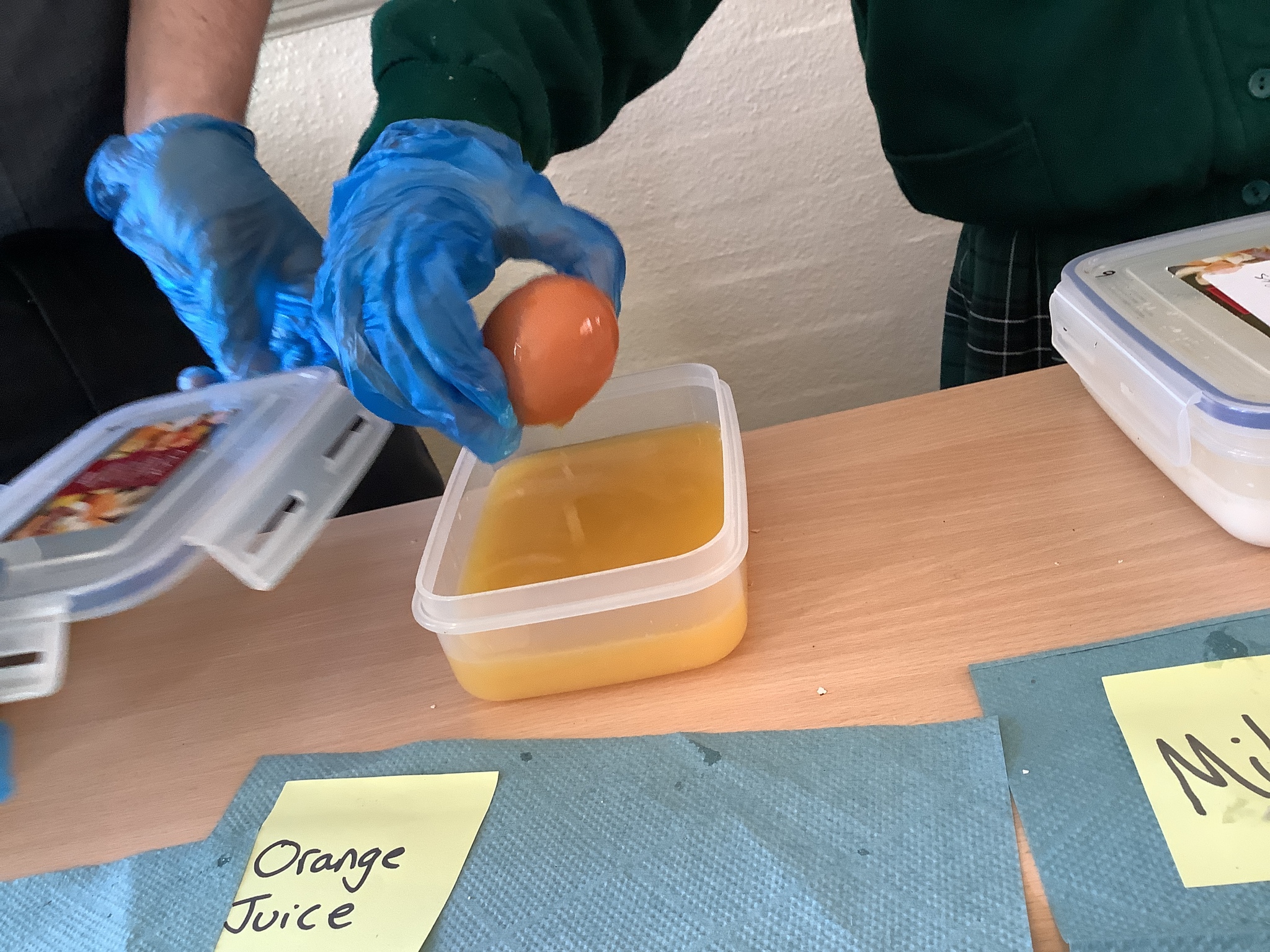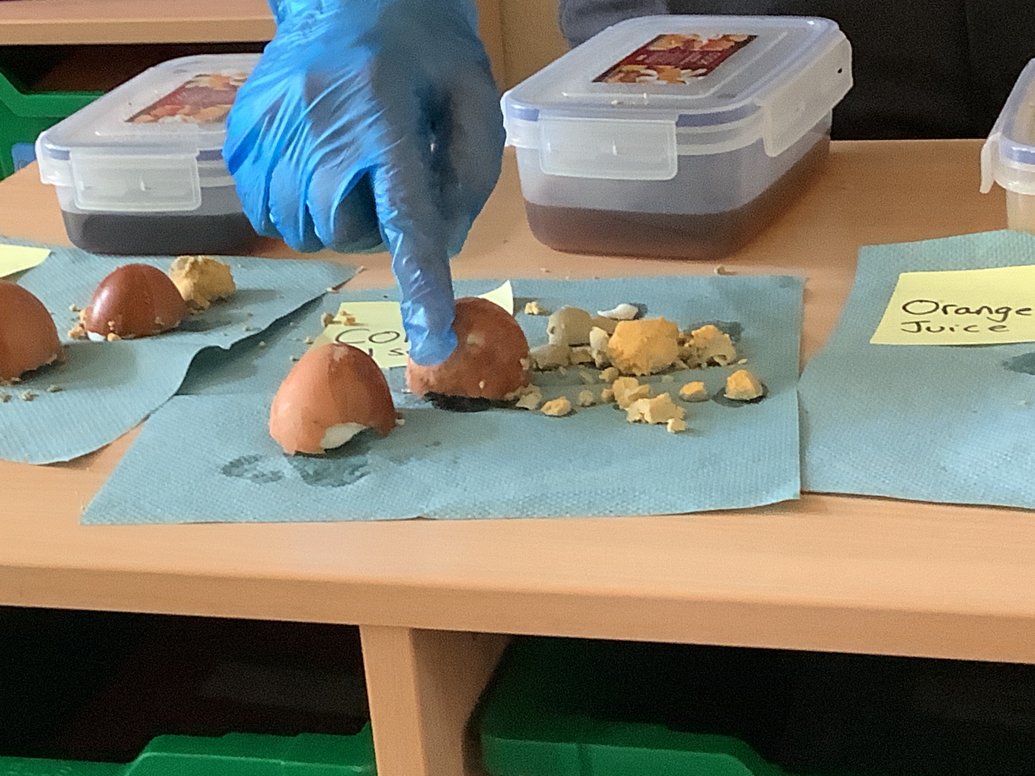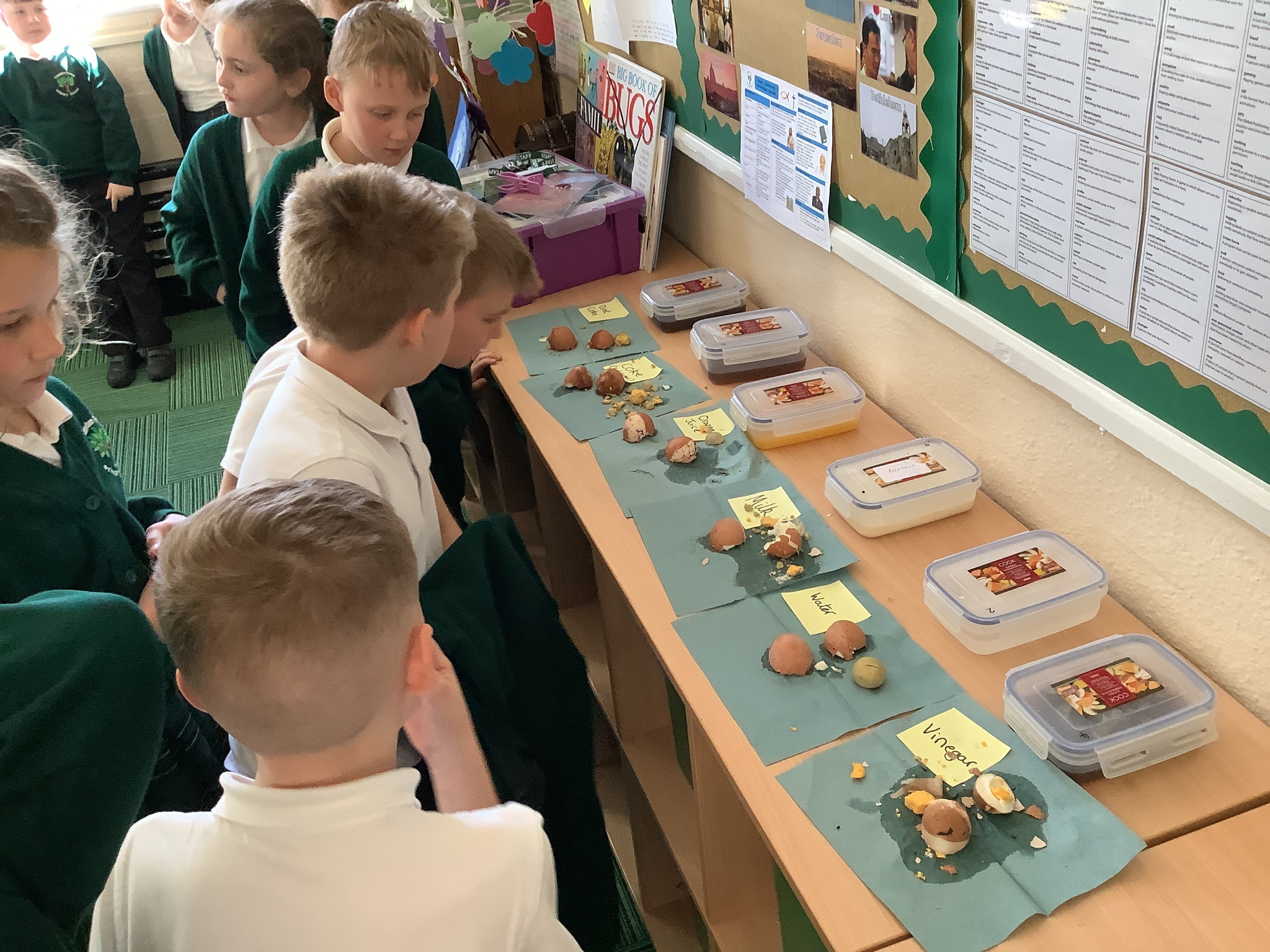 Today, Year 4 concluded their week long experiment on tooth enamel. They had been trying to discover, what the effects of sugar and acid have on tooth decay. To complete the experiment, they used boiled eggs because the shell can be used to represent the enamel on teeth. Last week, children looked at a range of liquids and decided how much to put over each egg (300ml). We then left that for 7 days to see what would happen to your teeth, if you constantly drank these liquids and didn't brush your teeth.