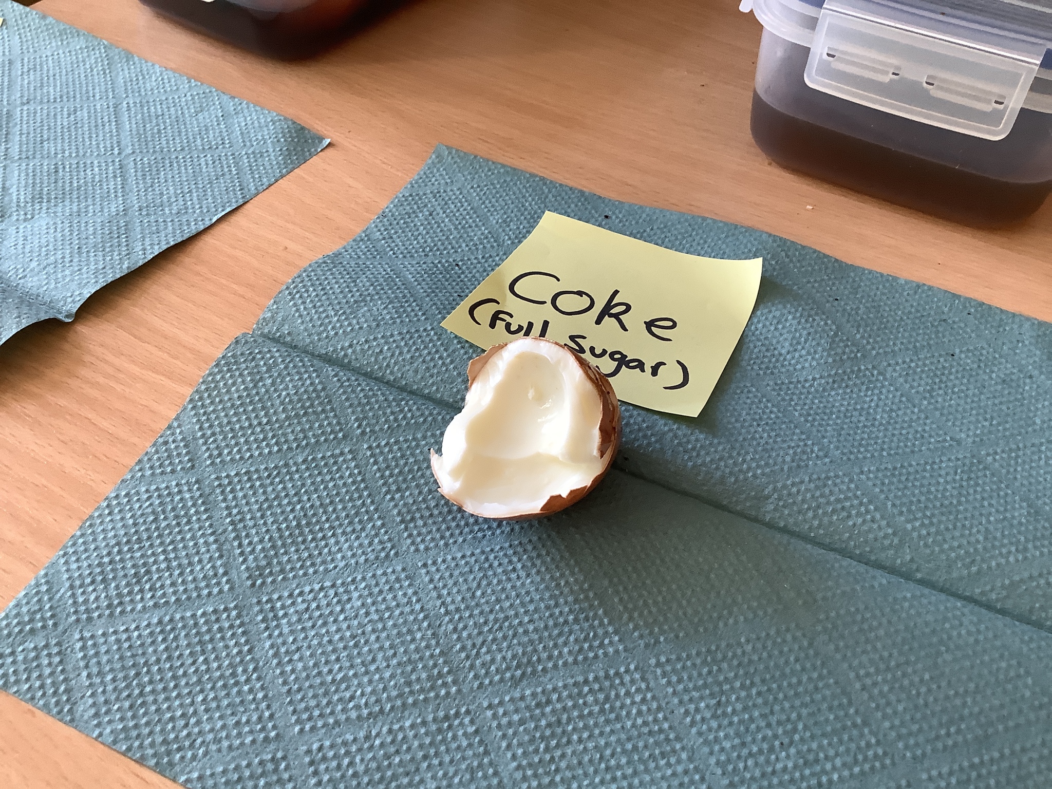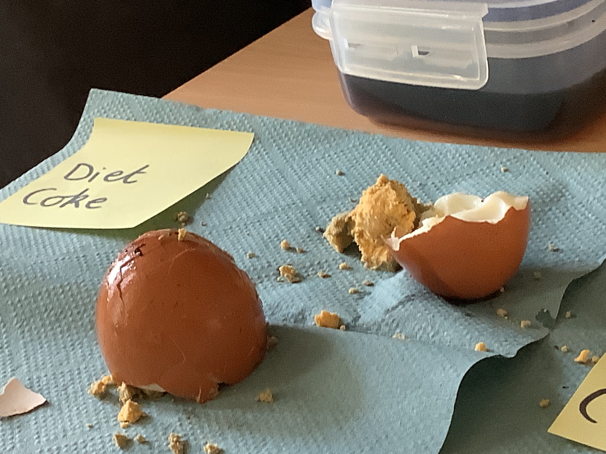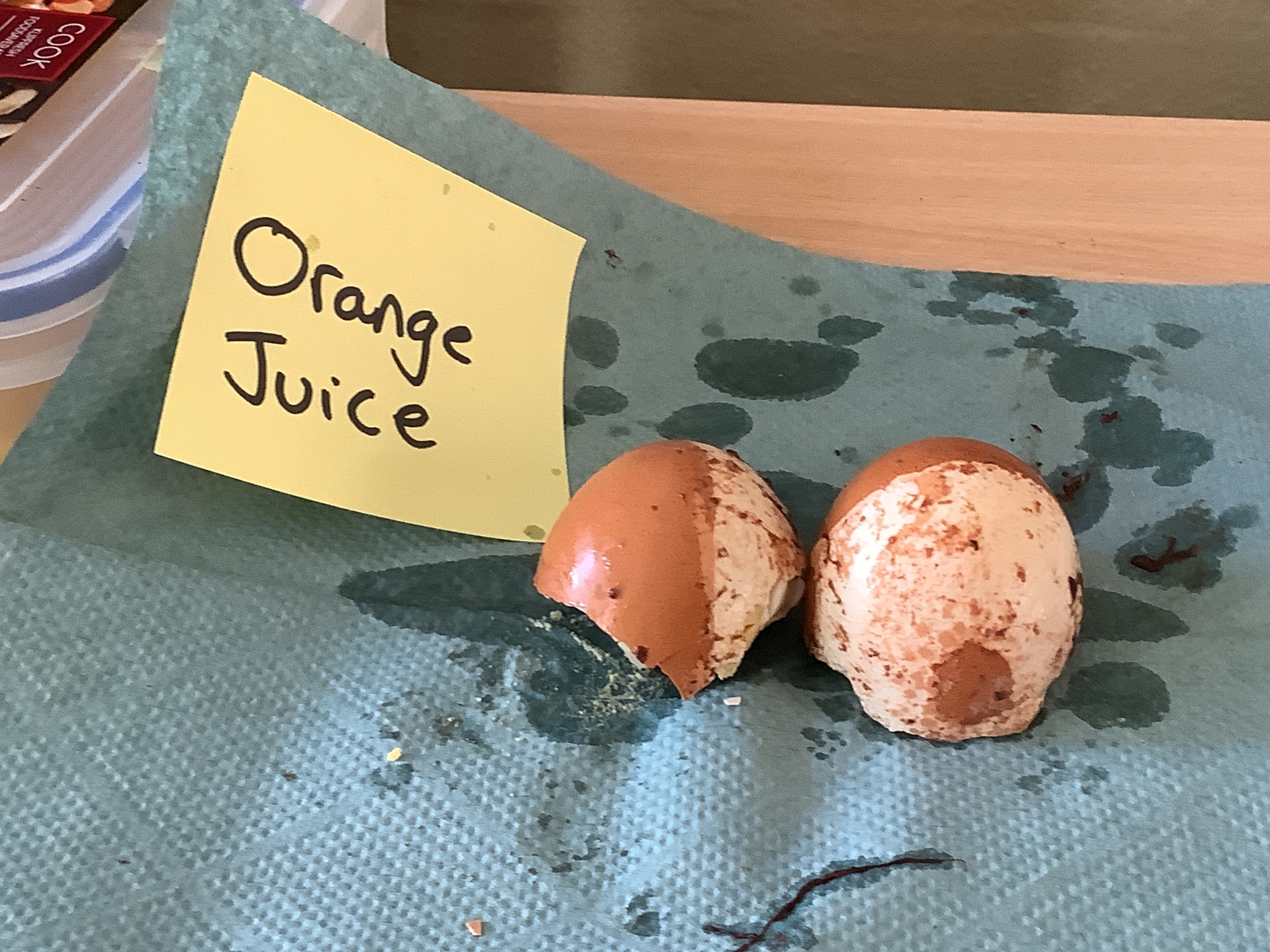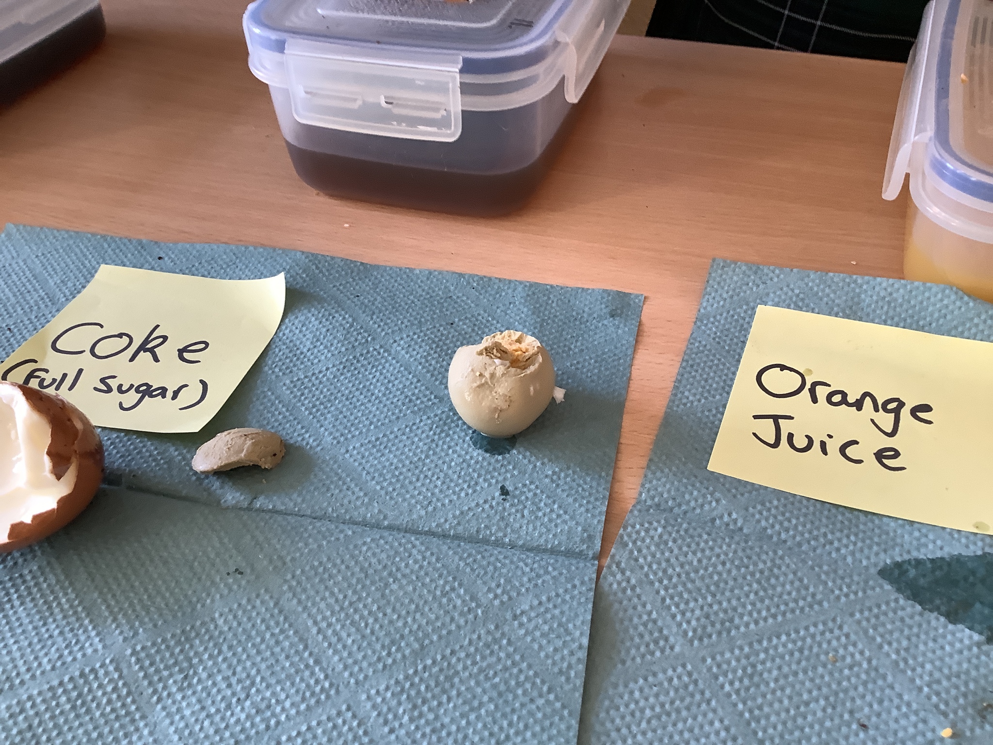 Today, Year 4 concluded their week long experiment on tooth enamel. They had been trying to discover, what the effects of sugar and acid have on tooth decay. To complete the experiment, they used boiled eggs because the shell can be used to represent the enamel on teeth. Last week, children looked at a range of liquids and decided how much to put over each egg (300ml). We then left that for 7 days to see what would happen to your teeth, if you constantly drank these liquids and didn't brush your teeth.
